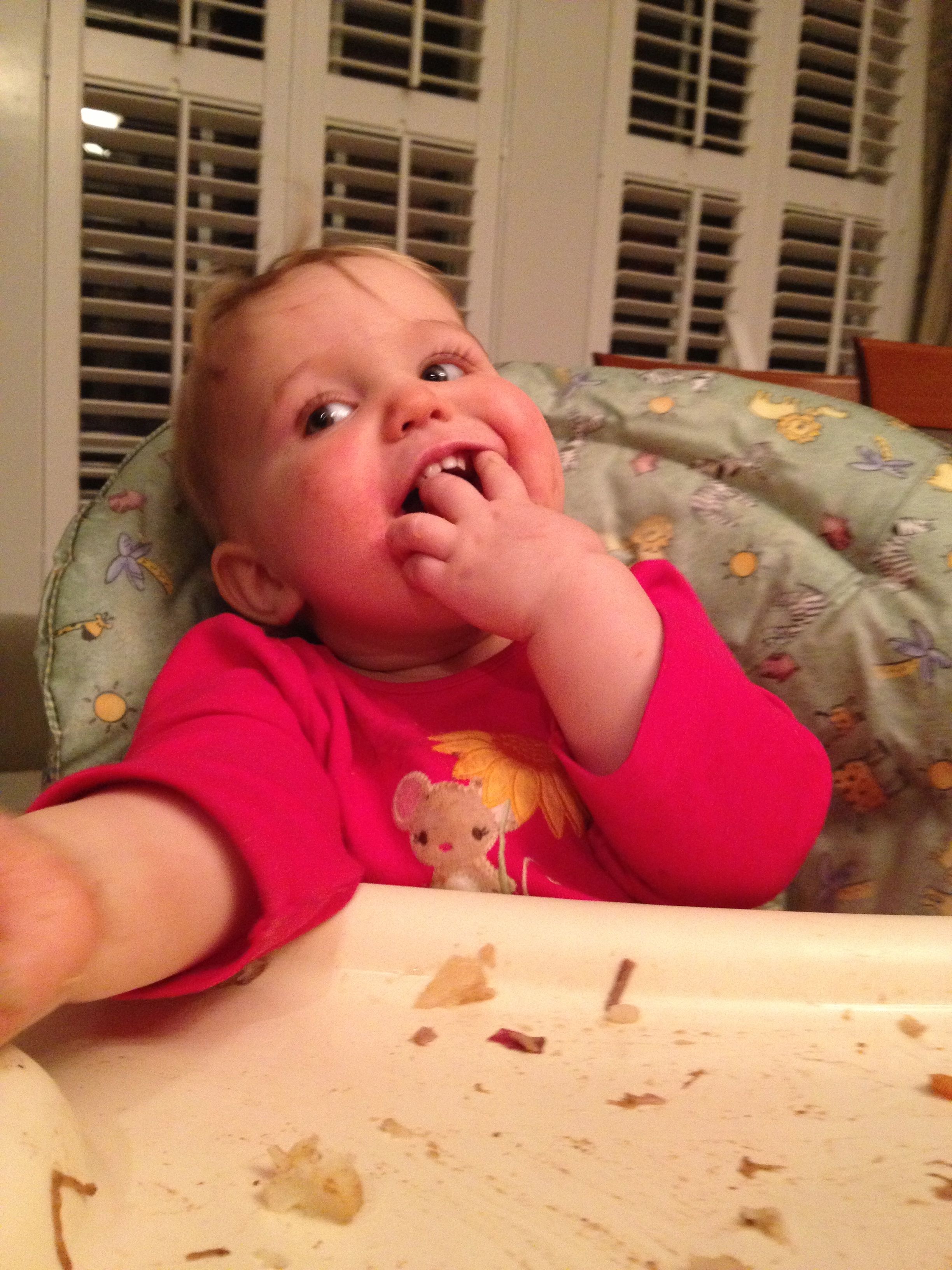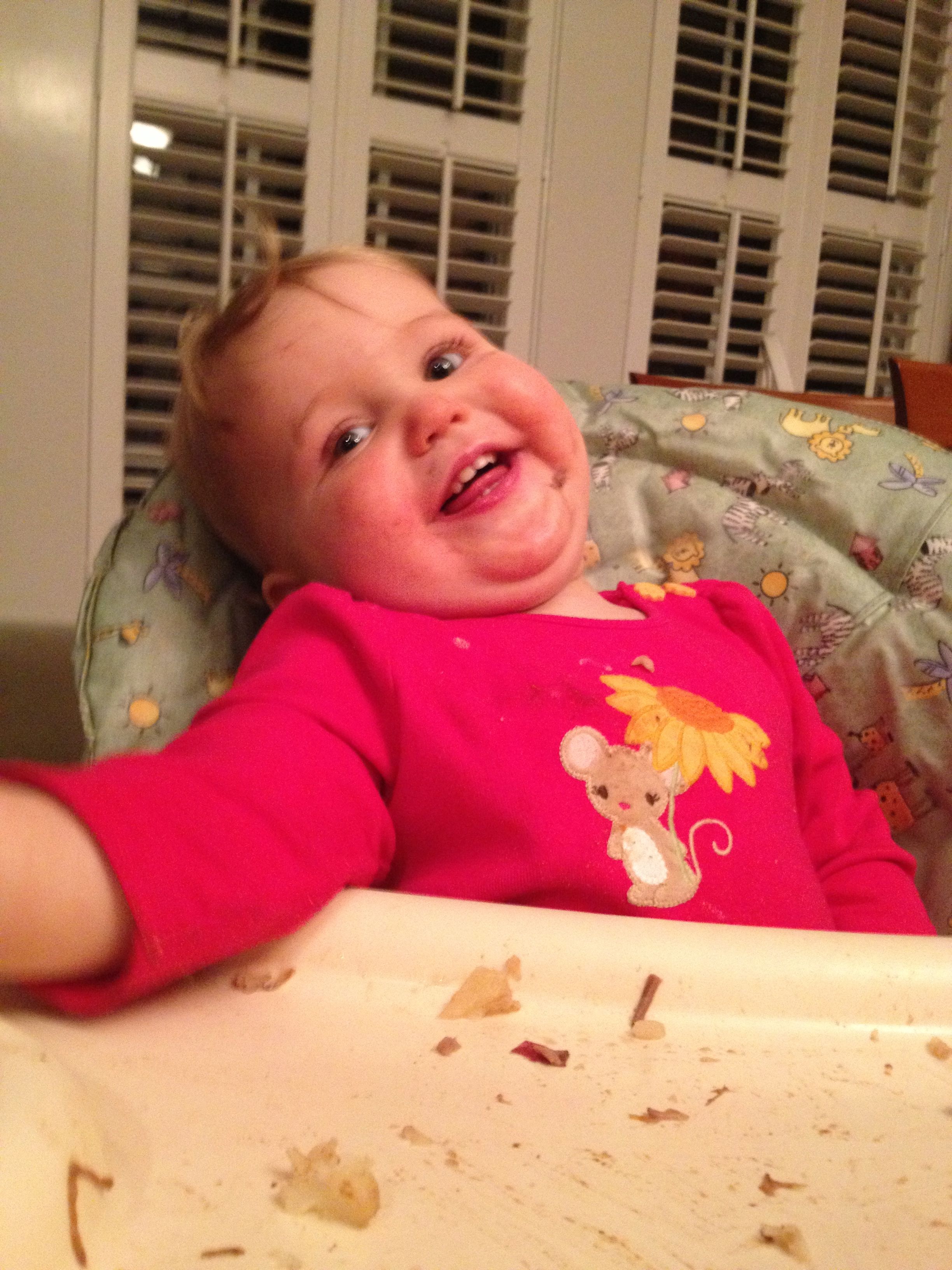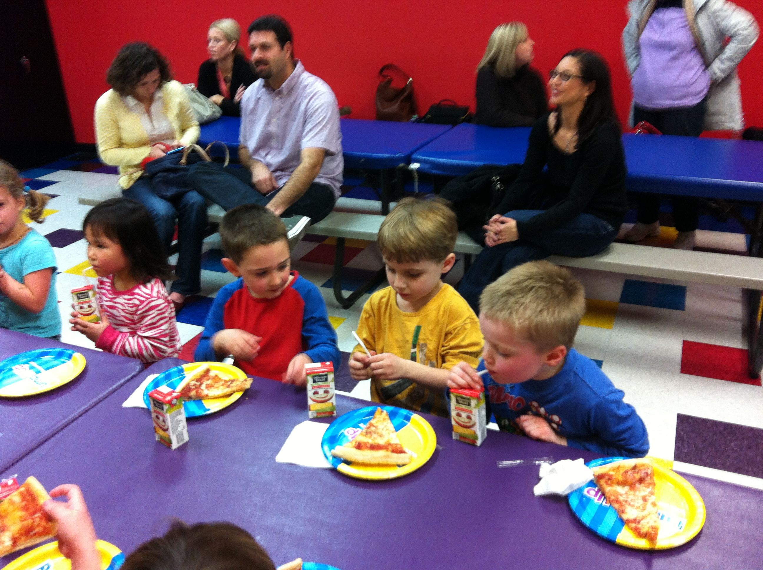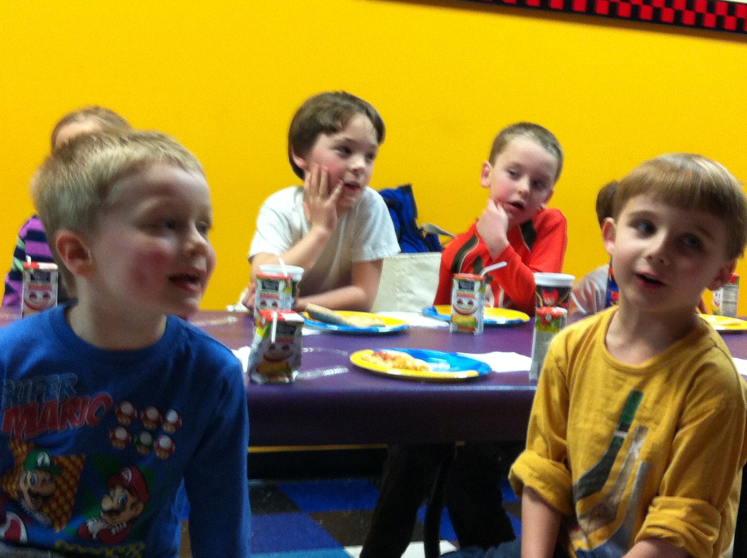 It had to happen sooner or later–tonight was Brian’s first Friday night party.  🙂  His pal Drew’s birthday was this evening after school, out at once of those indoor bounce-house places.  I knew that Kendall wouldn’t be up for all that action, so late in the evening, especially after being back in school, so I stayed home with her and had a girls’ night.  🙂  I’ll be honest, I am not a huge fan of those places, the noise is a little much for me and every surface feels sort of..  sticky.  Ew!   😀  Kendall was really into her dinner (as usual!) and I caught a couple great smiles.  The boys stayed out, bouncing past bedtime, and Brian came home thoroughly exhausted, but happy that he got to stay out late with his best buddies, Ty and Drew.  He loved playing air hockey, of course, it’s one of his favorites!