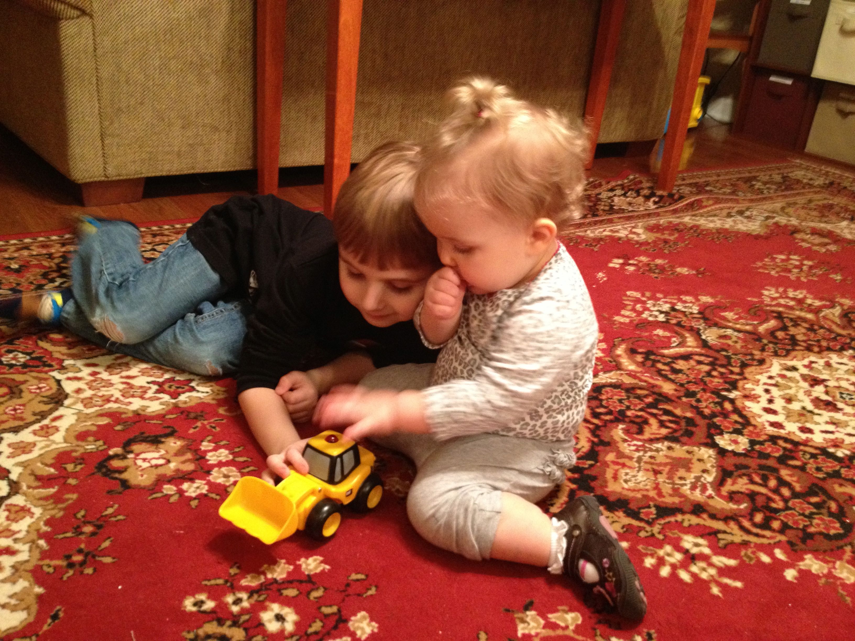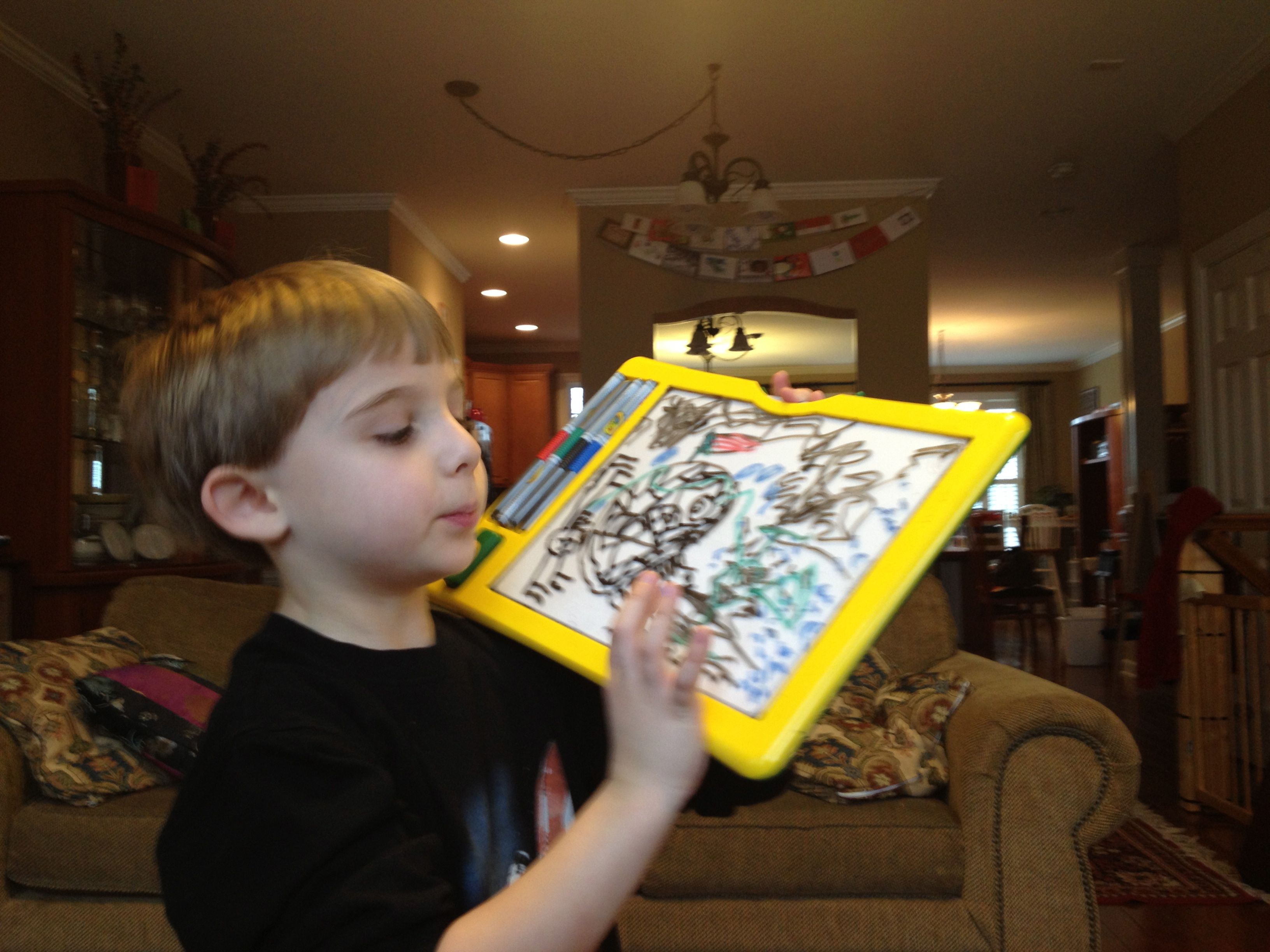 Brian’s markerboard continues to be a hit! He’s not interested in the writing templates, he wants to make his own creations. I think we’re looking at a Death Star with an American flag on it–there’s a lot going on here! The thermal exhaust port only two meters wide, and Han Solo coming in to help at the last moment. Kendall is pretty interested in the markerboard, too, but as Brian reminds her, it’s not for babies. He decided to share his remote control truck with her today, and she was pretty excited about that. 🙂