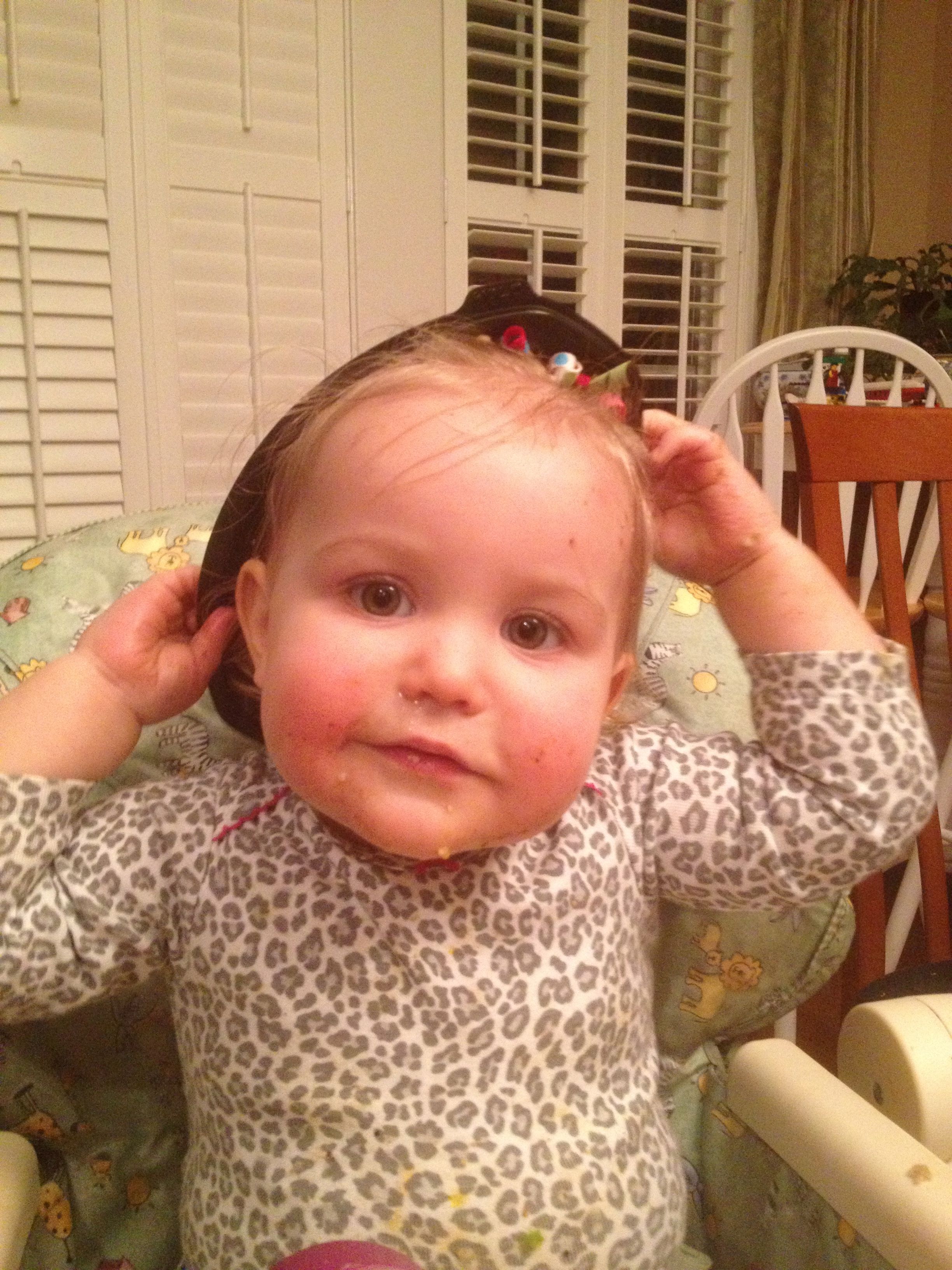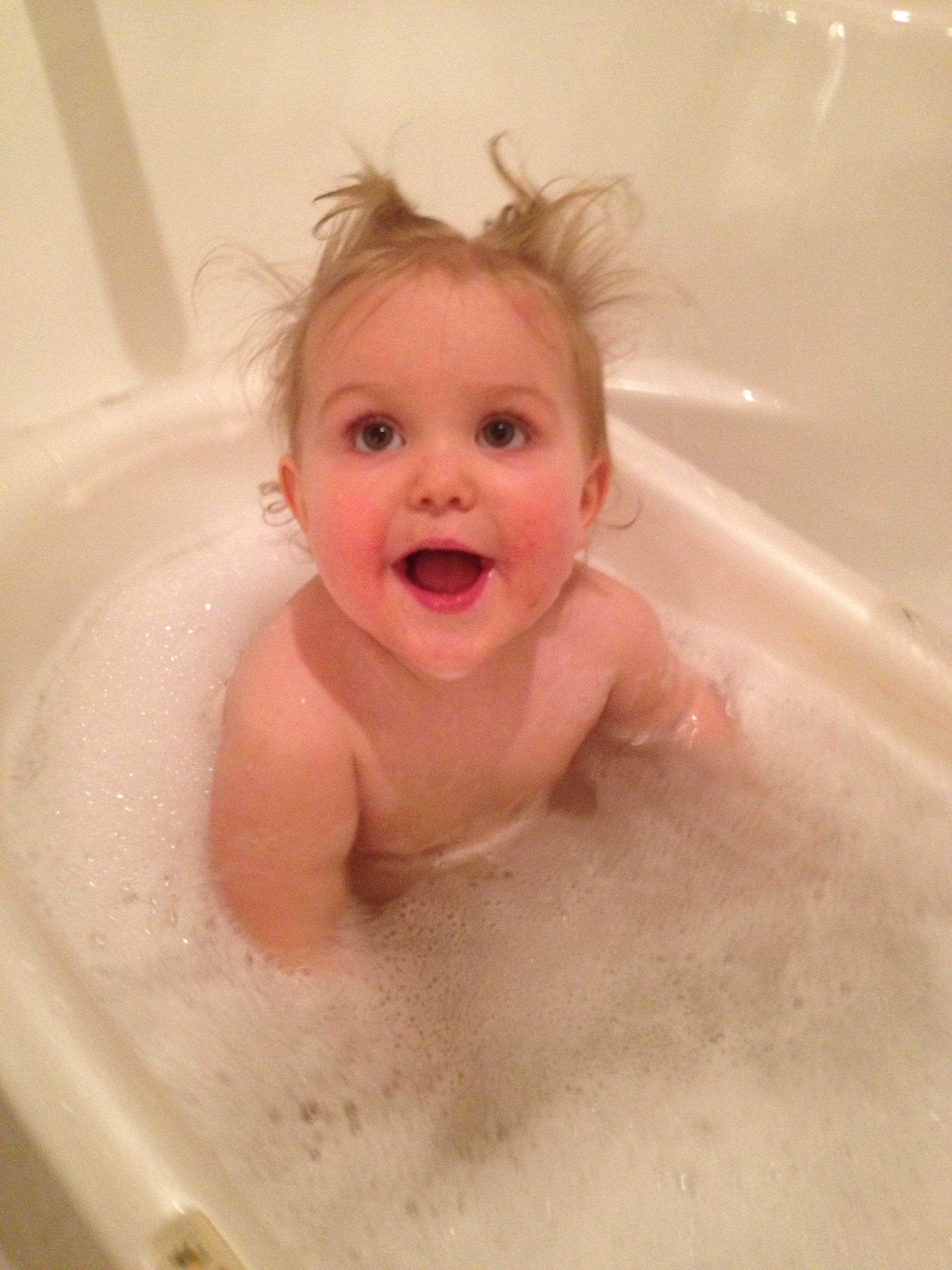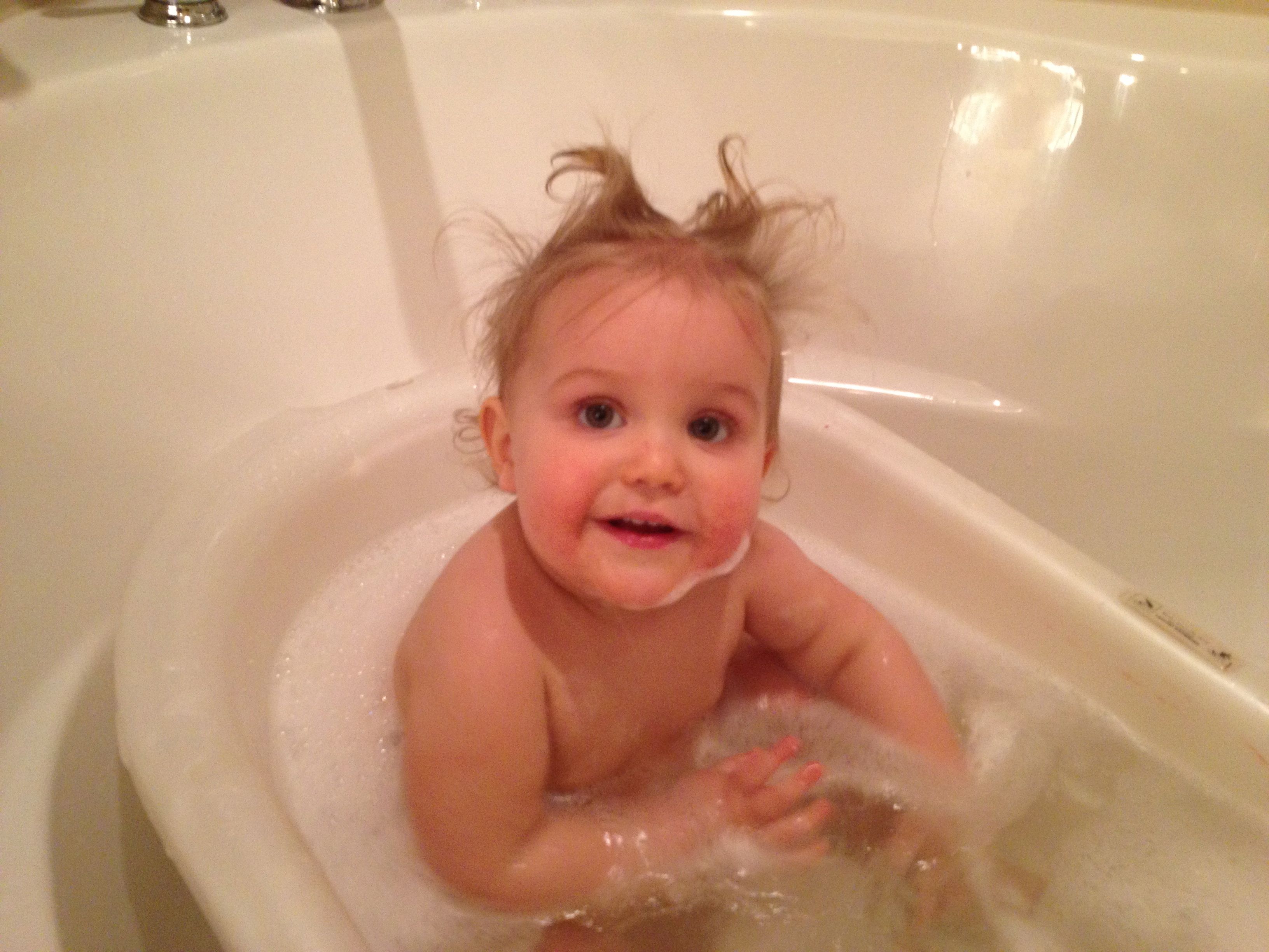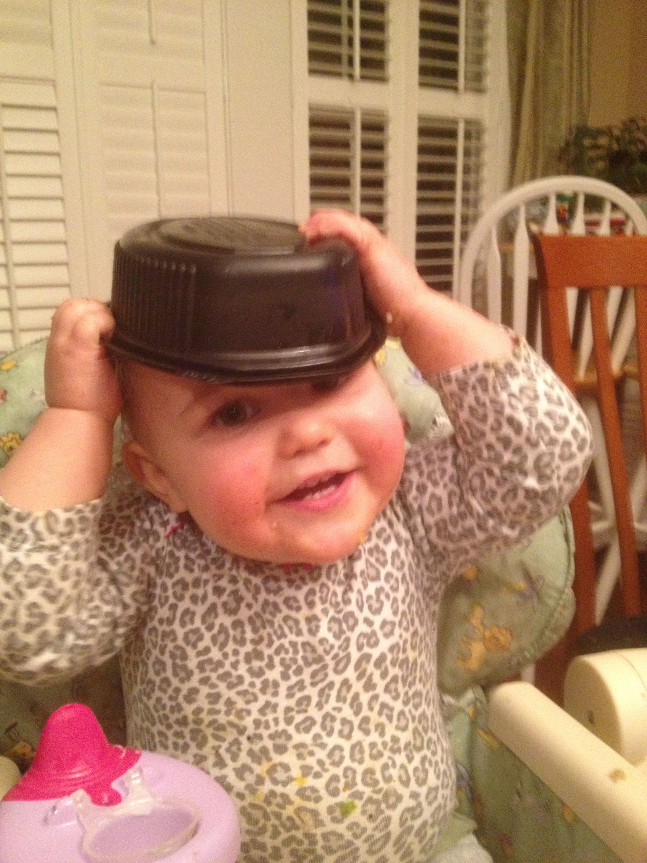 Tonight was a hockey night for the boys, but us girls had a fun night in by ourselves! Kendall practiced cruising a bit, and played with Duplos a bit. We had some leftovers from Guasaca for dinner, and Kendall is all about the avocado. She very clearly asked me for one of the containers, so I handed it to her.. She promptly put it on her head and modeled her hat for me! She was so proud of herself. I also decided to let her have a couple of spice cookies for dessert, and wow–she loved them! Later, we had bubble bath time–isn’t she adorable?! Even with the beans in her hair. 🙂
