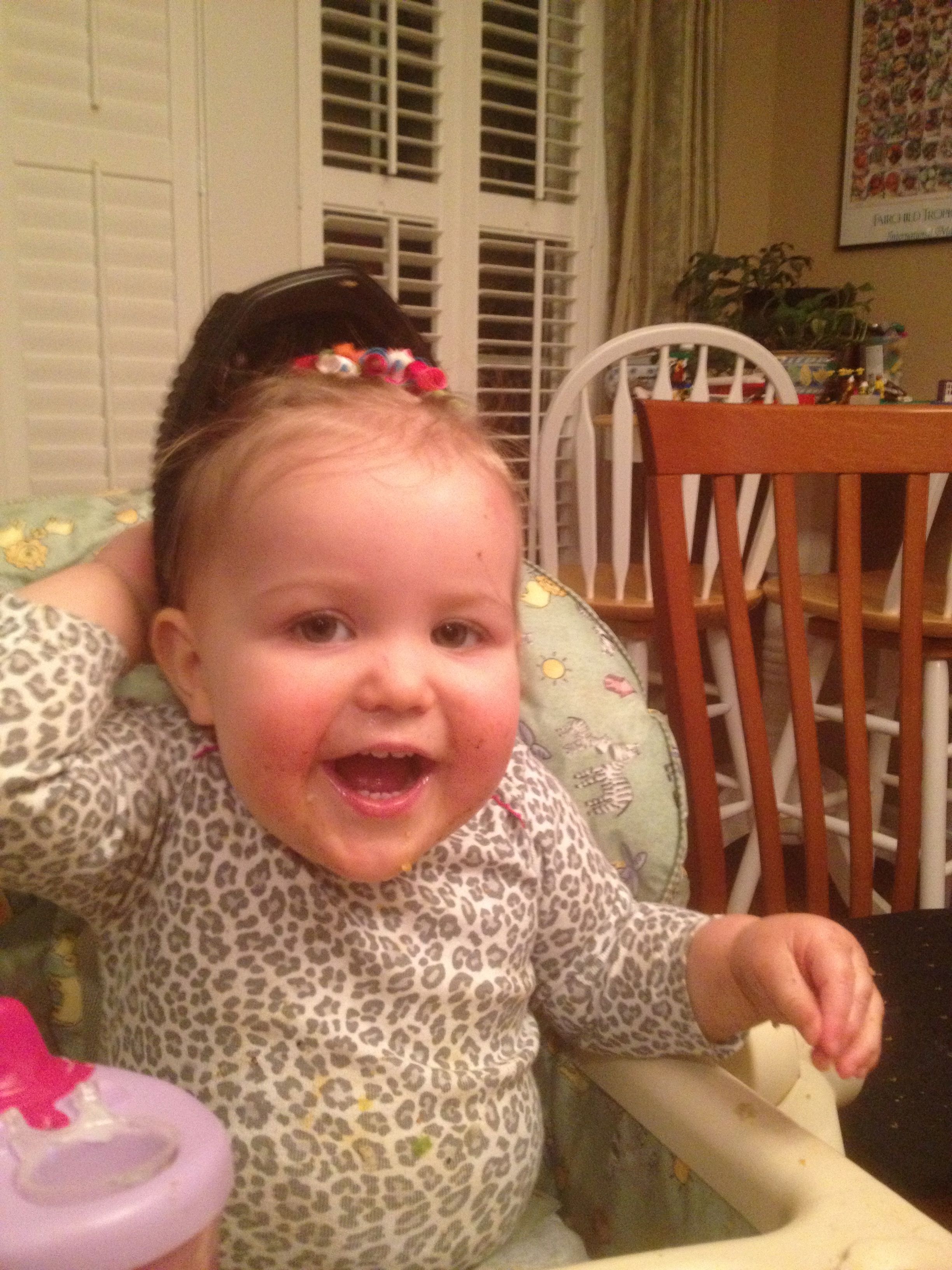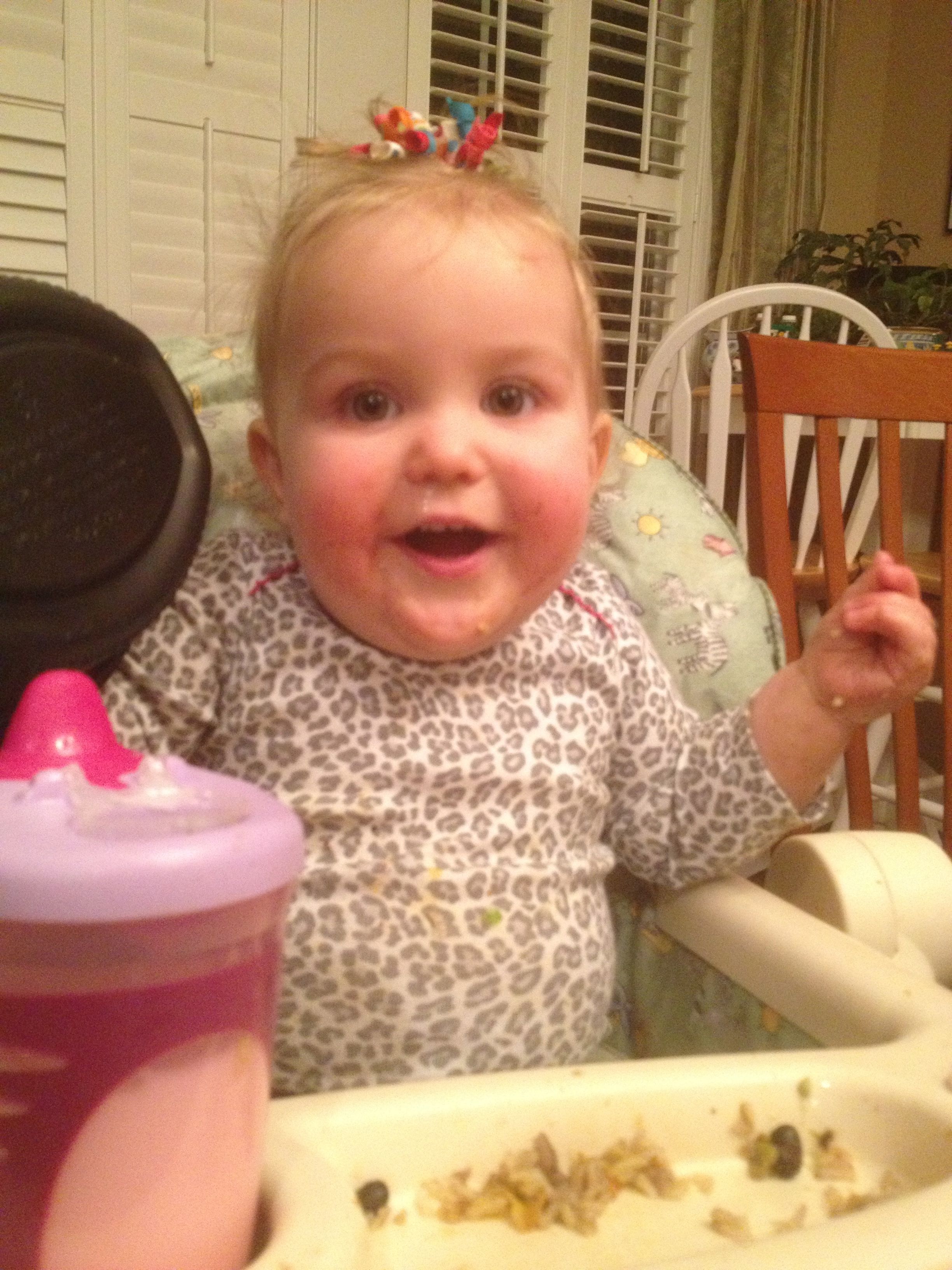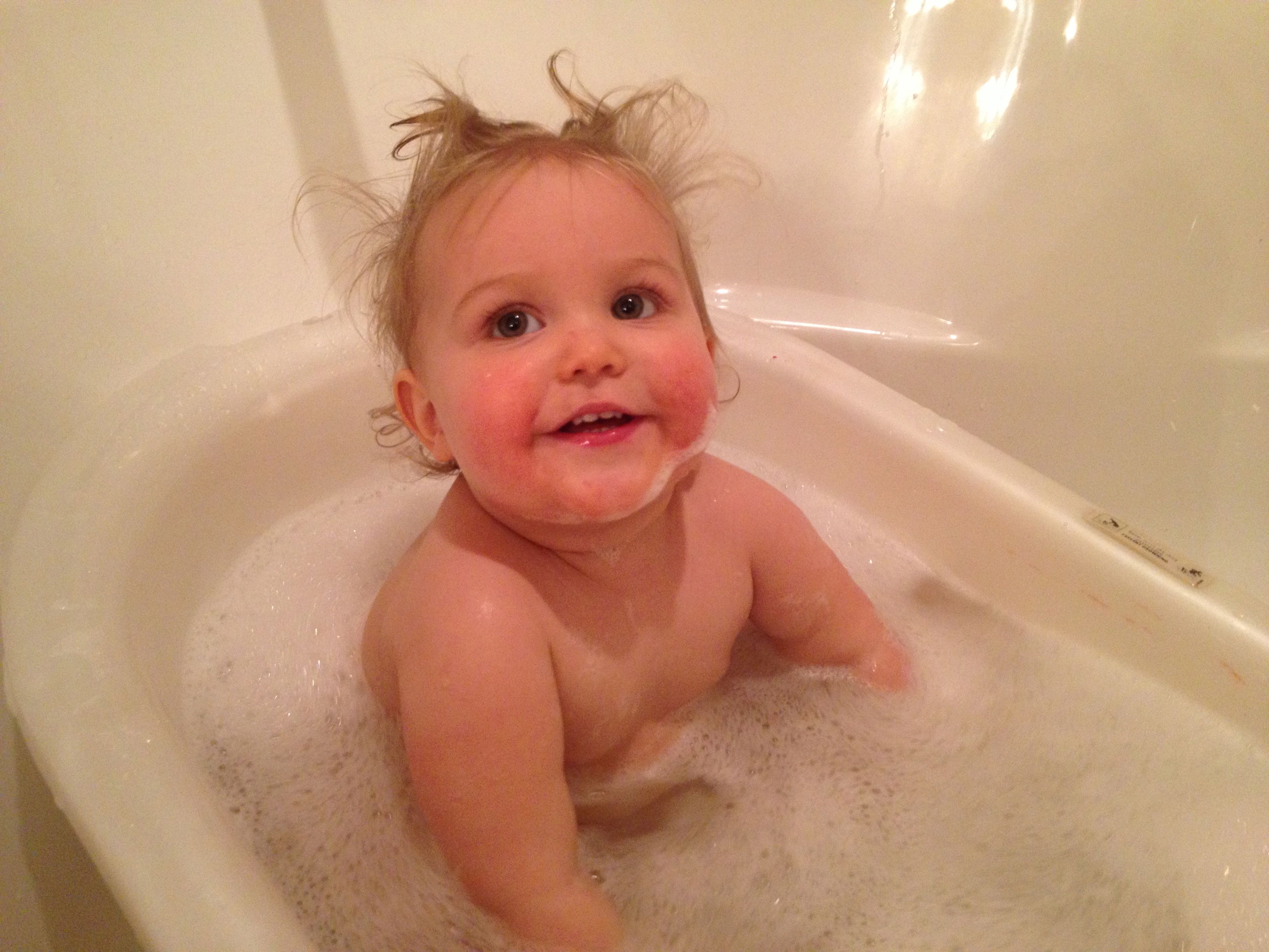 Tonight was a hockey night for the boys, but us girls had a fun night in by ourselves! Kendall practiced cruising a bit, and played with Duplos a bit. We had some leftovers from Guasaca for dinner, and Kendall is all about the avocado. She very clearly asked me for one of the containers, so I handed it to her.. She promptly put it on her head and modeled her hat for me! She was so proud of herself. I also decided to let her have a couple of spice cookies for dessert, and wow–she loved them! Later, we had bubble bath time–isn’t she adorable?! Even with the beans in her hair. 🙂