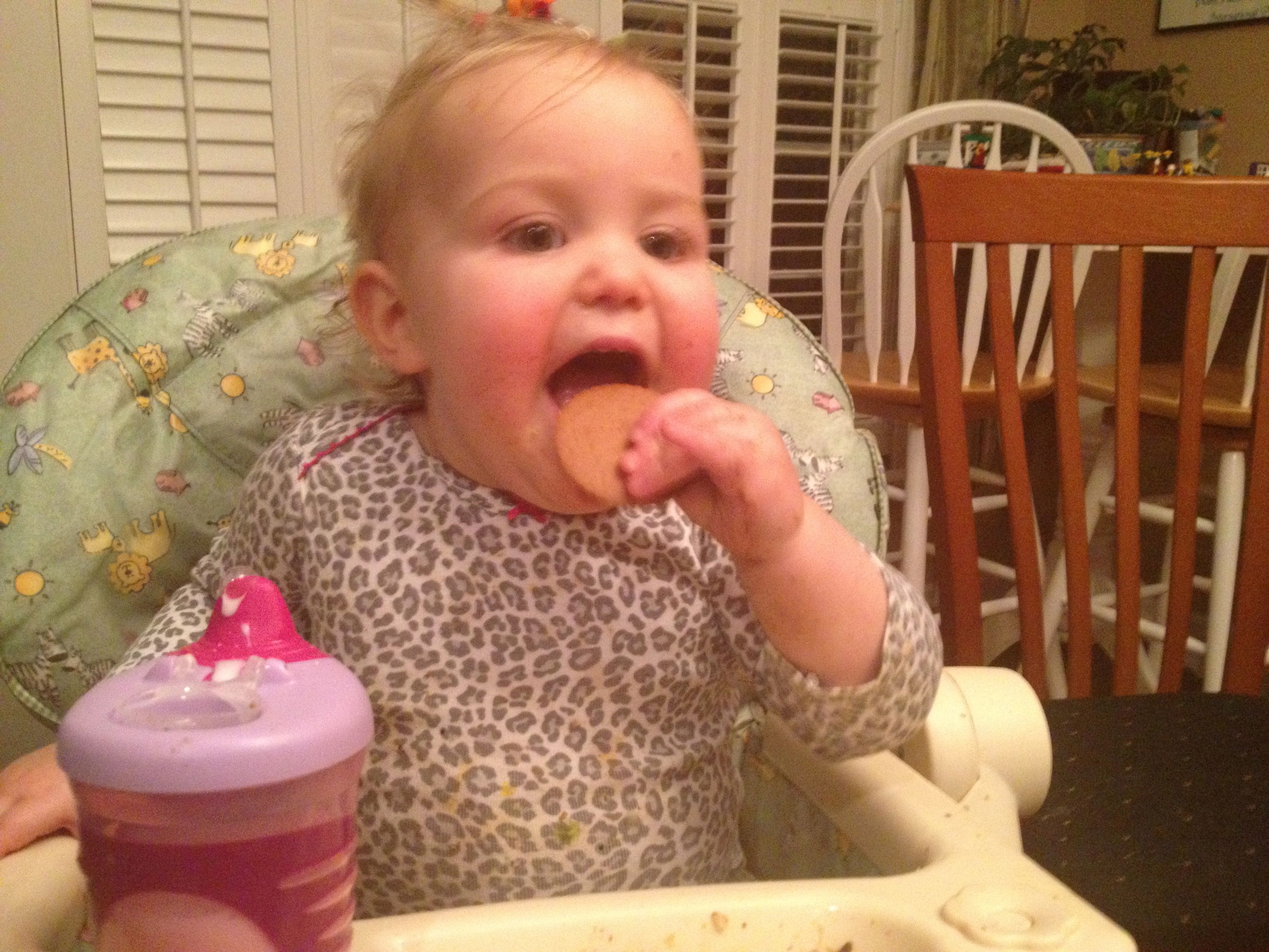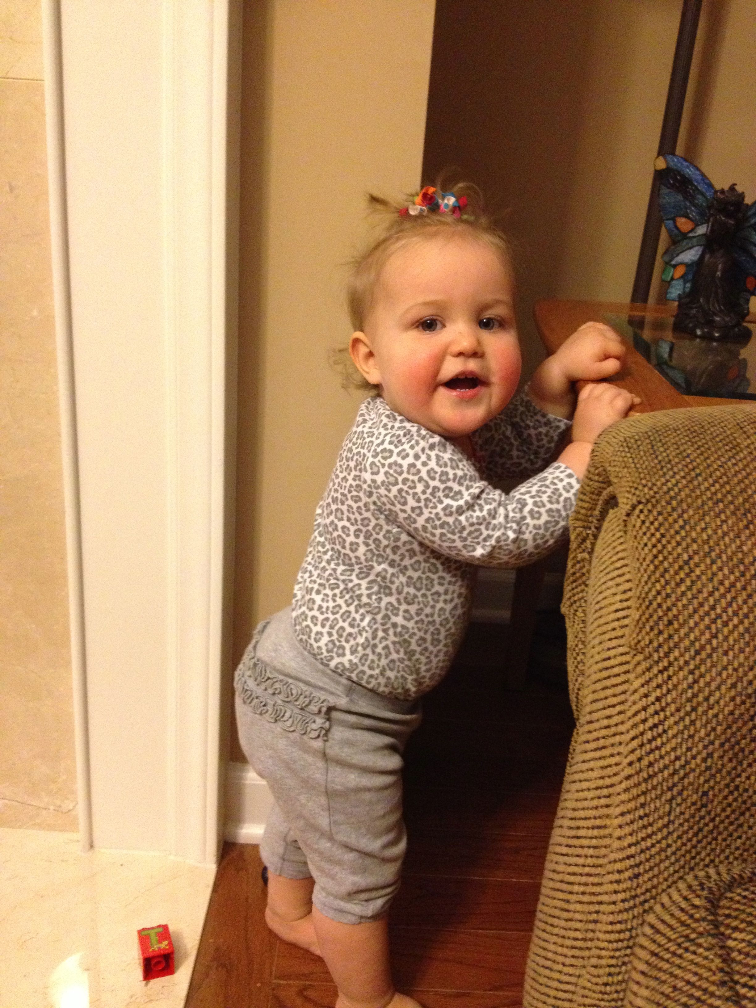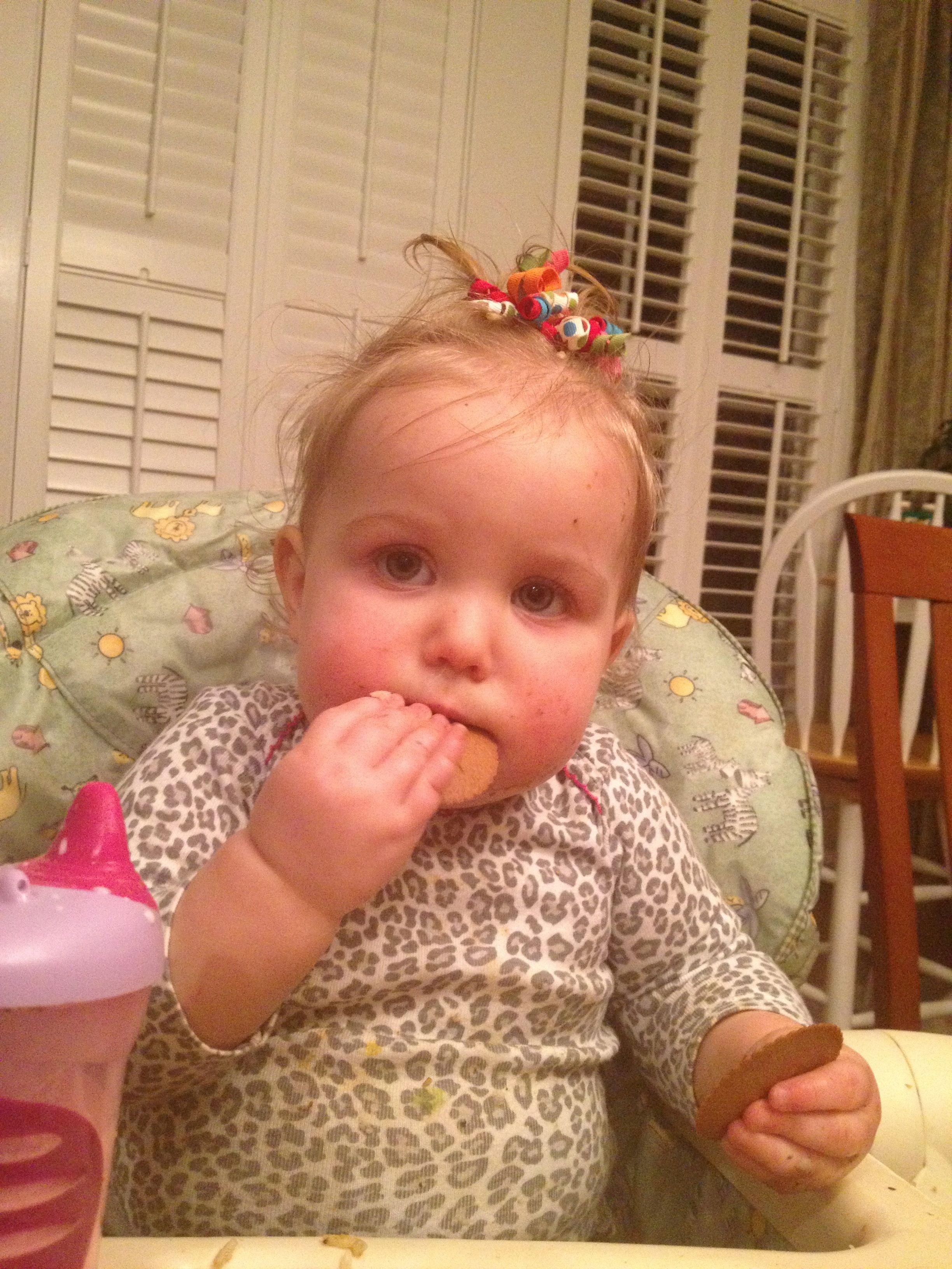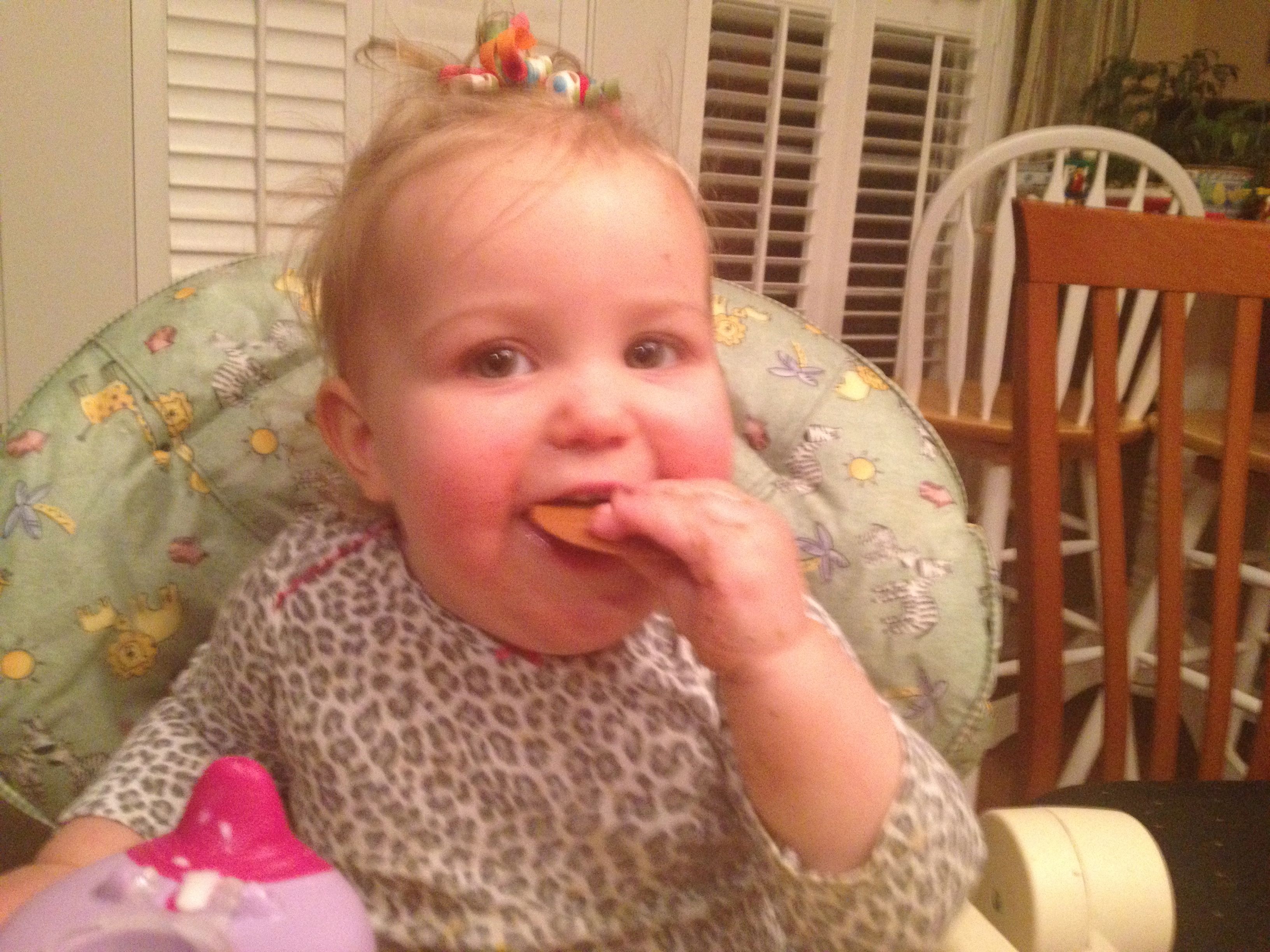 Tonight was a hockey night for the boys, but us girls had a fun night in by ourselves! Kendall practiced cruising a bit, and played with Duplos a bit. We had some leftovers from Guasaca for dinner, and Kendall is all about the avocado. She very clearly asked me for one of the containers, so I handed it to her.. She promptly put it on her head and modeled her hat for me! She was so proud of herself. I also decided to let her have a couple of spice cookies for dessert, and wow–she loved them! Later, we had bubble bath time–isn’t she adorable?! Even with the beans in her hair. 🙂