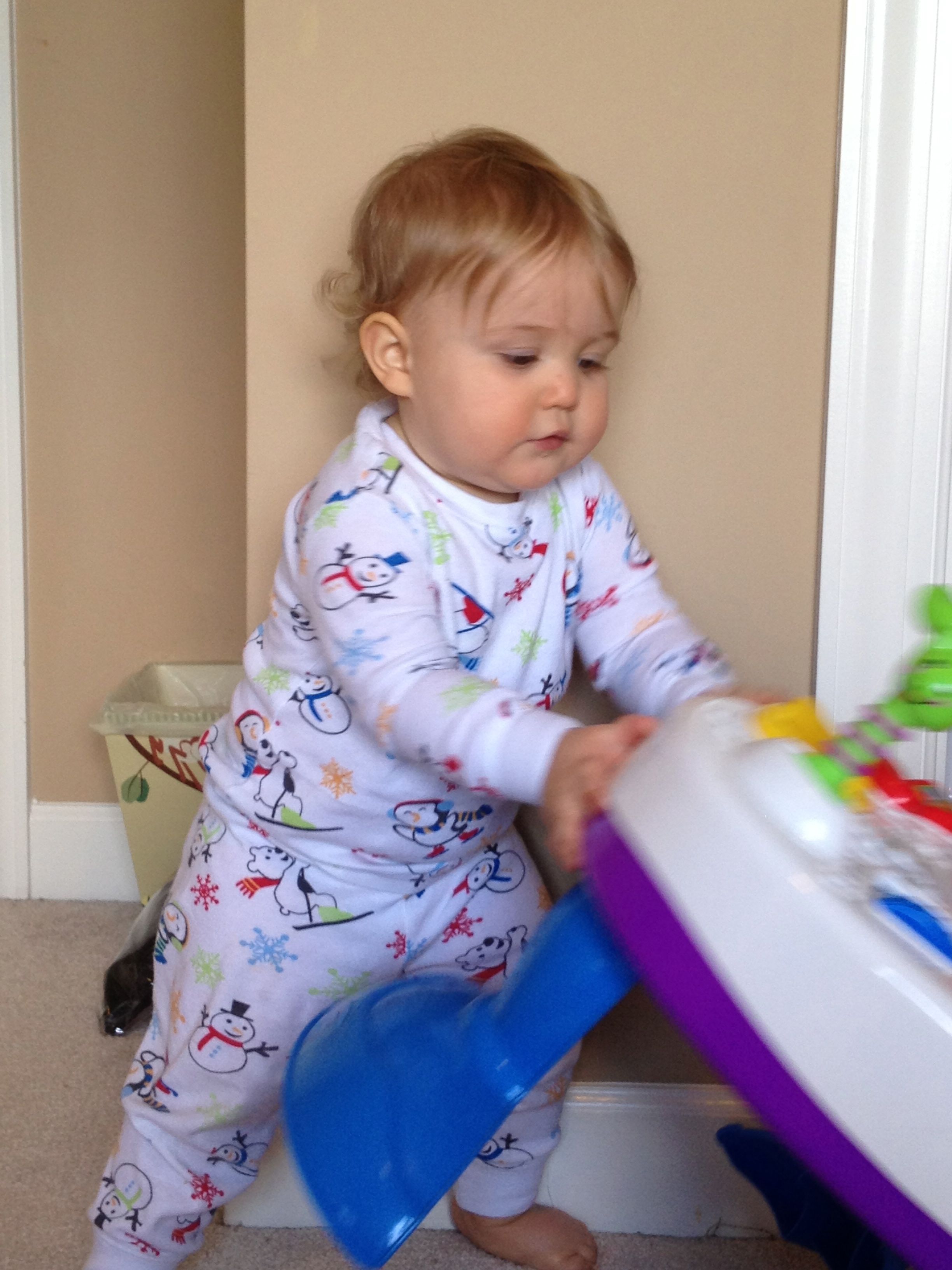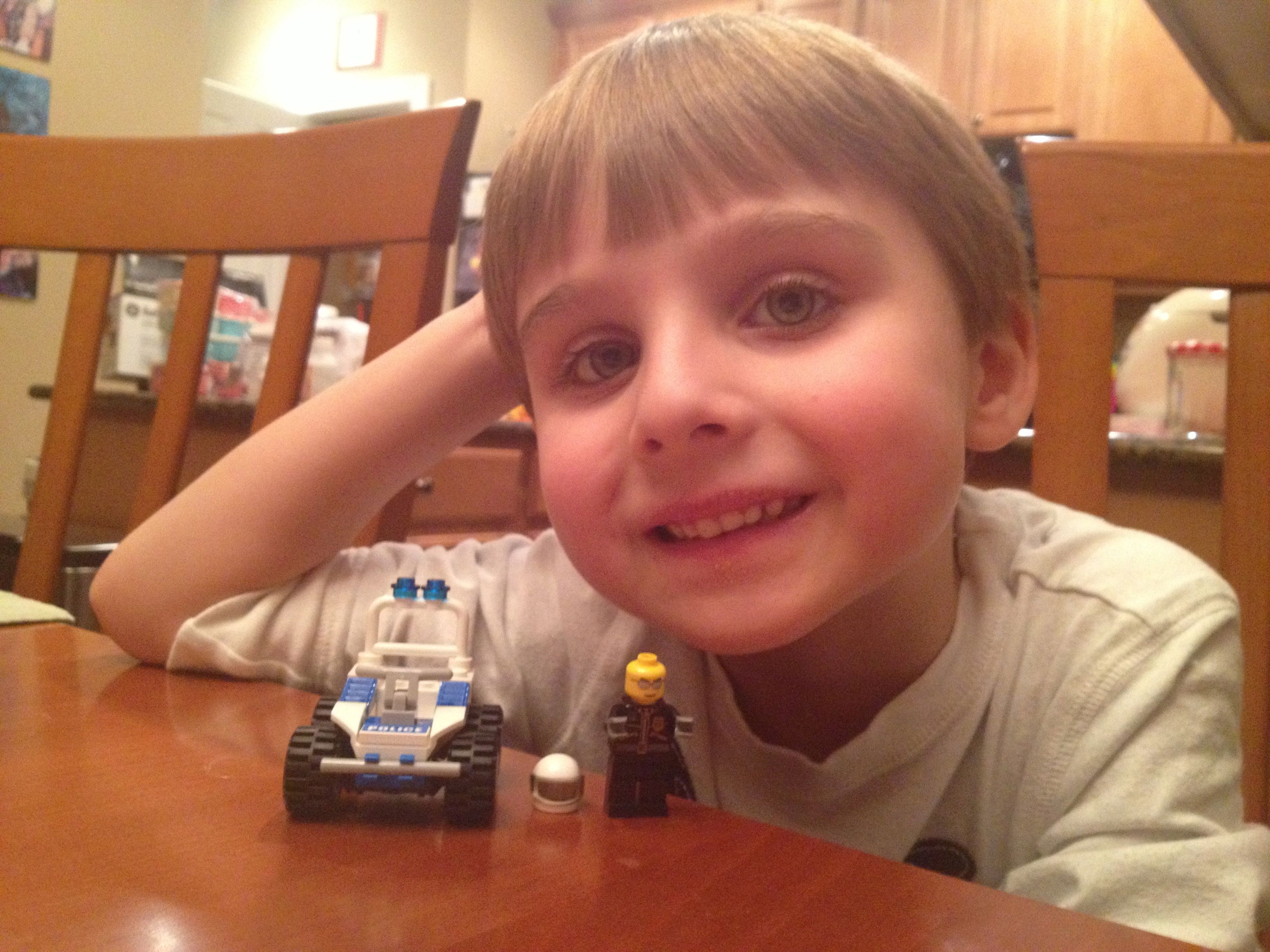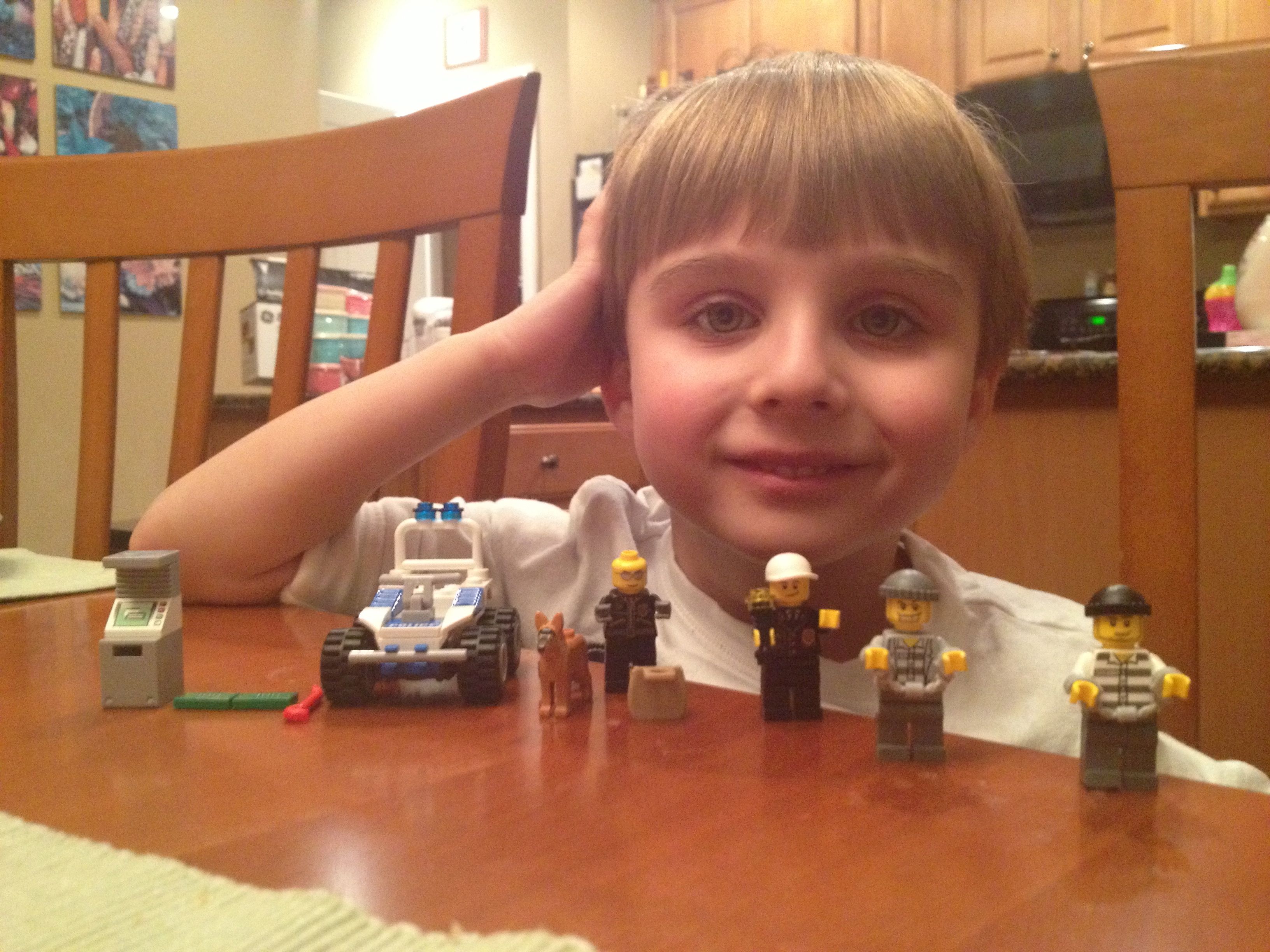 Kendall has been doing a little more standing on her own, and starting to pivot a bit, but no more steps lately.. She’s gaining confidence in her own way. She’s quite the determined little girl–just look at that face! She just loves that cookie match game, and she will work at taking those cookies apart until she gets it! She seems to sort the cookie tops and bottoms into different piles. She can even put some of the simpler shapes back together, which I am so impressed with. She loves playing that toy piano, as does Brian. He can play some simple tunes on there, and I’m amazed at how quickly he picks up what I show him. He can even play the first few bars of the Star Wars main title! I surprised Brian with a little gift today when we got home from our anniversary trip, some Lego policemen and crooks (since he missed the ones from his Advent calendar once we put them away for next year). He had a blast putting them together and staging an ATM heist or two–but in his stories, the bad guys usually turn out to be good guys in the end, and everyone plays together as friends. 🙂