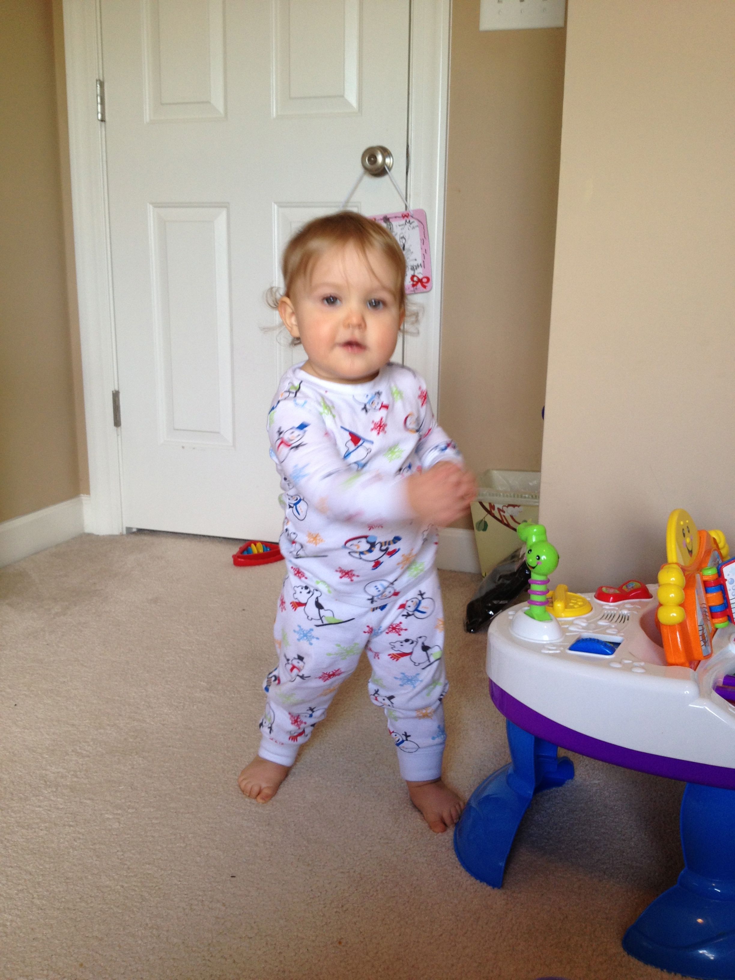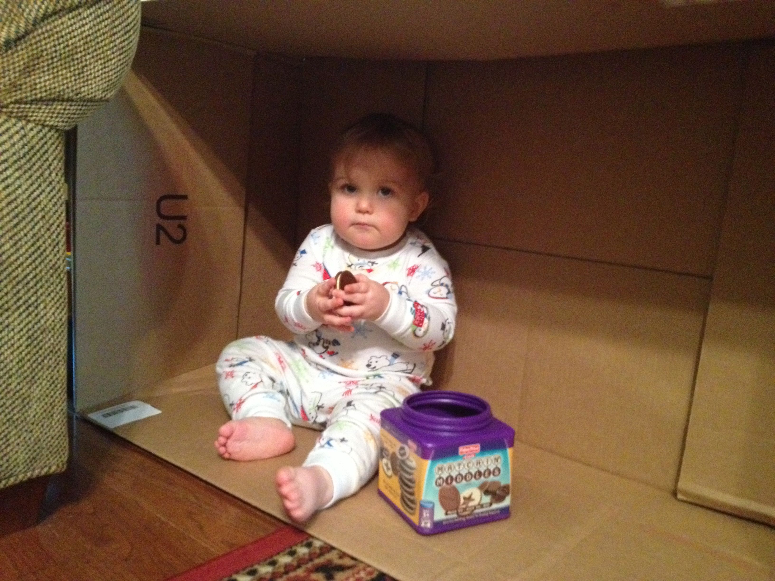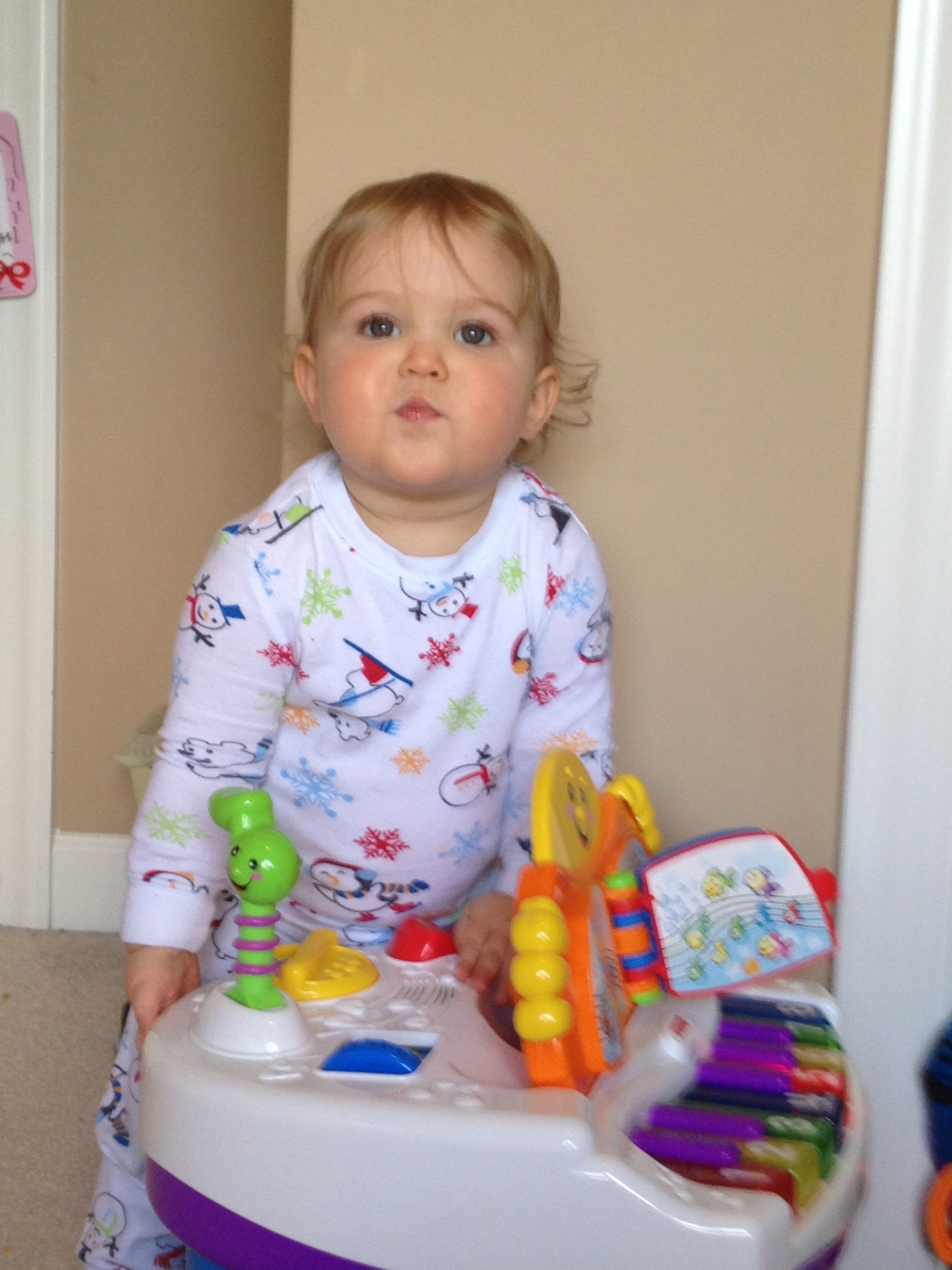 Kendall has been doing a little more standing on her own, and starting to pivot a bit, but no more steps lately.. She’s gaining confidence in her own way. She’s quite the determined little girl–just look at that face! She just loves that cookie match game, and she will work at taking those cookies apart until she gets it! She seems to sort the cookie tops and bottoms into different piles. She can even put some of the simpler shapes back together, which I am so impressed with. She loves playing that toy piano, as does Brian. He can play some simple tunes on there, and I’m amazed at how quickly he picks up what I show him. He can even play the first few bars of the Star Wars main title! I surprised Brian with a little gift today when we got home from our anniversary trip, some Lego policemen and crooks (since he missed the ones from his Advent calendar once we put them away for next year). He had a blast putting them together and staging an ATM heist or two–but in his stories, the bad guys usually turn out to be good guys in the end, and everyone plays together as friends. 🙂
