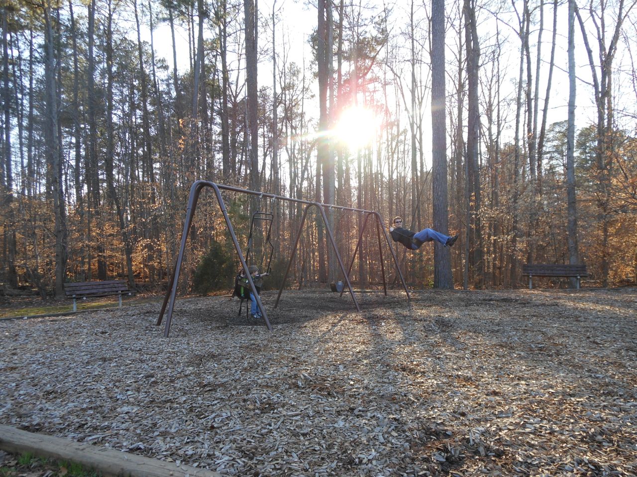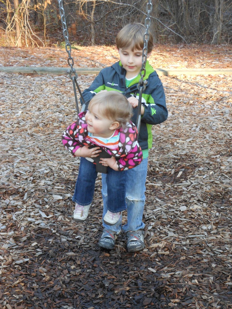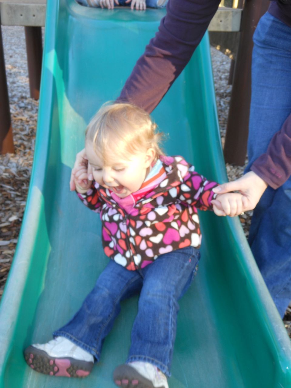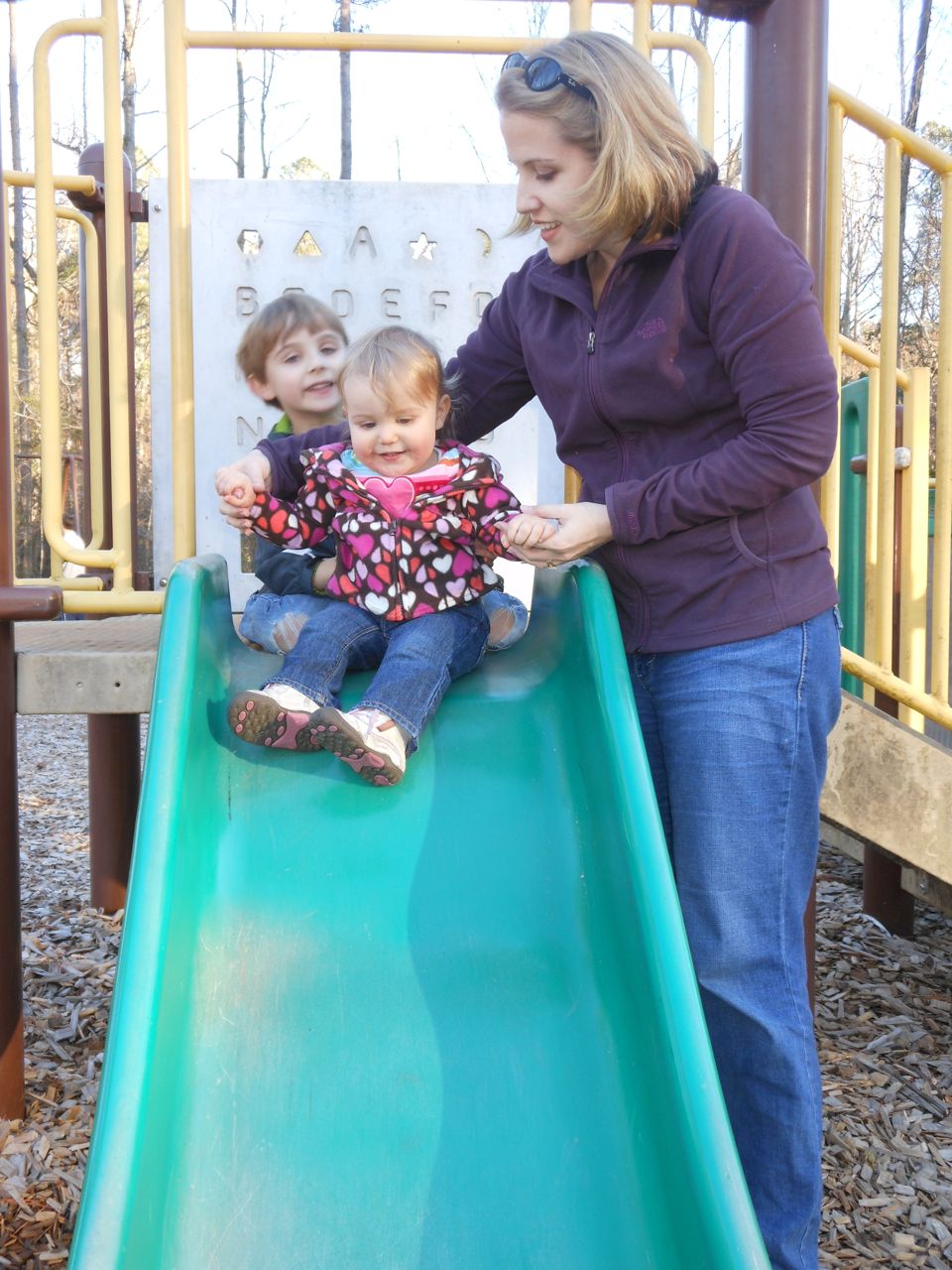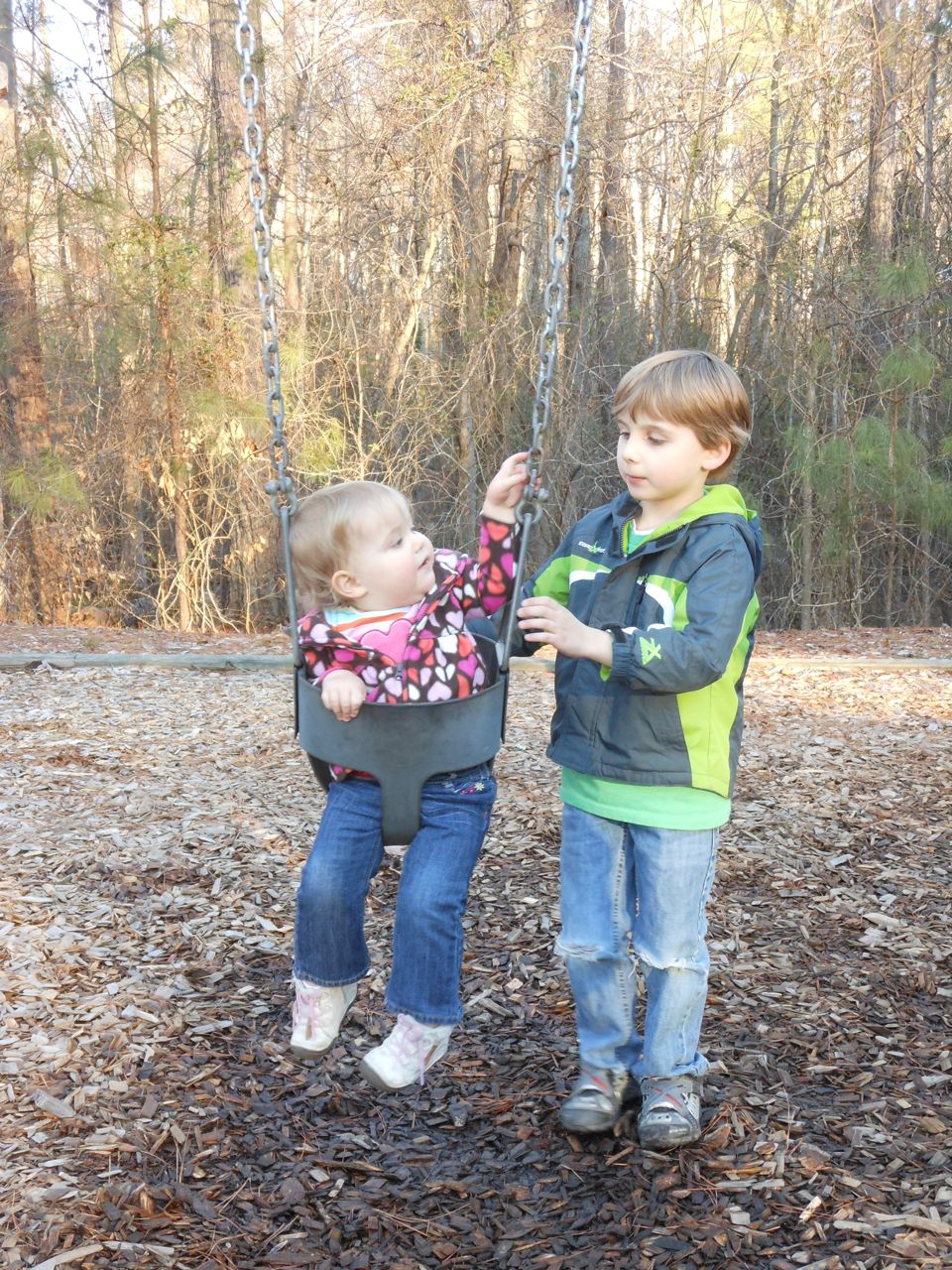 Both before and after our walking/biking/strolling/feeding tour, Brian wanted some playground time. He almost didn’t remember there was some playground equipment at this park, since we don’t always use it, but he was happy once we showed him! He learned about locking his bike up at the bike rack, and practiced locking and unlocking it with Daddy (who remembered the code! Whew!) Kendall enjoyed some swing time and became a huge fan of the slide. She showed off some newfound walking confidence, by taking a lot of steps by herself! Go, Kendall! And just in time for her upcoming 15-month checkup, too! (I’ve been trying not to flip out about her not walking, as long as she takes off before her checkup next week!) Brian wanted to try the adaptive swing, and Brandon tried coaching him on how to pump his legs to get more momentum going. He’s making some progress there. The sun was setting, but Brian managed to fit in some whirlwind games of “I’m in jail” and “welcome to my lemonade stand!” before we had to leave.