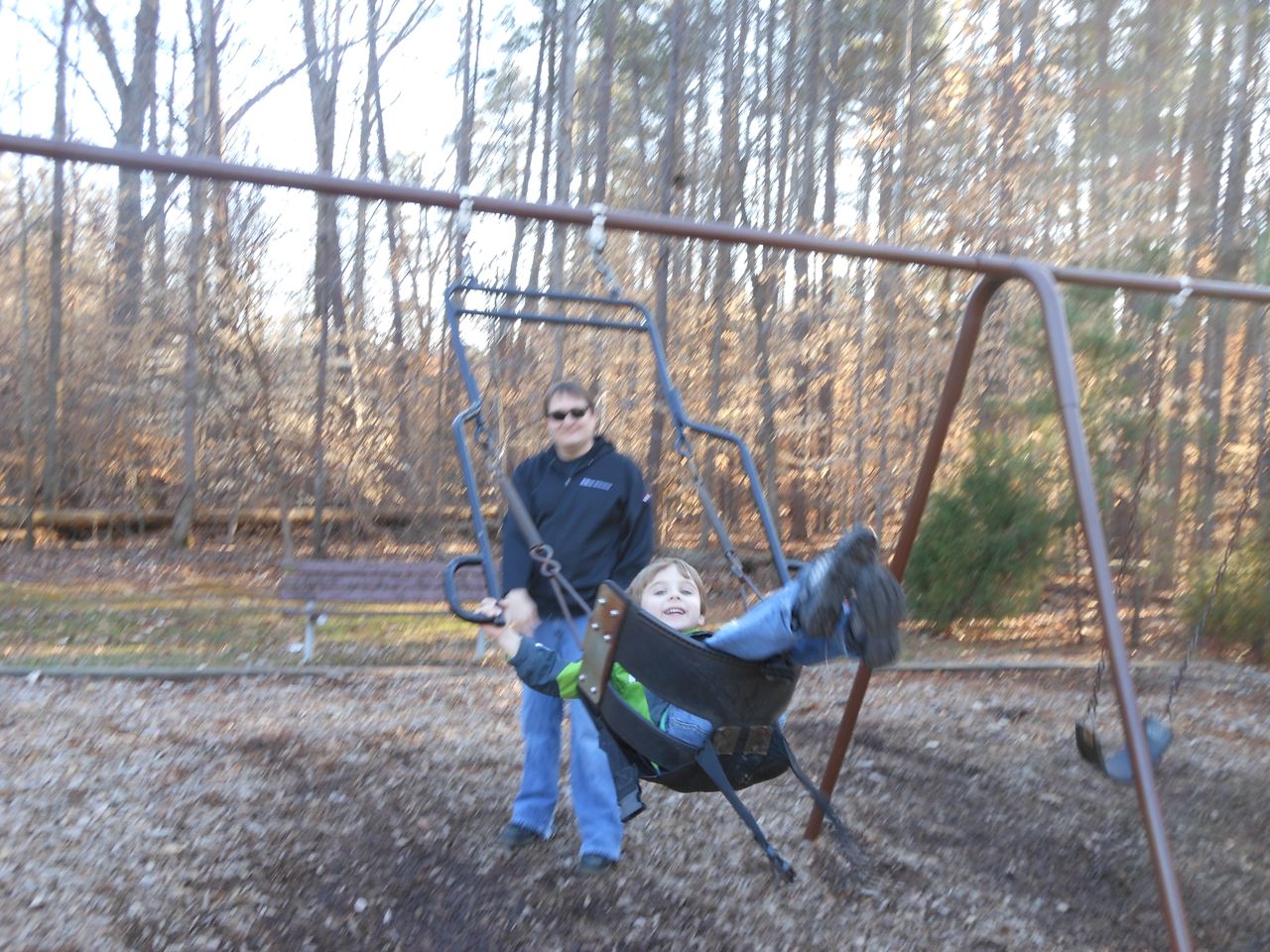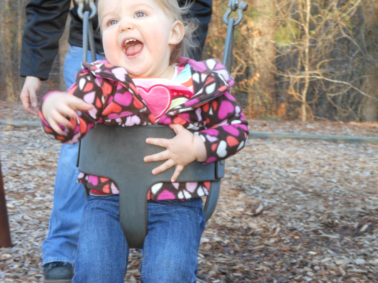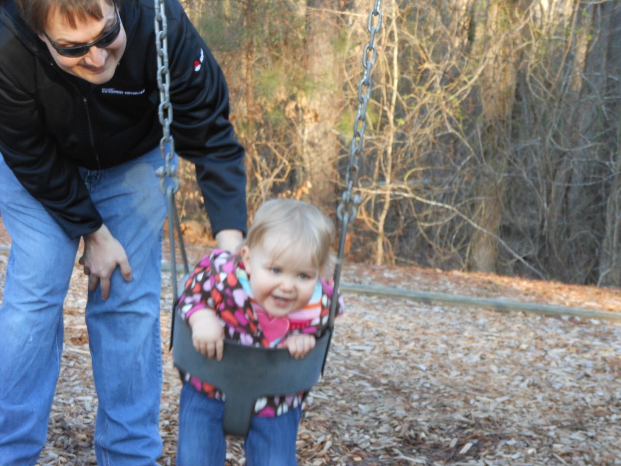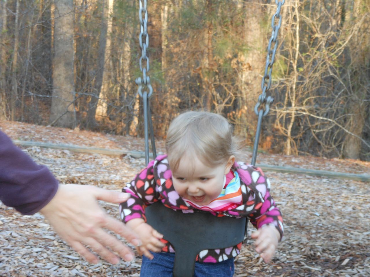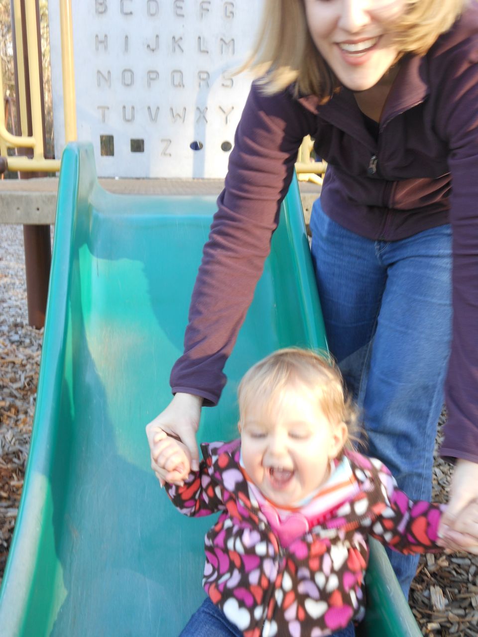 Both before and after our walking/biking/strolling/feeding tour, Brian wanted some playground time. He almost didn’t remember there was some playground equipment at this park, since we don’t always use it, but he was happy once we showed him! He learned about locking his bike up at the bike rack, and practiced locking and unlocking it with Daddy (who remembered the code! Whew!) Kendall enjoyed some swing time and became a huge fan of the slide. She showed off some newfound walking confidence, by taking a lot of steps by herself! Go, Kendall! And just in time for her upcoming 15-month checkup, too! (I’ve been trying not to flip out about her not walking, as long as she takes off before her checkup next week!) Brian wanted to try the adaptive swing, and Brandon tried coaching him on how to pump his legs to get more momentum going. He’s making some progress there. The sun was setting, but Brian managed to fit in some whirlwind games of “I’m in jail” and “welcome to my lemonade stand!” before we had to leave.