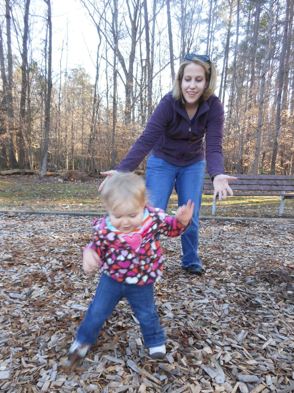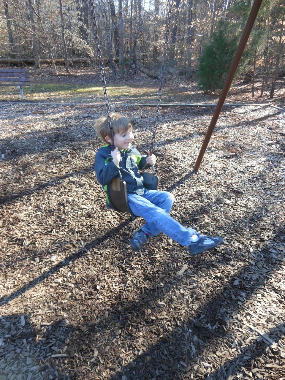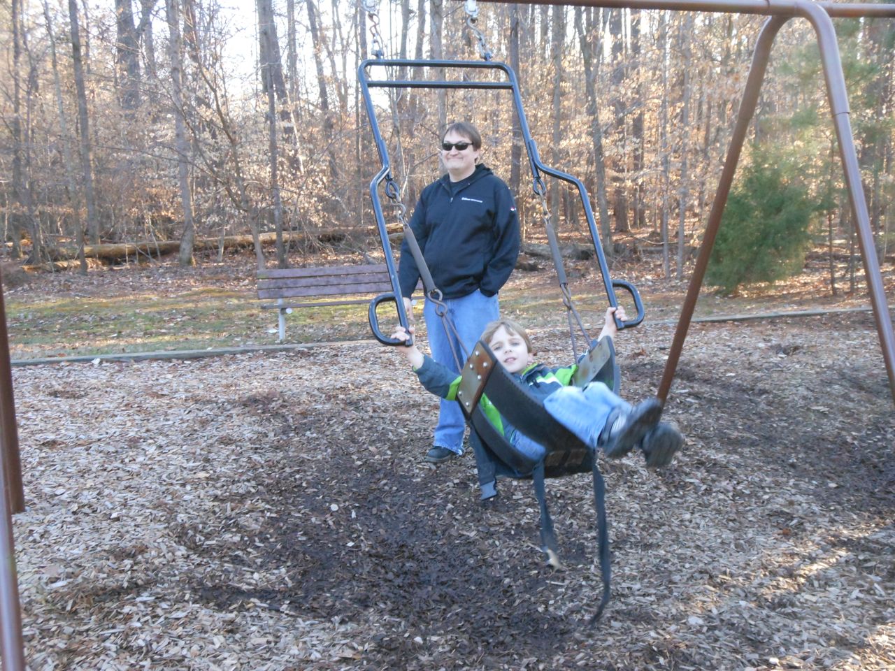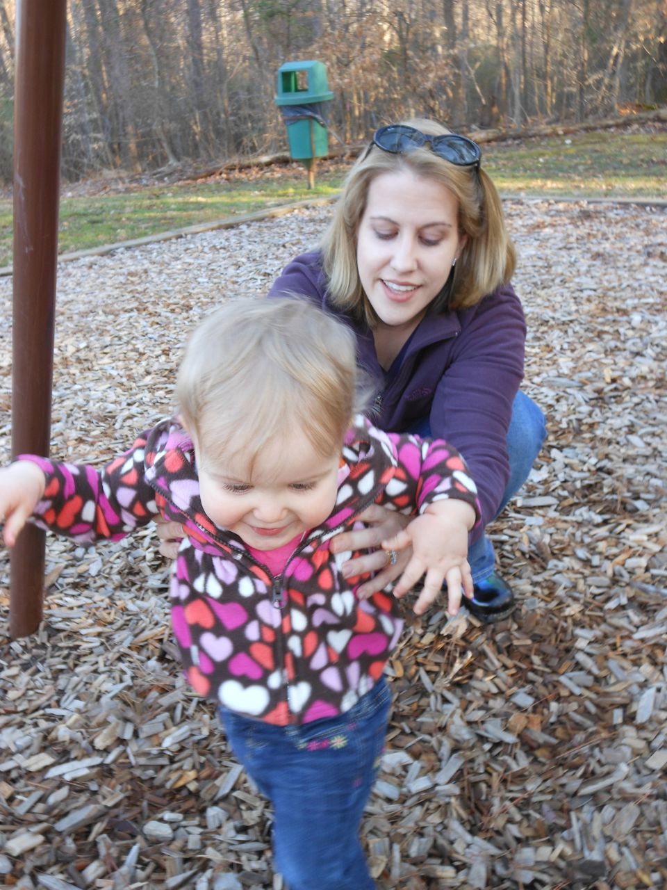 Both before and after our walking/biking/strolling/feeding tour, Brian wanted some playground time. He almost didn’t remember there was some playground equipment at this park, since we don’t always use it, but he was happy once we showed him! He learned about locking his bike up at the bike rack, and practiced locking and unlocking it with Daddy (who remembered the code! Whew!) Kendall enjoyed some swing time and became a huge fan of the slide. She showed off some newfound walking confidence, by taking a lot of steps by herself! Go, Kendall! And just in time for her upcoming 15-month checkup, too! (I’ve been trying not to flip out about her not walking, as long as she takes off before her checkup next week!) Brian wanted to try the adaptive swing, and Brandon tried coaching him on how to pump his legs to get more momentum going. He’s making some progress there. The sun was setting, but Brian managed to fit in some whirlwind games of “I’m in jail” and “welcome to my lemonade stand!” before we had to leave.
