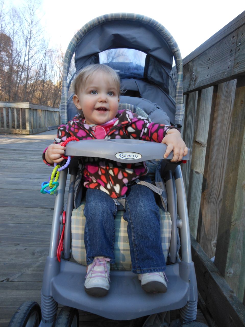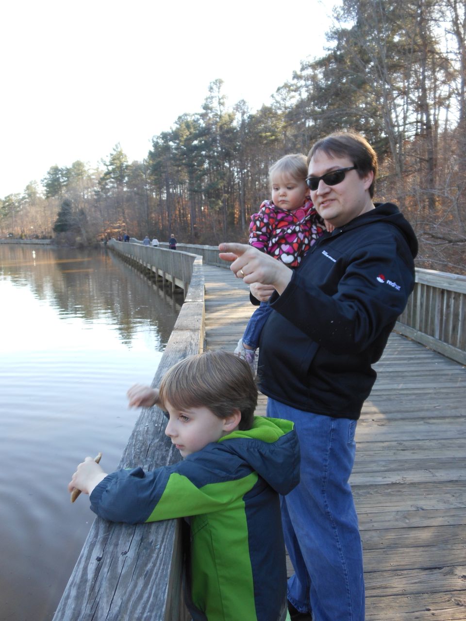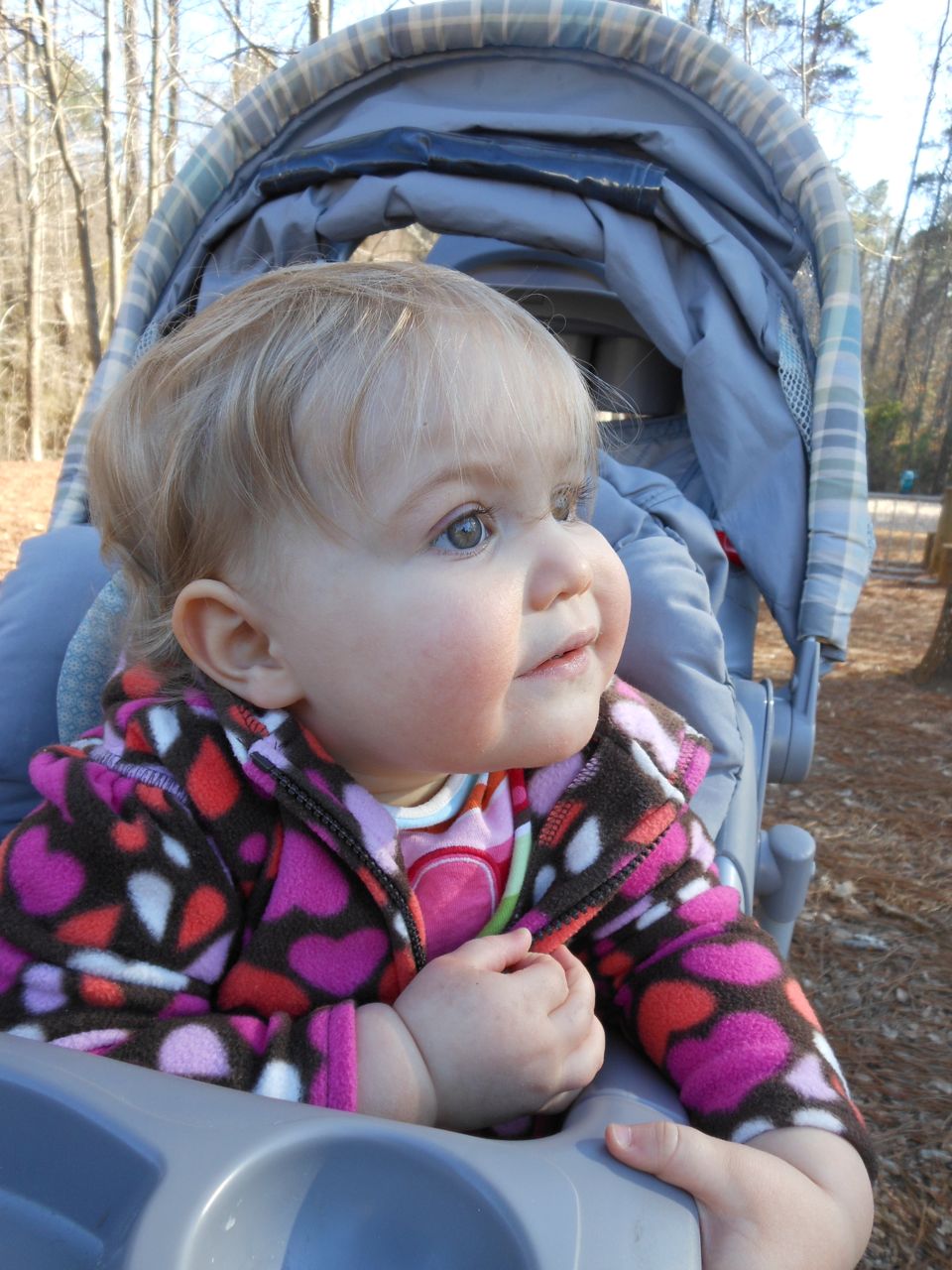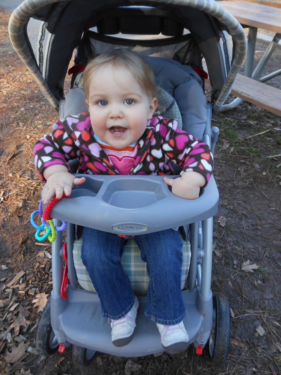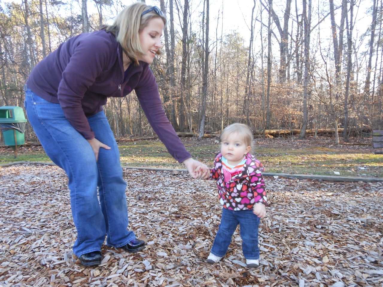 Both before and after our walking/biking/strolling/feeding tour, Brian wanted some playground time. He almost didn’t remember there was some playground equipment at this park, since we don’t always use it, but he was happy once we showed him! He learned about locking his bike up at the bike rack, and practiced locking and unlocking it with Daddy (who remembered the code! Whew!) Kendall enjoyed some swing time and became a huge fan of the slide. She showed off some newfound walking confidence, by taking a lot of steps by herself! Go, Kendall! And just in time for her upcoming 15-month checkup, too! (I’ve been trying not to flip out about her not walking, as long as she takes off before her checkup next week!) Brian wanted to try the adaptive swing, and Brandon tried coaching him on how to pump his legs to get more momentum going. He’s making some progress there. The sun was setting, but Brian managed to fit in some whirlwind games of “I’m in jail” and “welcome to my lemonade stand!” before we had to leave.