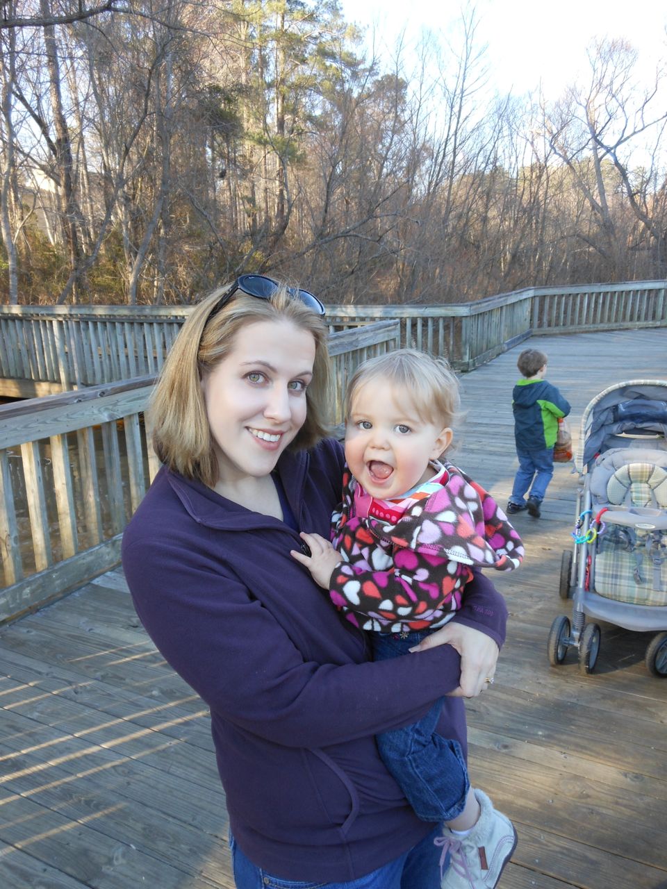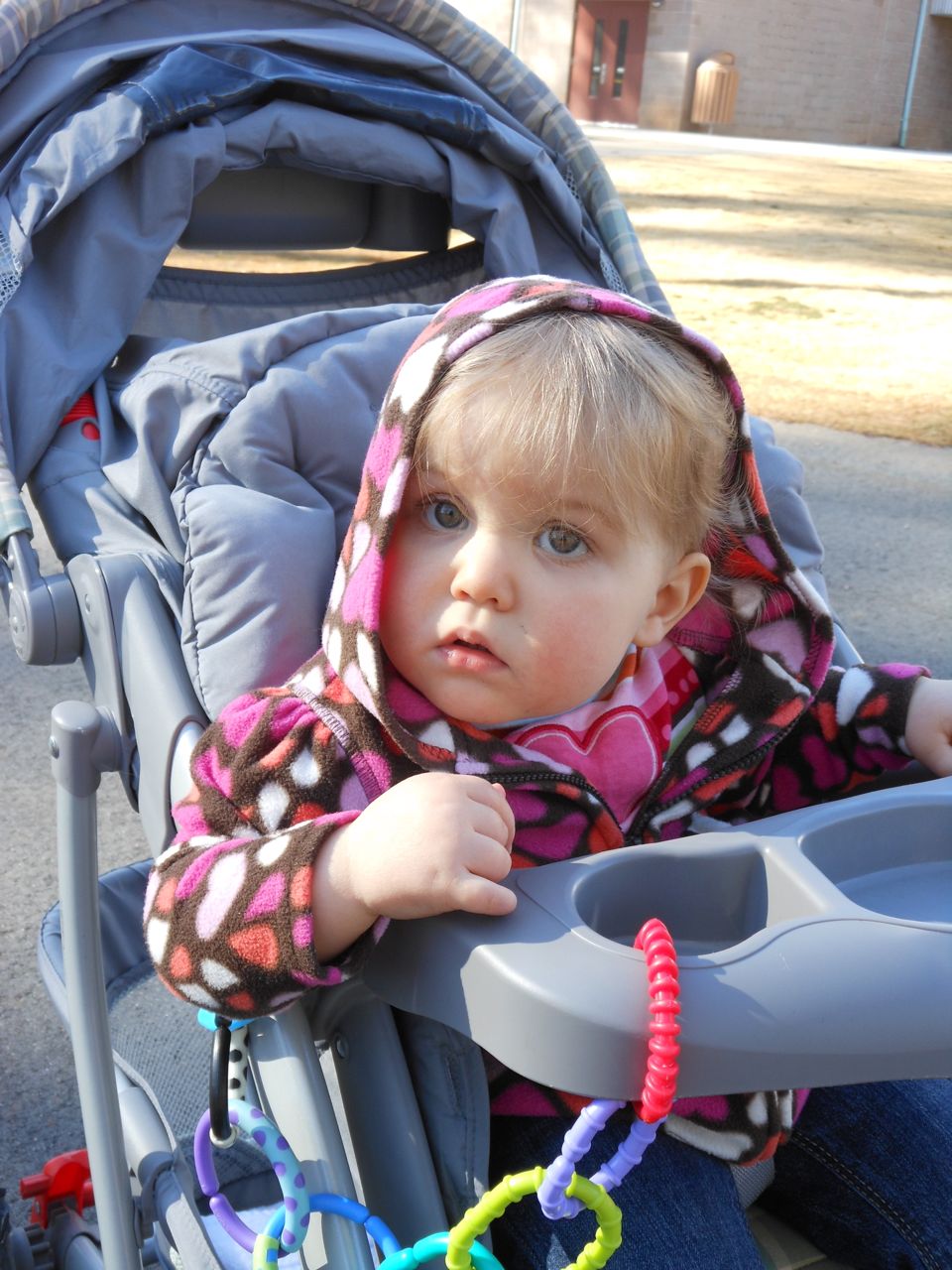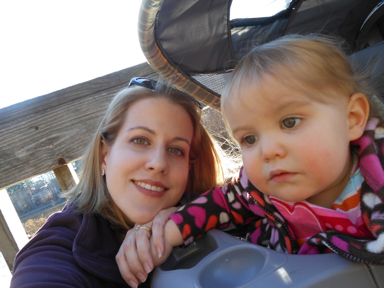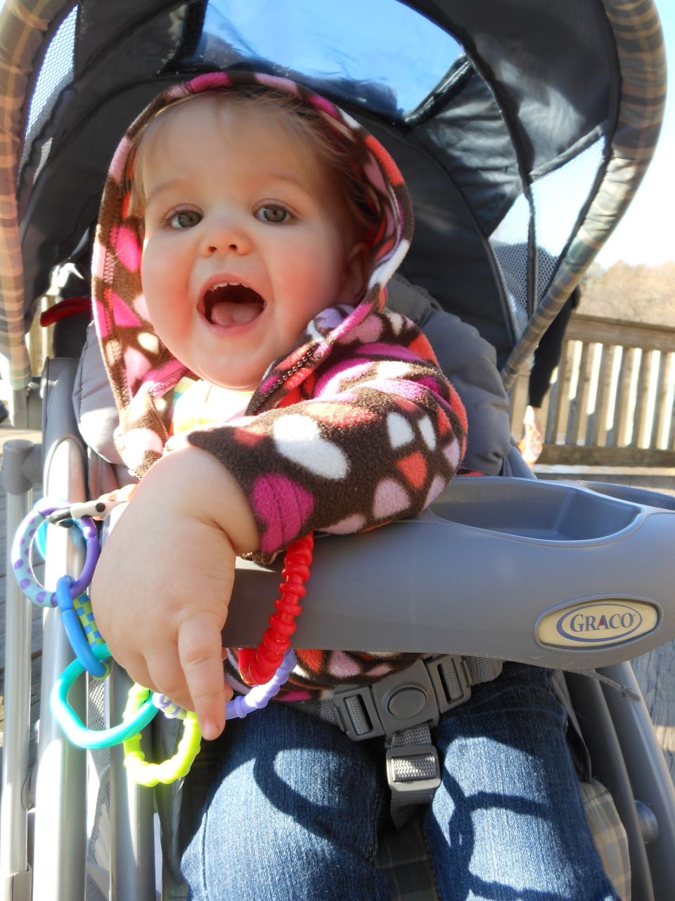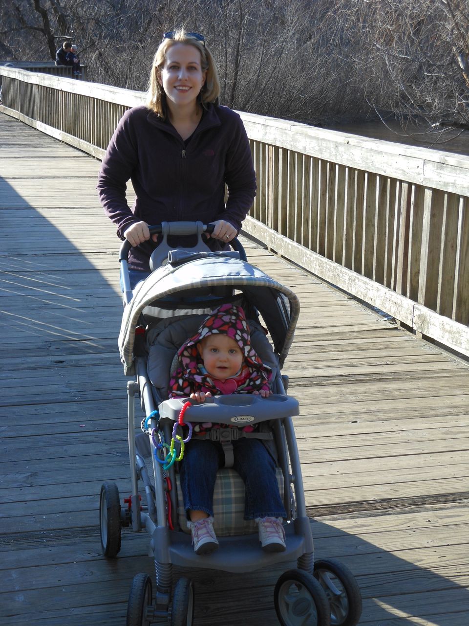 Both before and after our walking/biking/strolling/feeding tour, Brian wanted some playground time. He almost didn’t remember there was some playground equipment at this park, since we don’t always use it, but he was happy once we showed him! He learned about locking his bike up at the bike rack, and practiced locking and unlocking it with Daddy (who remembered the code! Whew!) Kendall enjoyed some swing time and became a huge fan of the slide. She showed off some newfound walking confidence, by taking a lot of steps by herself! Go, Kendall! And just in time for her upcoming 15-month checkup, too! (I’ve been trying not to flip out about her not walking, as long as she takes off before her checkup next week!) Brian wanted to try the adaptive swing, and Brandon tried coaching him on how to pump his legs to get more momentum going. He’s making some progress there. The sun was setting, but Brian managed to fit in some whirlwind games of “I’m in jail” and “welcome to my lemonade stand!” before we had to leave.
