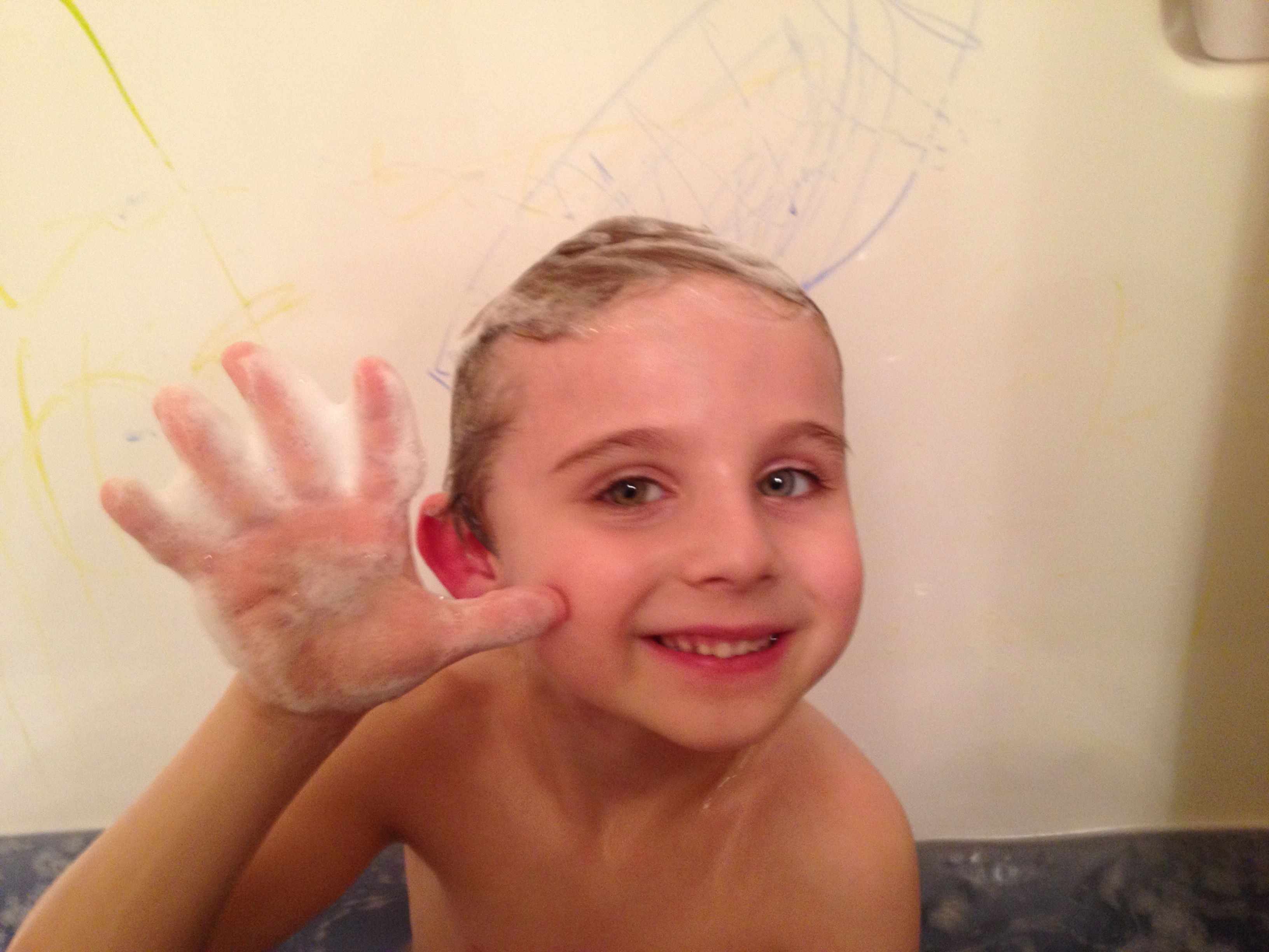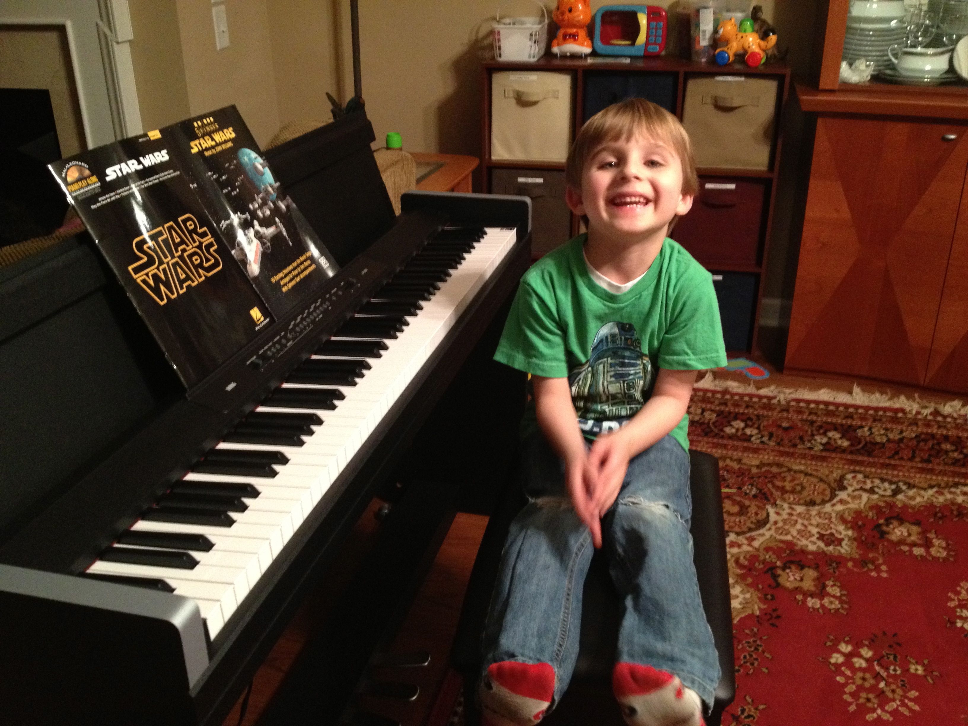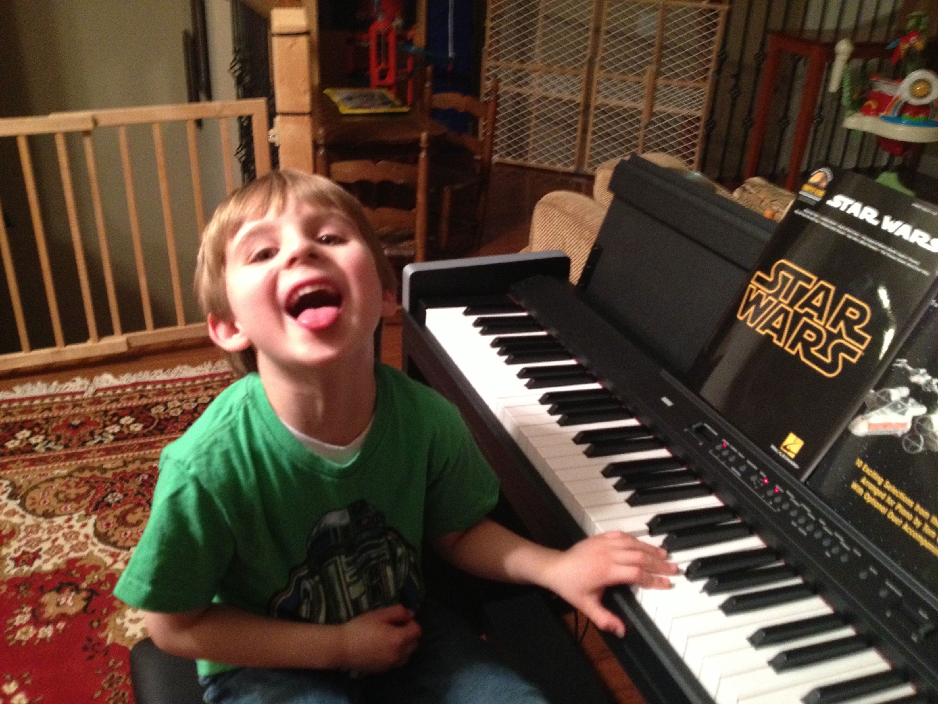 Brian is also loving the new piano, and I hope I can find him a piano teacher.. It’s proving difficult to find someone nearby that can work with our schedule, however. But for now, Brian just has fun with it, and sometimes I show him how I can play some of his favorite Star Wars tunes (I’ve picked up some fun sheet music for us!) It’s not super easy for me, since it’s been so long since I’ve played. But it’s probably good for Brian to see that it takes practice, because he can get discouraged easily when he can’t do something the first time. Wonder where he got that from. 😉 I guess all the excitement left Brian in a silly mood this evening, as he wanted to show off his bathtime mohawk again, and modeled his Lego Star Wars/Abbey Road t-shirt for us with some tough-guy poses.