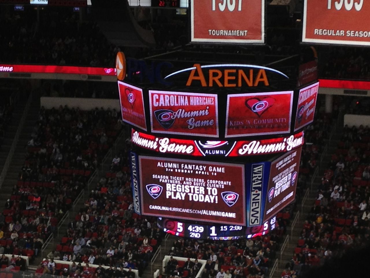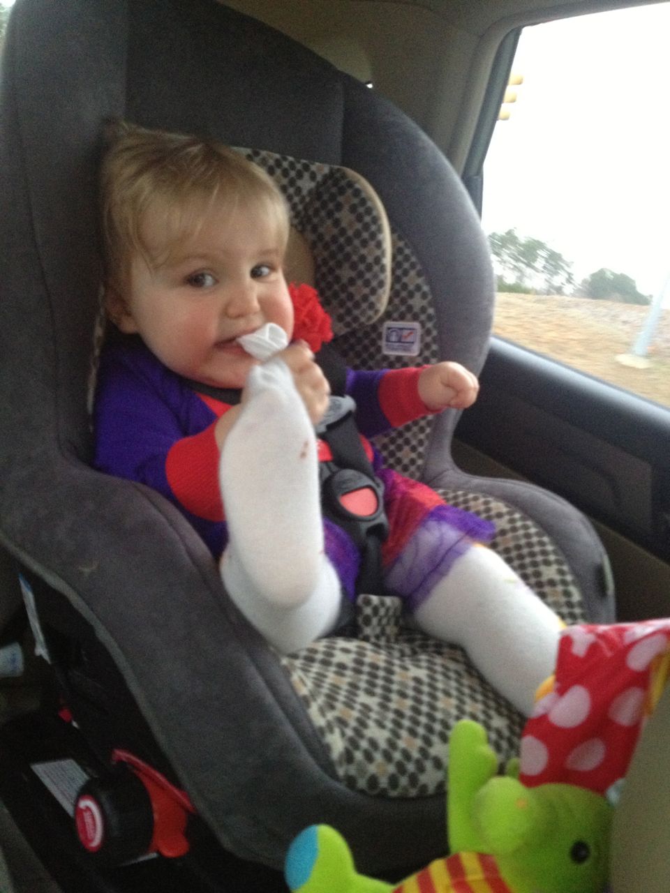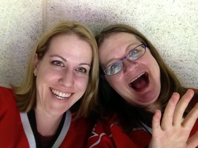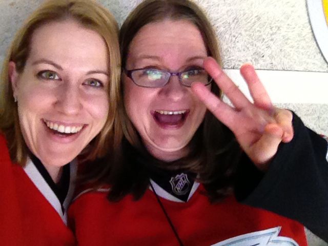 Later, we all went to a birthday party for one of Brian’s classmates.  I put Kendall in a cute dress and tights (which she hated!  She even tried to remove them with her teeth!  They weren’t as easy to remove as socks.)  I was hoping to have a lot of great photo ops of the two of them at the party, but, it was not to be.  Brian had further meltdowns the whole time we stayed at the party (which wasn’t very long, I don’t suppose, but it certainly felt like it.)  When we got home, I suggested Brian take a nap, and he did..  However, when he woke up, he had a high fever.  After a visit to the Urgent Care, we discovered Brian has strep throat.  Poor kiddo, no wonder he had such a rough day.  Since he wasn’t up to attending the hockey game, we asked our friend Jennie if she was free, and I ended up with a rare girls’ night out!  Brandon volunteered to take care of the kids so I could go.  He’s just the best, isn’t he?  🙂  I had a good time with Jennie, and the ‘Canes really delivered, scoring five goals to win the game!