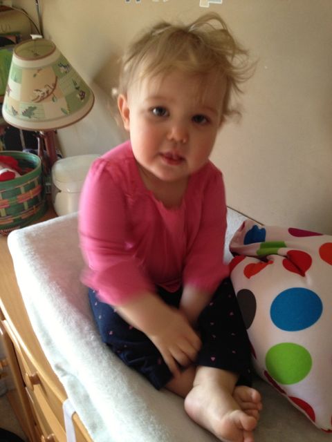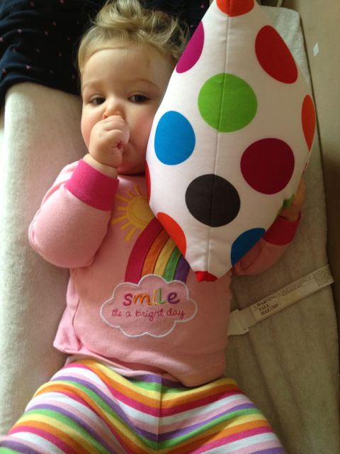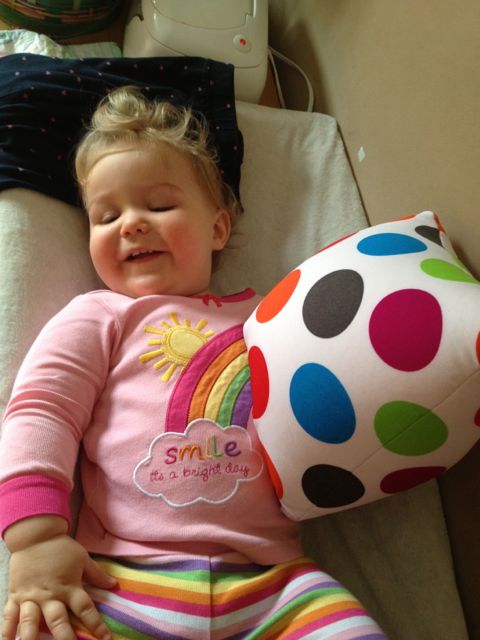 Sometimes I can get her to put a morsel in my hand, but, she really prefers to to shove it right in my mouth. 😀 When she woke up this morning, Kendall didn’t want to let go of her pillow. Brian picked out this polka-dot pillow for her one day when shopping with Grandma Sue–so we have them both to thank for it! She really does love it.