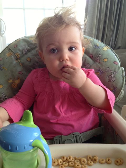 Kendall has hit that phase where she wants to share her food with us. It’s so cute, she even says “Aaaaahh!” when handing us a bite, telling us to open up. She’s pretty insistent, too–when she wants to share Cheerios with you, you really have to eat some! (Or get creative, when it’s something that’s already been chewed on..ew!)