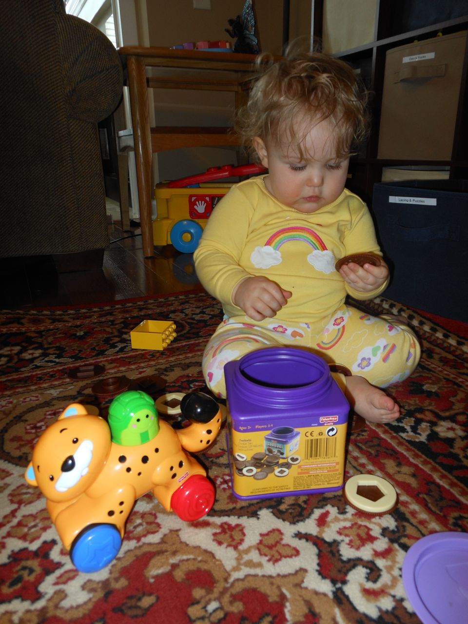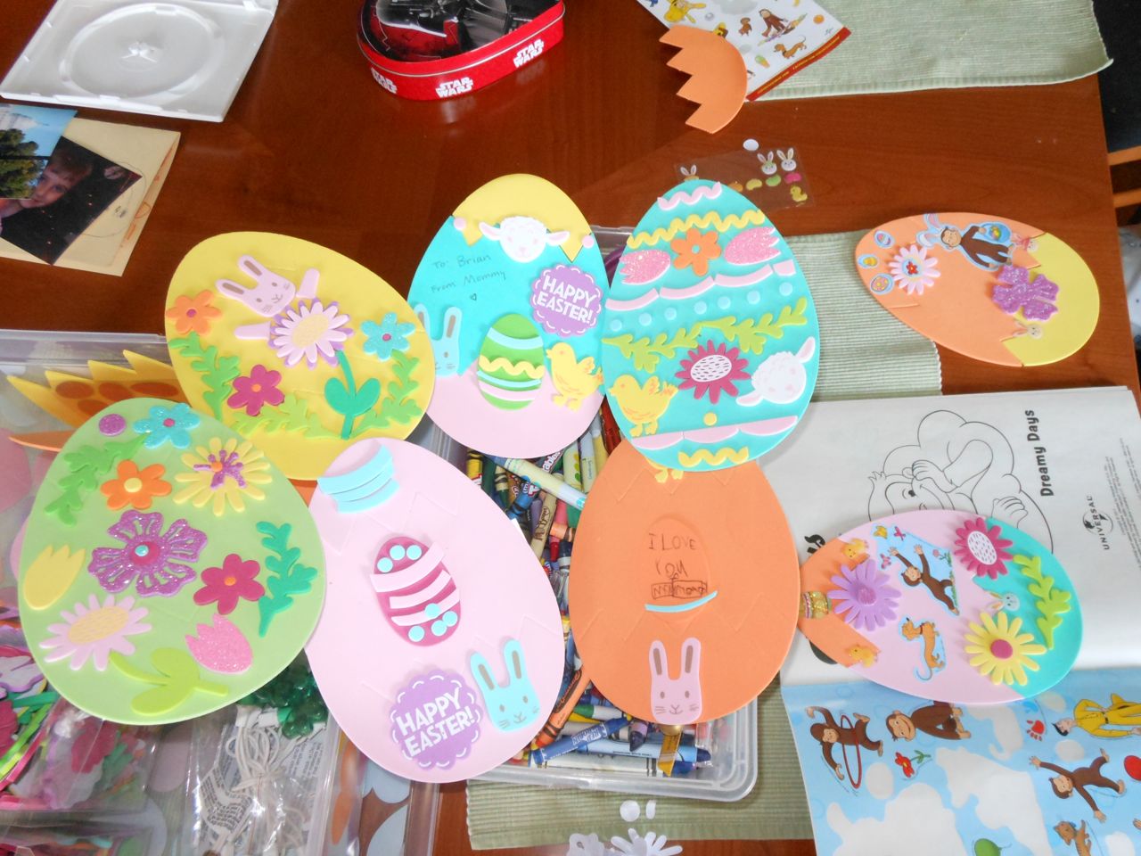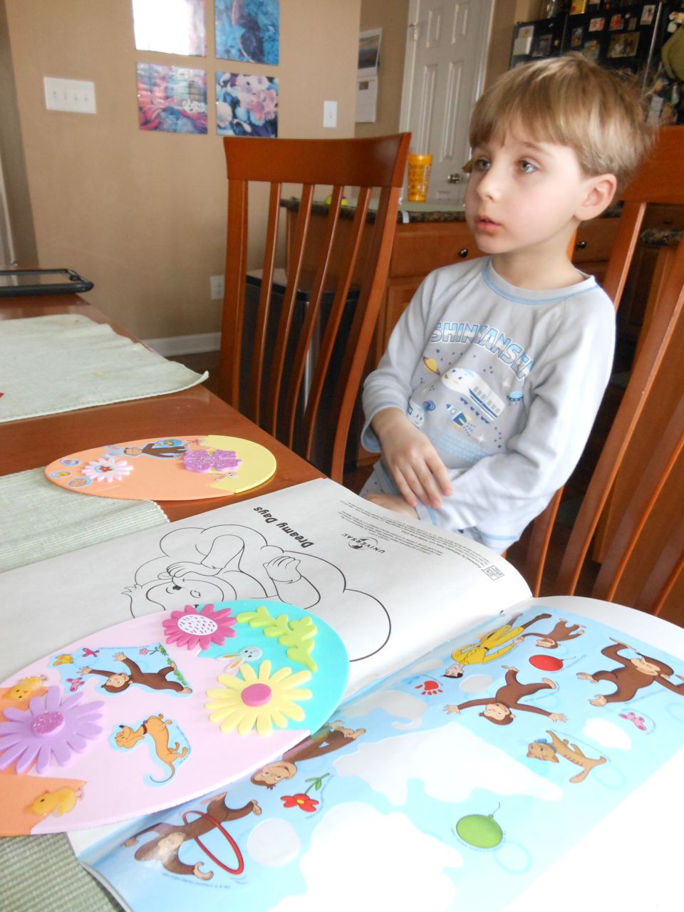 Today we had a leisurely wakeup and breakfast, with some playtime in our pajamas. Brian worked on some more Easter Egg decorations and his springtime Curious George coloring book, after watching his new “Curious George Swings into Spring!” DVD. We’re really getting into the springtime spirit!