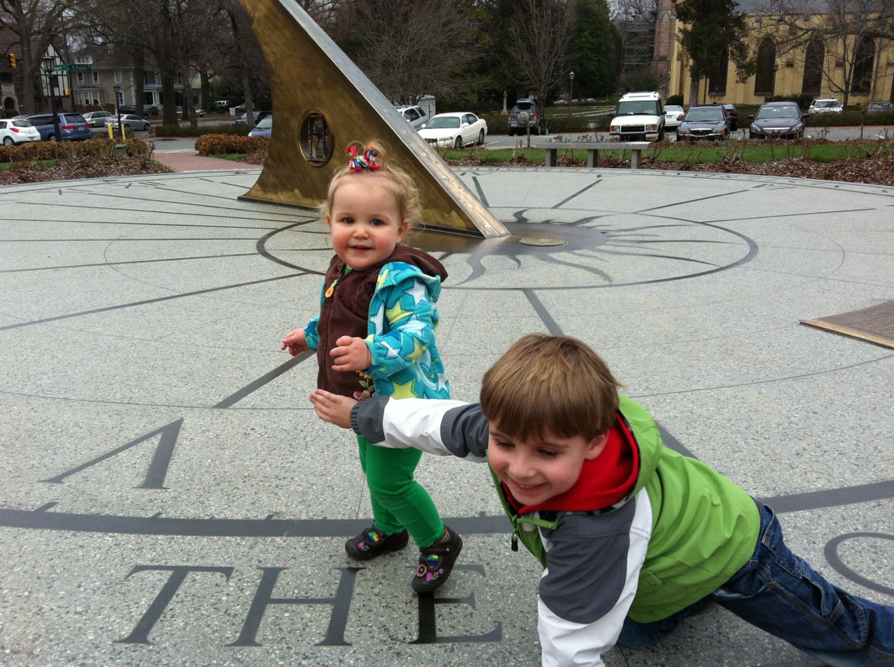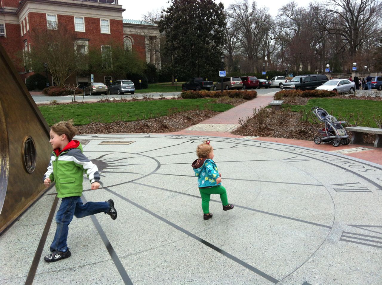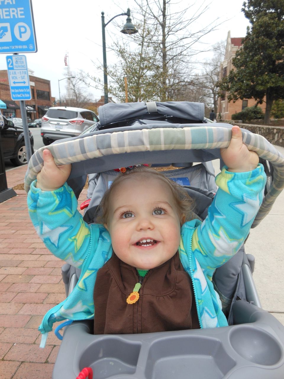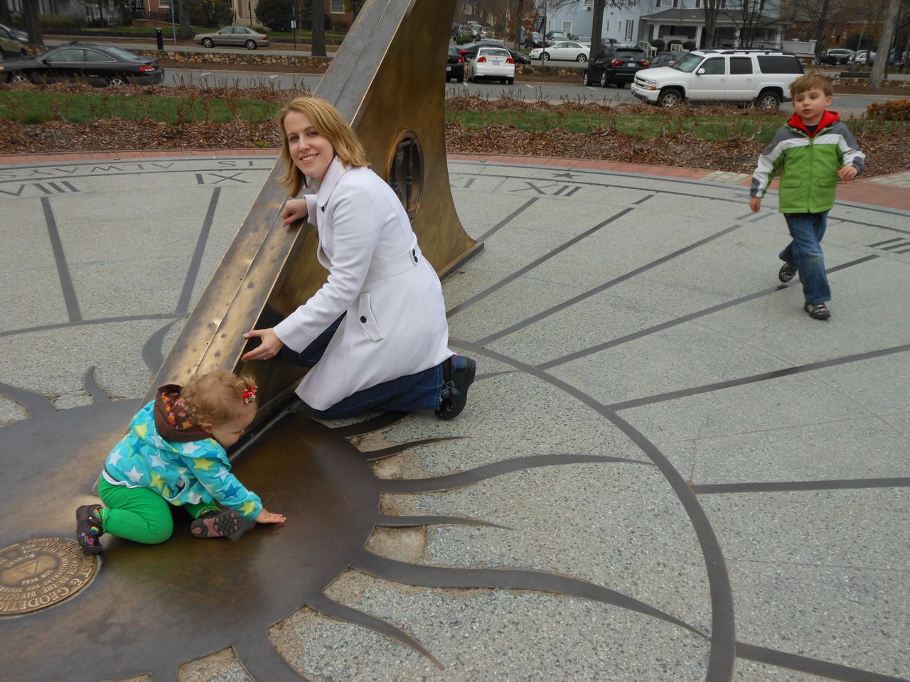 Kendall was a little stir crazy, so once the show started packing up, we headed outside and let the kids play on the sundial outside. The rose bushes aren’t blooming yet, but they’ll be fabulous in another couple months! We planned on getting dinner at Franklin St. Pizza and Pasta, but, to our horror, it was gone! Replaced by something advertising “Gangnam Style Chicken”. Normally we’d be all about investigating potential Korean food, but, not today.. This was almost too much for me and Brandon to handle, as another favorite, Pepper’s Pizza, had closed down recently as well. The kids didn’t know what a blow we were suffering, of course, and they were happy to stroll around Franklin St.
