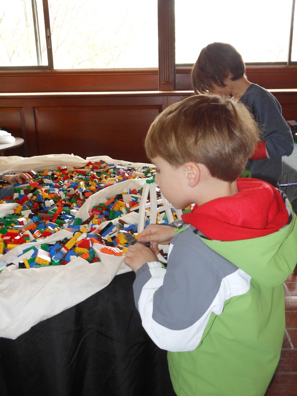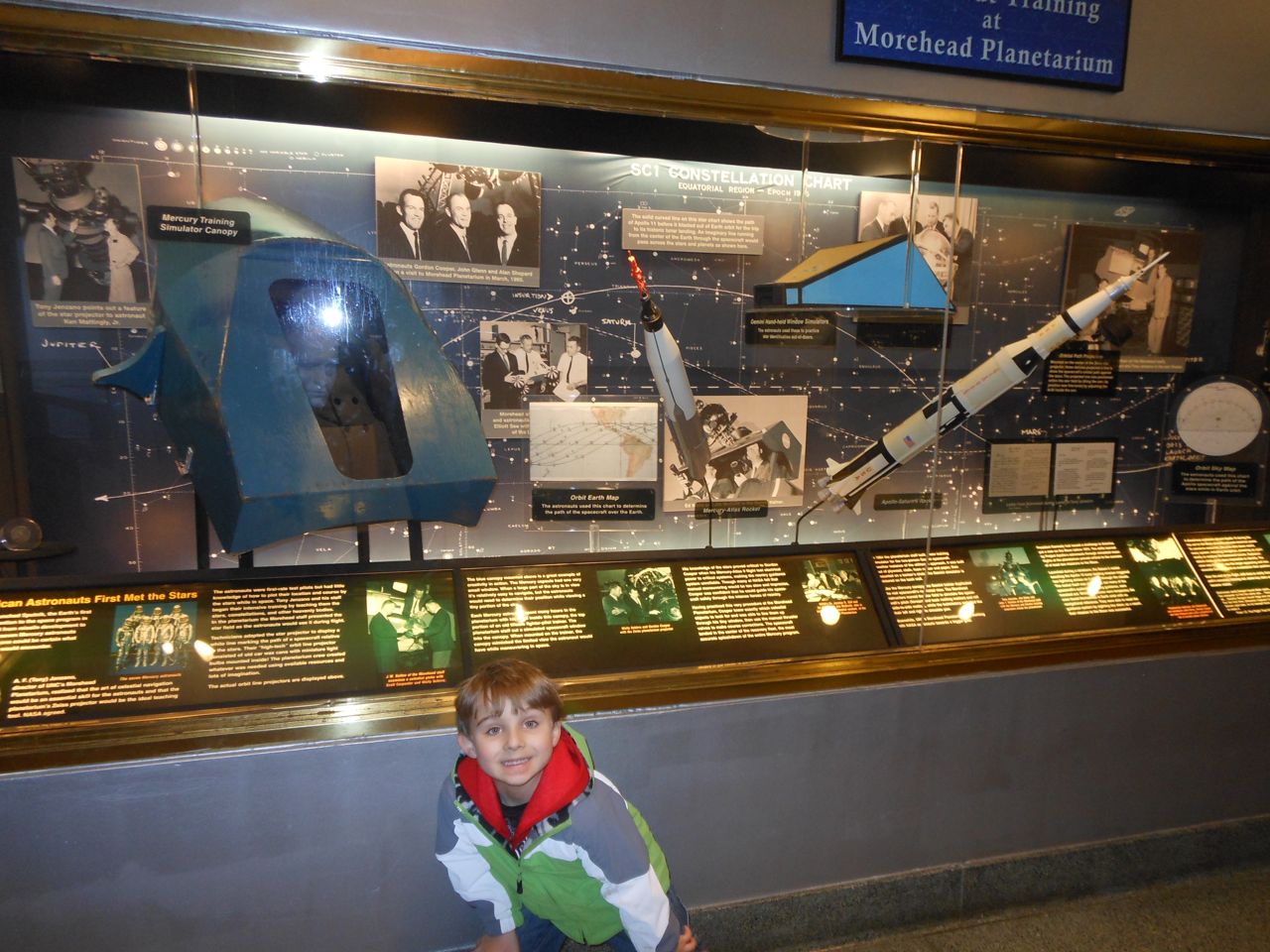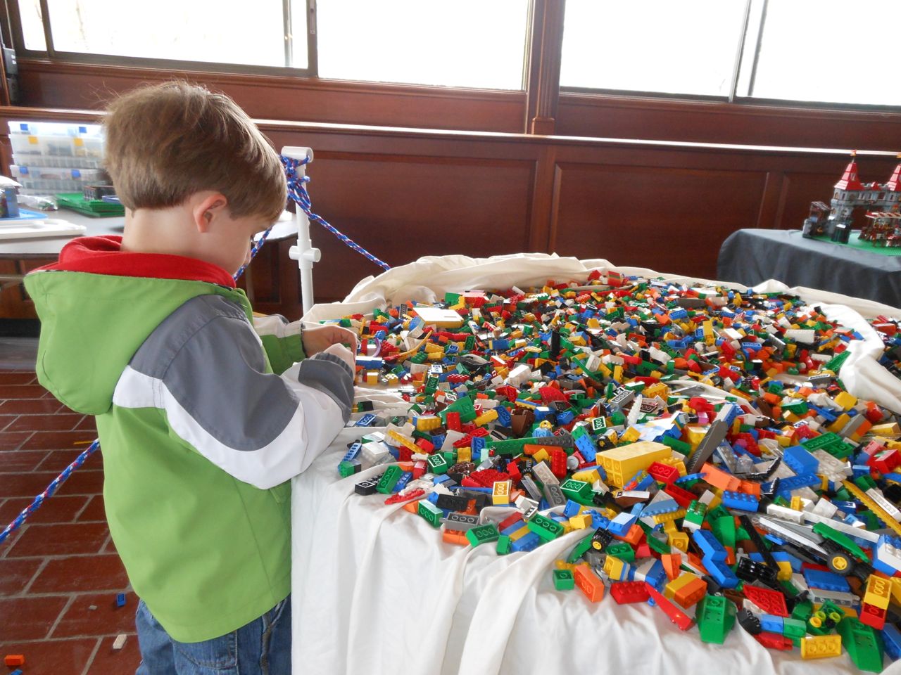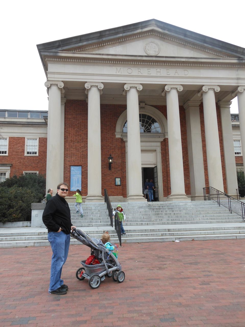 Eventually we got our act together and headed to Chapel Hill for a small Lego fair that was going on at the Morehead Planetarium. We took a whirlwind tour through some of the planetarium (and I made Brian watch the “Powers of Ten” video, one of my favorites!) and eventually found the Lego display, all the way up on the fourth floor. Brian had a great time, looking at the huge Lego displays, and of course, playing with the Legos they had out for the kids. Brandon and I liked seeing some of the cool artistic creations and feats of Lego engineering, as well as a historical display of Lego Modulex, a discontinued series that was aimed at architects for their 3-D models. Brian really liked a display that had light-up bricks and moving parts, including a Lego Star Wars Museum that opened up, displaying a ton of Star Wars Minifigures inside!