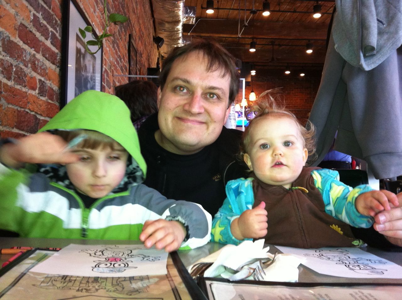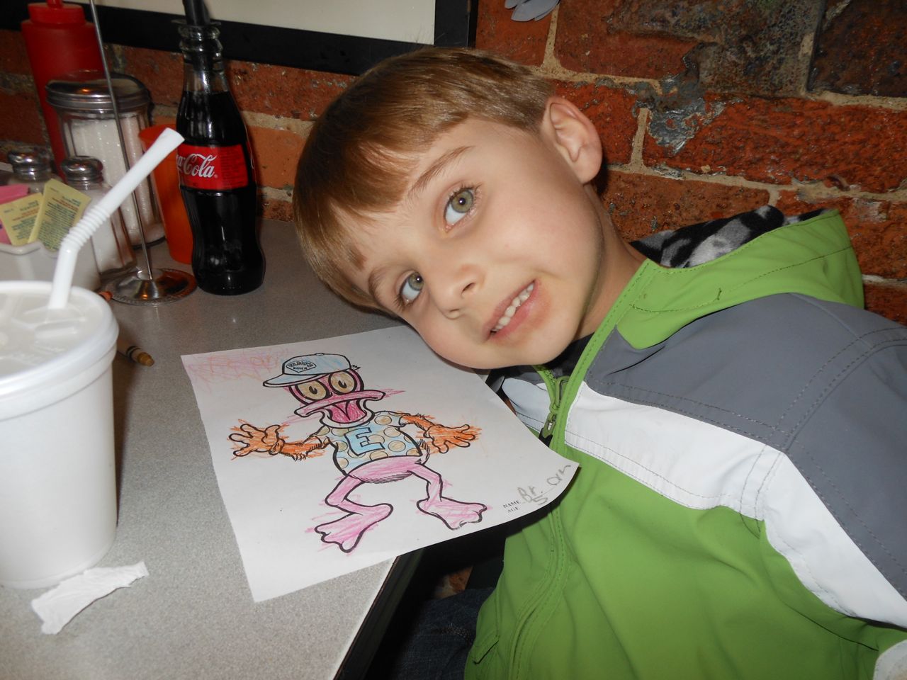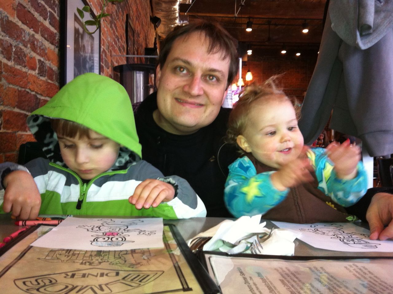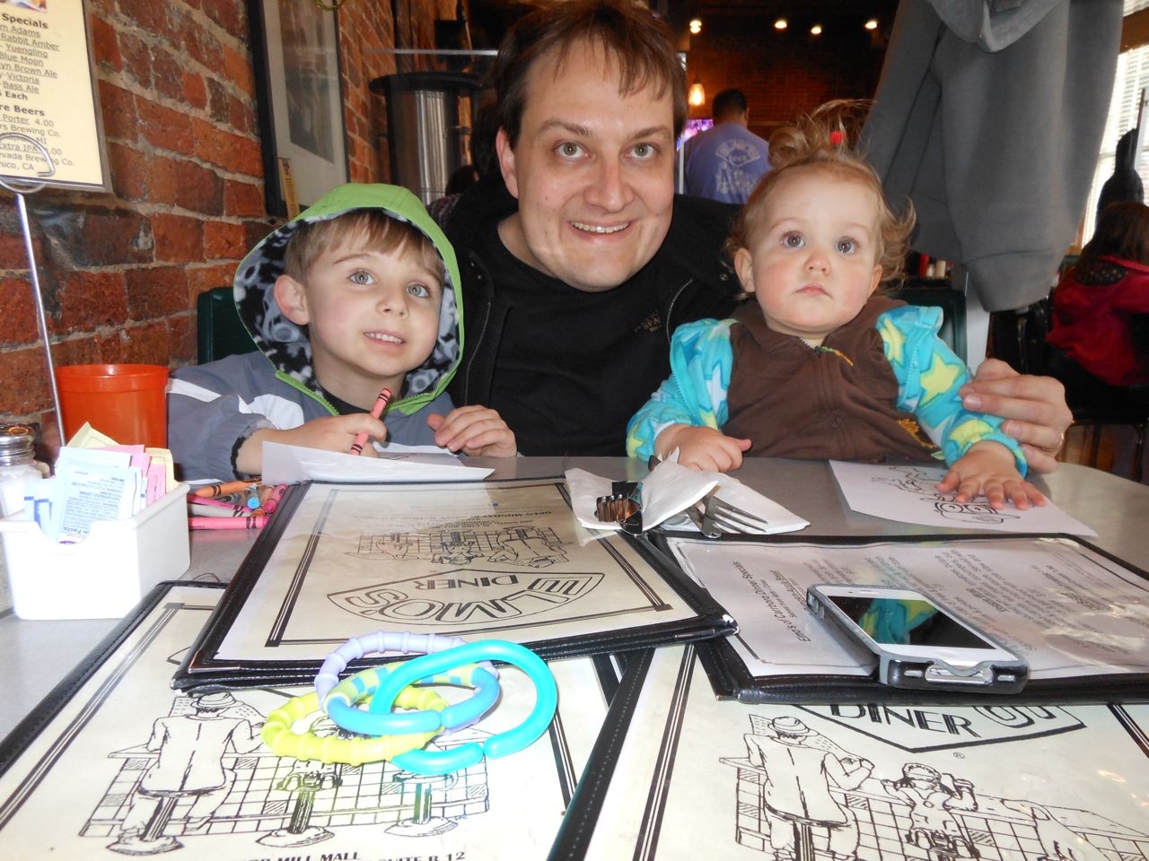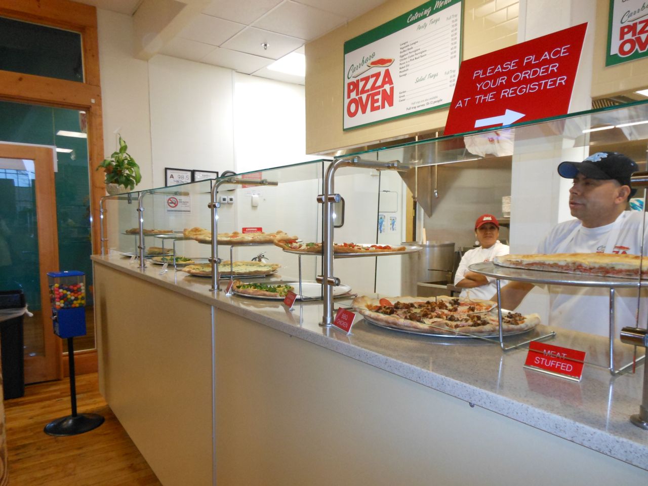 We decided to head to Elmo’s Diner in Carrboro instead. We had a great dinner there, and the kids were about as well-behaved as could be expected. Brian colored the usual Elmo’s Duck and was proud of his creation. And, wouldn’t you know, on the way out, we noticed a new pizza shop had opened in Carr Mill Mall. As we were walking by, I noticed that some of the signs and equipment seemed familiar, like what we remembered from Franklin St. Pizza and Pasta. Doubling back and looking closer, they were exactly the same! We were overjoyed to see that our pizza place wasn’t gone for good, but had changed its name and moved to Carrboro! Of course we were really full from our dinner at Elmo’s at this point, but we weren’t going to be deterred, especially after this pizza miracle! We got one of every kind of specialty slice packed to go, and took it home! We’ll be having special pizza dinner for the next two nights, woohoo! 🙂