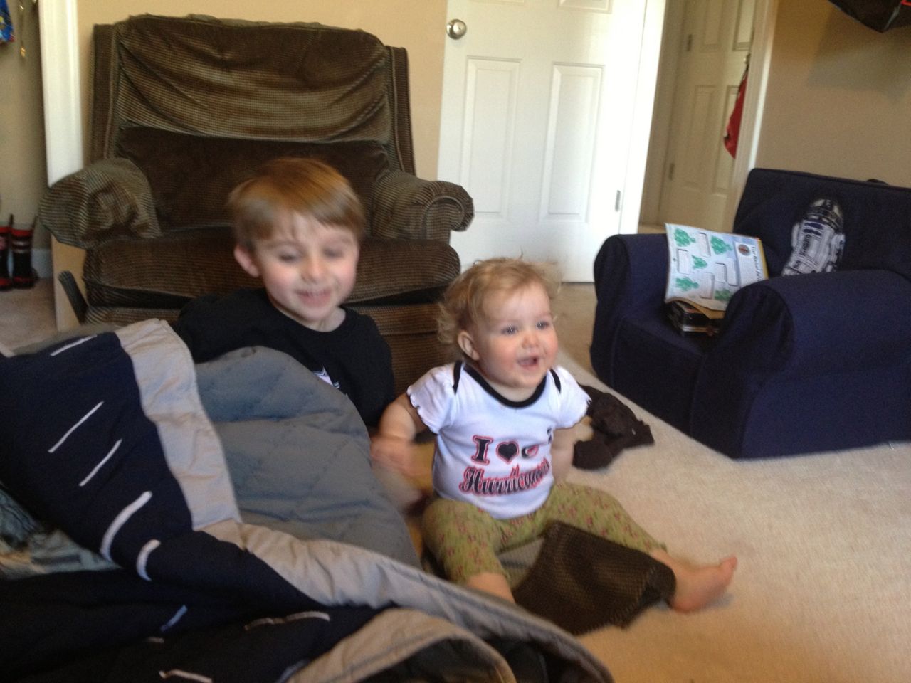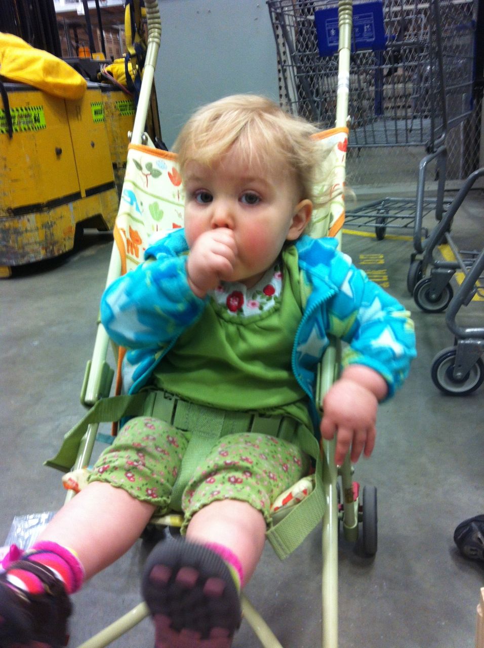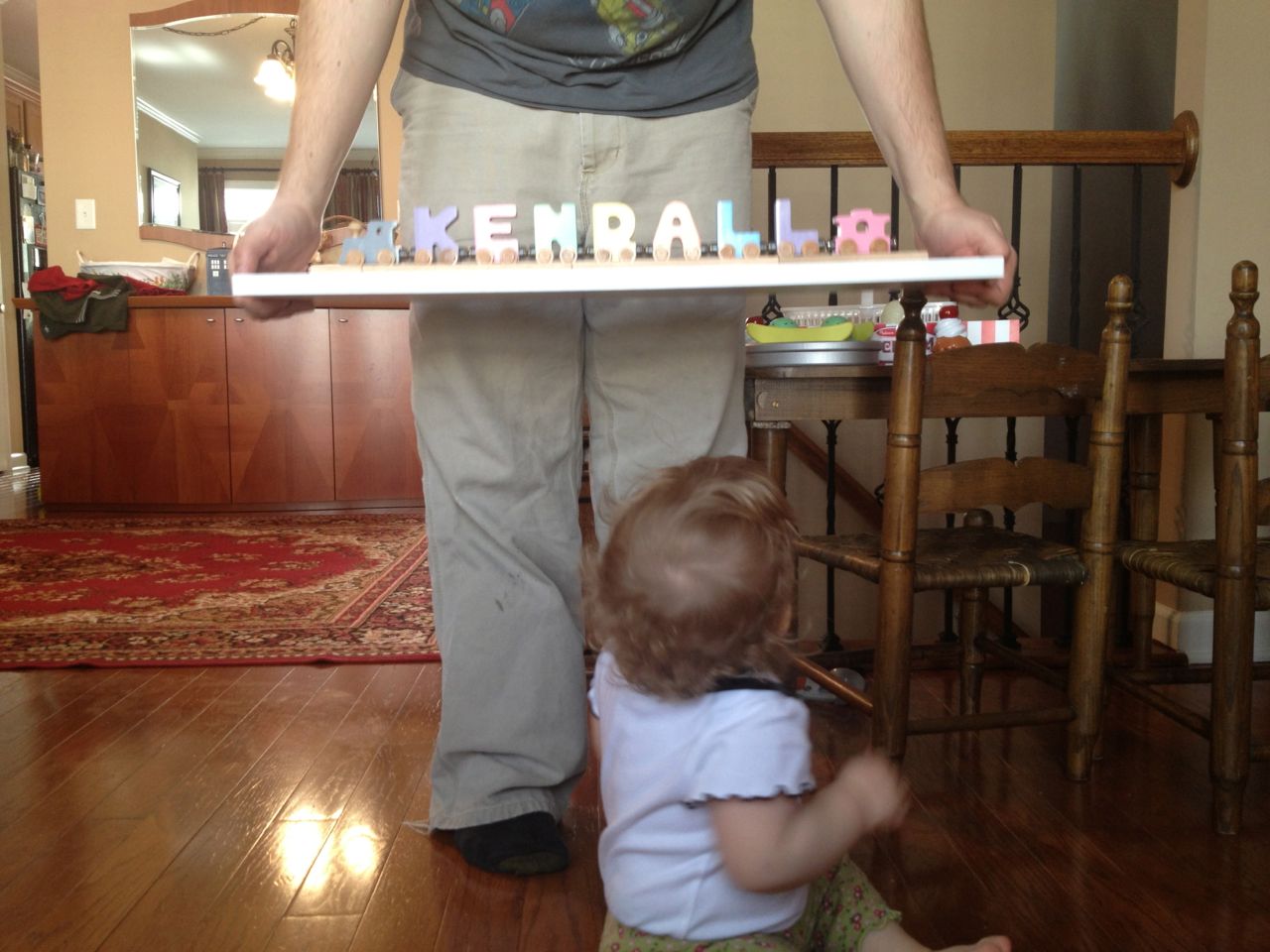 Today’s Lowe’s Build and Grow project was a grabber toy from the movie The Croods.  Kendall watched from her stroller–I bet she wishes she could make her own projects!  Brian gave her a wild ride in the store (when he wasn’t trying out the lawn mowers), and Brandon picked up supplies to make a shelf for Kendall’s name train to put in her room.  The kids played peek-a-boo with Brian’s quilt while Brandon mounted the shelf.  I think Kendall was very pleased with the results!