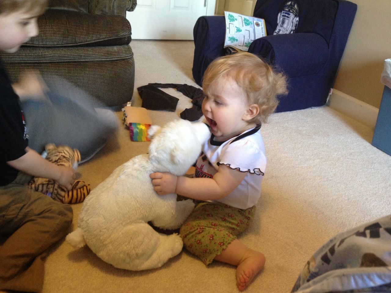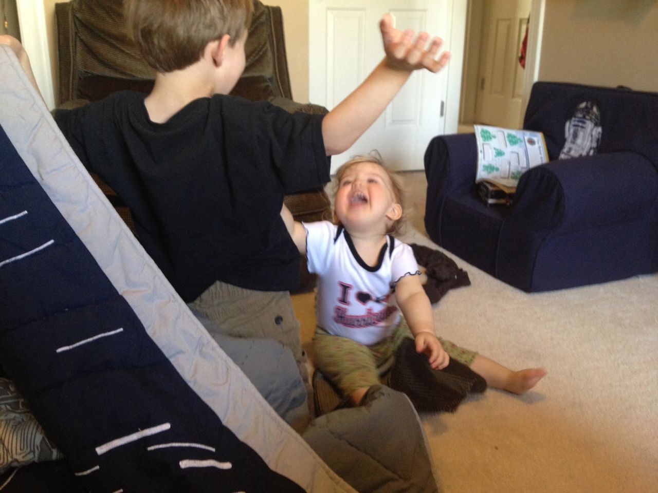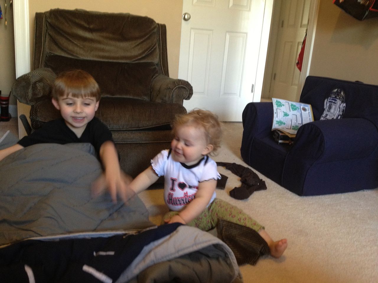 Today’s Lowe’s Build and Grow project was a grabber toy from the movie The Croods.  Kendall watched from her stroller–I bet she wishes she could make her own projects!  Brian gave her a wild ride in the store (when he wasn’t trying out the lawn mowers), and Brandon picked up supplies to make a shelf for Kendall’s name train to put in her room.  The kids played peek-a-boo with Brian’s quilt while Brandon mounted the shelf.  I think Kendall was very pleased with the results!