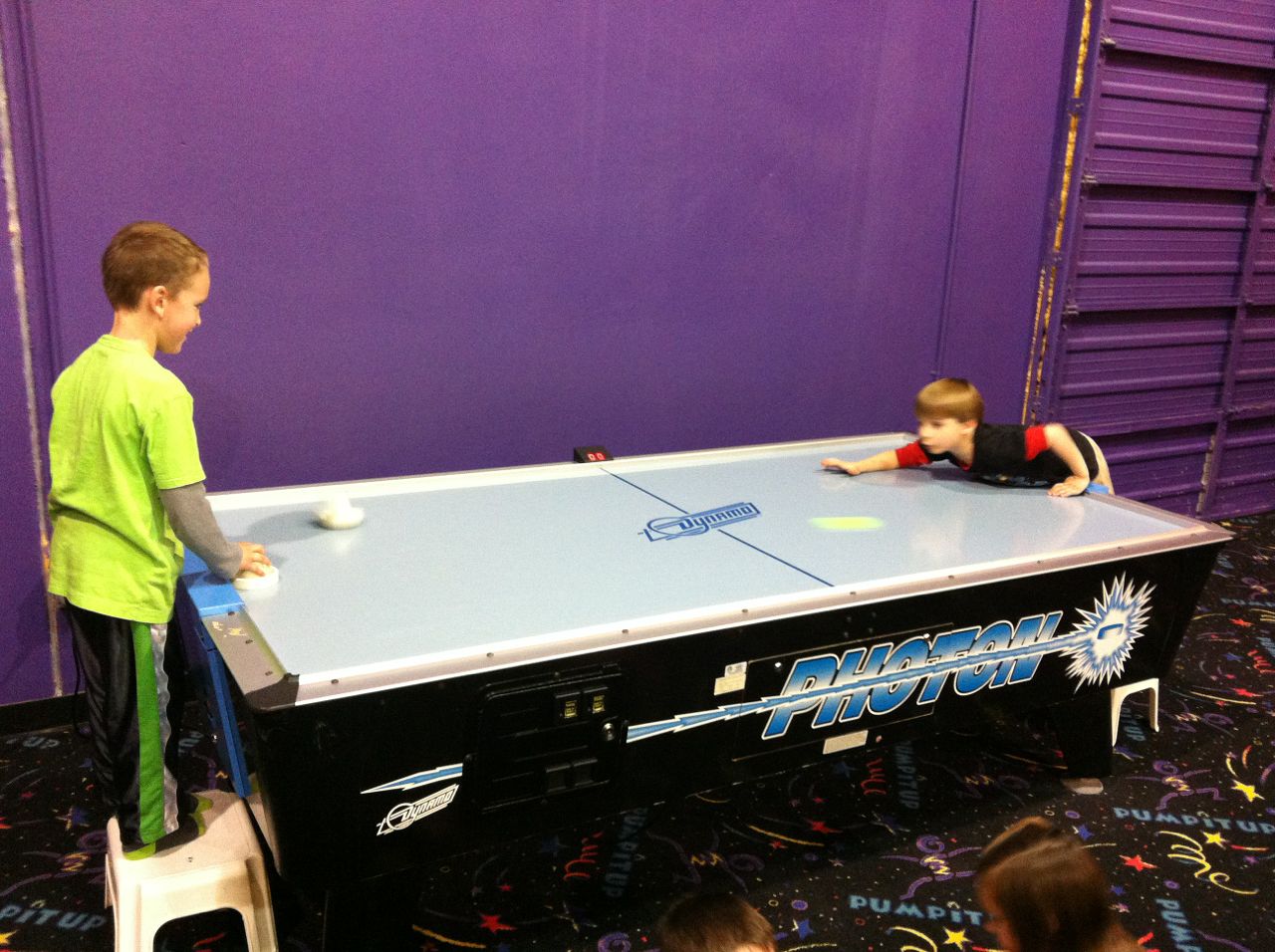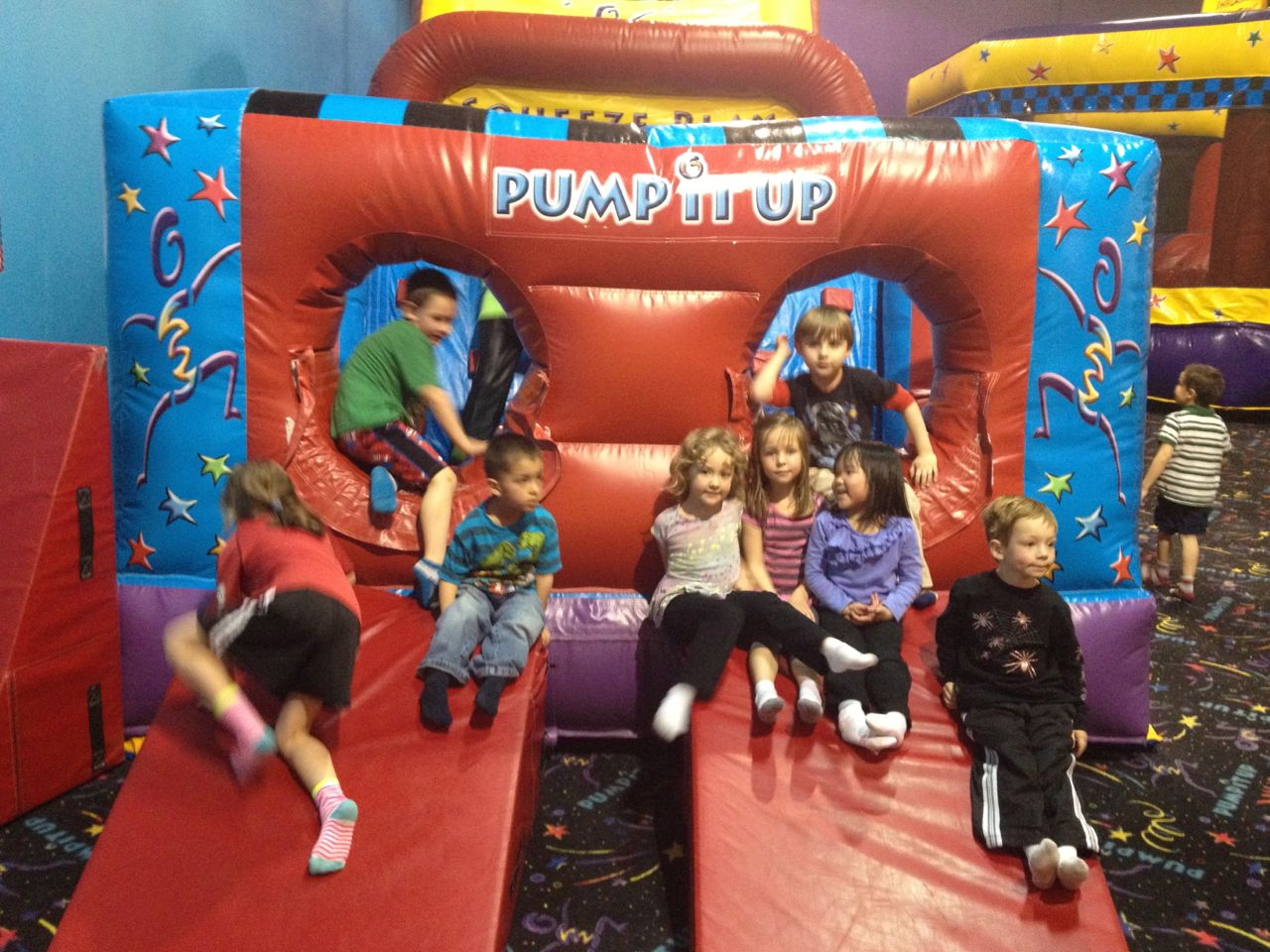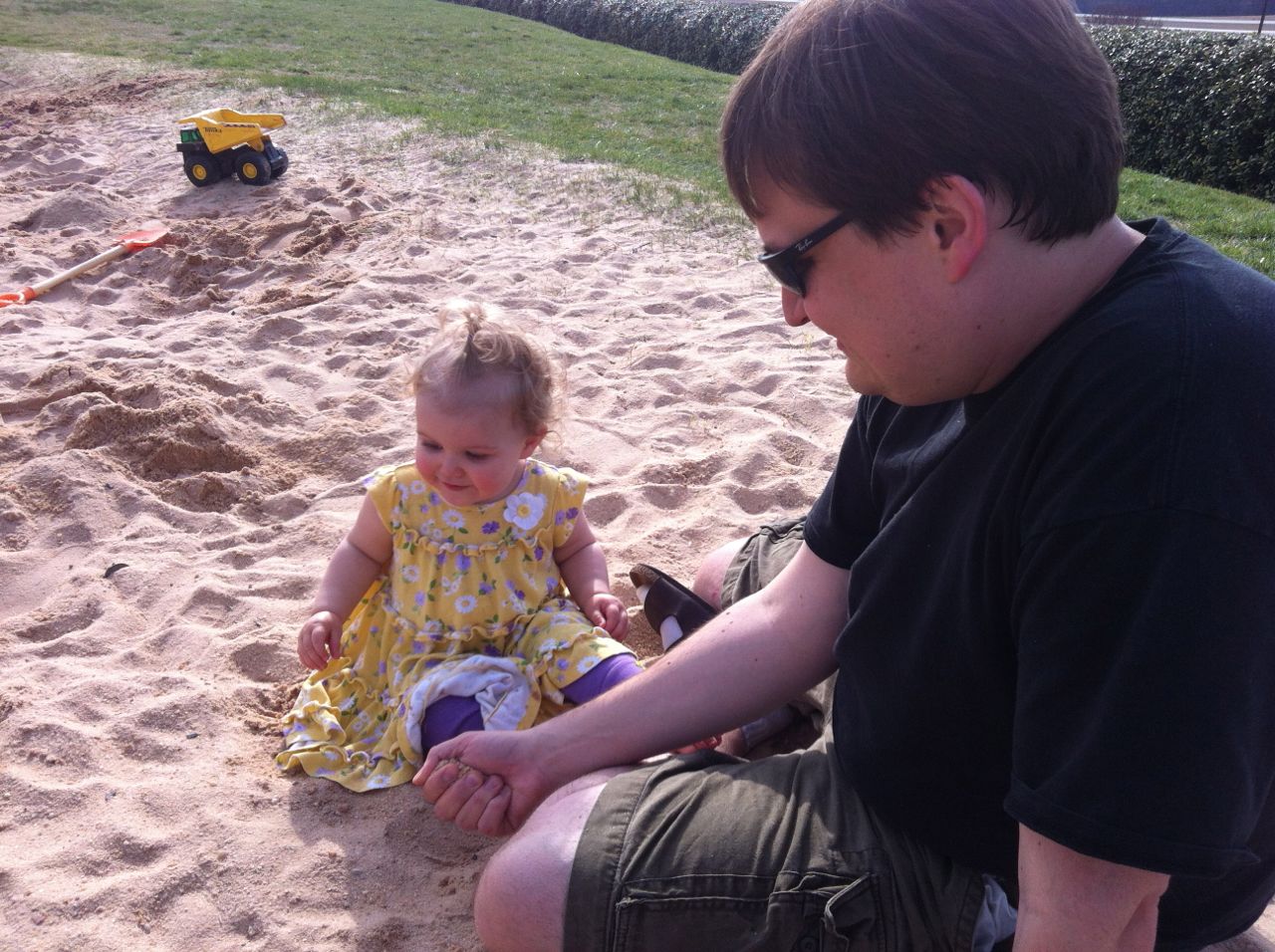 Today we had a birthday party for Brian’s friend Morgan at Pump It Up. We brought the whole family, since thought it would be reasonably safe for Kendall, even if she didn’t get in the inflatables.. Well, we underestimated how safe the place would be from her! She tore around the place even more than some of the big kids, and it was a major challenge keeping up with her! It wasn’t that long ago that we were just wishing she would walk! 🙂 We found some foam wedges she could slide down, and that was a huge hit–we practically had to pry her off of them. Brian enjoyed bouncing, of course, and his perennial favorite party game, air hockey. He was a good sport and let the other kids take turns, but he challenged everyone to a match and would take all comers! All the kids loved getting applesauce as soon as they got into the party room (good call, Morgan’s Mom!) since they could immediately have a snack and not have to wait for cake. Afterward, the kids still had some energy, and Brandon wanted to visit the airport park, so we enjoyed one of the few nicer days of this very cold spring by playing in the big sandbox. We made a heart with a B and a K in it for the kids, and Brian was so taken with it, he decided to make his own with an M and D inside (for Mommy and Daddy). 🙂