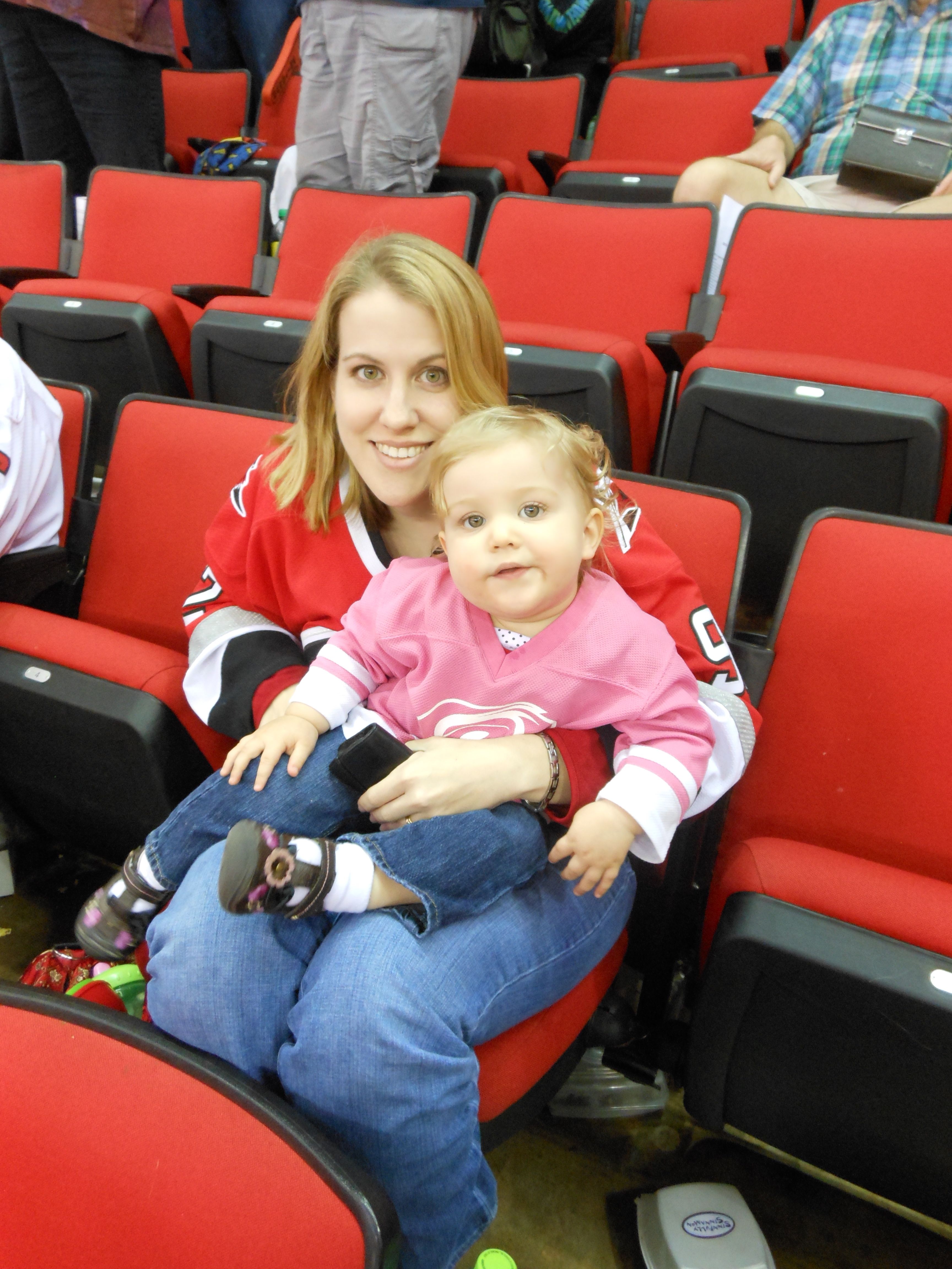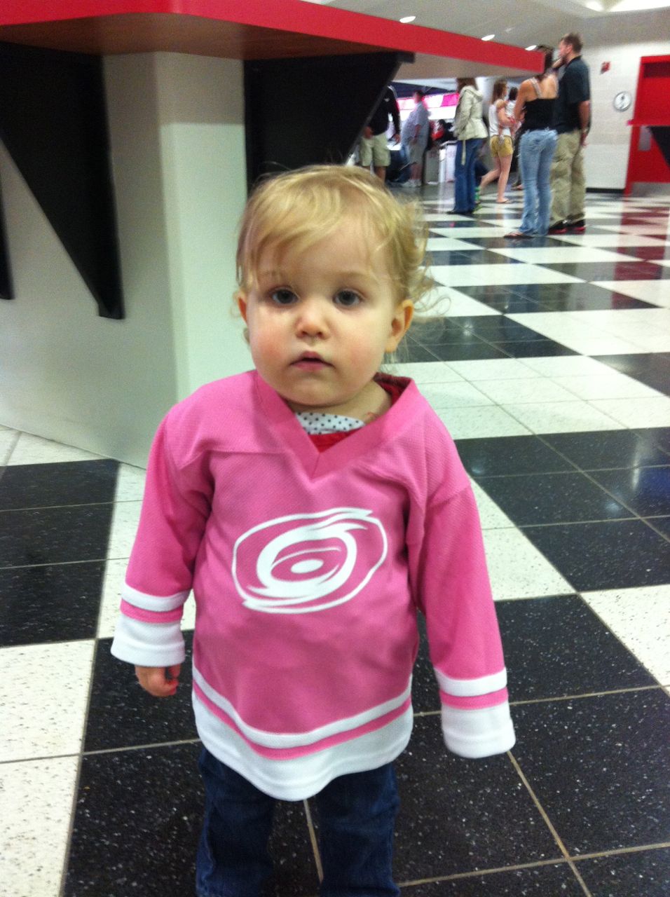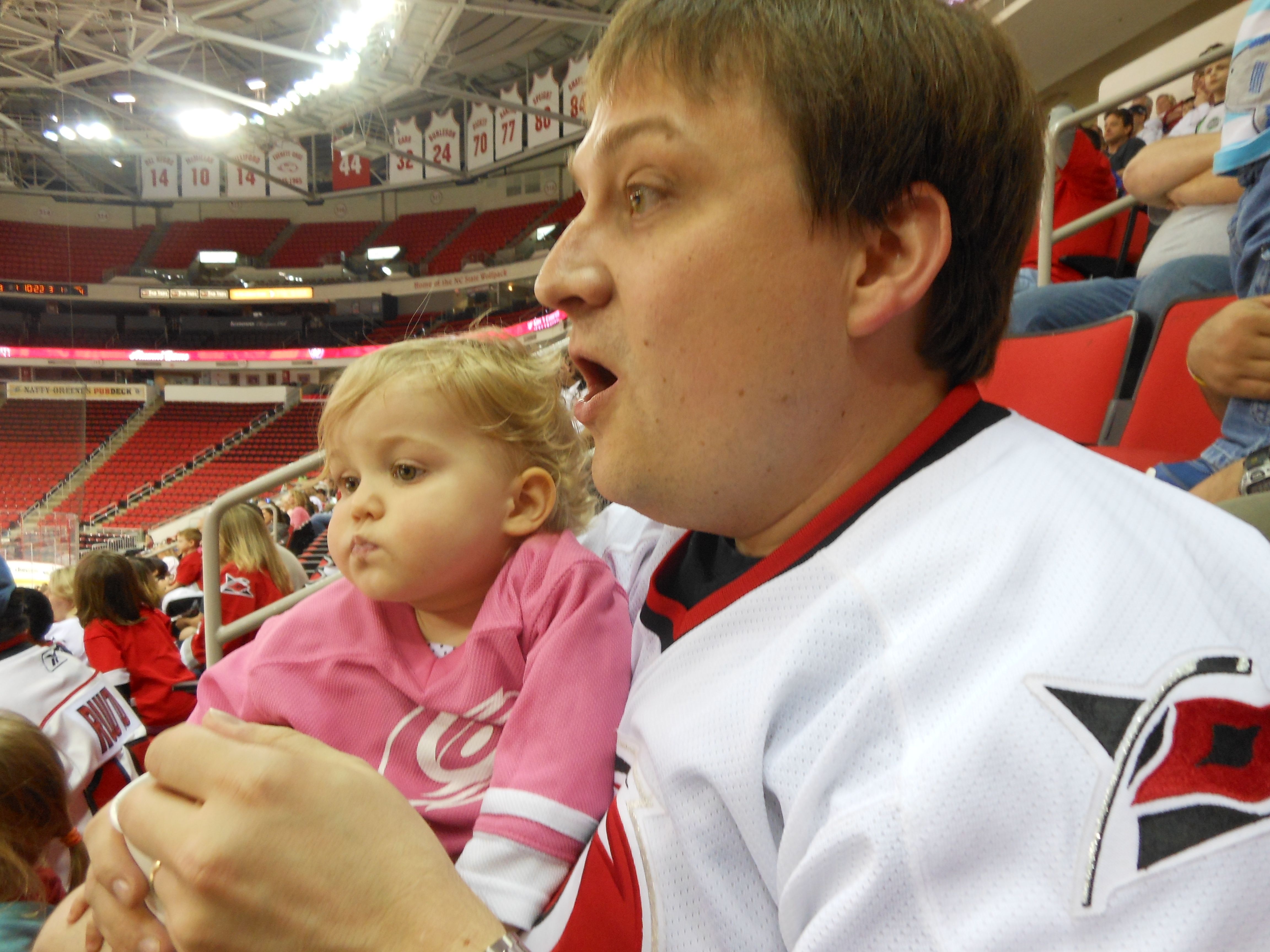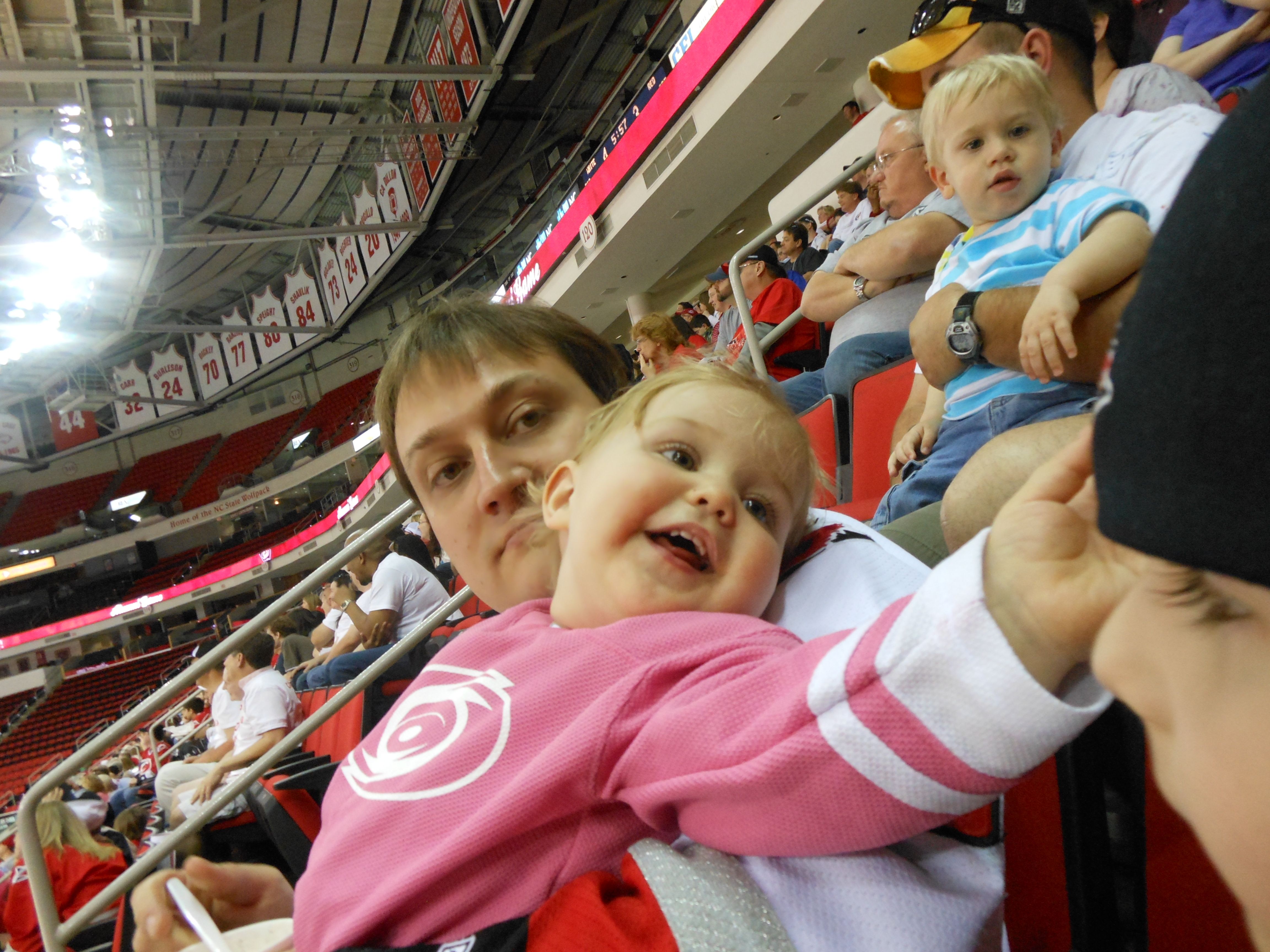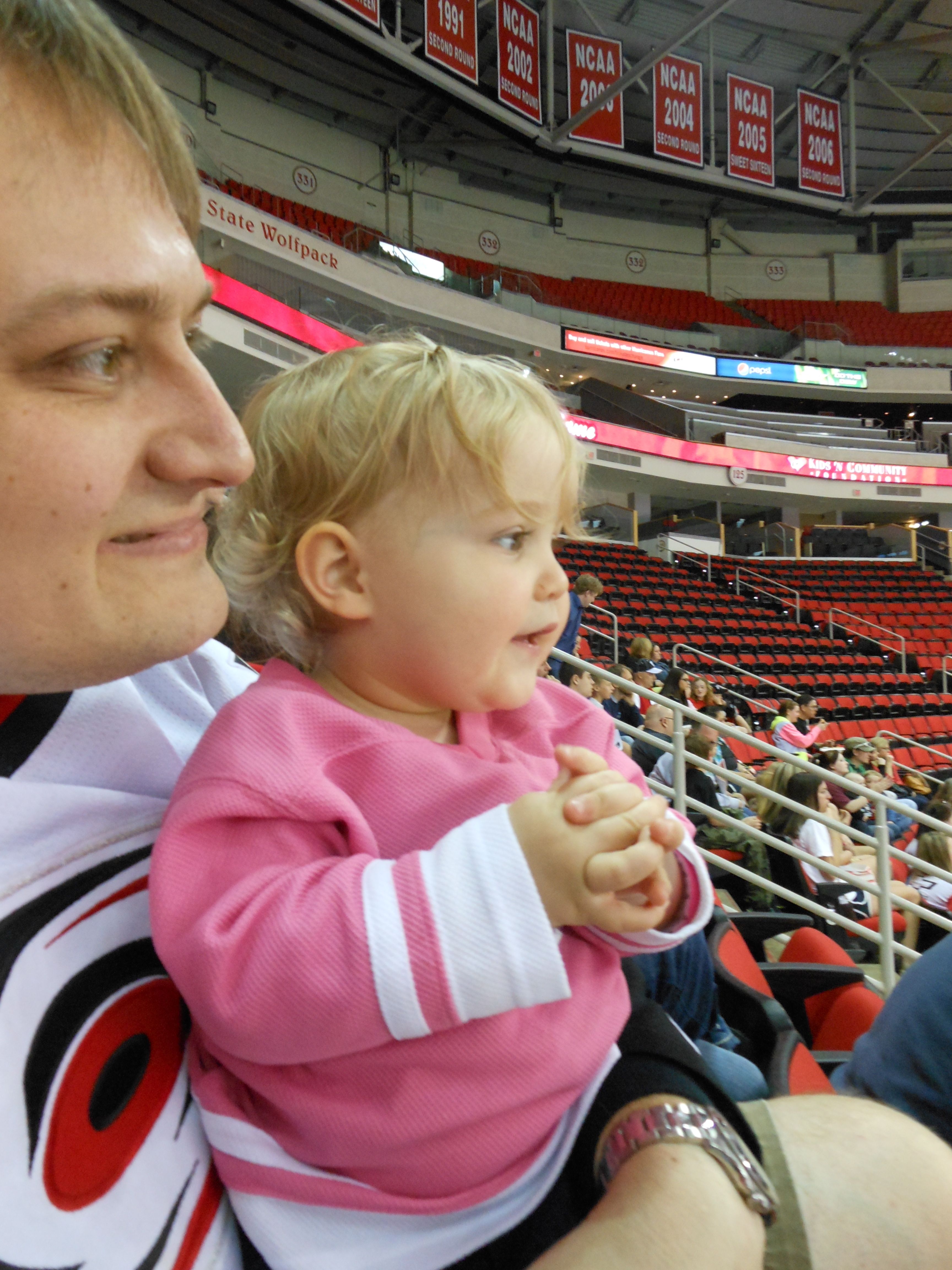 Today was the Carolina Hurricanes’ Alumni Game, which is a really fun family event that we look forward to!  Veteran players return to the ice, and even some fans get to play with them (I think they probably have to make a pretty nice donation to charity to get the chance..!  🙂  Kendall was adorable in her pink jersey, and Brian was rocking both the black jersey and ball cap.  (He was pretty pleased with those bunny snacks in the tie dye bag, he wants you to know about them!)  Our friend Jennie was in attendance as well, and spent a little time visiting with us in the stands.  The alumni game is low pressure (and pretty low attendance, sadly!) but it’s big on fun and silliness.  We made the most of it and enjoyed a pile of hockey arena snacks and treats.  The kids loved the action and being able to sit closer to the ice, not to mention the ice cream!  They were about the best-behaved kids imaginable, but it’s still pretty exhausting wrangling them both!  Afterward, we were all so beat, that when Brian wanted to crash in on Kendall’s bath, we said what the hey, and filled up the big tub, too.  Kendall thought that having her brother in the adjacent tub was hilarious, and Brian had his silly meter cranked to eleven.  They both love it when we pour water in the tubs from high up, Hungry Farmer-style.  (Aw man, we won’t be able to take the kids there in Colorado Springs, now that it’s closed!)  Also included, random shots of Kendall being adorable in her Valentine’s Day shirt (since we missed getting a picture the day of, and now, she’s pretty much outgrown it!  But hey, it was festive for the ‘Canes game.)