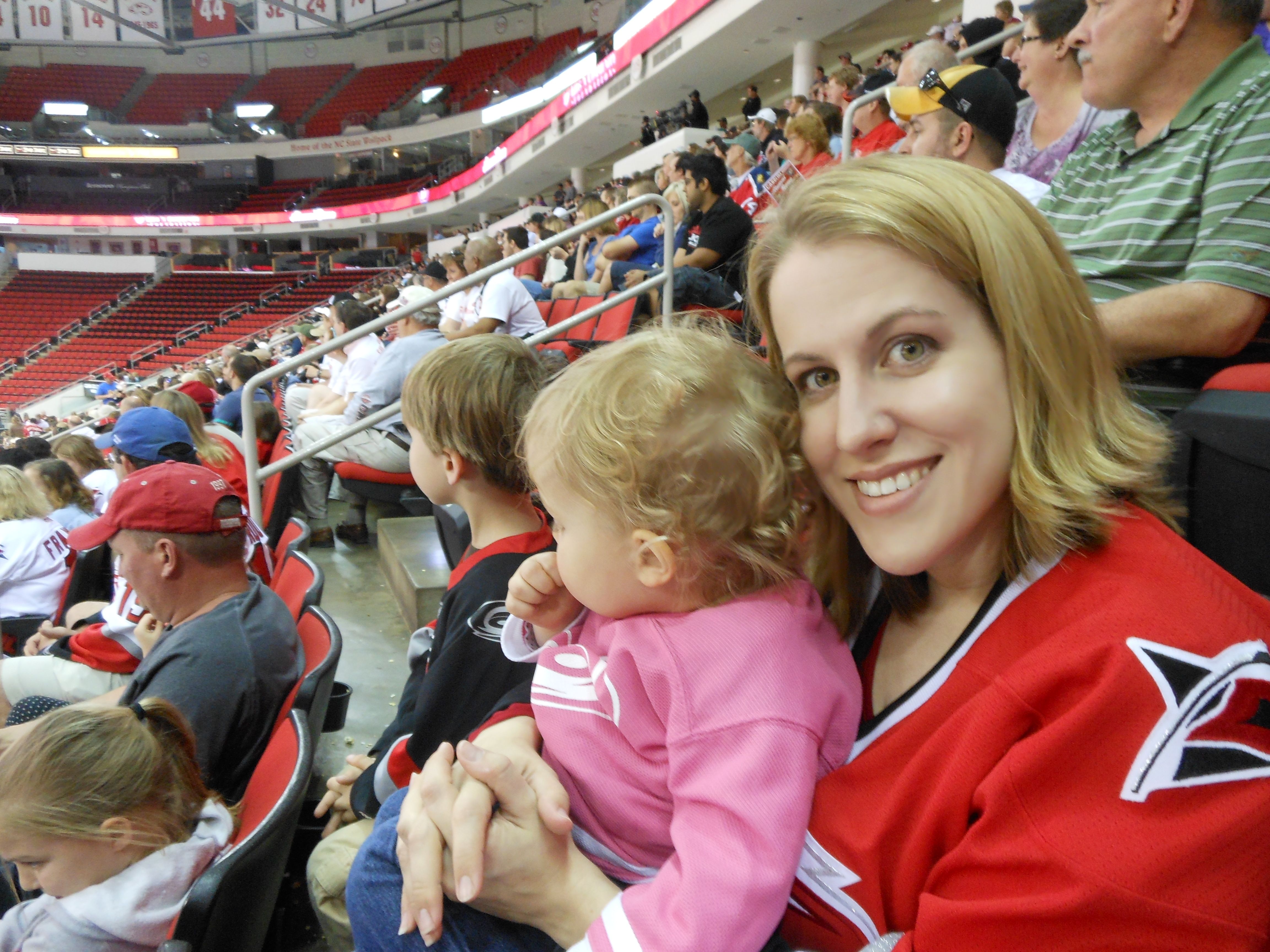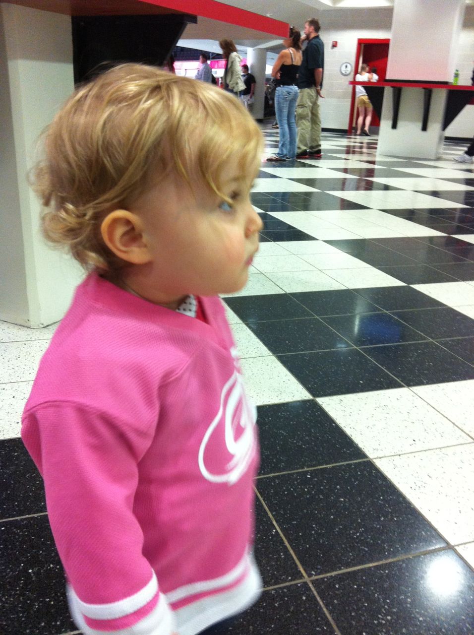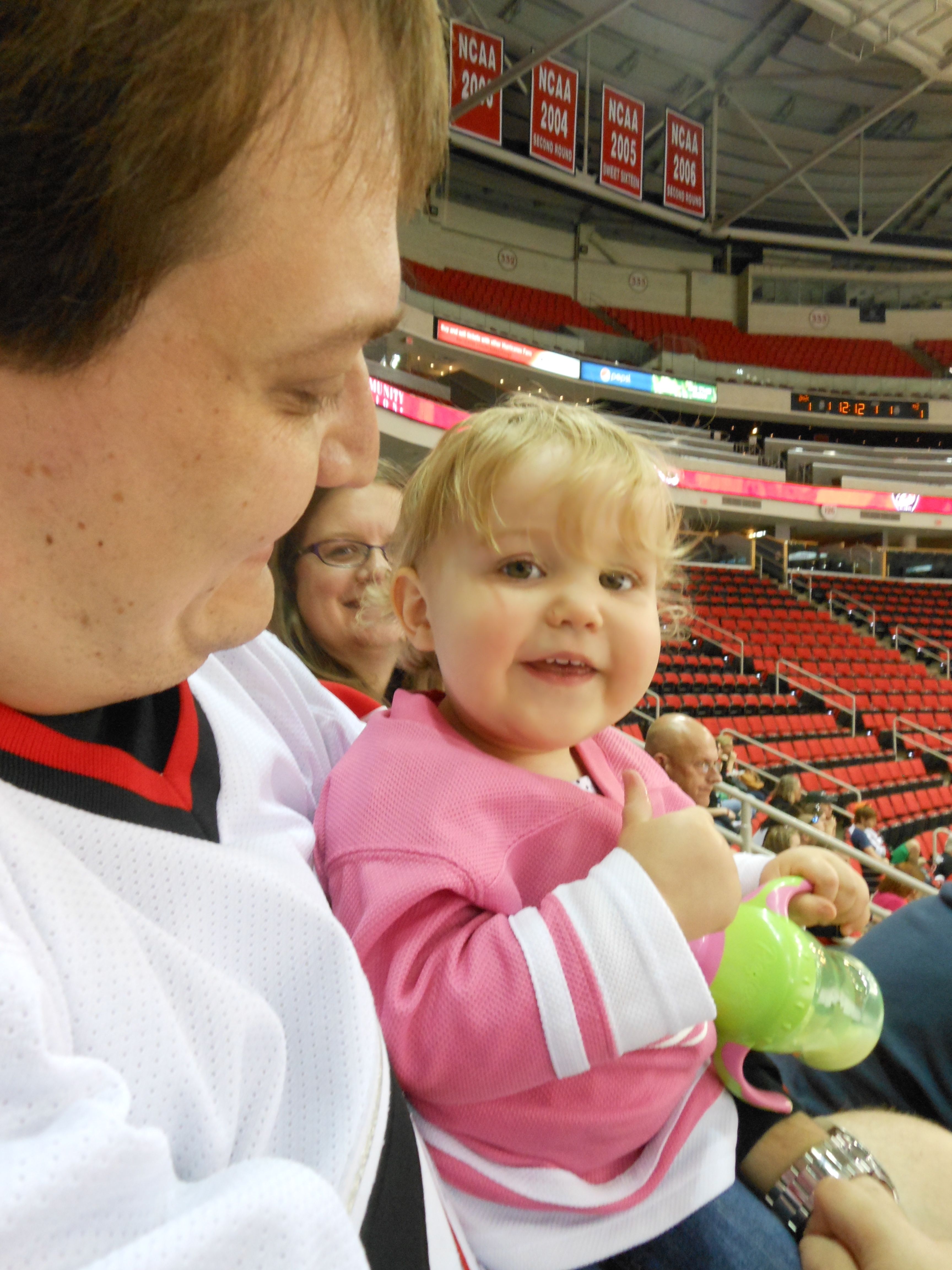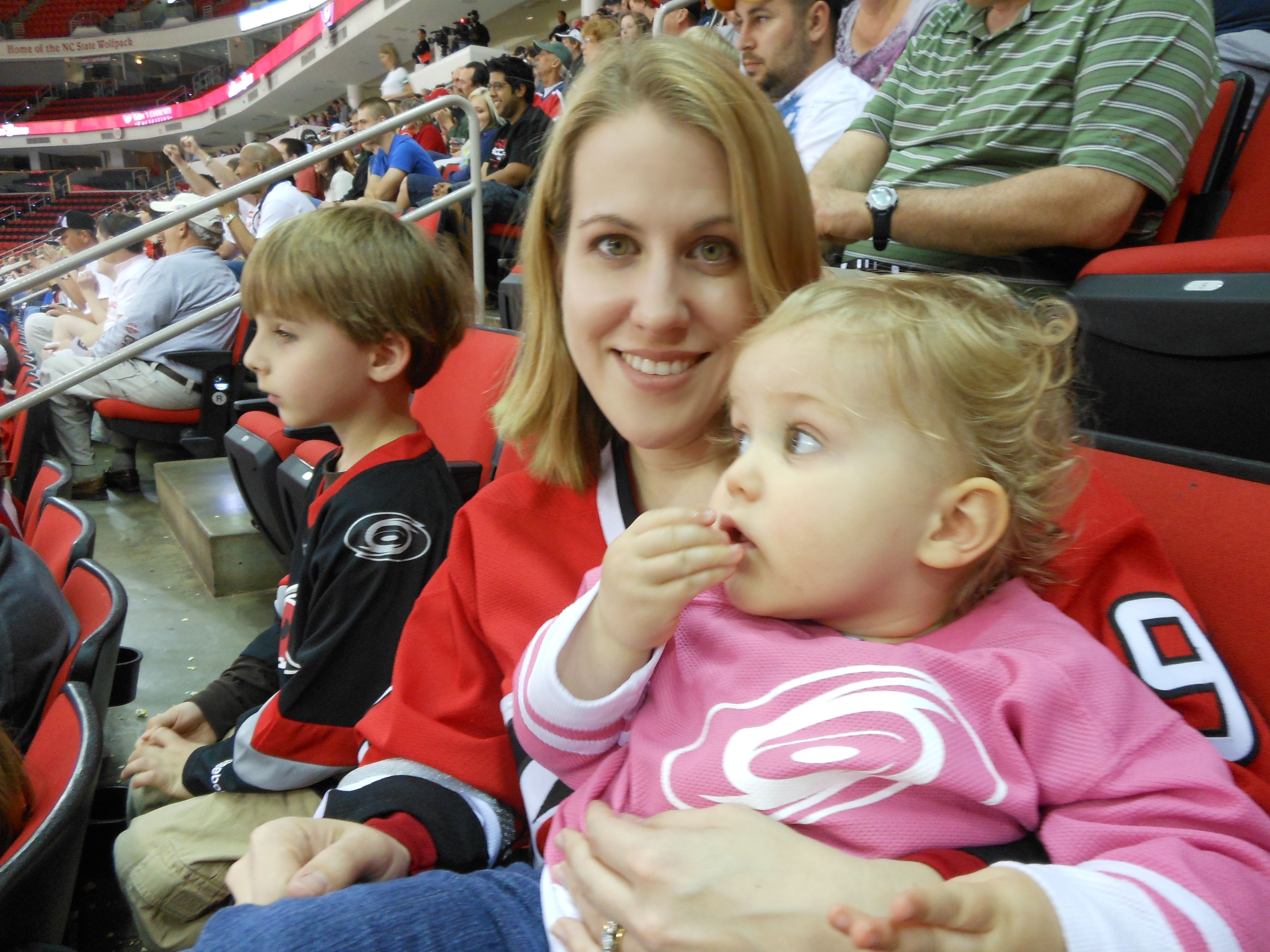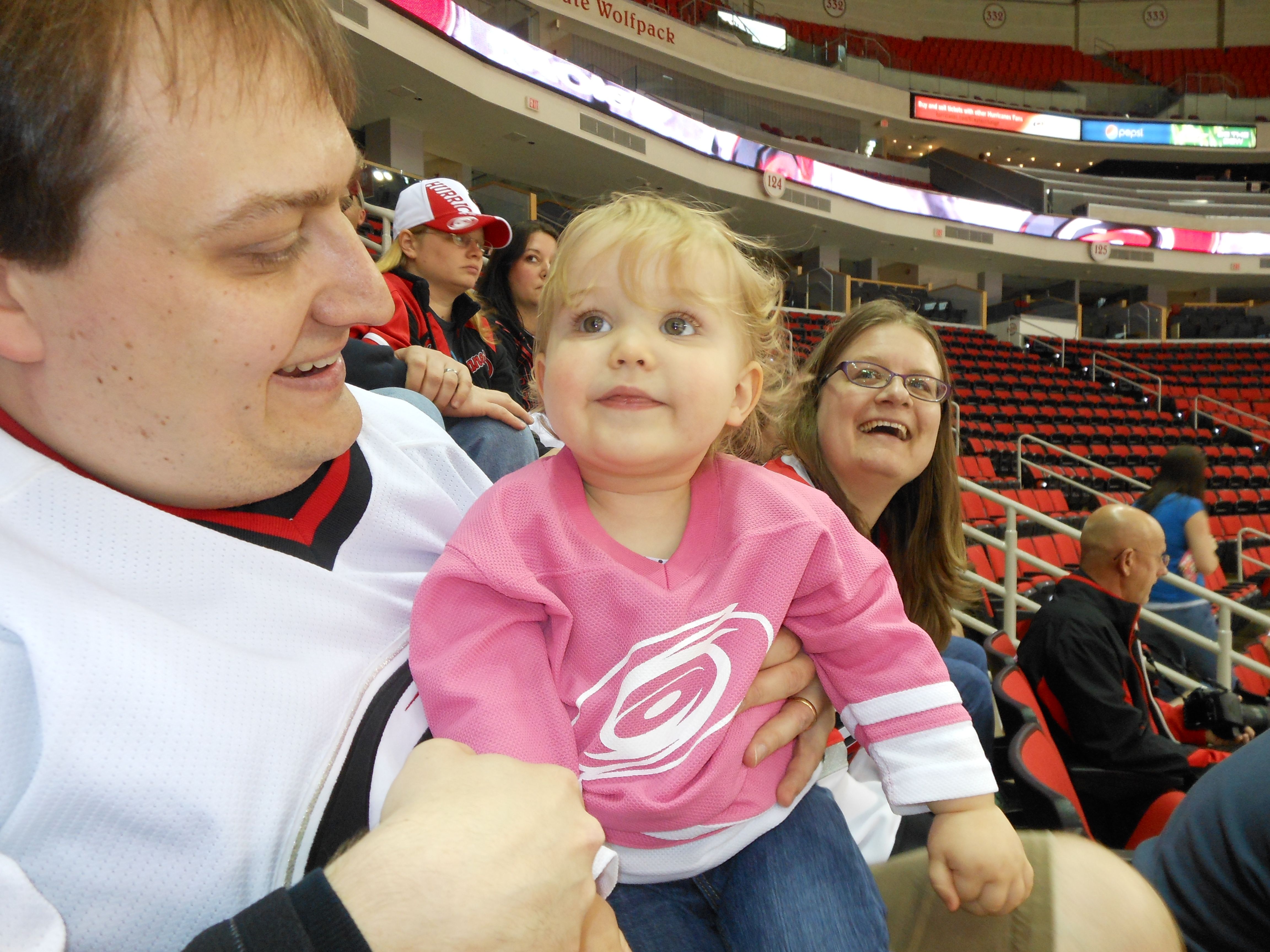 Today was the Carolina Hurricanes’ Alumni Game, which is a really fun family event that we look forward to!  Veteran players return to the ice, and even some fans get to play with them (I think they probably have to make a pretty nice donation to charity to get the chance..!  🙂  Kendall was adorable in her pink jersey, and Brian was rocking both the black jersey and ball cap.  (He was pretty pleased with those bunny snacks in the tie dye bag, he wants you to know about them!)  Our friend Jennie was in attendance as well, and spent a little time visiting with us in the stands.  The alumni game is low pressure (and pretty low attendance, sadly!) but it’s big on fun and silliness.  We made the most of it and enjoyed a pile of hockey arena snacks and treats.  The kids loved the action and being able to sit closer to the ice, not to mention the ice cream!  They were about the best-behaved kids imaginable, but it’s still pretty exhausting wrangling them both!  Afterward, we were all so beat, that when Brian wanted to crash in on Kendall’s bath, we said what the hey, and filled up the big tub, too.  Kendall thought that having her brother in the adjacent tub was hilarious, and Brian had his silly meter cranked to eleven.  They both love it when we pour water in the tubs from high up, Hungry Farmer-style.  (Aw man, we won’t be able to take the kids there in Colorado Springs, now that it’s closed!)  Also included, random shots of Kendall being adorable in her Valentine’s Day shirt (since we missed getting a picture the day of, and now, she’s pretty much outgrown it!  But hey, it was festive for the ‘Canes game.)