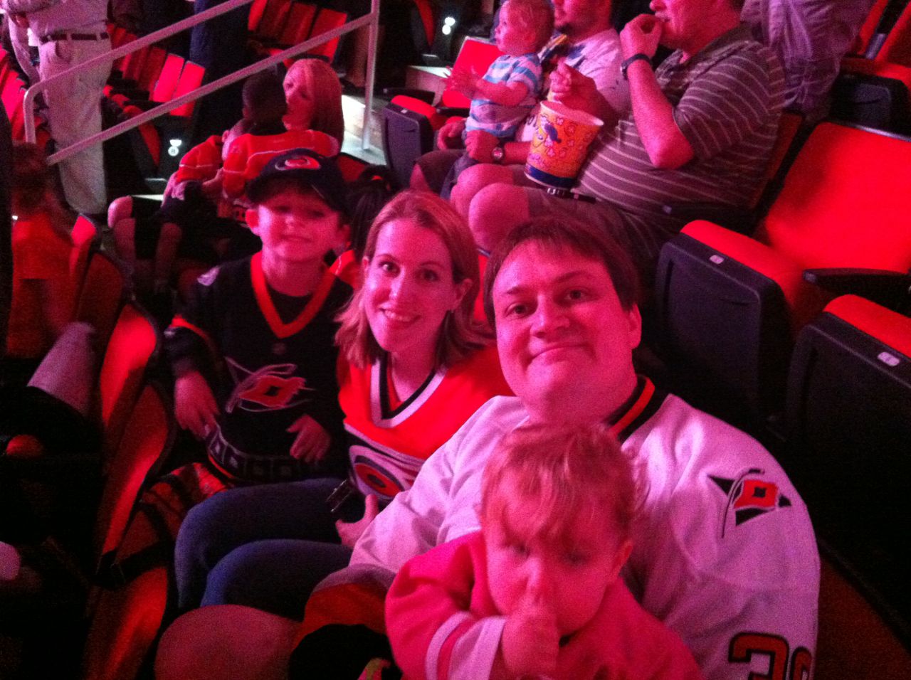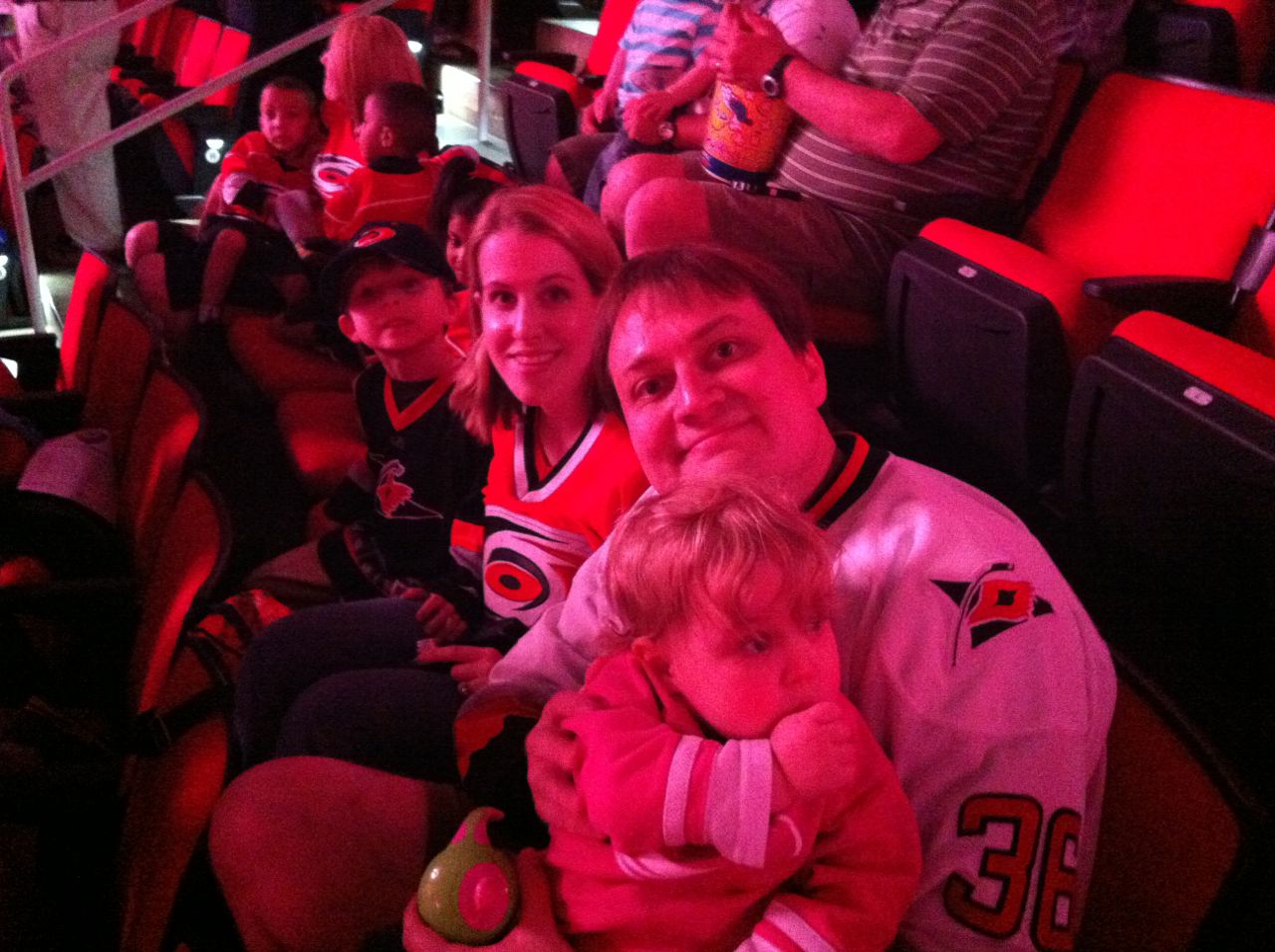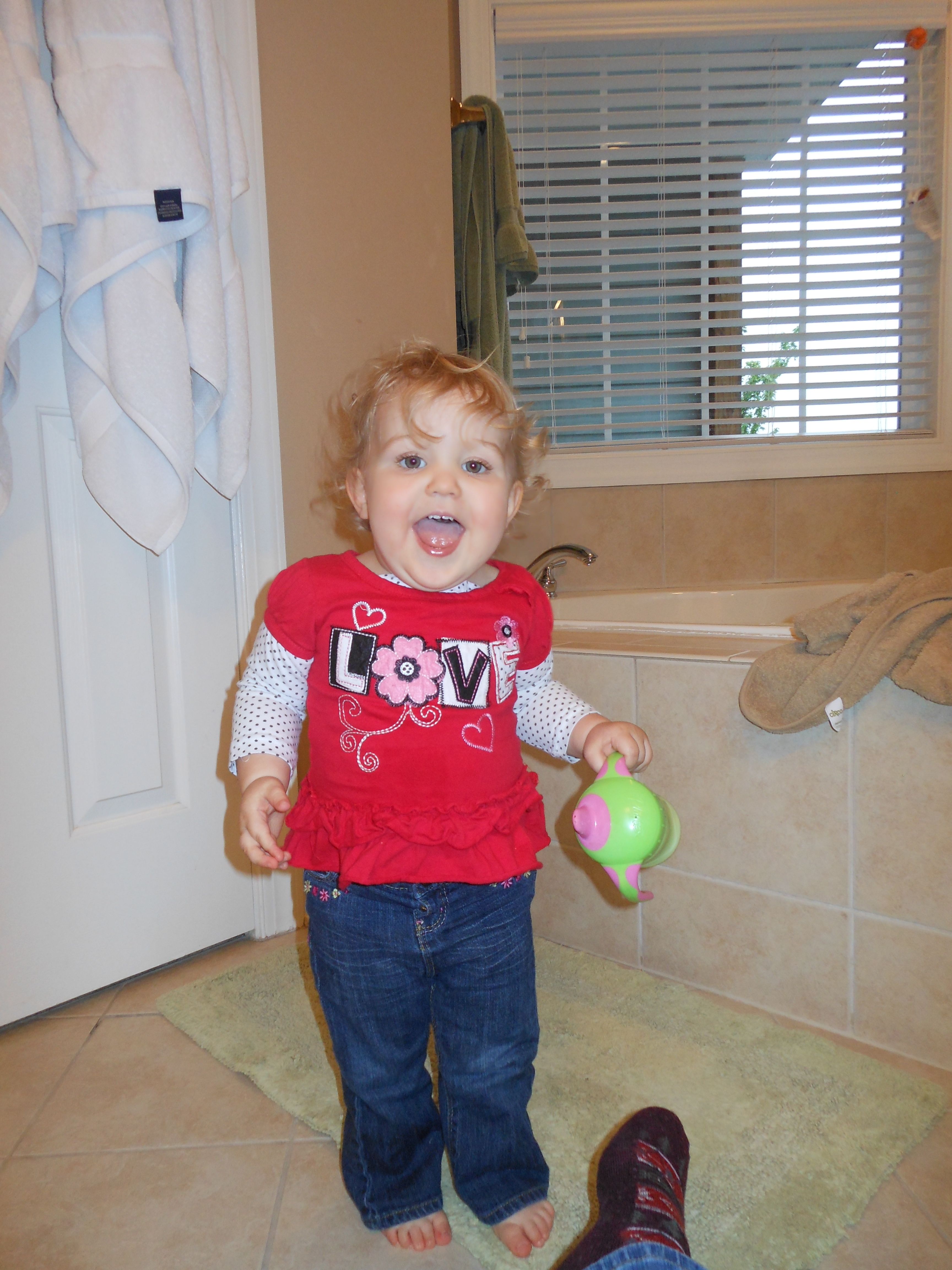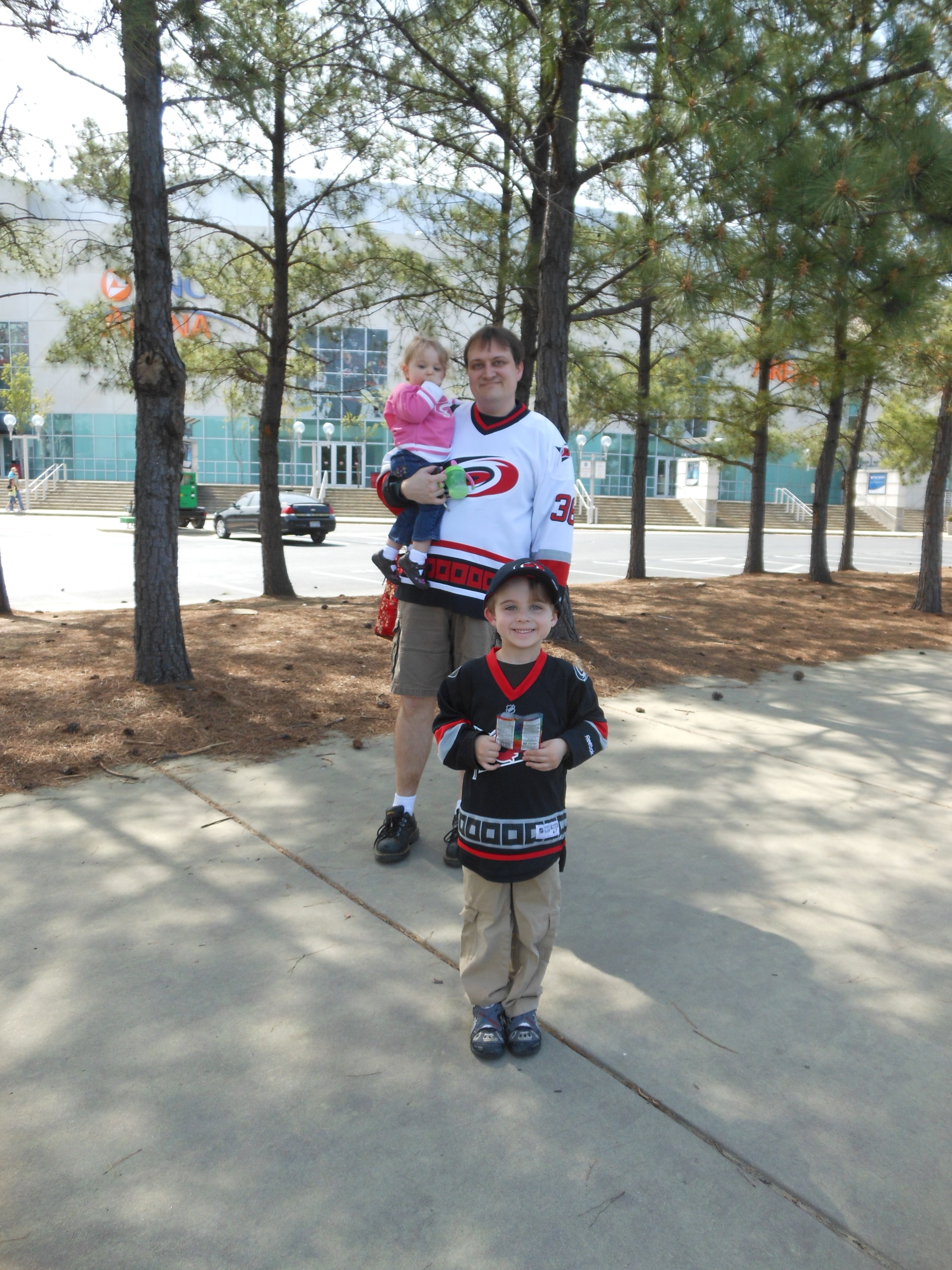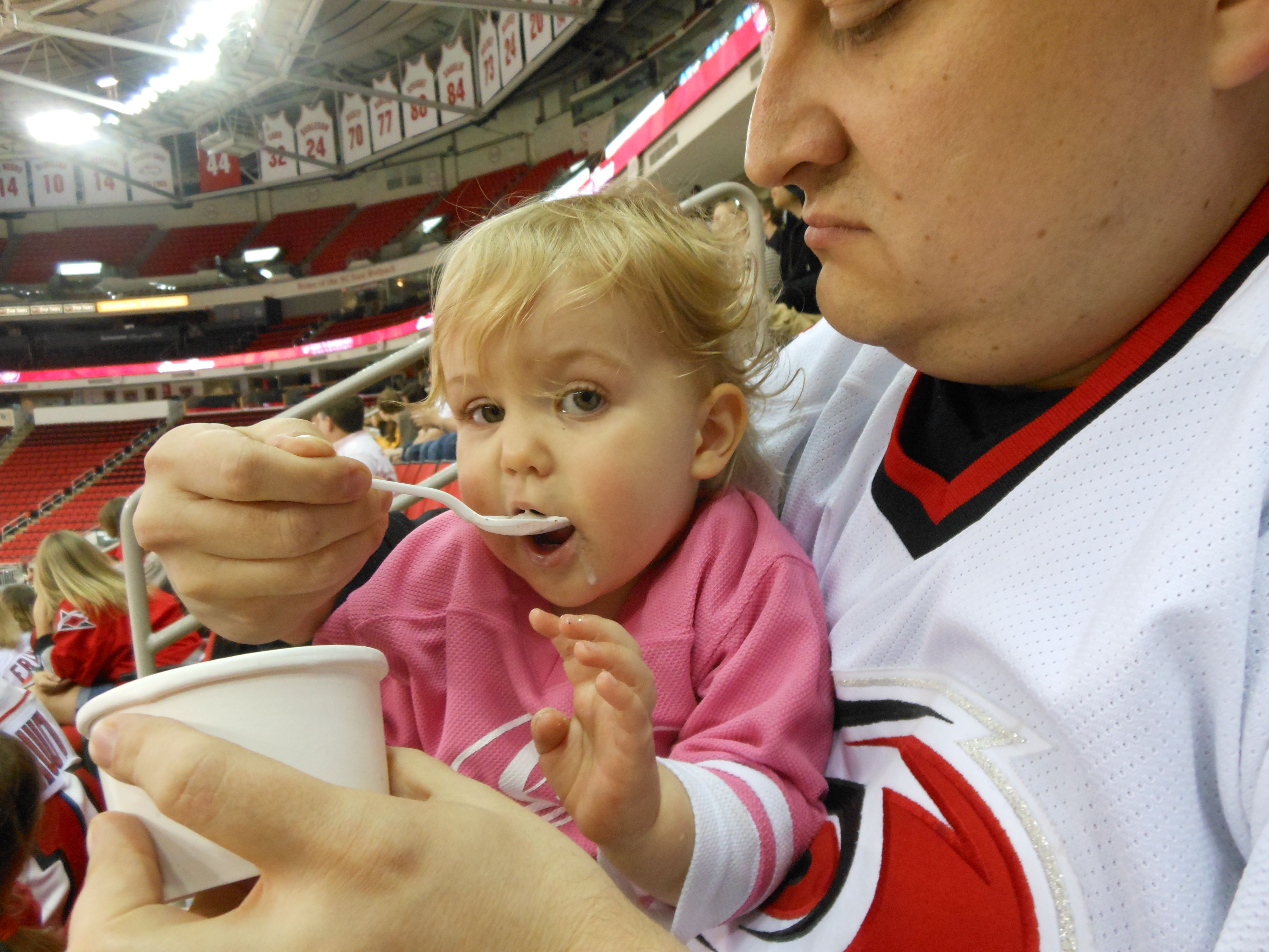 Today was the Carolina Hurricanes’ Alumni Game, which is a really fun family event that we look forward to!  Veteran players return to the ice, and even some fans get to play with them (I think they probably have to make a pretty nice donation to charity to get the chance..!  🙂  Kendall was adorable in her pink jersey, and Brian was rocking both the black jersey and ball cap.  (He was pretty pleased with those bunny snacks in the tie dye bag, he wants you to know about them!)  Our friend Jennie was in attendance as well, and spent a little time visiting with us in the stands.  The alumni game is low pressure (and pretty low attendance, sadly!) but it’s big on fun and silliness.  We made the most of it and enjoyed a pile of hockey arena snacks and treats.  The kids loved the action and being able to sit closer to the ice, not to mention the ice cream!  They were about the best-behaved kids imaginable, but it’s still pretty exhausting wrangling them both!  Afterward, we were all so beat, that when Brian wanted to crash in on Kendall’s bath, we said what the hey, and filled up the big tub, too.  Kendall thought that having her brother in the adjacent tub was hilarious, and Brian had his silly meter cranked to eleven.  They both love it when we pour water in the tubs from high up, Hungry Farmer-style.  (Aw man, we won’t be able to take the kids there in Colorado Springs, now that it’s closed!)  Also included, random shots of Kendall being adorable in her Valentine’s Day shirt (since we missed getting a picture the day of, and now, she’s pretty much outgrown it!  But hey, it was festive for the ‘Canes game.)
