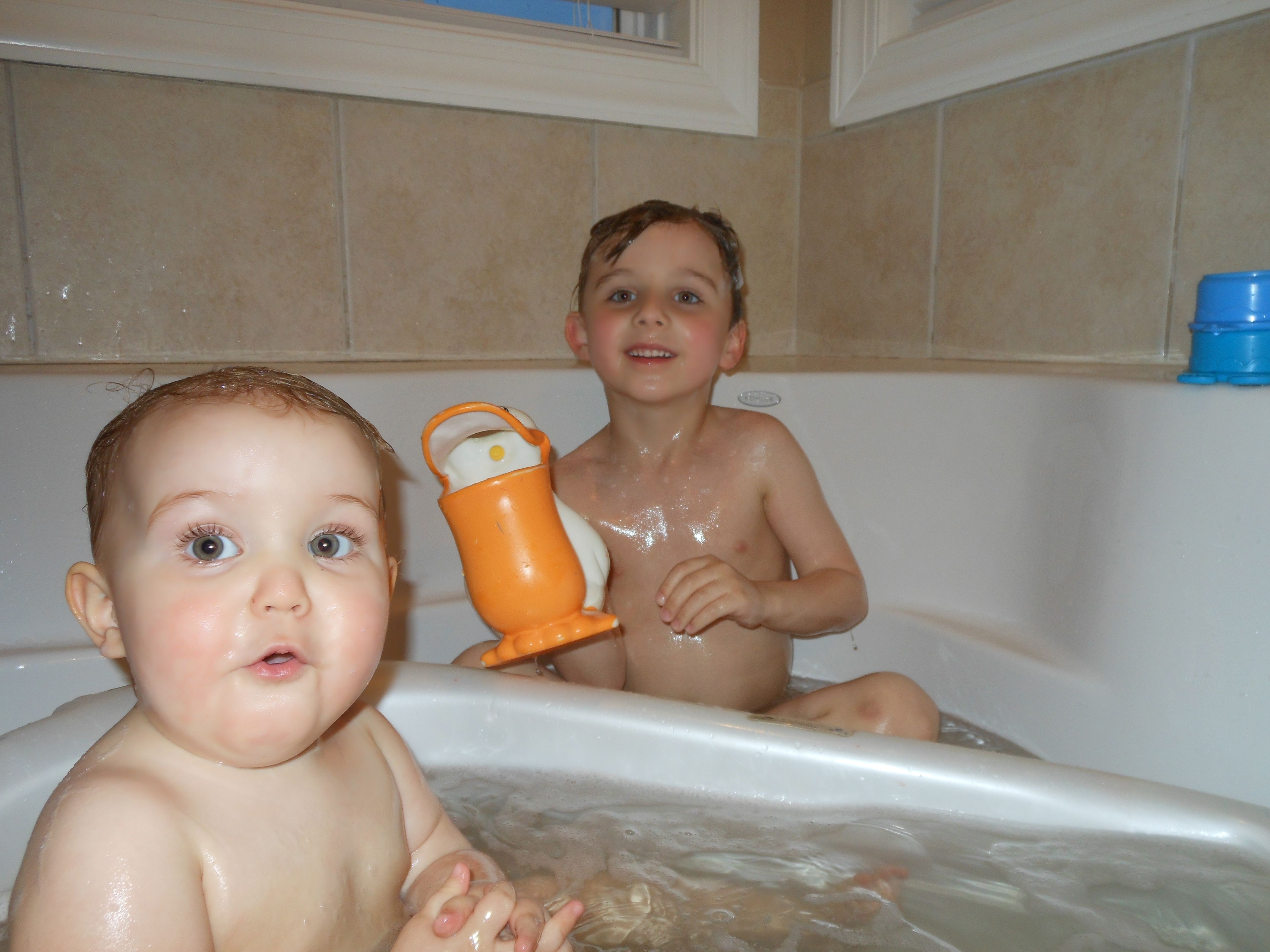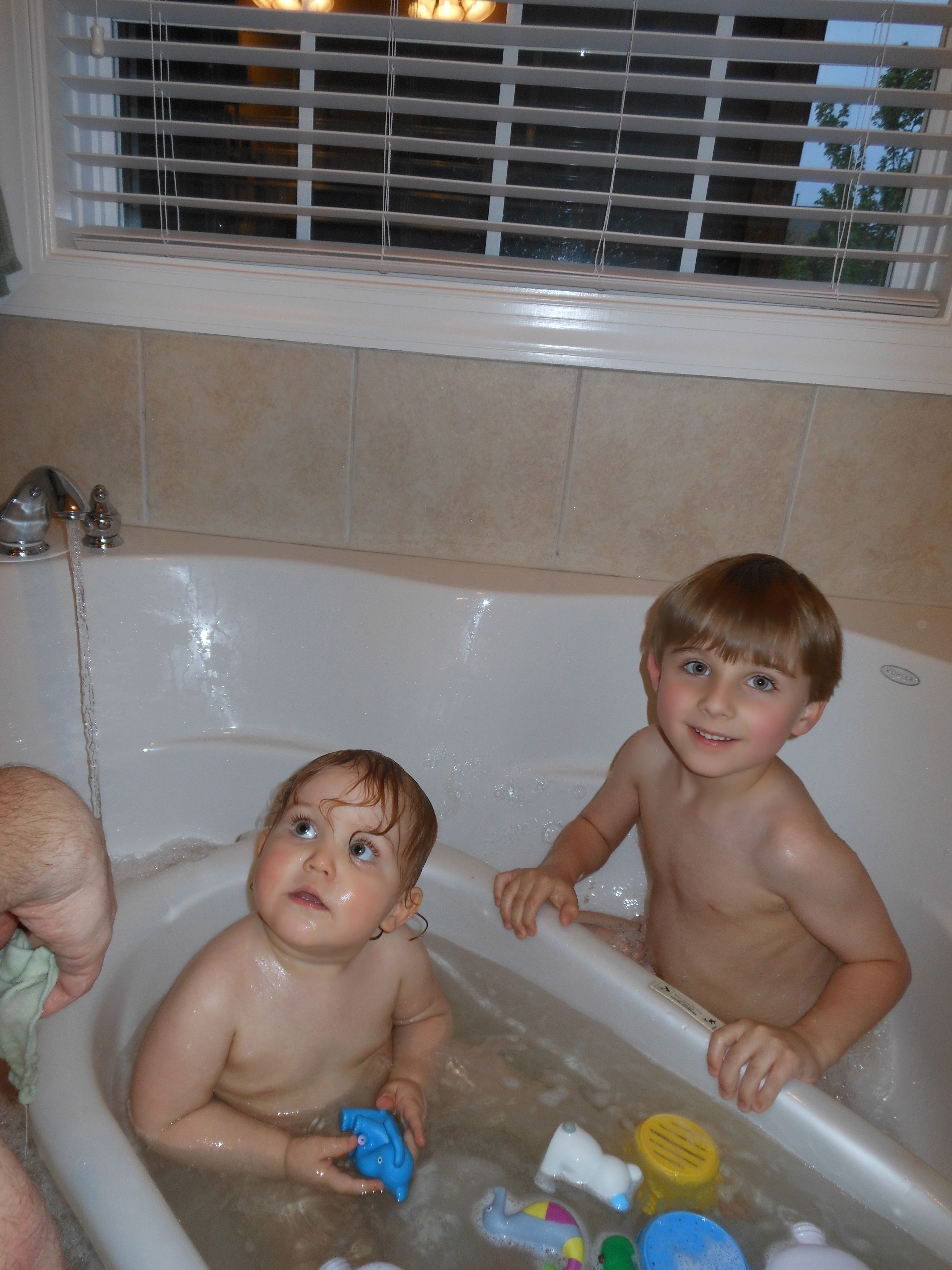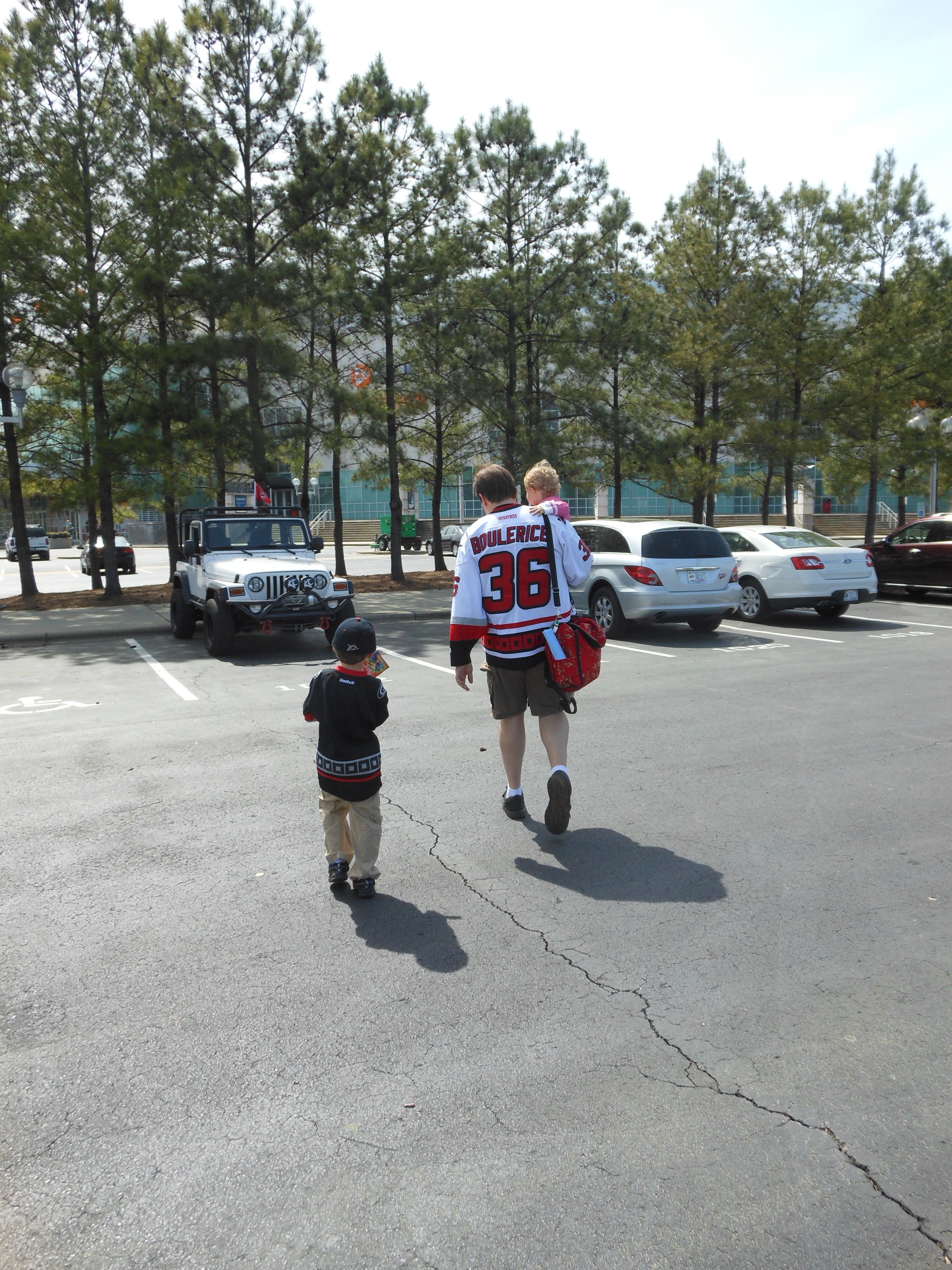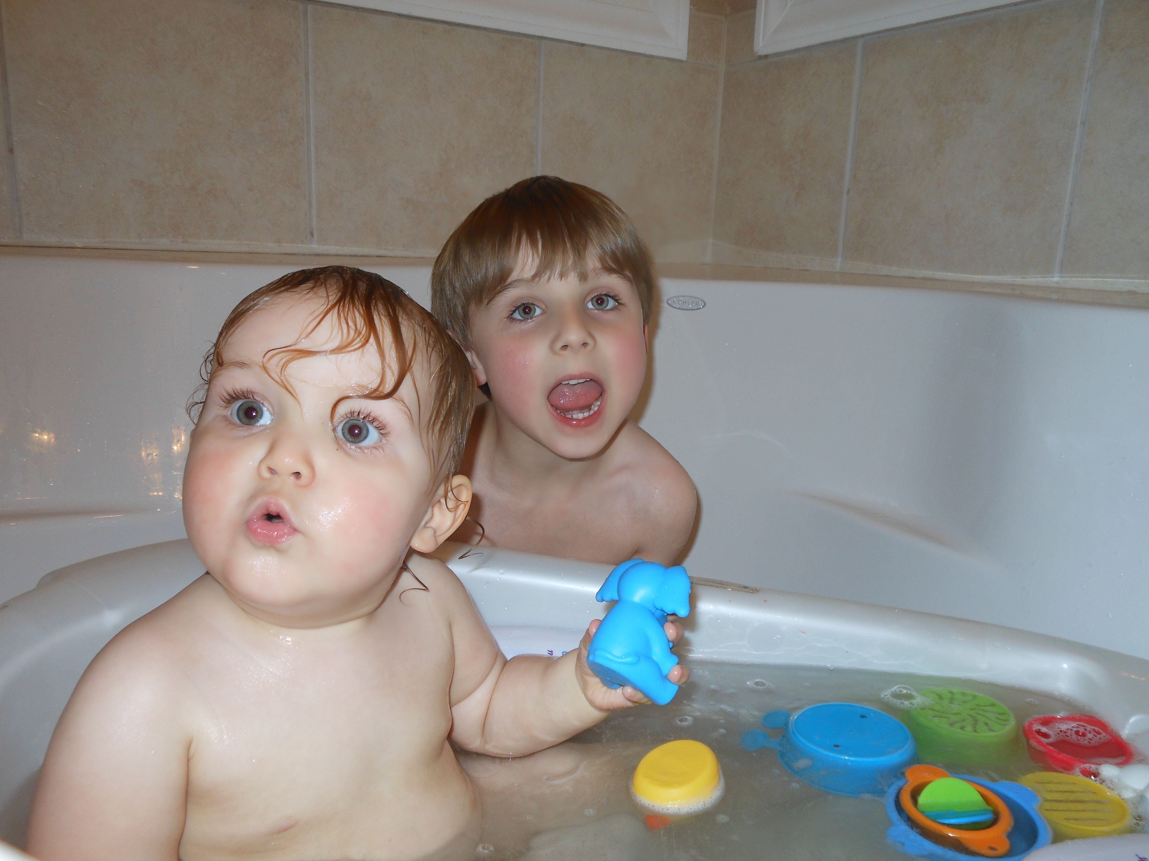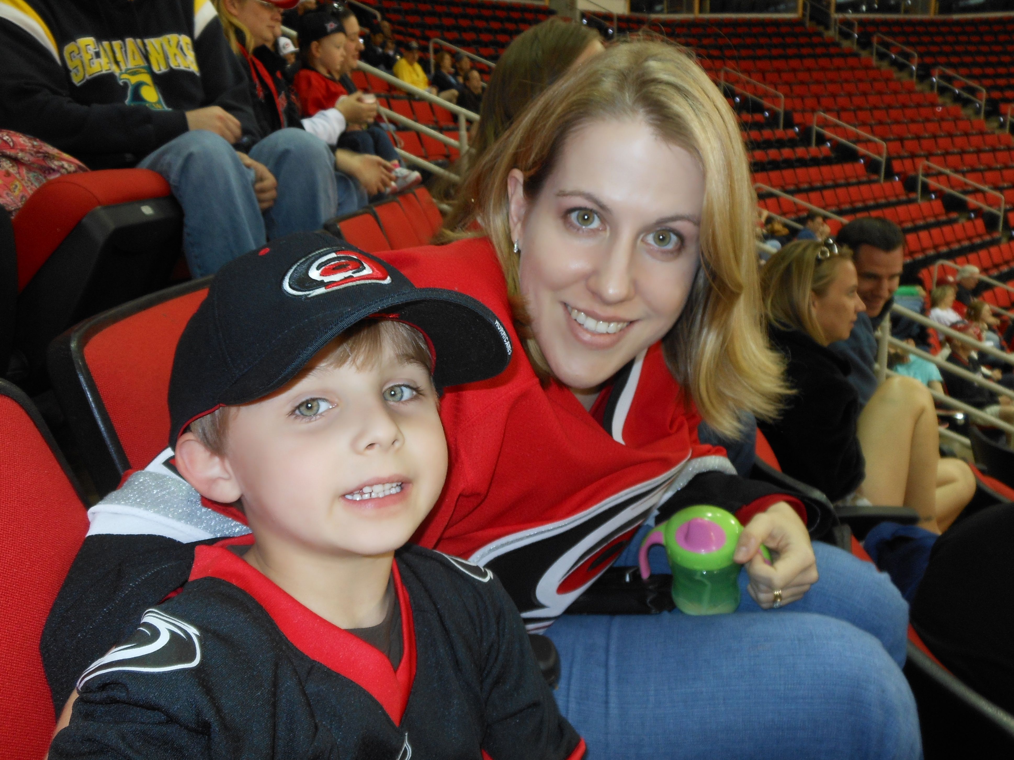 Today was the Carolina Hurricanes’ Alumni Game, which is a really fun family event that we look forward to!  Veteran players return to the ice, and even some fans get to play with them (I think they probably have to make a pretty nice donation to charity to get the chance..!  🙂  Kendall was adorable in her pink jersey, and Brian was rocking both the black jersey and ball cap.  (He was pretty pleased with those bunny snacks in the tie dye bag, he wants you to know about them!)  Our friend Jennie was in attendance as well, and spent a little time visiting with us in the stands.  The alumni game is low pressure (and pretty low attendance, sadly!) but it’s big on fun and silliness.  We made the most of it and enjoyed a pile of hockey arena snacks and treats.  The kids loved the action and being able to sit closer to the ice, not to mention the ice cream!  They were about the best-behaved kids imaginable, but it’s still pretty exhausting wrangling them both!  Afterward, we were all so beat, that when Brian wanted to crash in on Kendall’s bath, we said what the hey, and filled up the big tub, too.  Kendall thought that having her brother in the adjacent tub was hilarious, and Brian had his silly meter cranked to eleven.  They both love it when we pour water in the tubs from high up, Hungry Farmer-style.  (Aw man, we won’t be able to take the kids there in Colorado Springs, now that it’s closed!)  Also included, random shots of Kendall being adorable in her Valentine’s Day shirt (since we missed getting a picture the day of, and now, she’s pretty much outgrown it!  But hey, it was festive for the ‘Canes game.)