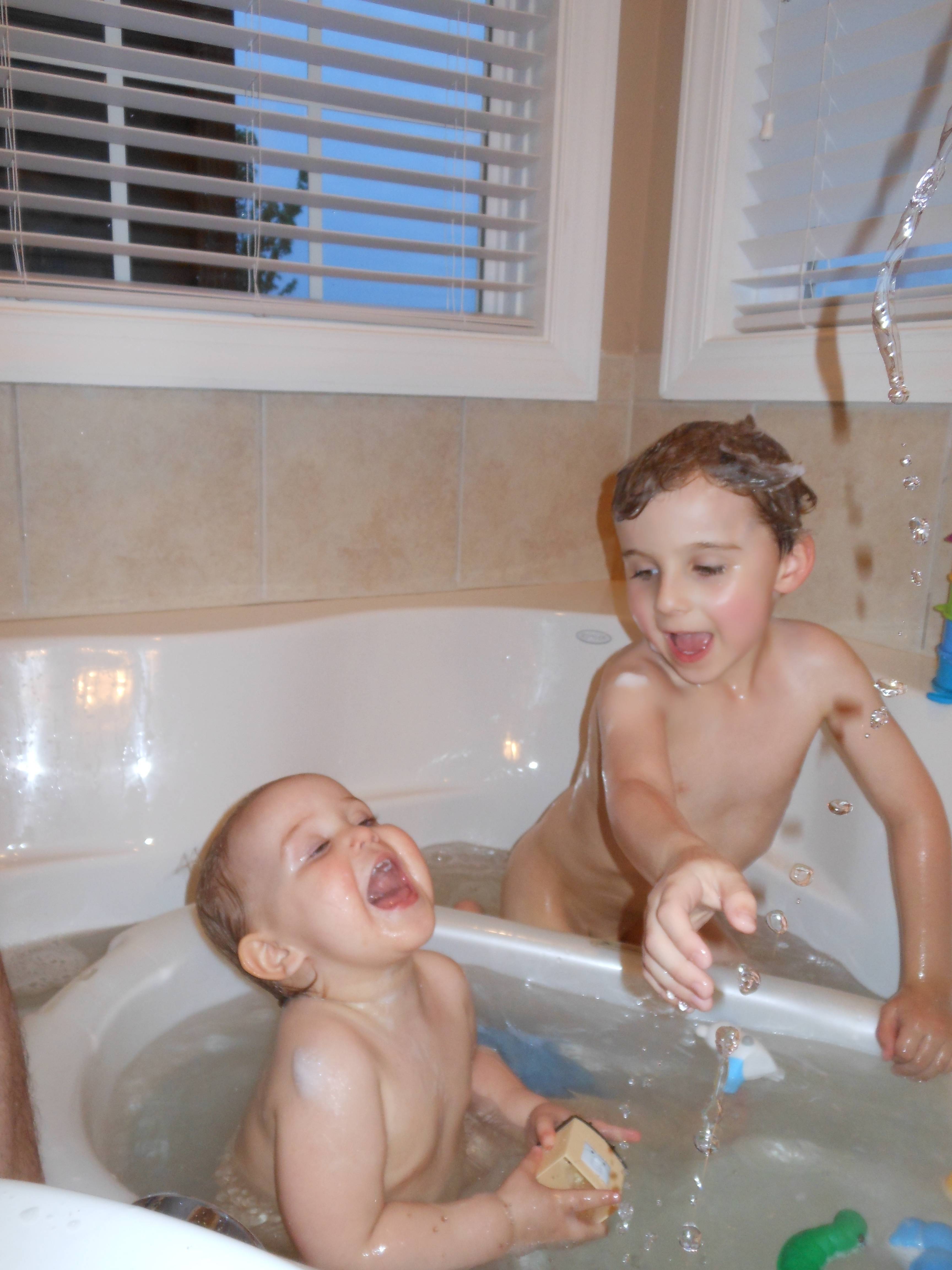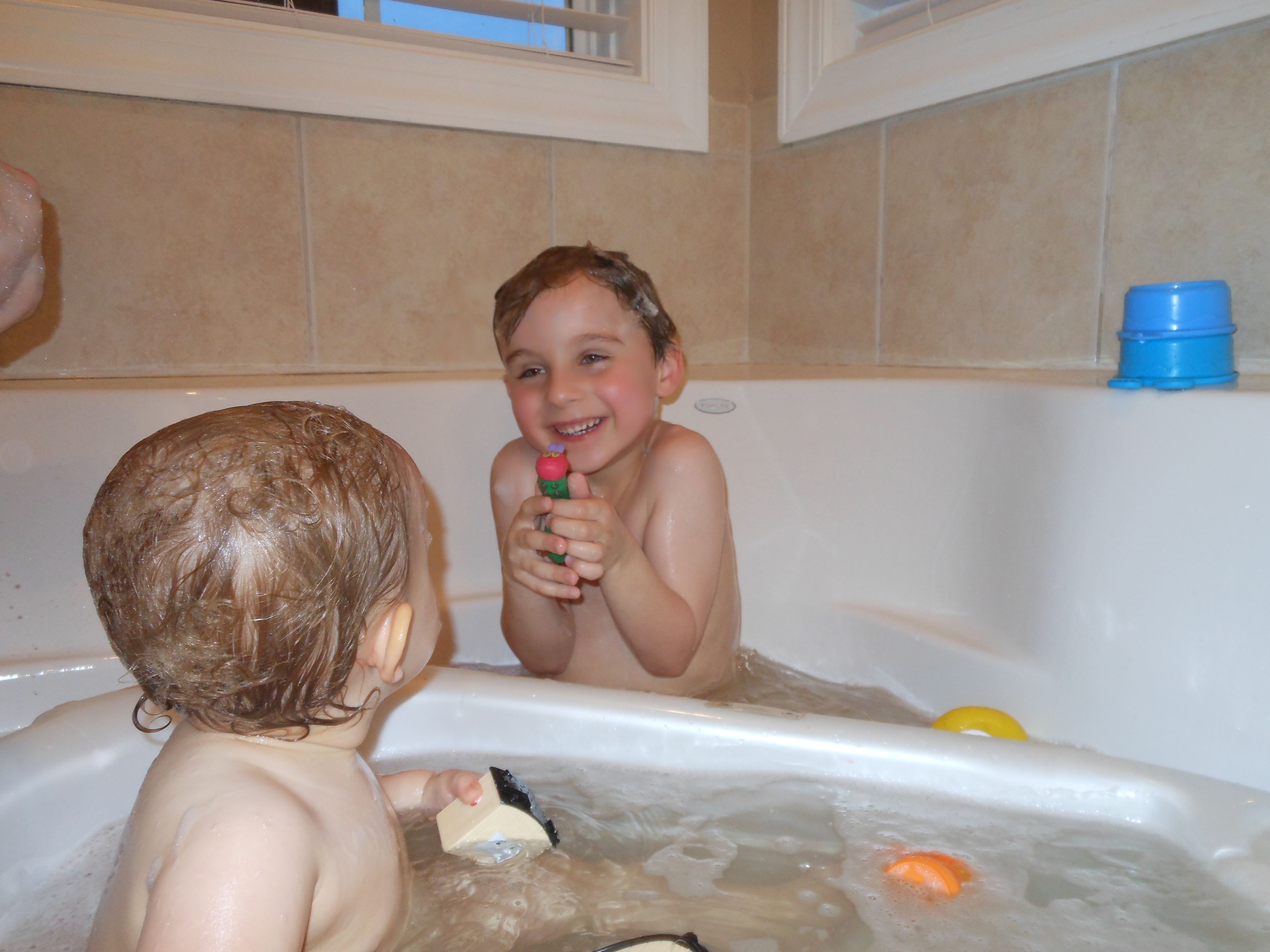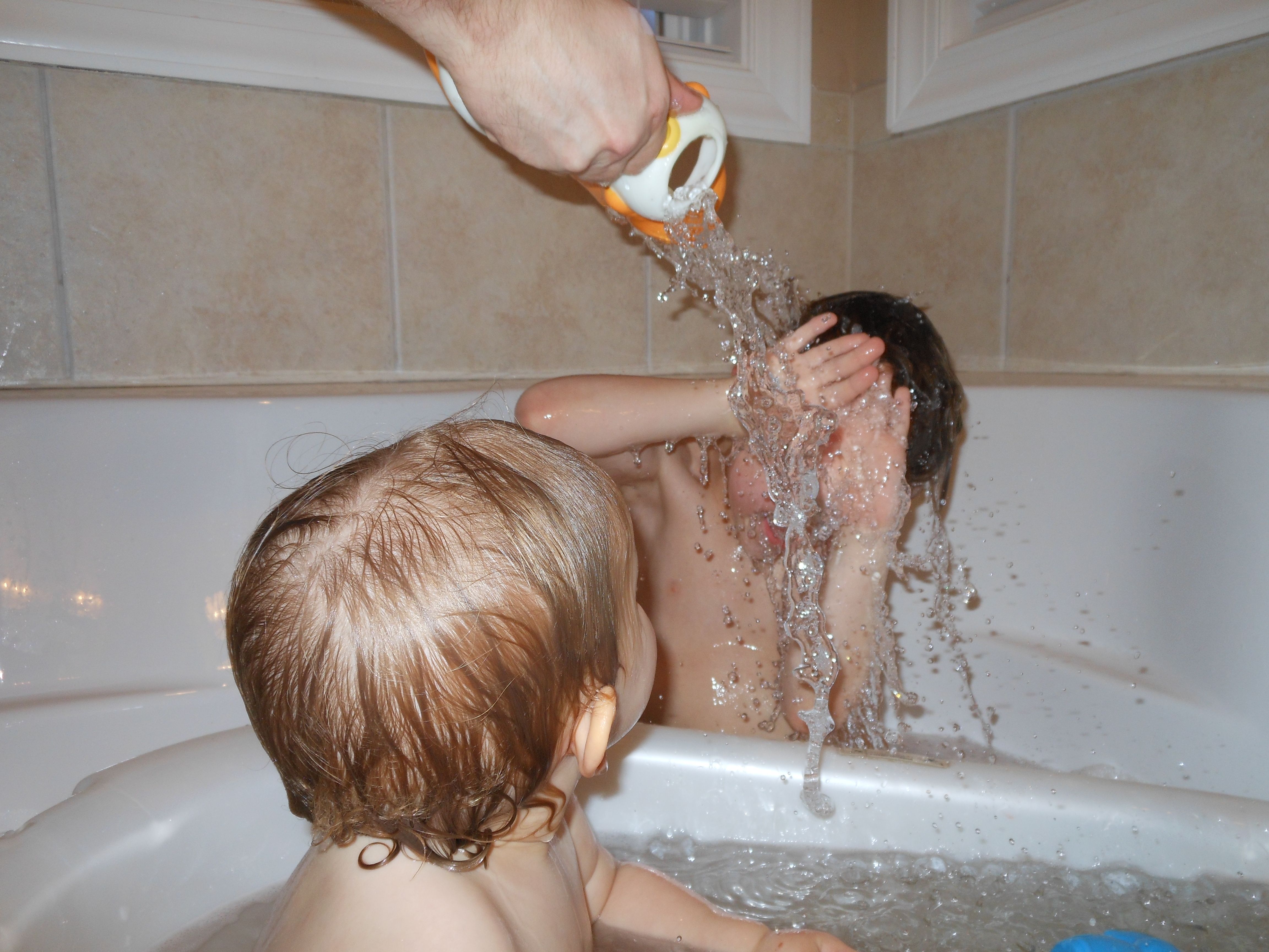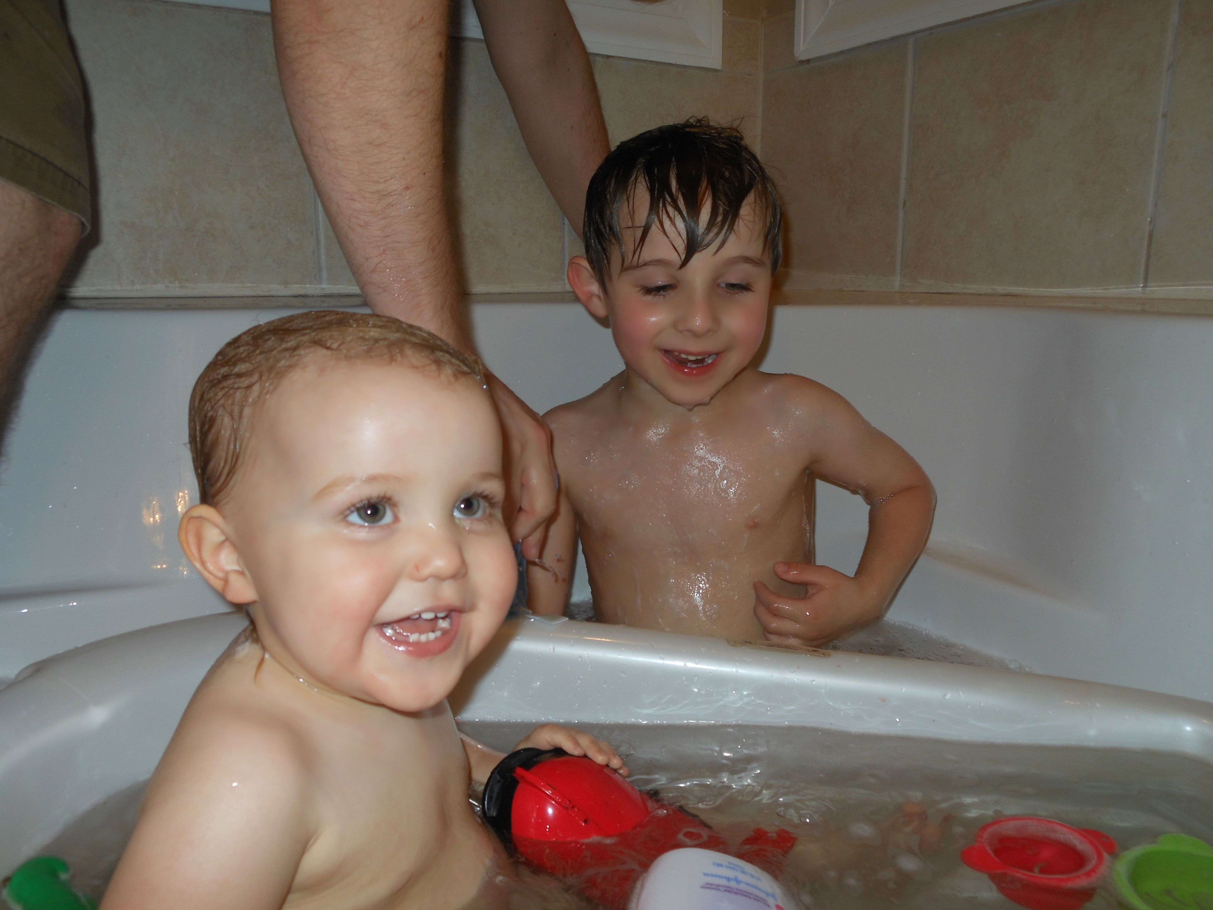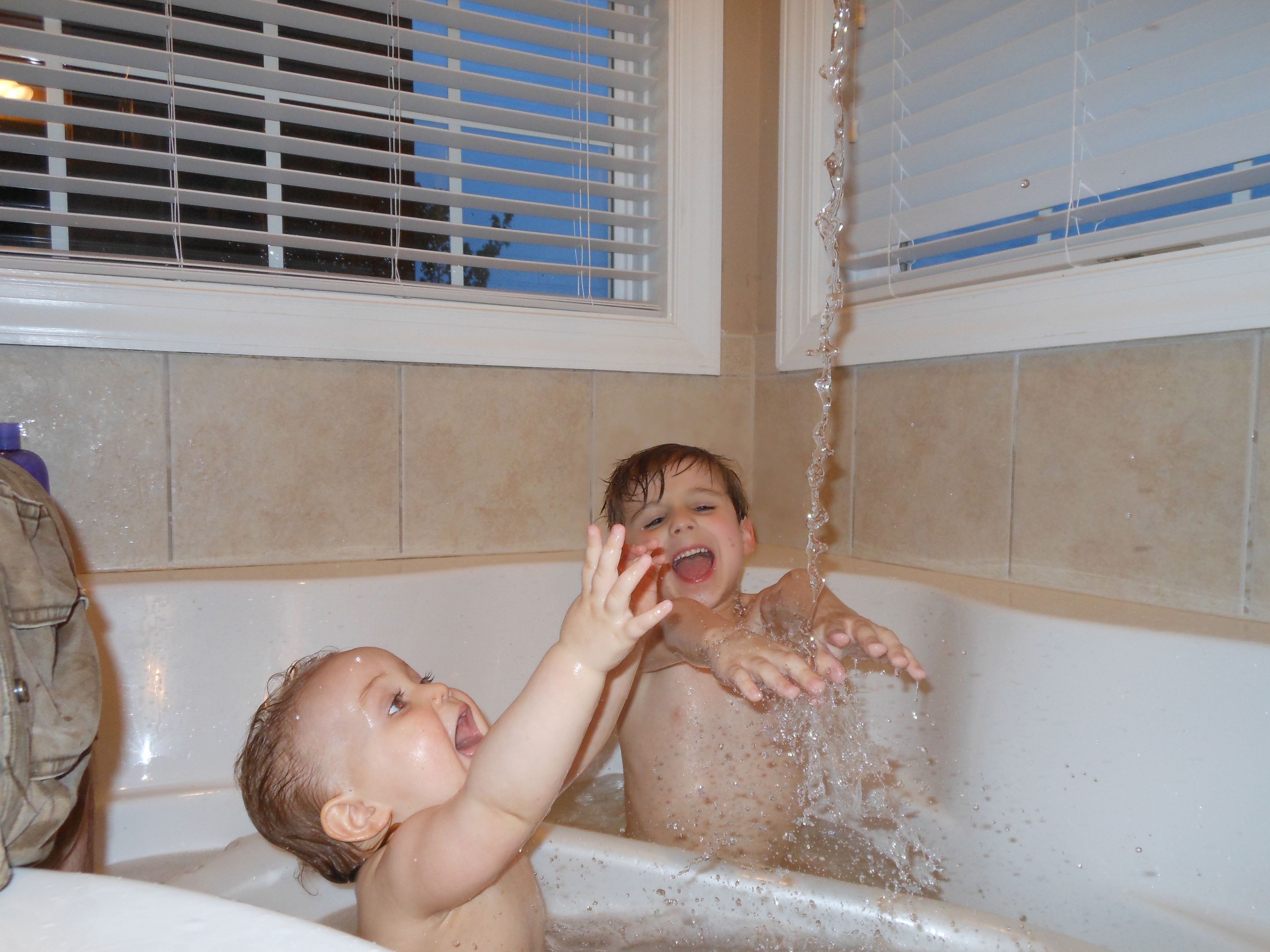 Today was the Carolina Hurricanes’ Alumni Game, which is a really fun family event that we look forward to!  Veteran players return to the ice, and even some fans get to play with them (I think they probably have to make a pretty nice donation to charity to get the chance..!  🙂  Kendall was adorable in her pink jersey, and Brian was rocking both the black jersey and ball cap.  (He was pretty pleased with those bunny snacks in the tie dye bag, he wants you to know about them!)  Our friend Jennie was in attendance as well, and spent a little time visiting with us in the stands.  The alumni game is low pressure (and pretty low attendance, sadly!) but it’s big on fun and silliness.  We made the most of it and enjoyed a pile of hockey arena snacks and treats.  The kids loved the action and being able to sit closer to the ice, not to mention the ice cream!  They were about the best-behaved kids imaginable, but it’s still pretty exhausting wrangling them both!  Afterward, we were all so beat, that when Brian wanted to crash in on Kendall’s bath, we said what the hey, and filled up the big tub, too.  Kendall thought that having her brother in the adjacent tub was hilarious, and Brian had his silly meter cranked to eleven.  They both love it when we pour water in the tubs from high up, Hungry Farmer-style.  (Aw man, we won’t be able to take the kids there in Colorado Springs, now that it’s closed!)  Also included, random shots of Kendall being adorable in her Valentine’s Day shirt (since we missed getting a picture the day of, and now, she’s pretty much outgrown it!  But hey, it was festive for the ‘Canes game.)