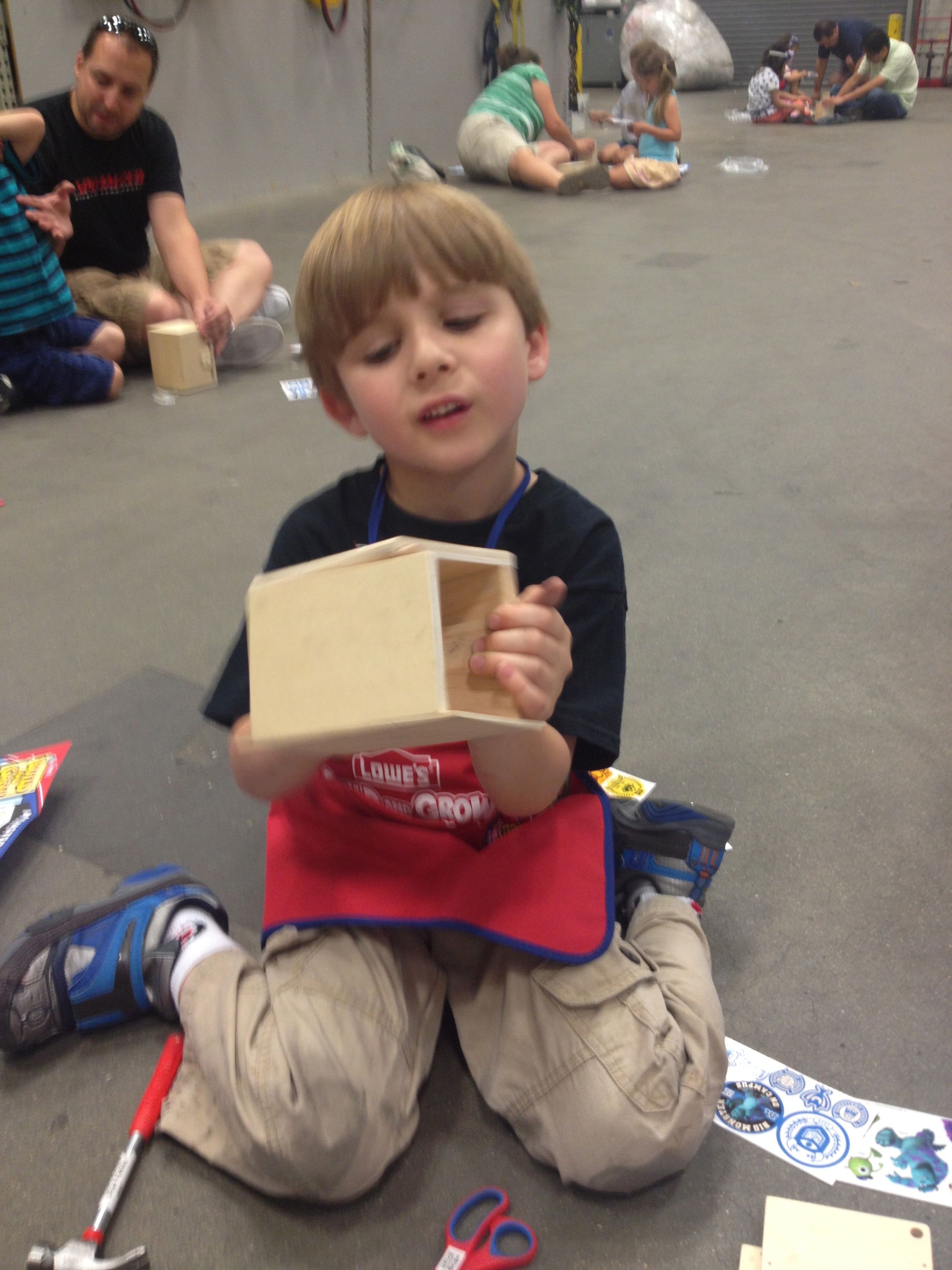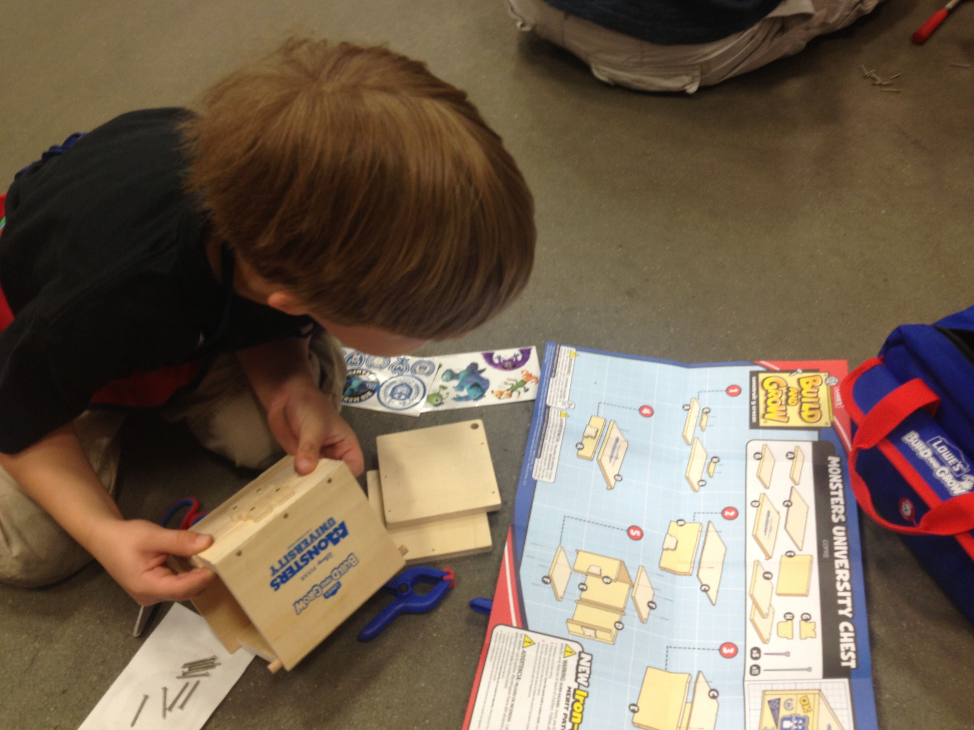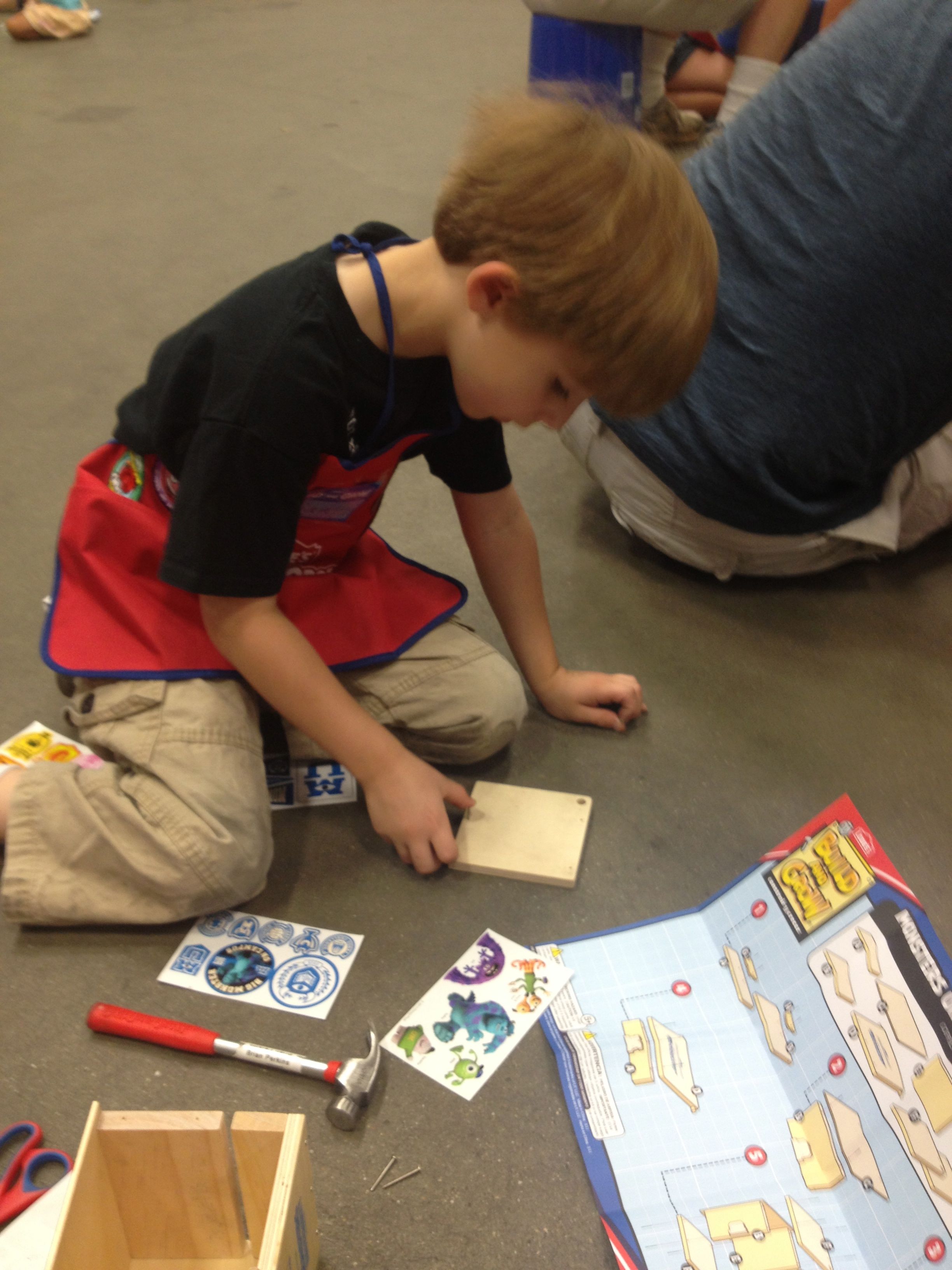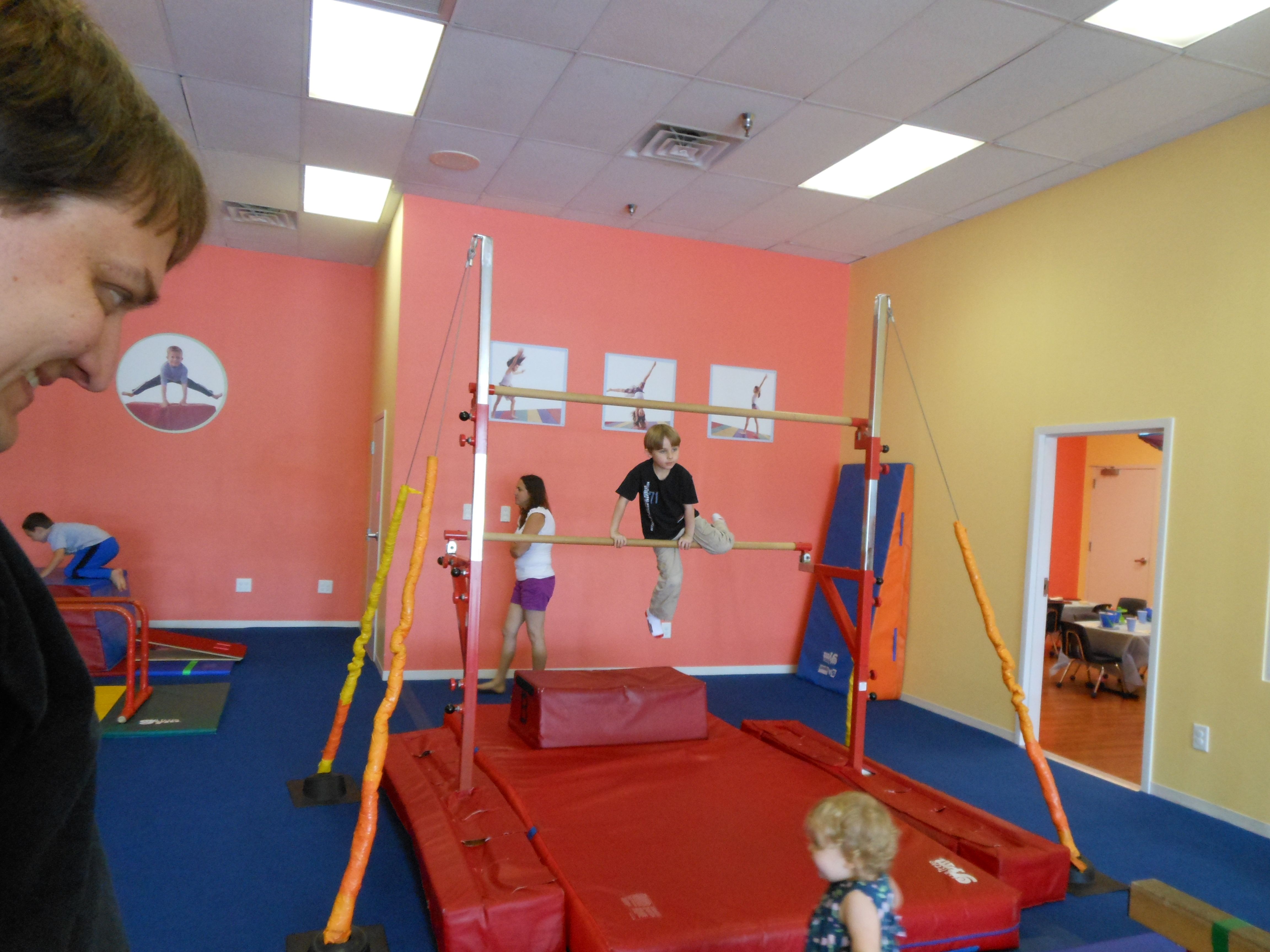 Today was pretty legendary, in terms of how busy Brian was! It started off with a trip to Lowe’s for more building fun. He built a cool Monsters University-themed trunk and decorated it with stickers. Then, home for a bit, and then Brian and Brandon went back out for skating lessons. He’s working hard and making progress! Kendall and I had a pretty laid-back morning by comparison. (I just love those “Good Morning Mommy” PJs! They always make me smile.) In the afternoon, we all headed out to Julian’s birthday party, at the Little Gym. We were glad to see that Brian wasn’t intimidated by this gymnastics party, and in fact, pretty much owned the place! (A previous party at a much larger gym was meltdown city, he wouldn’t even go inside! But then again, he was coming down with strep throat at the time, we just didn’t know it yet.) The young and energetic staff had a lot of structured activities for the kids, which helped everyone get the wiggles out. Brian loved flipping on the uneven bars, and the big inflatable trampoline was a big favorite of everyone! Kendall was too small for most of the activities, so Brandon and I just chased her around the place and kept her from getting in the way of the big kids. Later, it was time for cake and snacks, and we enjoyed all the food and the shark-themed party. The kids each got a cool shovel and pail, filled with beach-themed prizes and little plush sharks. Later, we stopped by the toy store (yes, we were brave enough to do this with two sugared-up, tired kids!) where we picked up some summer water toys (sprinklers, water rockets, water blasters, etc). Brian picked out a wild outfit for Kendall, with a bright orange top and zebra-stripe pants. The kids did some more awesome car-dancing to “Jungle Love” and we picked up some Chinese takeout on the way home. Brian asked me if I knew how to make watermelon into balls, like in Grandpa Steve’s fruit basket. I told him that yes, I knew how, and even had a tool to do it. He was so excited, he talked about it all through dinner, and we just had to make melon balls for dessert. Brian practiced with the melon baller a bit, and after we’d filled up our bowl and it got a little challenging to make more, we just mashed up the remaining watermelon inside the rind to make watermelon soup! I think Brian found this to be even more exciting than the melon balls. 🙂