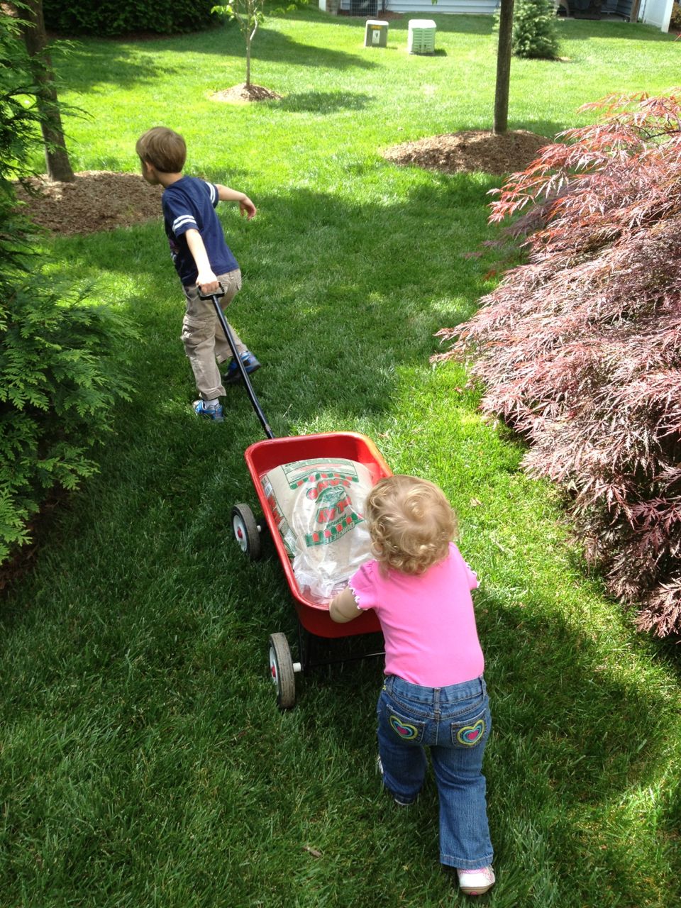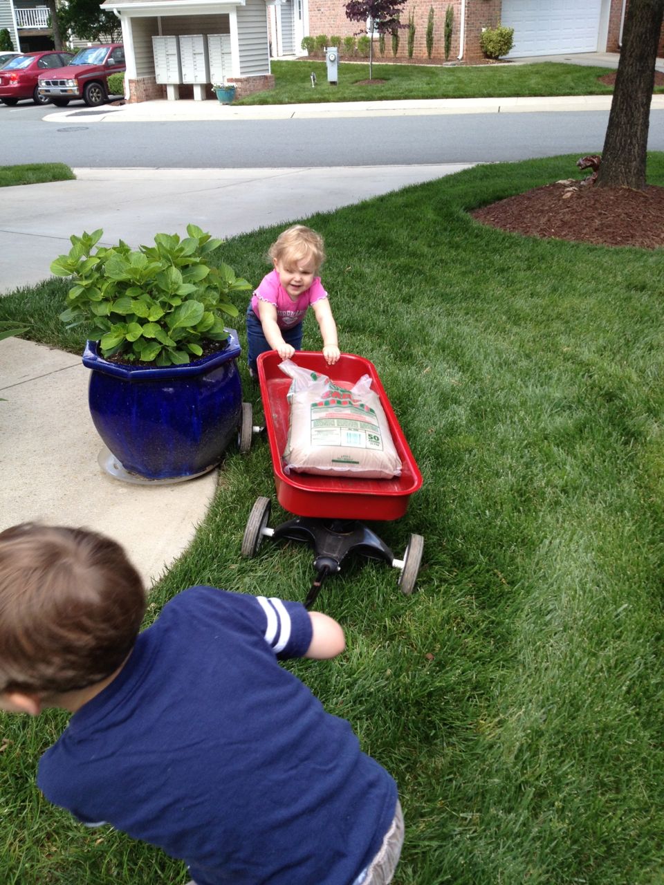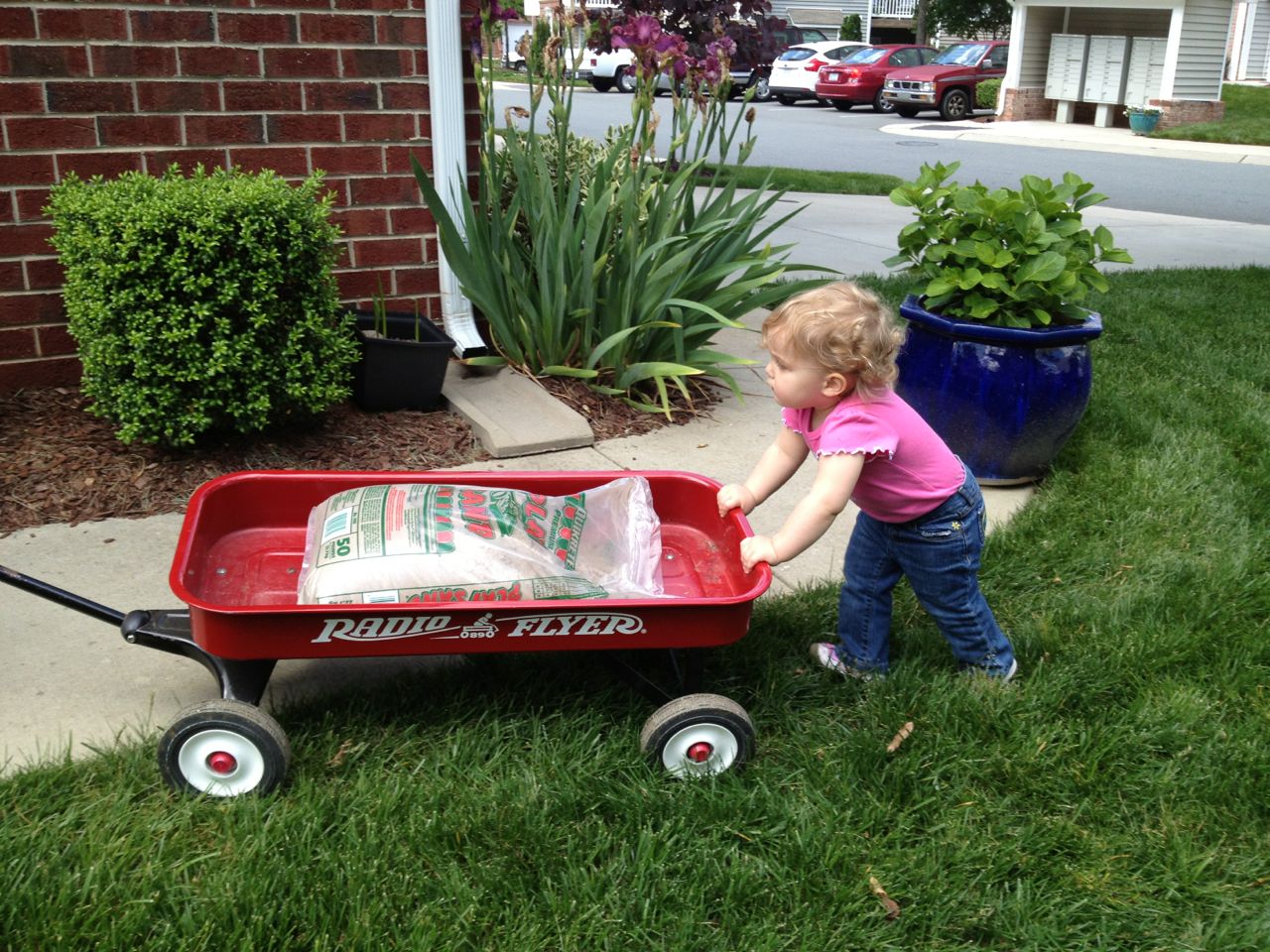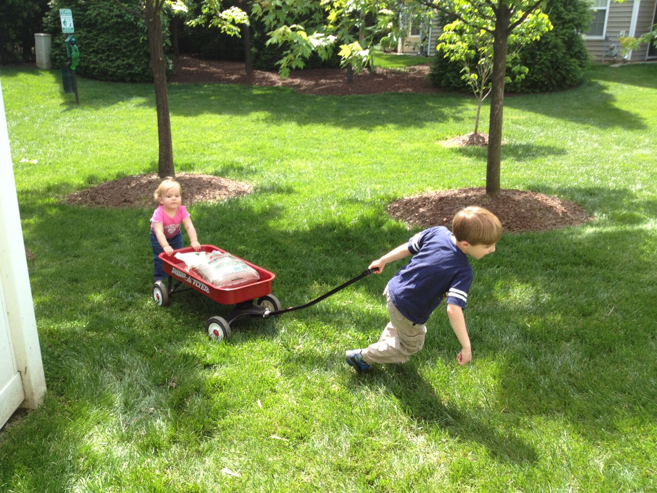 For Mother’s Day, Brandon and the kids made sure I had a lovely day! They woke me up to my first gift of blueberry pancakes and maple syrup. Brian helped get breakfast ready. Kendall was wearing her “Good Morning Mommy” PJs. Later, the kids helped Brandon refresh the sandbox by replacing all the old sand with fresh play sand. Moving all that sand was heavy, as Brian showed us to great dramatic effect! We enjoyed the new sand as well as some chalk drawing time. For dinner, we went to a nice Italian place downtown called Gravy (referring to their signature marinara, of course). We all enjoyed our food greatly, and the giant meatballs were quite a hit with the kids. When she got too wiggly, we distracted Kendall by making her into a baby babushka with the red napkins. She thought this was pretty funny, as did Brian! The waitress seemed quite taken with Brian, and kept stopping to chat with him. At one point she asked him what he thought about something, and he replied, “I think you need to go do your job.” We were all shocked (and pretty amused!) by the apparent attitude and rudeness of his comment! We had a little talk about remembering our restaurant manners, but it seemed Brian didn’t mean any harm by it. We all had a big laugh about it with the staff.