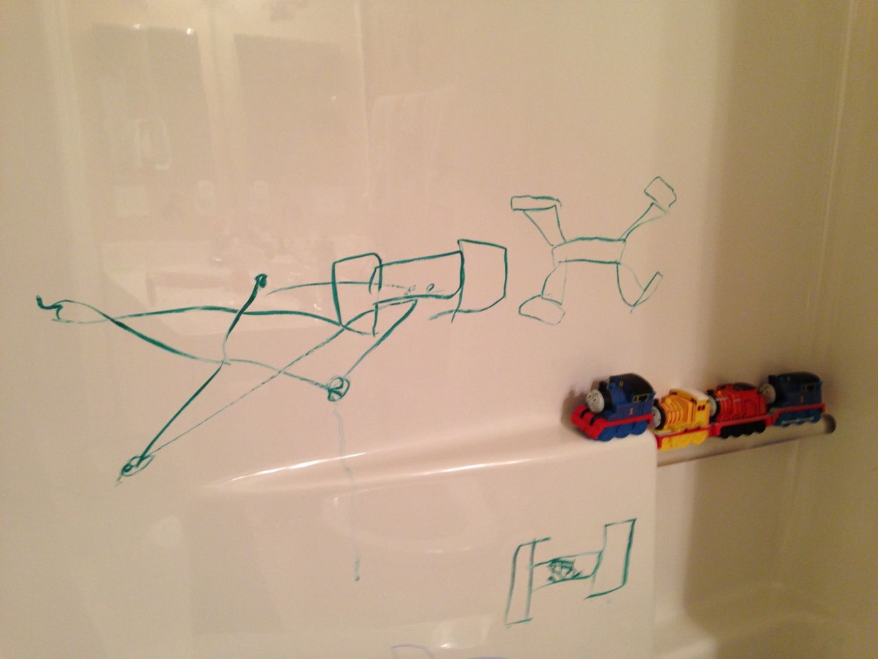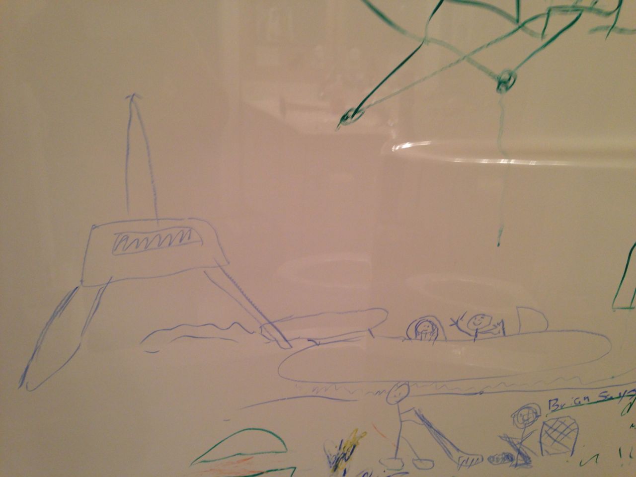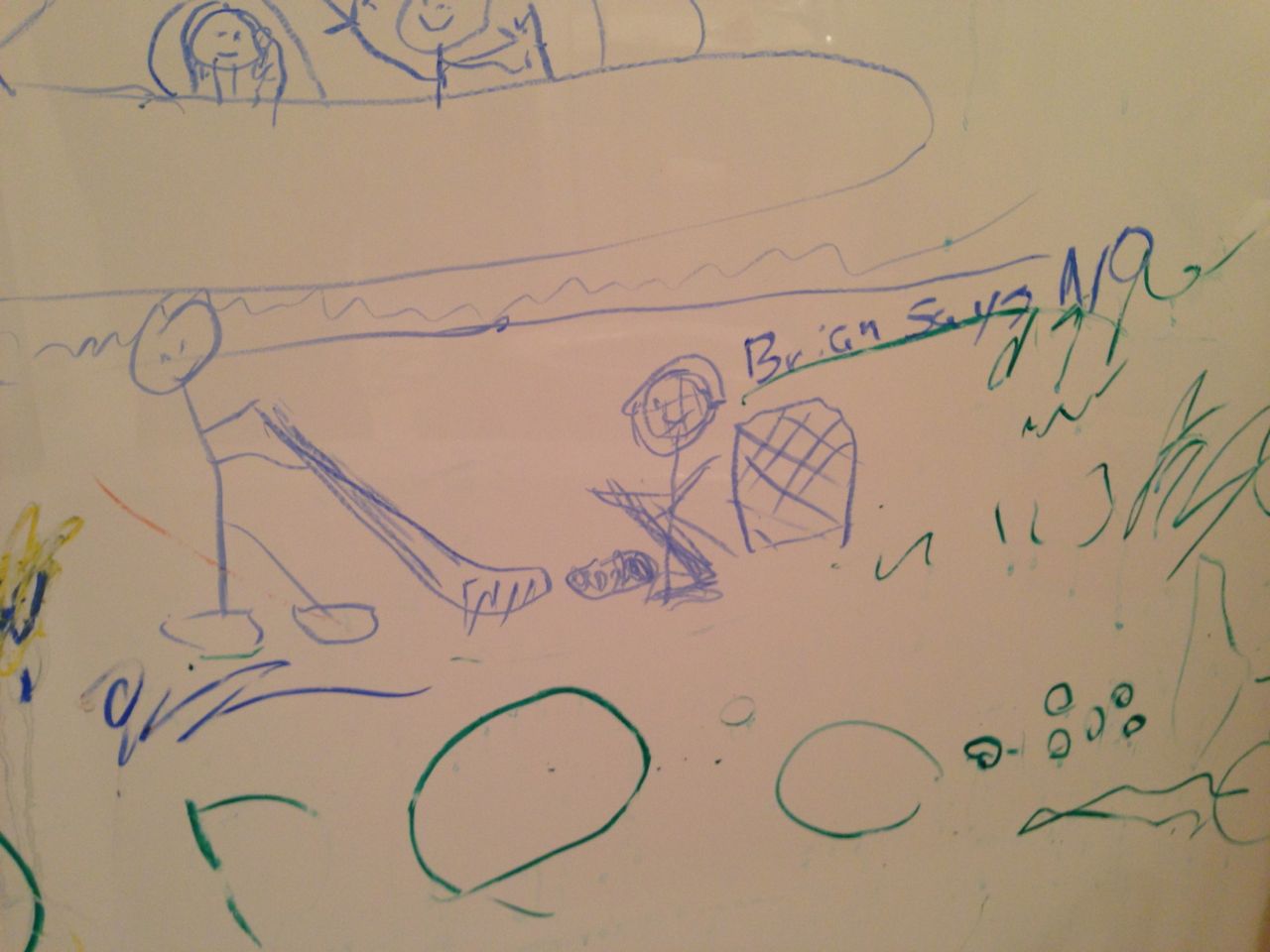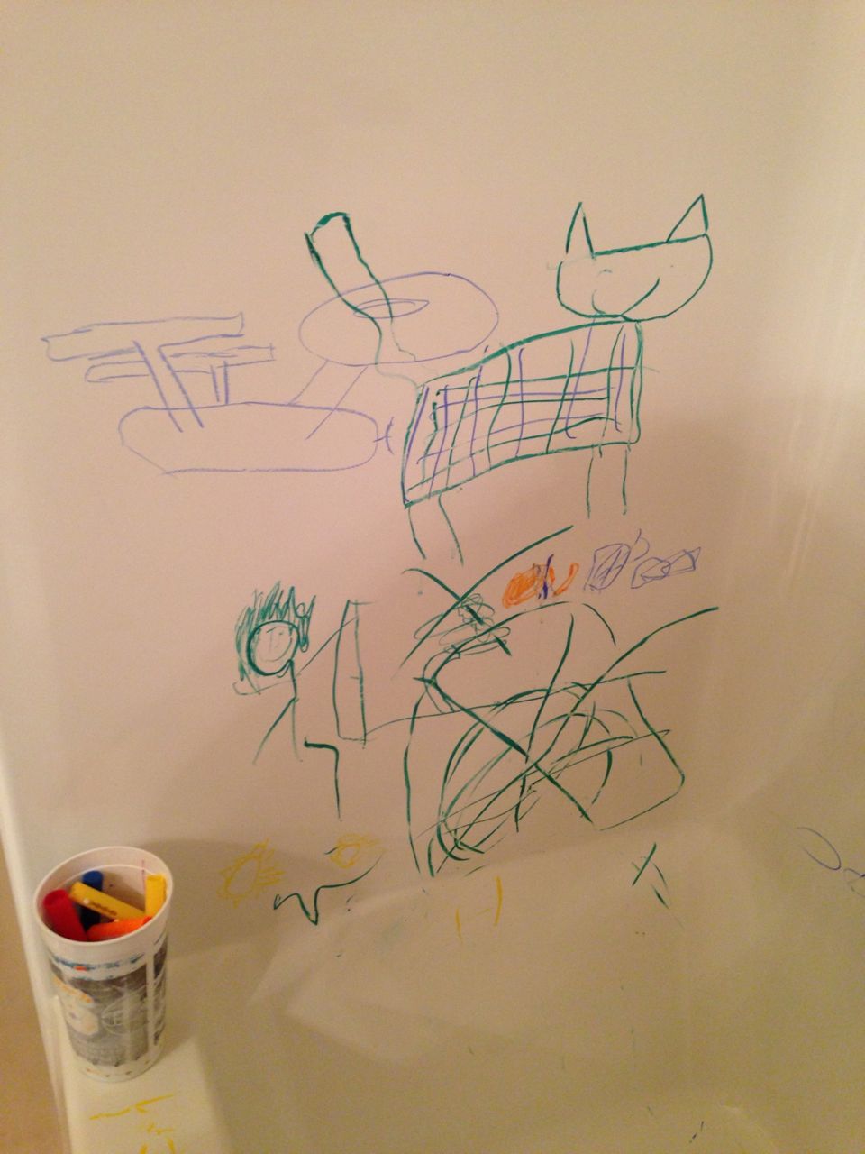Today was a relaxing Sunday at home, where we let the kids stay in their PJs late into the day and just took it easy. We made Belgian waffles with fresh strawberries and whipped cream (and have now created another little whipped cream monster–Kendall is obsessed with the stuff!) Kendall found some beads and wore them like a backpack while she played with the Star Wars toys and car garage. Brian and Brandon made some pretty spectacular tub crayon art during Brian’s bathtime tonight–I came across it later and just loved all the detail! The space ships look pretty familiar, and the hockey scene where “Brian says no!” was so cute, I couldn’t help but laugh out loud. 🙂