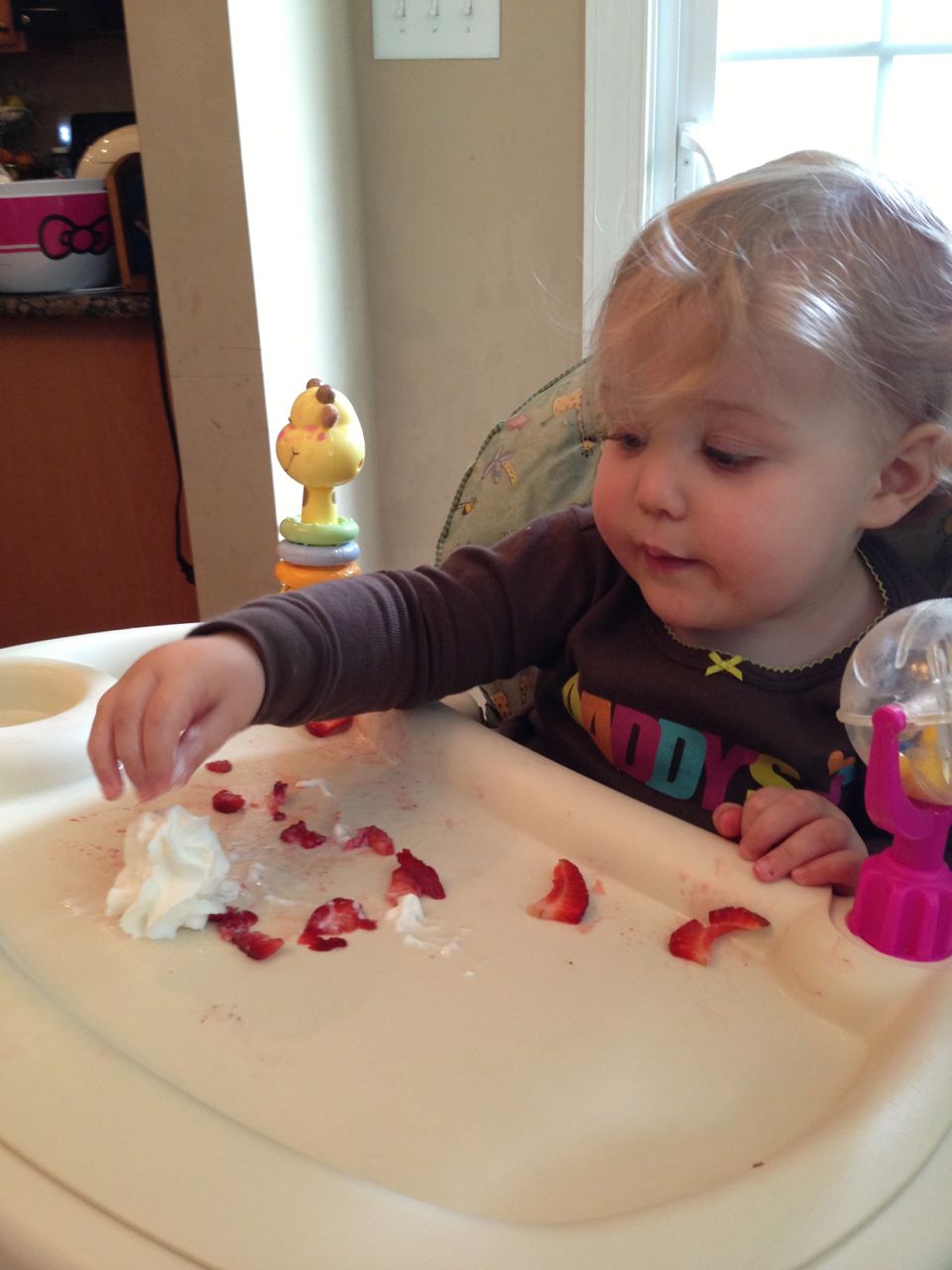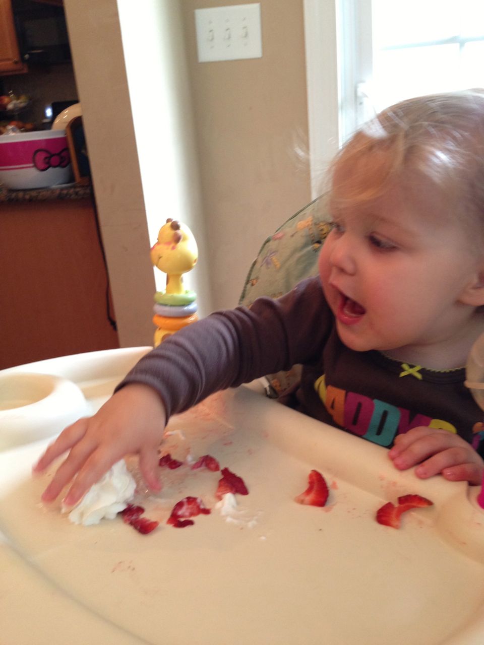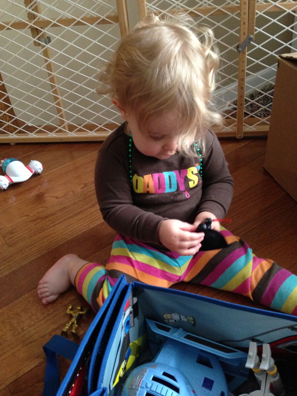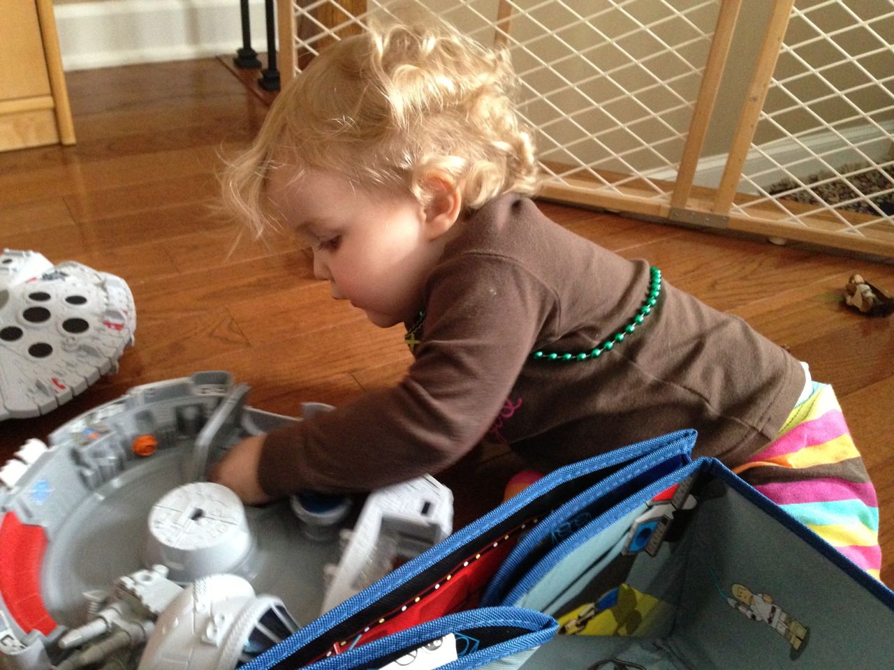 Today was a relaxing Sunday at home, where we let the kids stay in their PJs late into the day and just took it easy. We made Belgian waffles with fresh strawberries and whipped cream (and have now created another little whipped cream monster–Kendall is obsessed with the stuff!) Kendall found some beads and wore them like a backpack while she played with the Star Wars toys and car garage. Brian and Brandon made some pretty spectacular tub crayon art during Brian’s bathtime tonight–I came across it later and just loved all the detail! The space ships look pretty familiar, and the hockey scene where “Brian says no!” was so cute, I couldn’t help but laugh out loud. 🙂