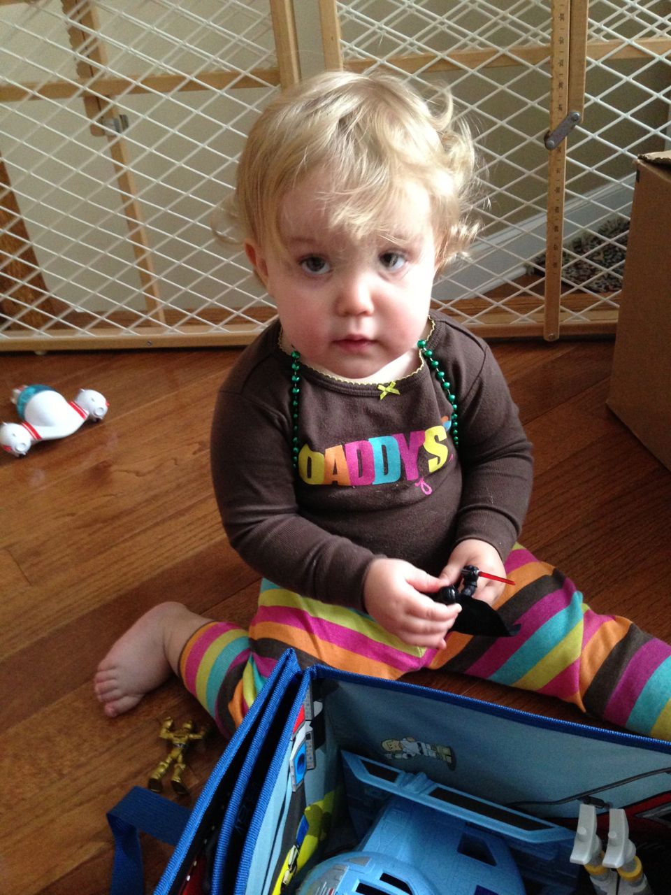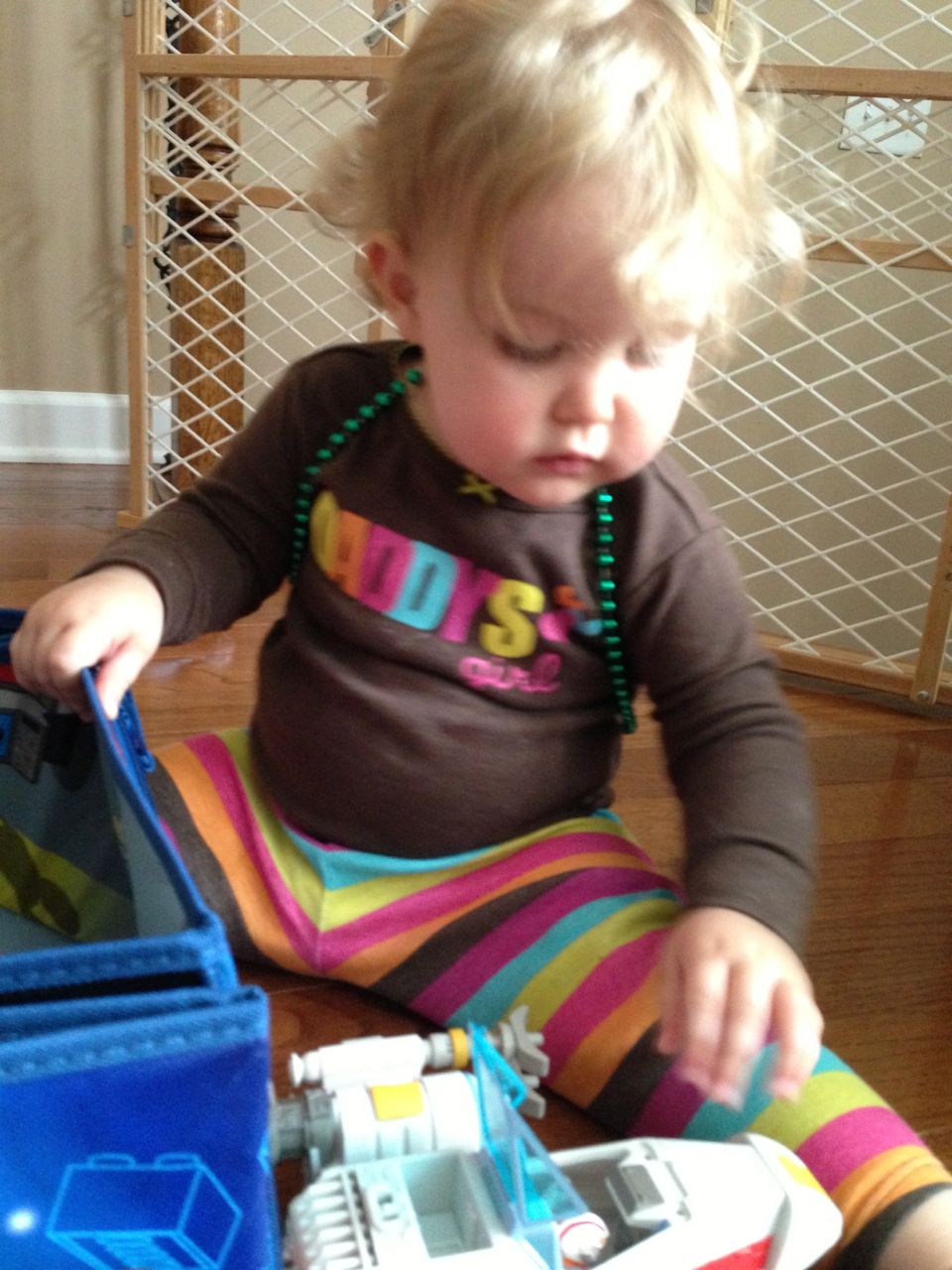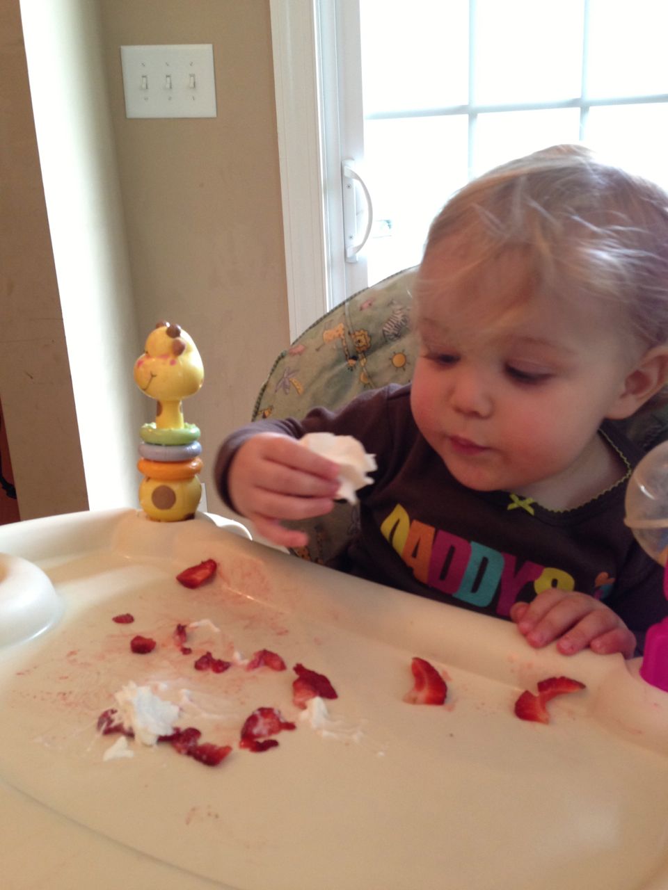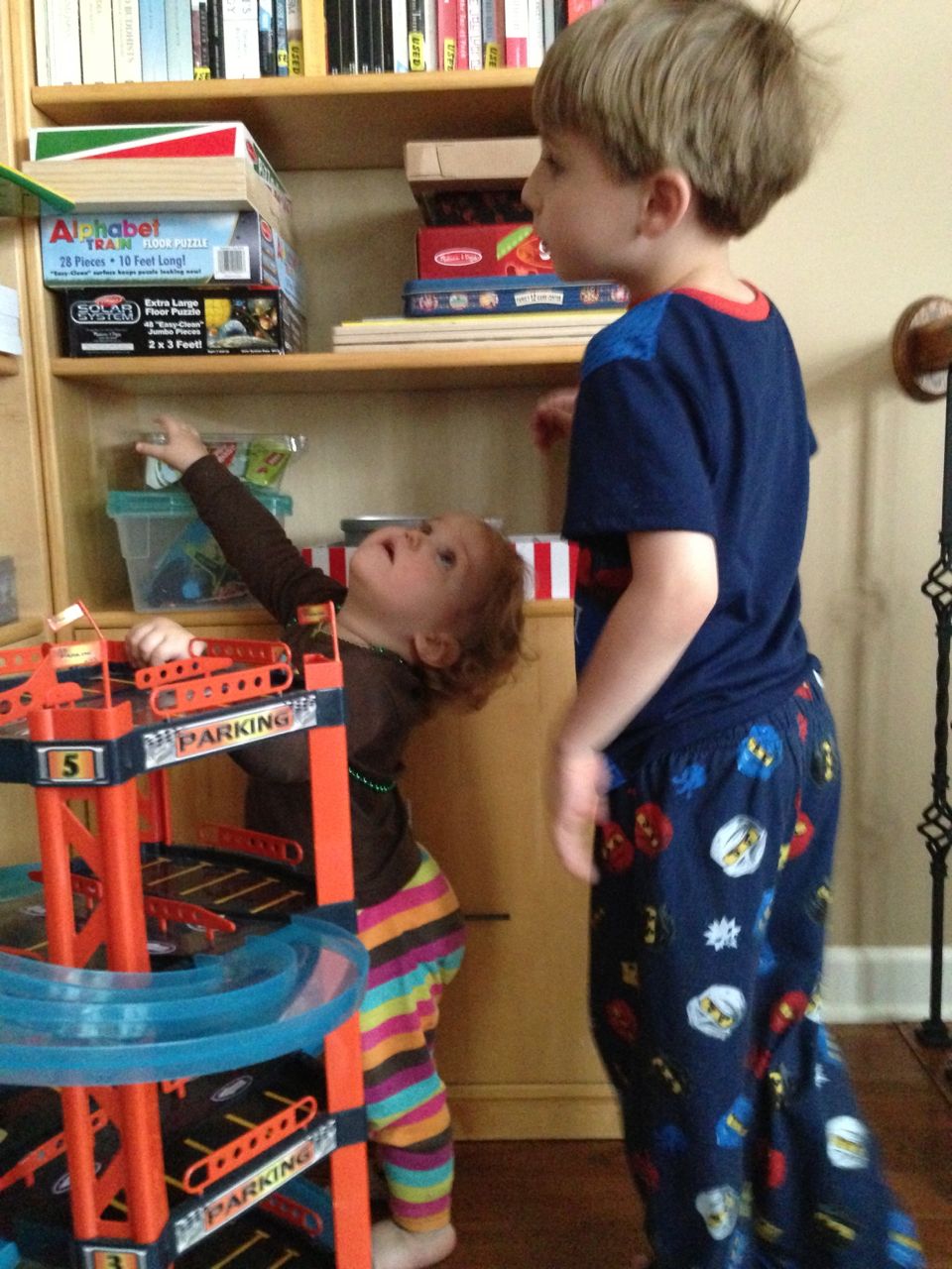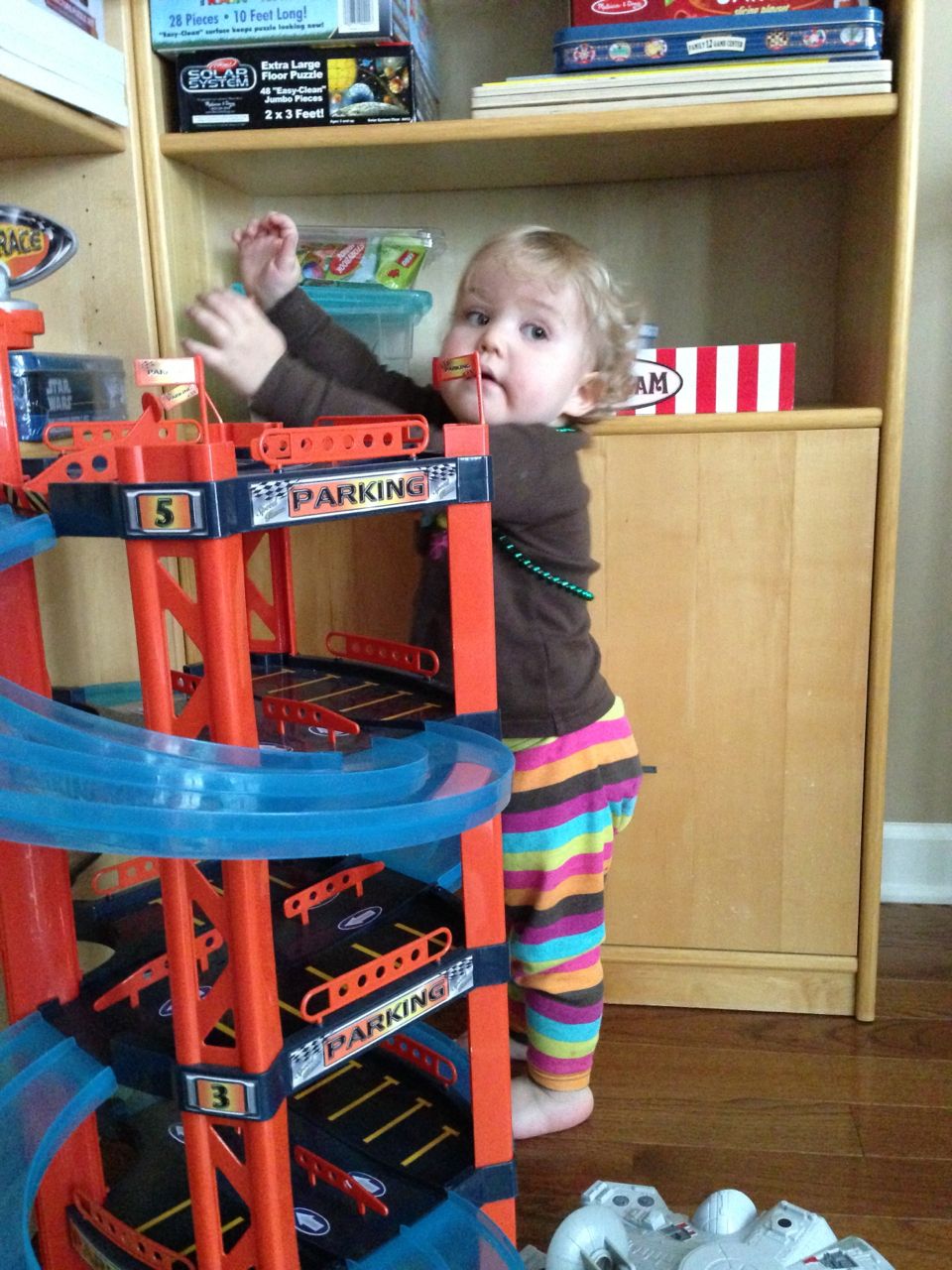 Today was a relaxing Sunday at home, where we let the kids stay in their PJs late into the day and just took it easy. We made Belgian waffles with fresh strawberries and whipped cream (and have now created another little whipped cream monster–Kendall is obsessed with the stuff!) Kendall found some beads and wore them like a backpack while she played with the Star Wars toys and car garage. Brian and Brandon made some pretty spectacular tub crayon art during Brian’s bathtime tonight–I came across it later and just loved all the detail! The space ships look pretty familiar, and the hockey scene where “Brian says no!” was so cute, I couldn’t help but laugh out loud. 🙂