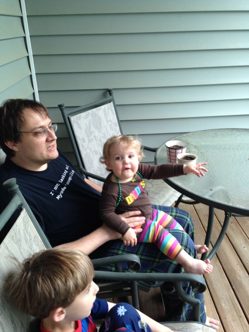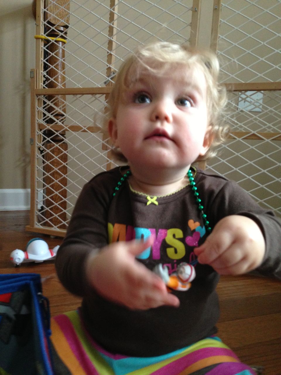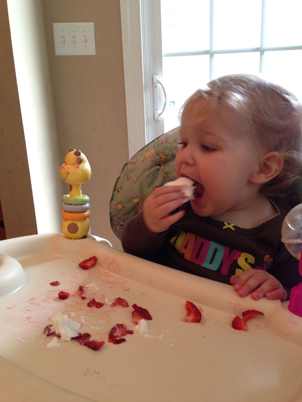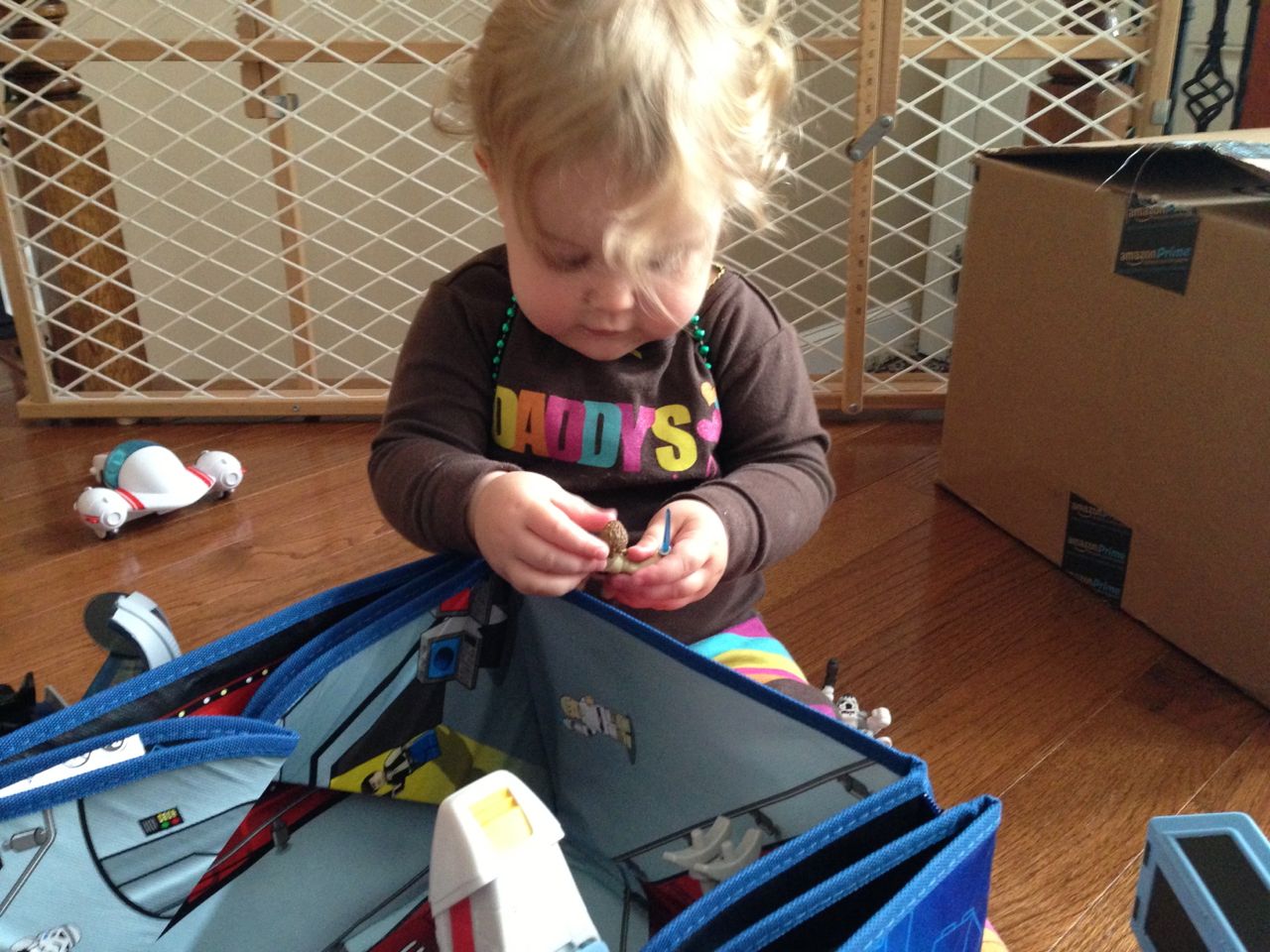 Today was a relaxing Sunday at home, where we let the kids stay in their PJs late into the day and just took it easy. We made Belgian waffles with fresh strawberries and whipped cream (and have now created another little whipped cream monster–Kendall is obsessed with the stuff!) Kendall found some beads and wore them like a backpack while she played with the Star Wars toys and car garage. Brian and Brandon made some pretty spectacular tub crayon art during Brian’s bathtime tonight–I came across it later and just loved all the detail! The space ships look pretty familiar, and the hockey scene where “Brian says no!” was so cute, I couldn’t help but laugh out loud. 🙂