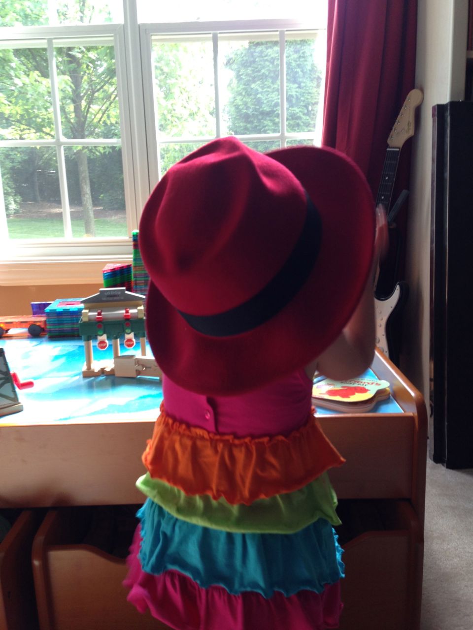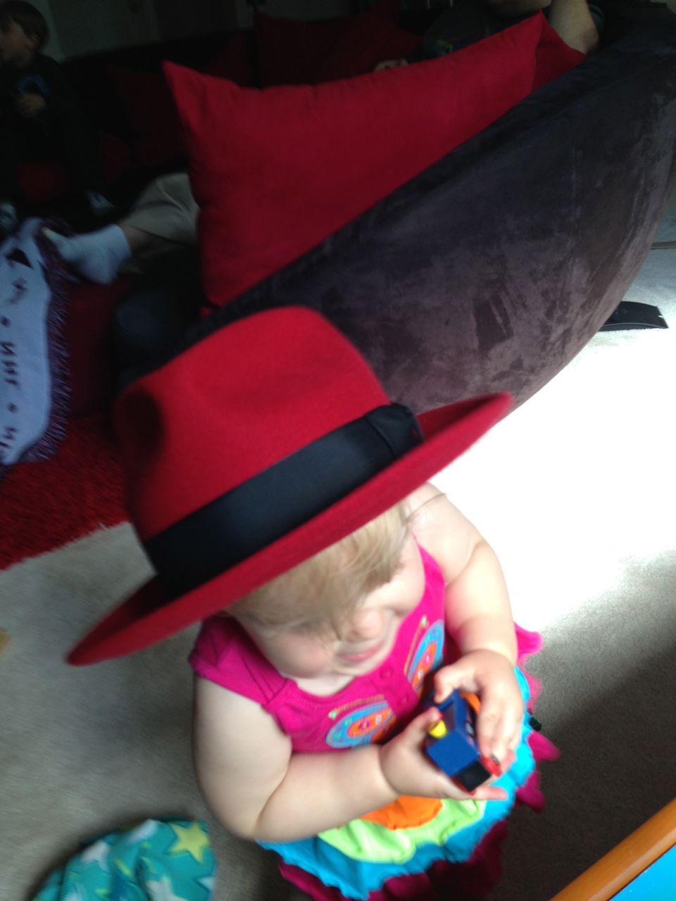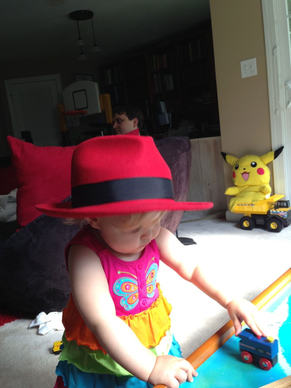 It was another skating Saturday for Brian! He’s really improving, and having fun–just check out that grin! Kendall and I relaxed at home, and she got into playing trains quite a bit! We kept playing trains after the boys got home, while they played Lego Star Wars. Kendall played with my Red Hat fedora, and I thought she looked so cute with it on! I guess the boys were worn out–they both sacked out during story time. 🙂