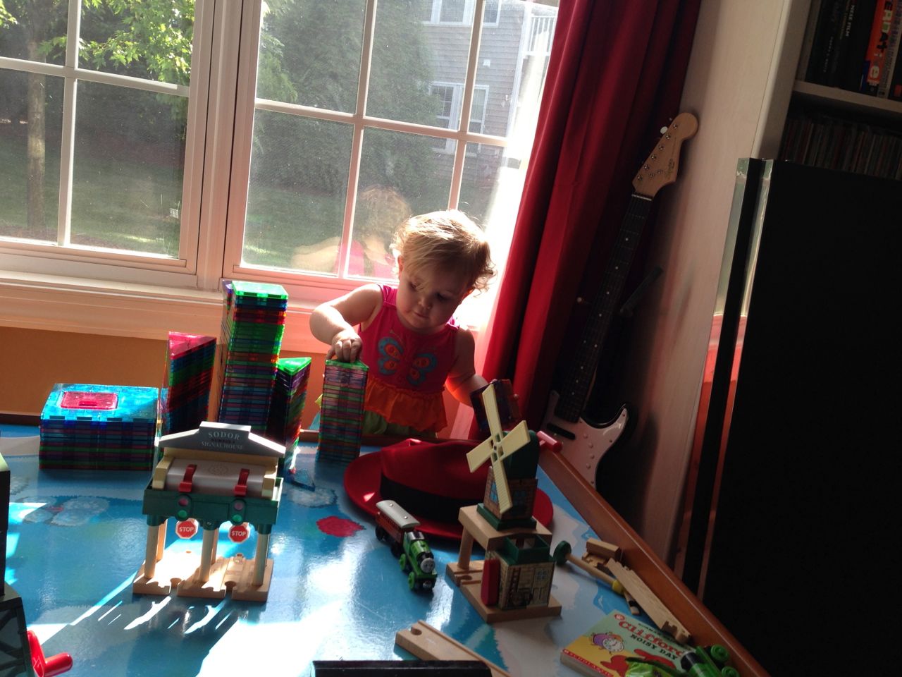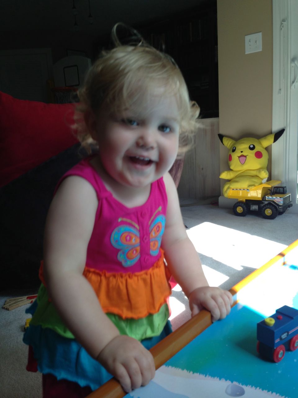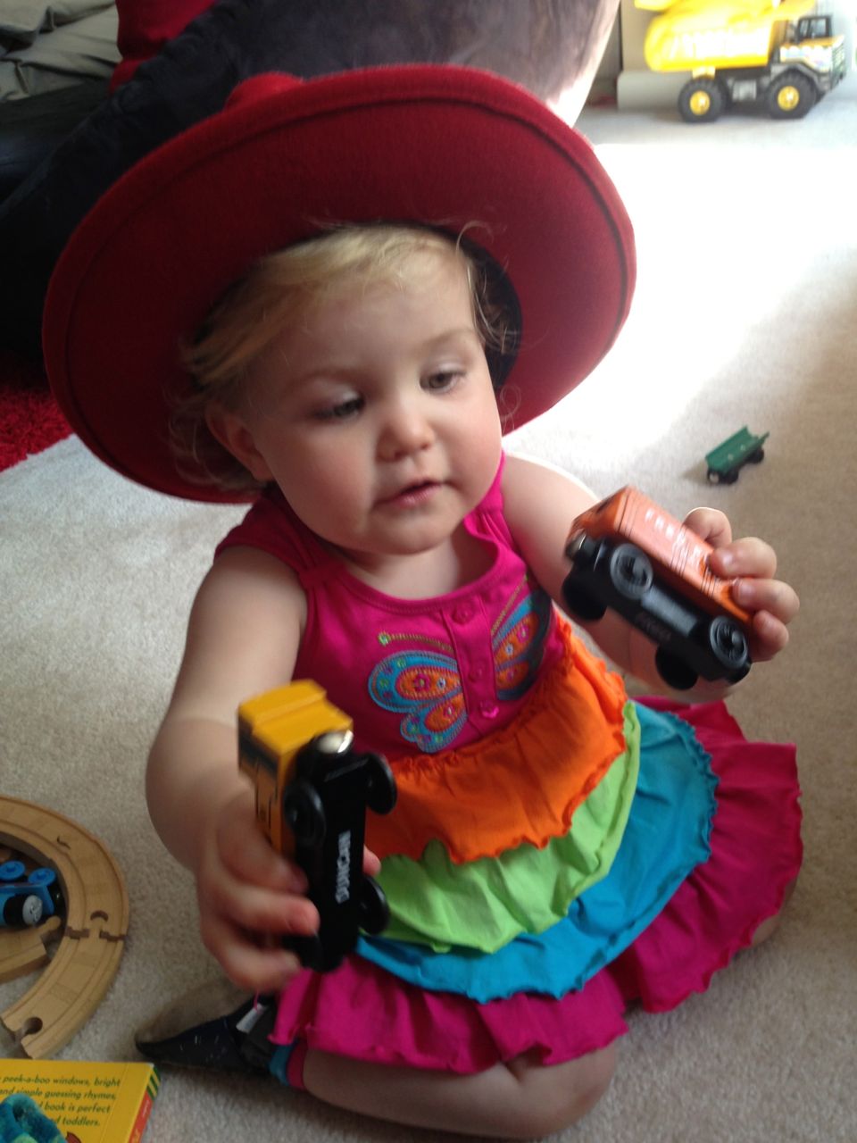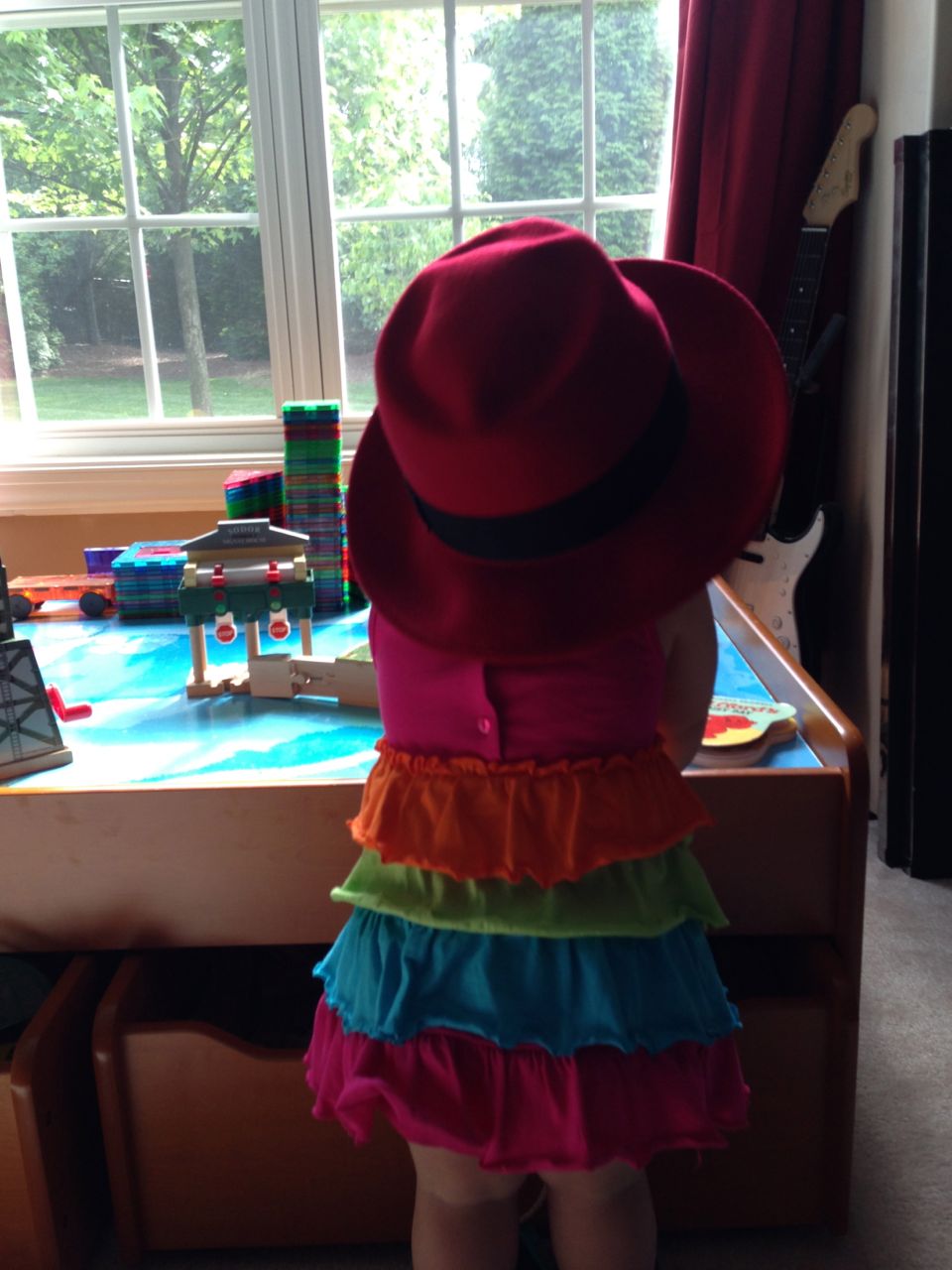 It was another skating Saturday for Brian! He’s really improving, and having fun–just check out that grin! Kendall and I relaxed at home, and she got into playing trains quite a bit! We kept playing trains after the boys got home, while they played Lego Star Wars. Kendall played with my Red Hat fedora, and I thought she looked so cute with it on! I guess the boys were worn out–they both sacked out during story time. 🙂