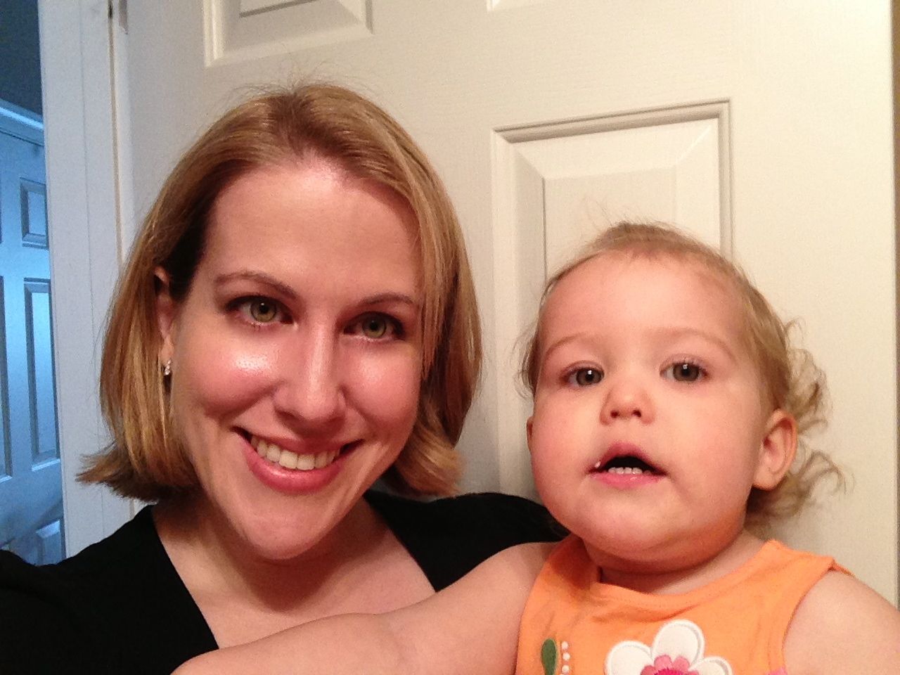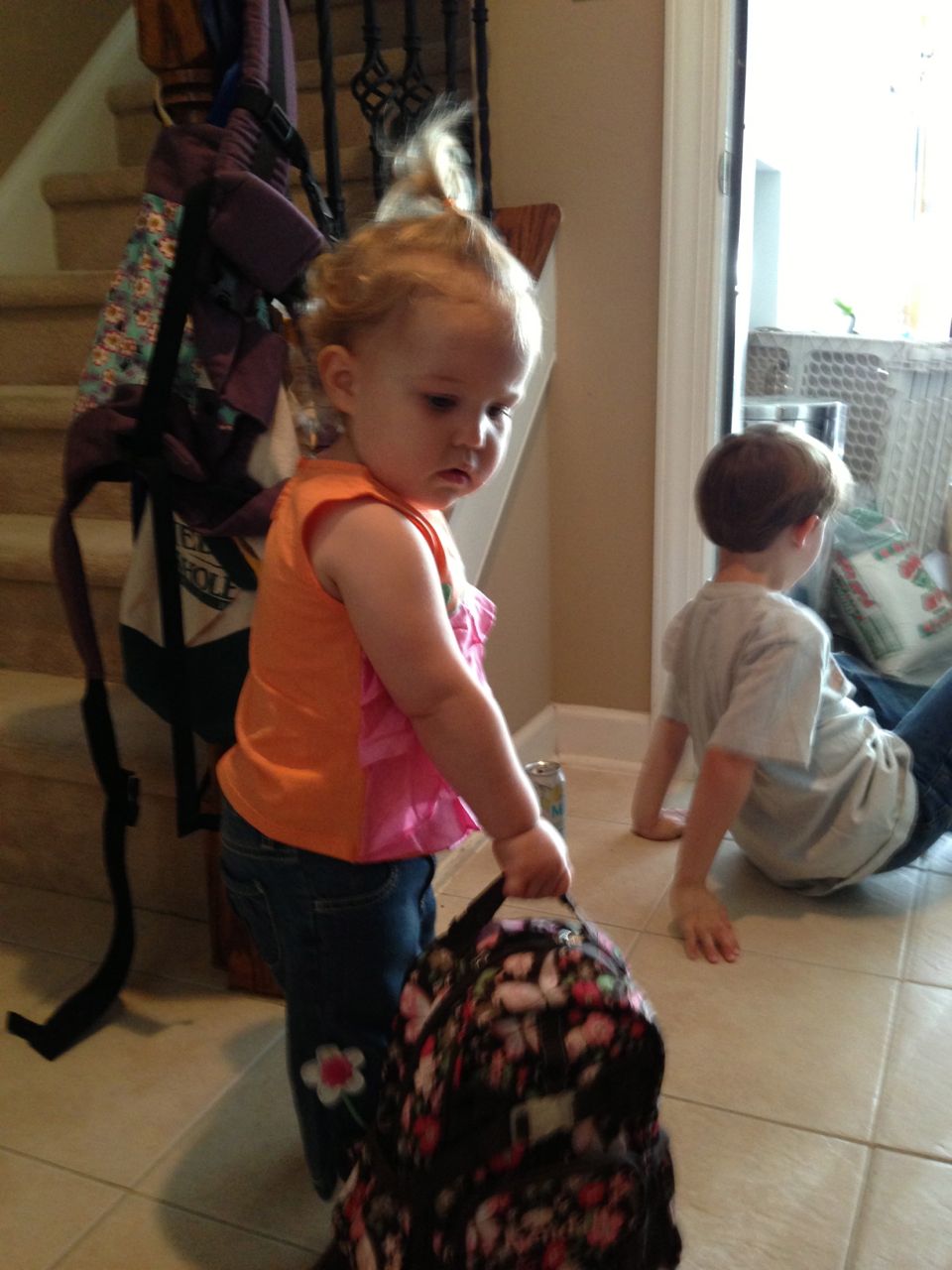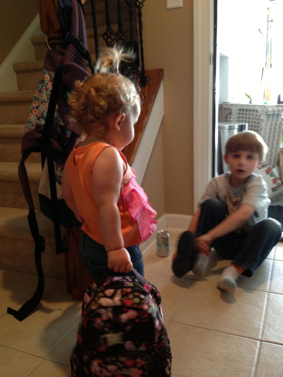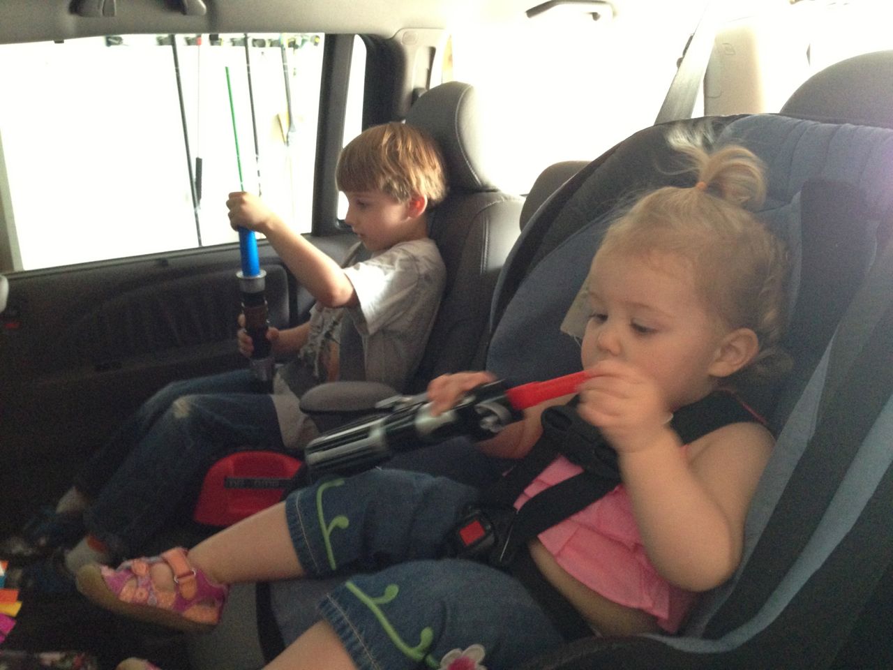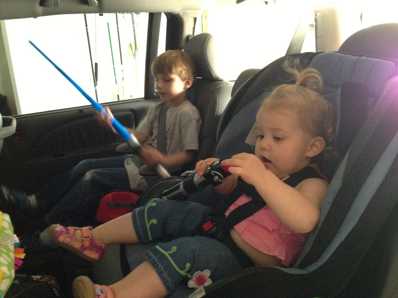 Sometimes, a lightsaber battle has to continue the next morning..  And even into the car. 😉  The kids are really happy about having two of them now!  Kendall’s hair is long enough that I need to put it up in the morning–she doesn’t always have much patience for this, though, and tends to pull out her “hairbow” almost as soon as I put it in.  One way to get her to leave it in is to immediately run into the bathroom to show her what she looks like in the mirror.  She smiles once she sees herself, and then is happy enough to leave her hair alone!  Kendall also likes to carry her own backpack these days, either holding by the handle or wearing it.  She always gets such reactions at school when she does, about how cute she is, with a backpack just her size!