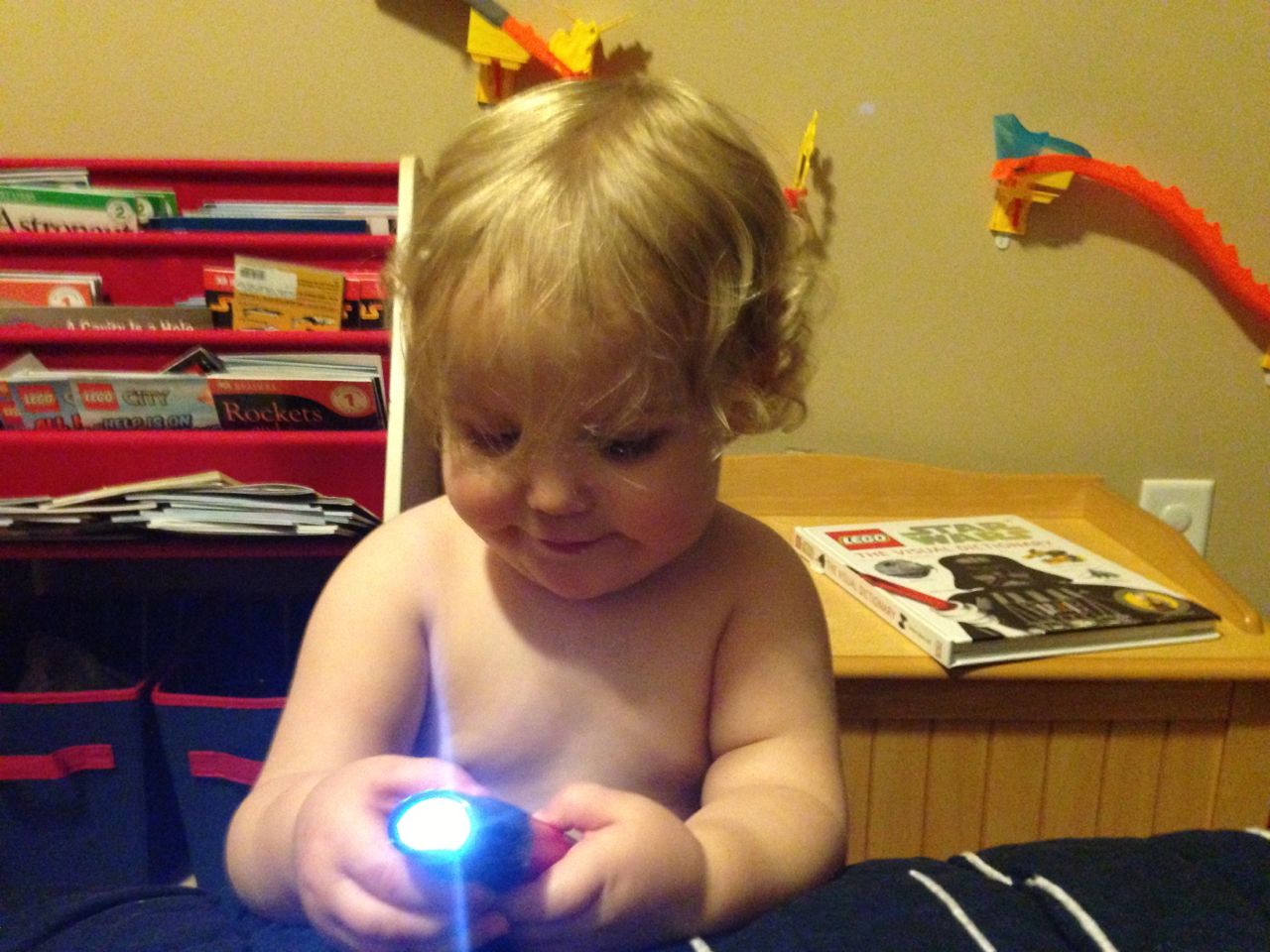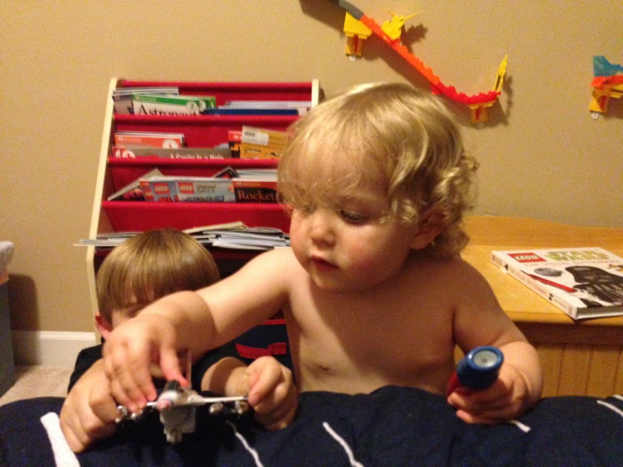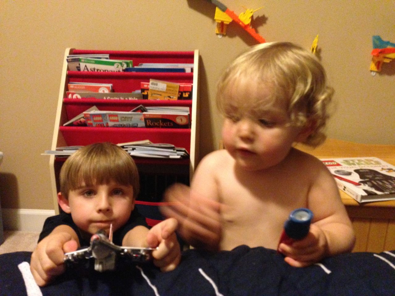 The kids did a masterful job of avoiding things they weren’t interested in today.  The “have-to”s, like getting dressed for school, and getting into the bath and ready for bed just aren’t nearly as fun as playing with toys!  This morning, Brian wanted to play with his Star Wars figures (and continue wearing his Star Wars PJs) much more than eating breakfast and getting dressed for school.  This evening, Kendall kept escaping from the bathroom before Brandon could get her into the tub.  She kept coming into Brian’s room to play with a toy flashlight.  It came with a book, “Thomas and the Shadowy Night”.  You shine the light through the cutout pictures in the popup book to make shadow shapes.  It also comes with some spooky music and sound effects that the kids love just a bit more than we do. 😉  Well, Kendall wouldn’t put the thing down!  Brian saw her playing in his room and decided he needed to play with his airplanes.  They were cute, so we indulged them for just a few minutes, before we had to ultimately regulate and get things back on schedule.  🙂