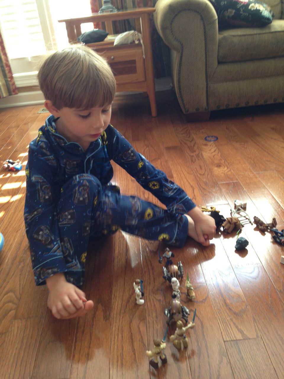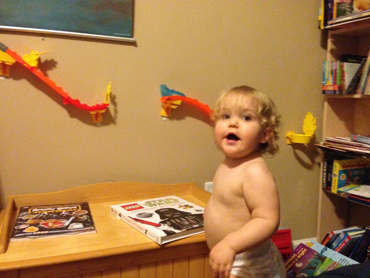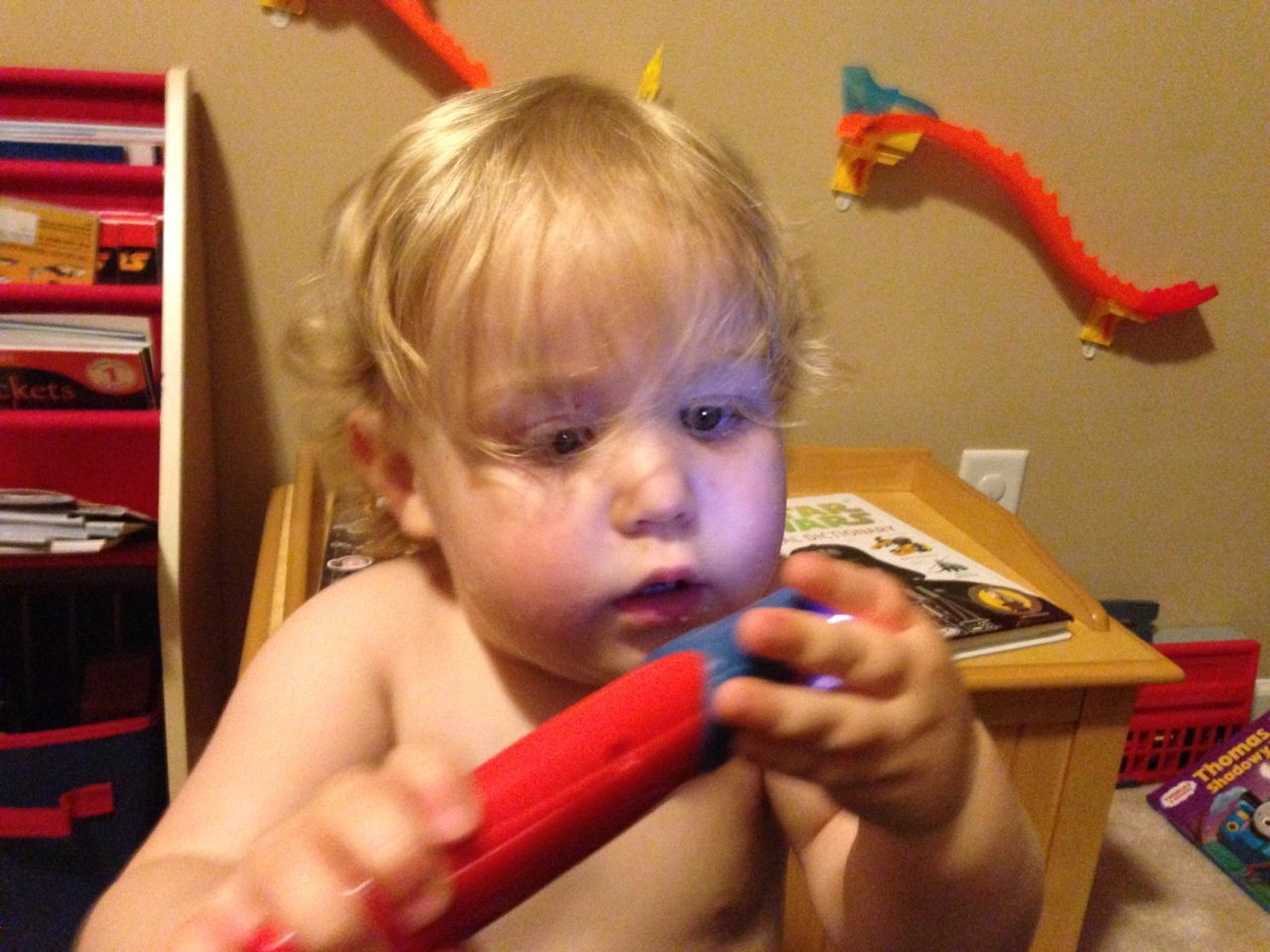 The kids did a masterful job of avoiding things they weren’t interested in today.  The “have-to”s, like getting dressed for school, and getting into the bath and ready for bed just aren’t nearly as fun as playing with toys!  This morning, Brian wanted to play with his Star Wars figures (and continue wearing his Star Wars PJs) much more than eating breakfast and getting dressed for school.  This evening, Kendall kept escaping from the bathroom before Brandon could get her into the tub.  She kept coming into Brian’s room to play with a toy flashlight.  It came with a book, “Thomas and the Shadowy Night”.  You shine the light through the cutout pictures in the popup book to make shadow shapes.  It also comes with some spooky music and sound effects that the kids love just a bit more than we do. 😉  Well, Kendall wouldn’t put the thing down!  Brian saw her playing in his room and decided he needed to play with his airplanes.  They were cute, so we indulged them for just a few minutes, before we had to ultimately regulate and get things back on schedule.  🙂