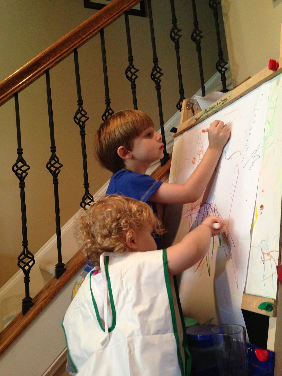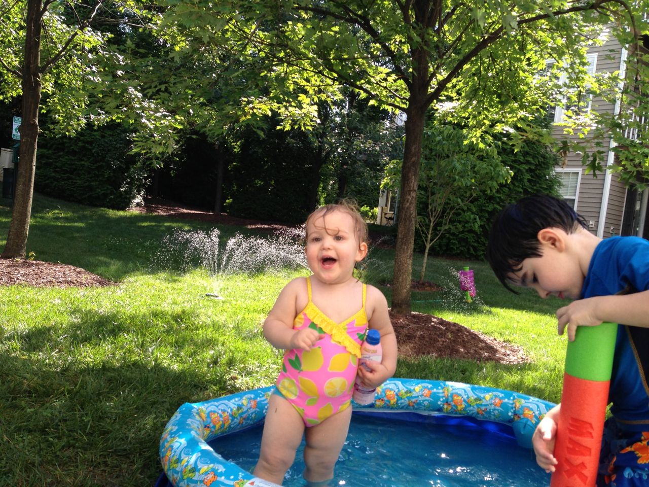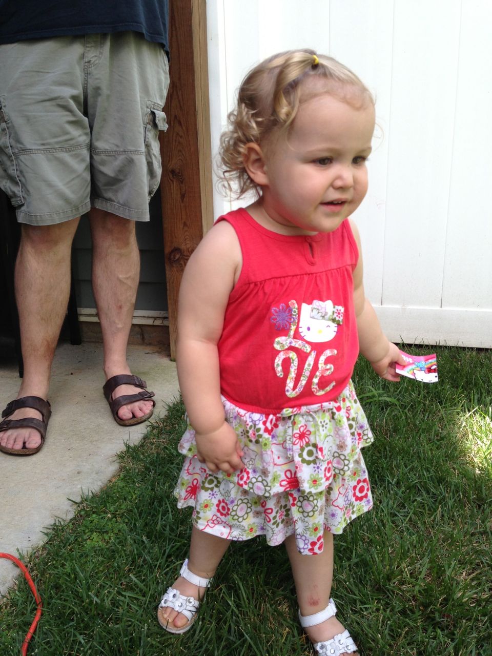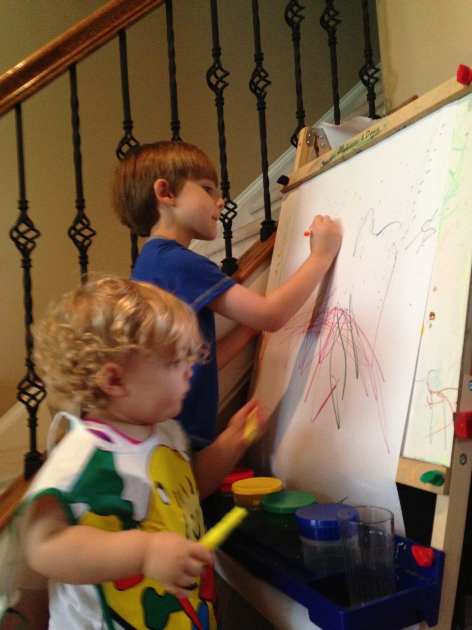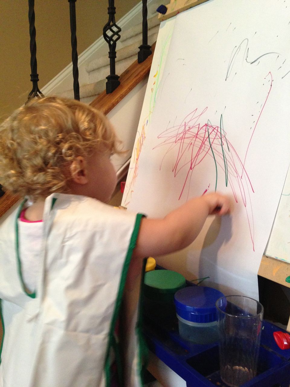 Our top-floor air conditioner’s on the fritz (that’s why you see Kendall napping on her blanket, camped out in the living room), so cooling off in the water was quite a treat! Kendall wore her new Hello Kitty dress when she wasn’t splashing, and wow, she was pretty proud of that. She even carried around the tag for awhile. Oh, and she was wearing her Hello Kitty pajamas this morning.. Have we mentioned how much she likes Hello Kitty? 😉 Brian needed to see some Star Wars over breakfast, and as usual, Kendall just loves the opening theme. As soon as the main title music starts, her arms are straight up in the air, and she’s laughing and squealing with delight! Kendall is another budding artist, currently all about the markers. We have to watch her closely, since she tends to put things in her mouth still, but she loves to make marks on the easel! She actually likes to wear a smock, too–she’ll bring it to us when she wants to draw. The kids are able to share and work on the easel together–that’s really fun to see. 🙂
