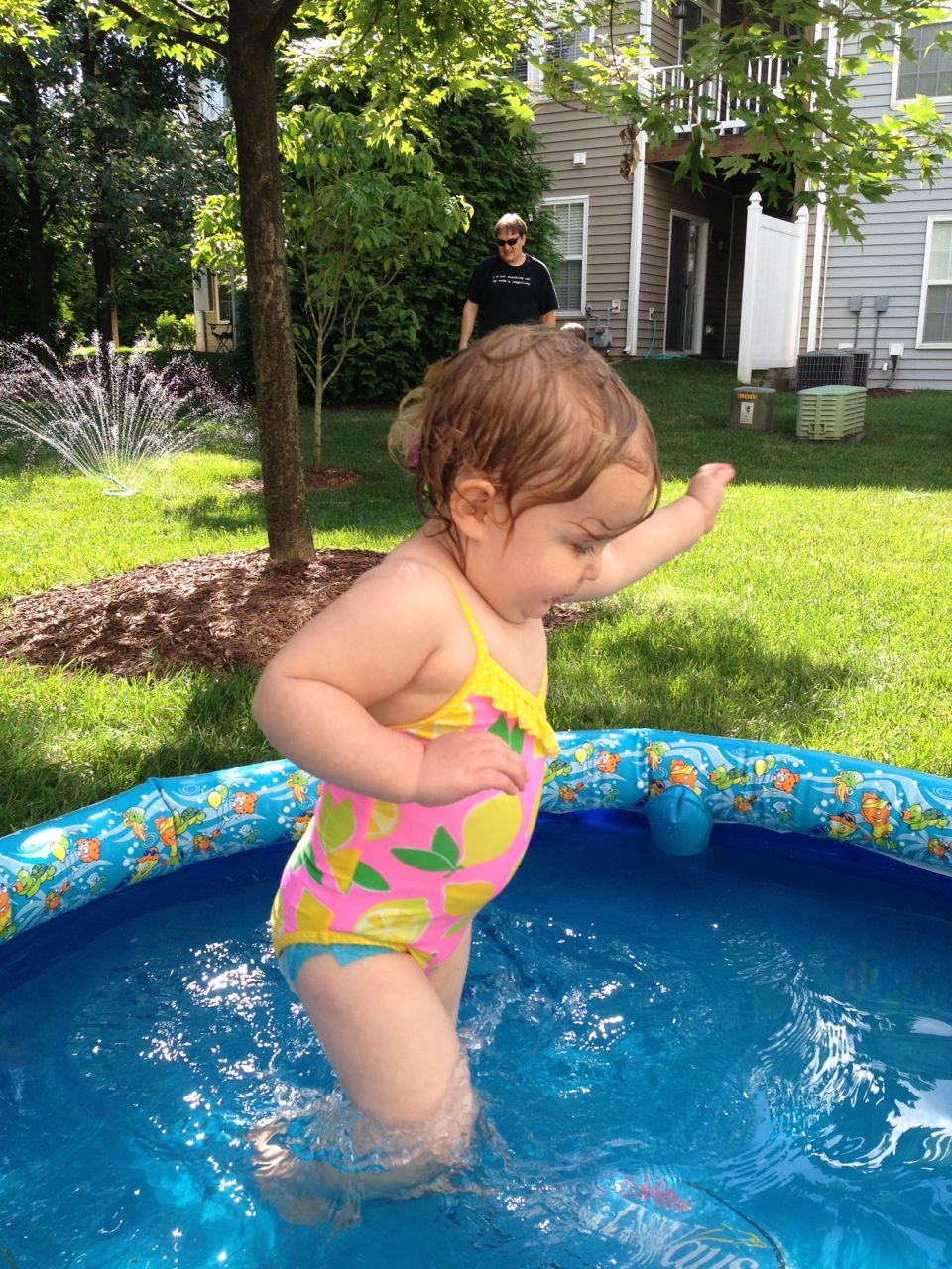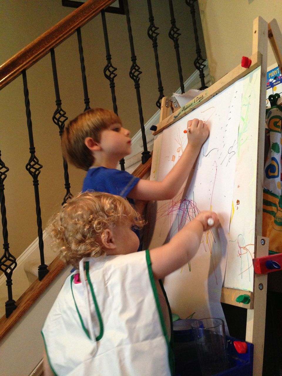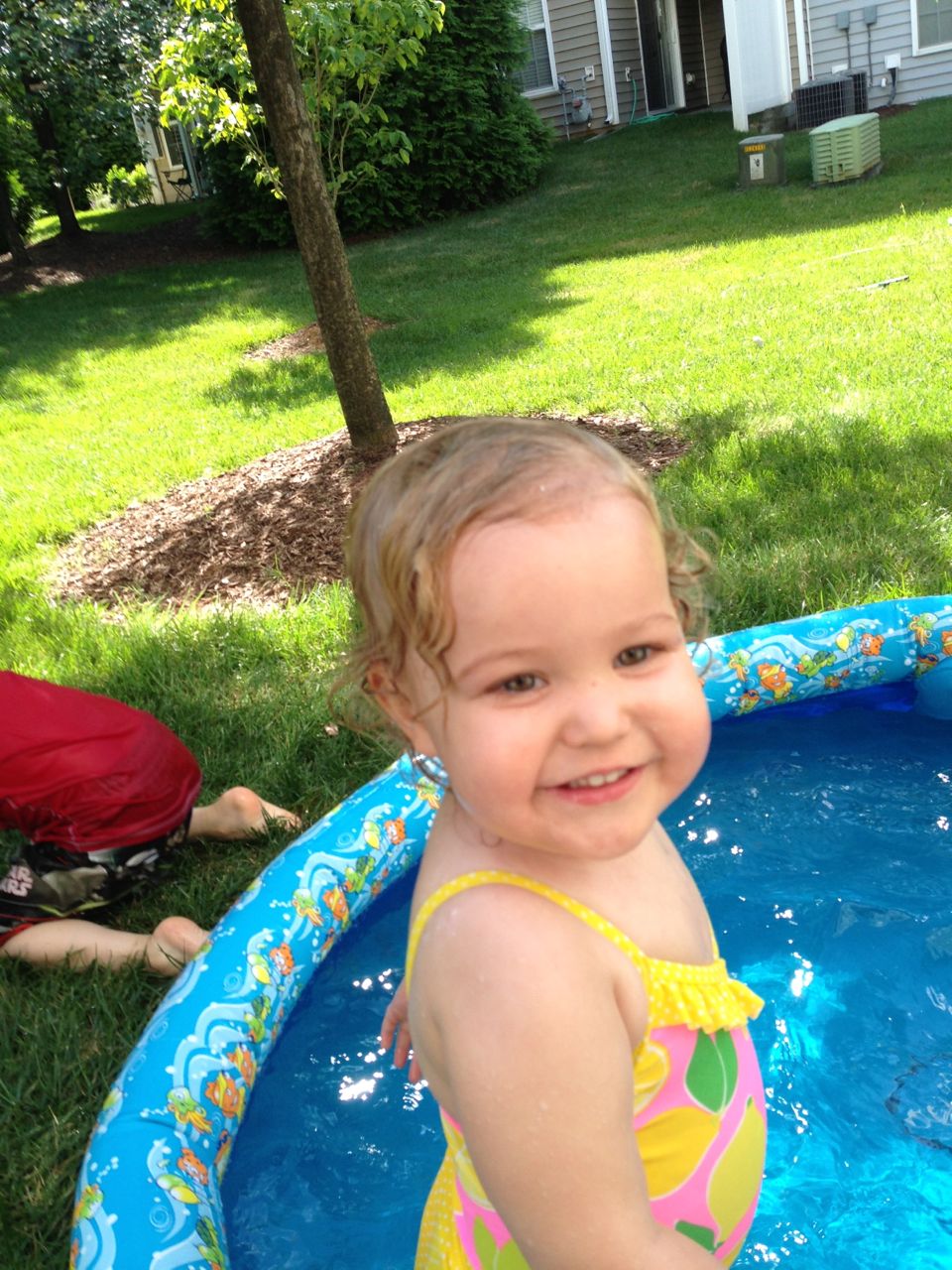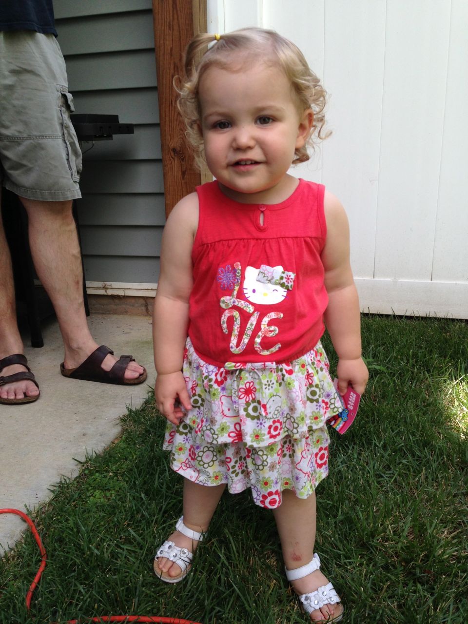 Our top-floor air conditioner’s on the fritz (that’s why you see Kendall napping on her blanket, camped out in the living room), so cooling off in the water was quite a treat! Kendall wore her new Hello Kitty dress when she wasn’t splashing, and wow, she was pretty proud of that. She even carried around the tag for awhile. Oh, and she was wearing her Hello Kitty pajamas this morning.. Have we mentioned how much she likes Hello Kitty? 😉 Brian needed to see some Star Wars over breakfast, and as usual, Kendall just loves the opening theme. As soon as the main title music starts, her arms are straight up in the air, and she’s laughing and squealing with delight! Kendall is another budding artist, currently all about the markers. We have to watch her closely, since she tends to put things in her mouth still, but she loves to make marks on the easel! She actually likes to wear a smock, too–she’ll bring it to us when she wants to draw. The kids are able to share and work on the easel together–that’s really fun to see. 🙂