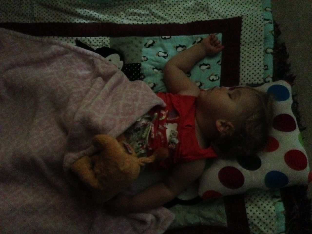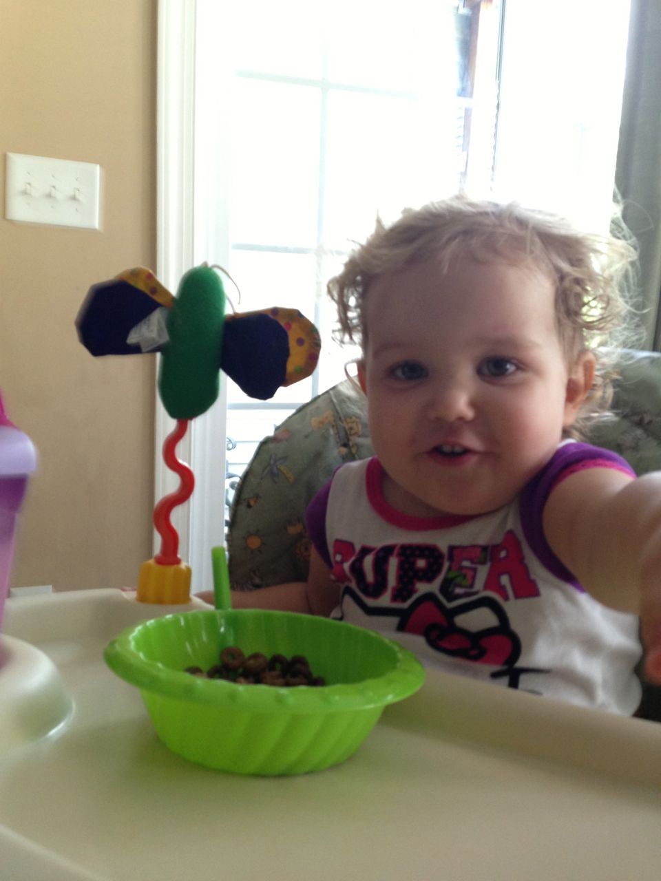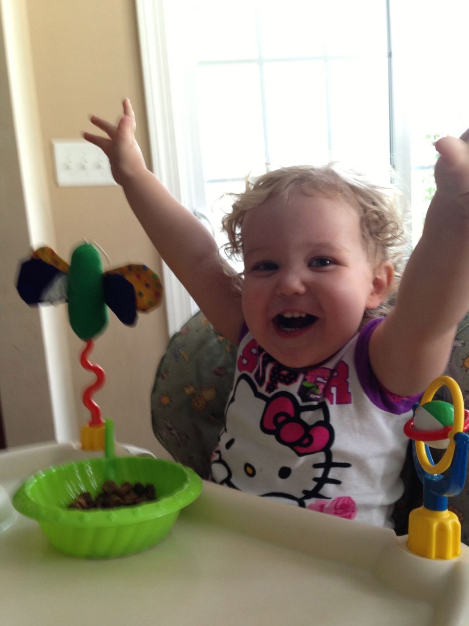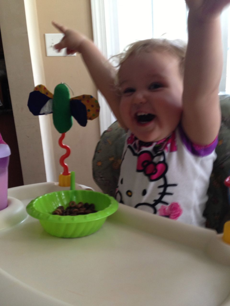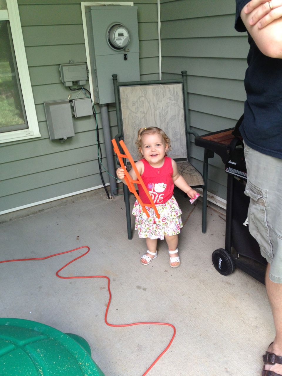 Our top-floor air conditioner’s on the fritz (that’s why you see Kendall napping on her blanket, camped out in the living room), so cooling off in the water was quite a treat! Kendall wore her new Hello Kitty dress when she wasn’t splashing, and wow, she was pretty proud of that. She even carried around the tag for awhile. Oh, and she was wearing her Hello Kitty pajamas this morning.. Have we mentioned how much she likes Hello Kitty? 😉 Brian needed to see some Star Wars over breakfast, and as usual, Kendall just loves the opening theme. As soon as the main title music starts, her arms are straight up in the air, and she’s laughing and squealing with delight! Kendall is another budding artist, currently all about the markers. We have to watch her closely, since she tends to put things in her mouth still, but she loves to make marks on the easel! She actually likes to wear a smock, too–she’ll bring it to us when she wants to draw. The kids are able to share and work on the easel together–that’s really fun to see. 🙂