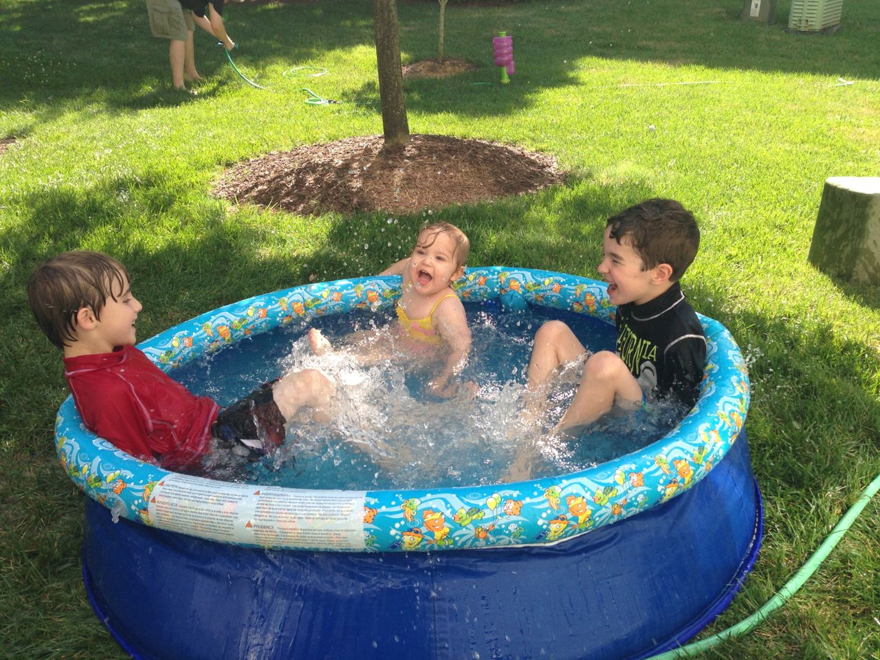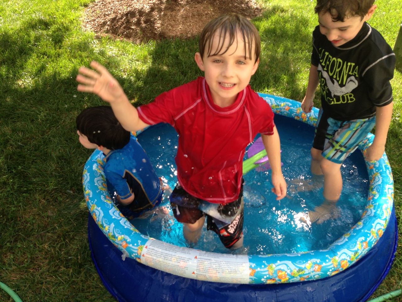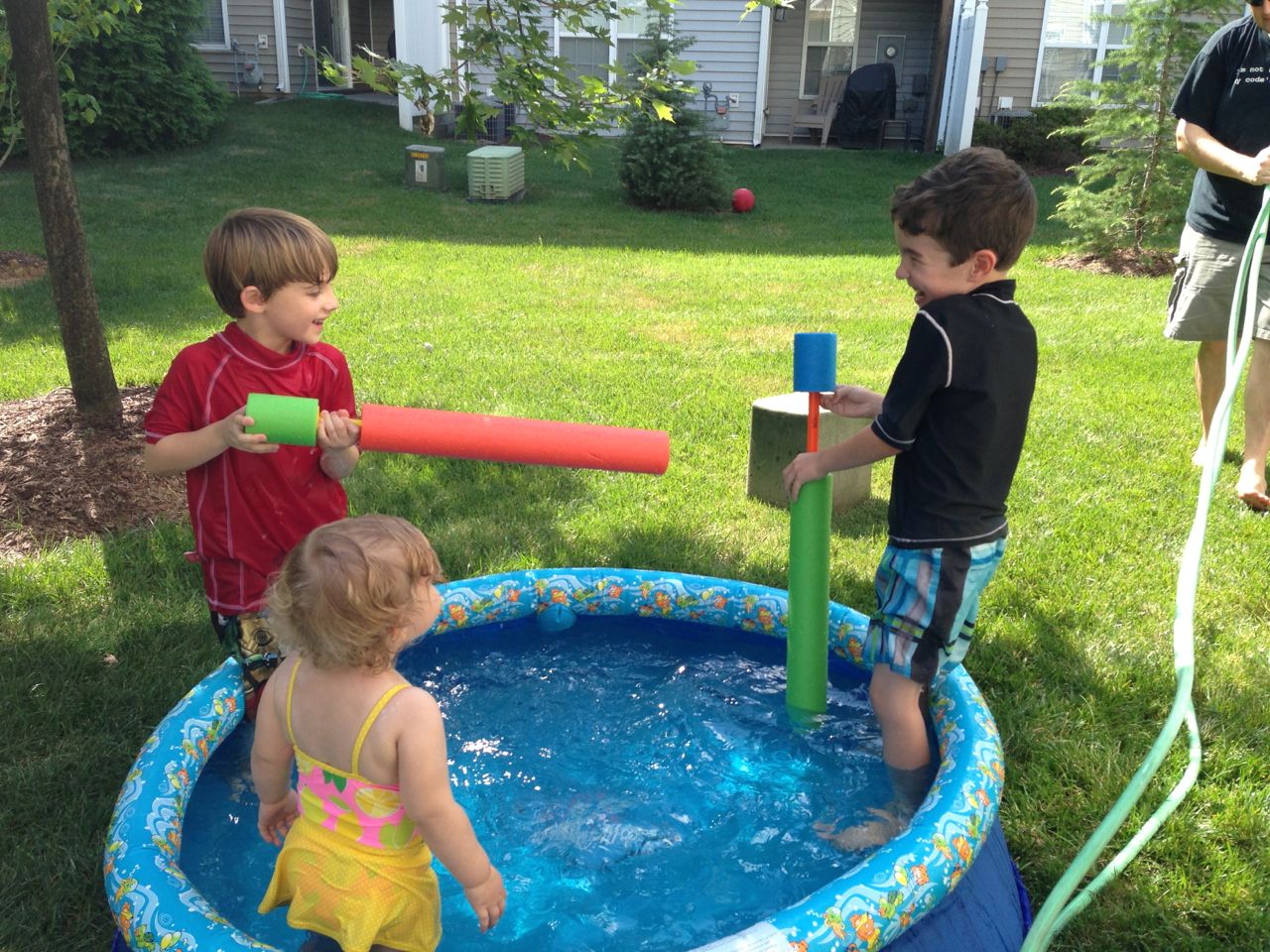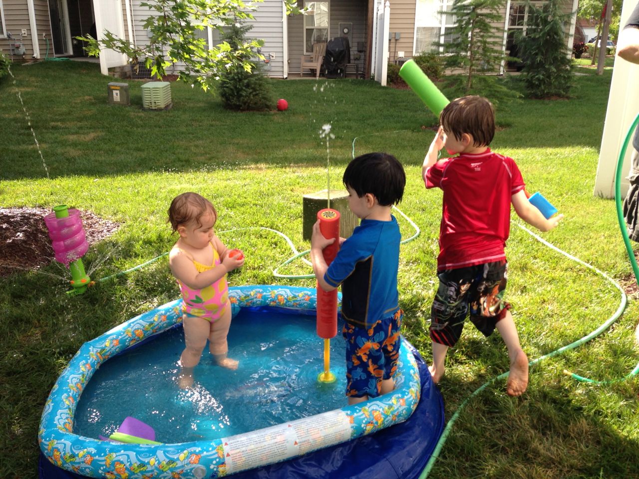 Today we invited the Orazis over for a backyard pool party and cookout! The weather was great, and between the splash pool and a pile squirt toys, the kids had a blast! Brandon set up all sorts of sprinklers to go along as well. He and Brian had a bit of fun at Lowes getting short lengths of hose, splitters, and sprinklers of all kinds. 😉 The boys were just as rough-and-tumble as you’d expect, but they seemed to look out for Kendall a bit. She didn’t need much looking out for, though, since she tried her hardest to hang right with them and do everything they did! The kids dried off and played inside while the dads manned the grill, and after dinner, we had red-white-and-blue Jell-O dessert! This was a bit of a flop, actually.. We had tried using our new Star Wars mega-molds, but the gelatin didn’t hold its shape at all, and half of it stuck inside the mold. We were looking forward to a Berry Blue R2-D2 and a red Han Solo frozen in Cherry with Fruit Cocktail, but perhaps the added fruit watered down the gelatin too much. We’ll work on refining our technique. 😉 But, even if the shapes didn’t work out, the kids enjoyed making parfaits out of it, with whipped topping!