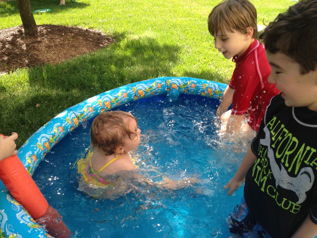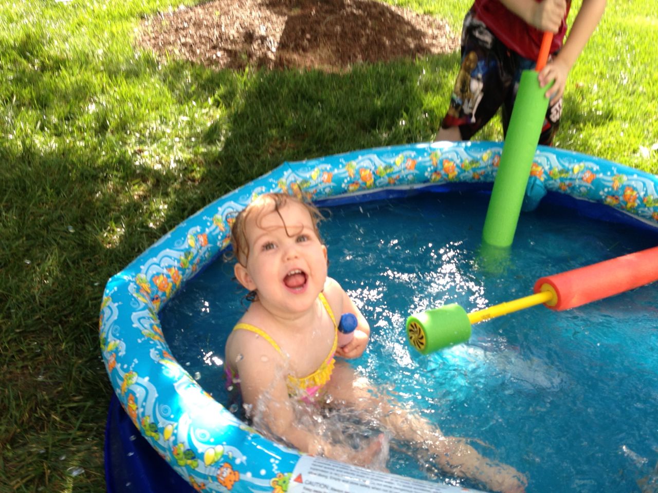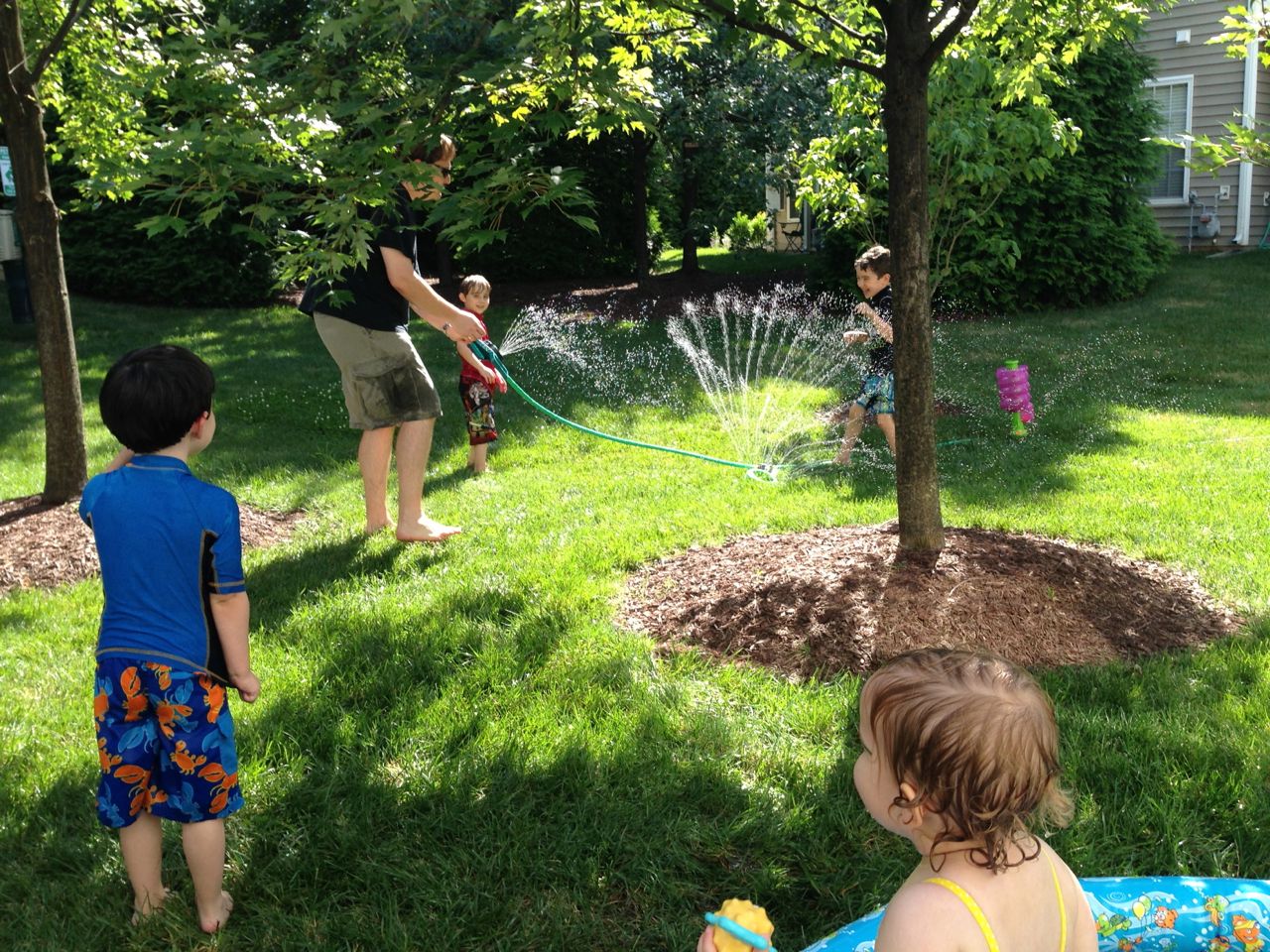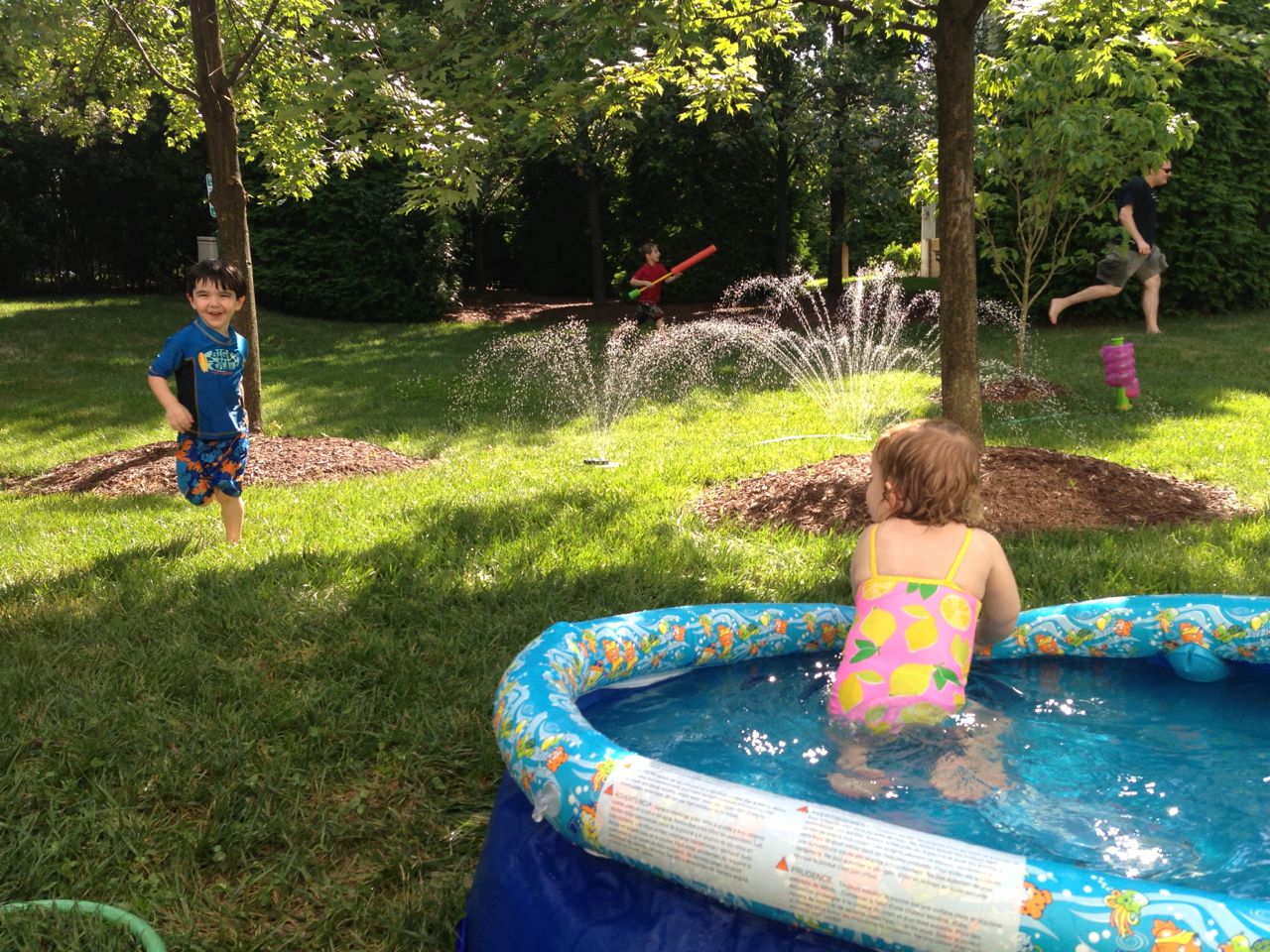 Today we invited the Orazis over for a backyard pool party and cookout! The weather was great, and between the splash pool and a pile squirt toys, the kids had a blast! Brandon set up all sorts of sprinklers to go along as well. He and Brian had a bit of fun at Lowes getting short lengths of hose, splitters, and sprinklers of all kinds. 😉 The boys were just as rough-and-tumble as you’d expect, but they seemed to look out for Kendall a bit. She didn’t need much looking out for, though, since she tried her hardest to hang right with them and do everything they did! The kids dried off and played inside while the dads manned the grill, and after dinner, we had red-white-and-blue Jell-O dessert! This was a bit of a flop, actually.. We had tried using our new Star Wars mega-molds, but the gelatin didn’t hold its shape at all, and half of it stuck inside the mold. We were looking forward to a Berry Blue R2-D2 and a red Han Solo frozen in Cherry with Fruit Cocktail, but perhaps the added fruit watered down the gelatin too much. We’ll work on refining our technique. 😉 But, even if the shapes didn’t work out, the kids enjoyed making parfaits out of it, with whipped topping!