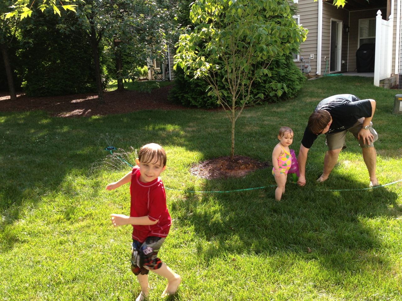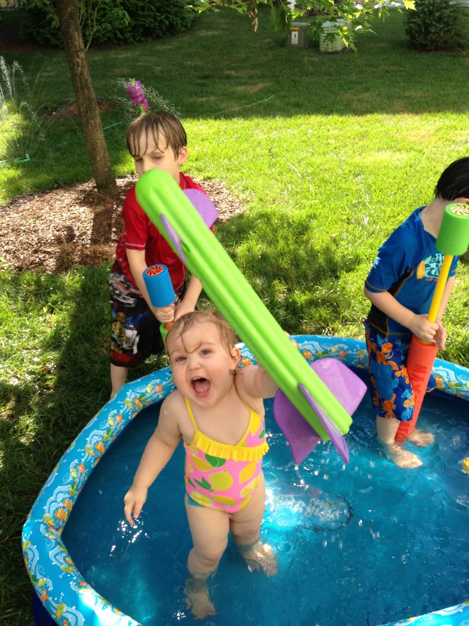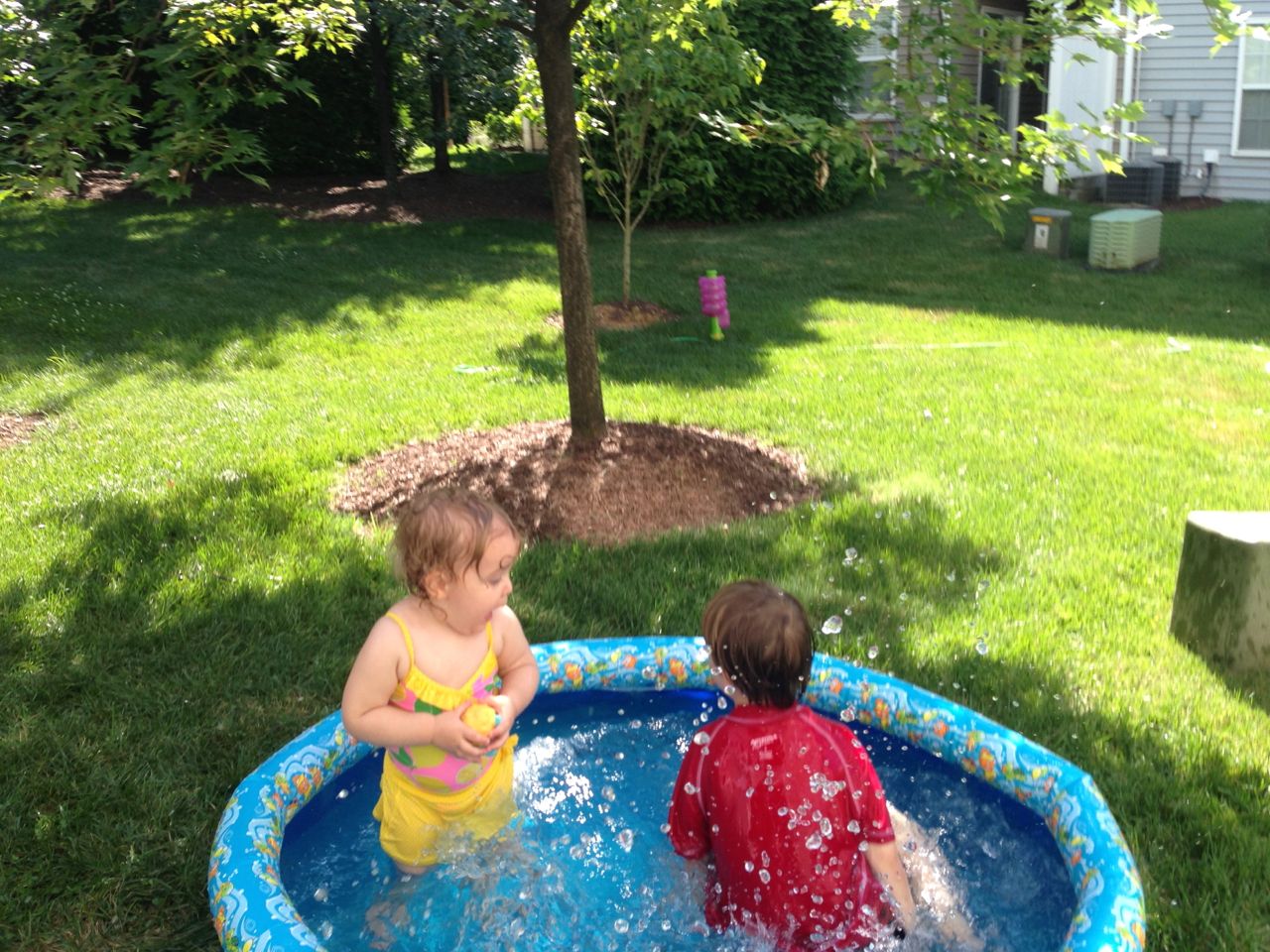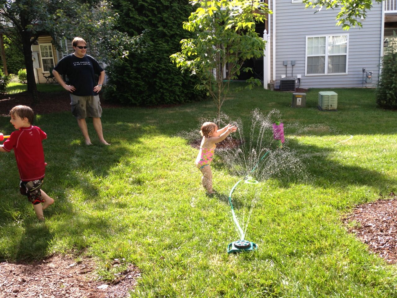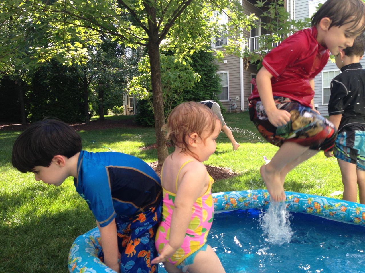 Today we invited the Orazis over for a backyard pool party and cookout! The weather was great, and between the splash pool and a pile squirt toys, the kids had a blast! Brandon set up all sorts of sprinklers to go along as well. He and Brian had a bit of fun at Lowes getting short lengths of hose, splitters, and sprinklers of all kinds. 😉 The boys were just as rough-and-tumble as you’d expect, but they seemed to look out for Kendall a bit. She didn’t need much looking out for, though, since she tried her hardest to hang right with them and do everything they did! The kids dried off and played inside while the dads manned the grill, and after dinner, we had red-white-and-blue Jell-O dessert! This was a bit of a flop, actually.. We had tried using our new Star Wars mega-molds, but the gelatin didn’t hold its shape at all, and half of it stuck inside the mold. We were looking forward to a Berry Blue R2-D2 and a red Han Solo frozen in Cherry with Fruit Cocktail, but perhaps the added fruit watered down the gelatin too much. We’ll work on refining our technique. 😉 But, even if the shapes didn’t work out, the kids enjoyed making parfaits out of it, with whipped topping!