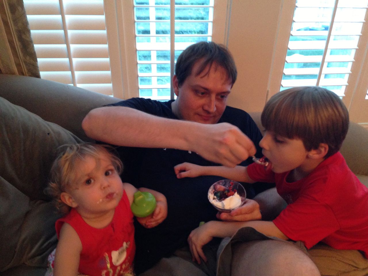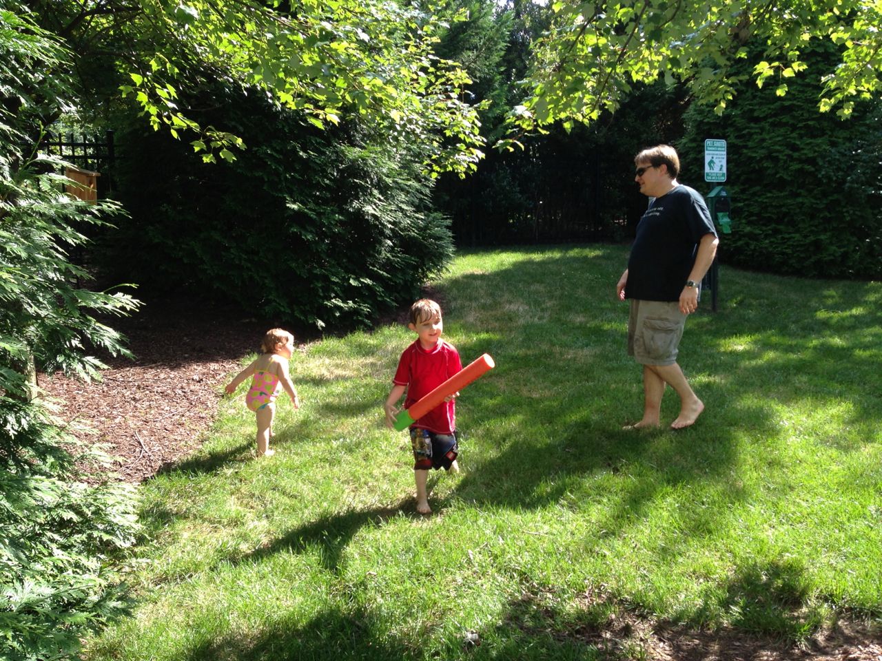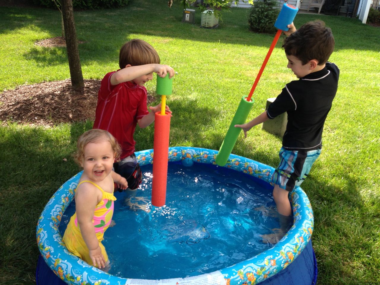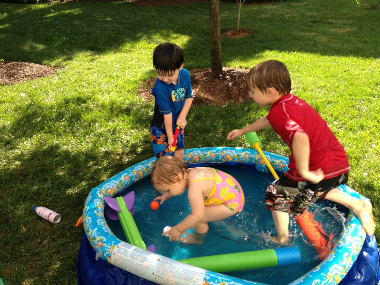 Today we invited the Orazis over for a backyard pool party and cookout! The weather was great, and between the splash pool and a pile squirt toys, the kids had a blast! Brandon set up all sorts of sprinklers to go along as well. He and Brian had a bit of fun at Lowes getting short lengths of hose, splitters, and sprinklers of all kinds. 😉 The boys were just as rough-and-tumble as you’d expect, but they seemed to look out for Kendall a bit. She didn’t need much looking out for, though, since she tried her hardest to hang right with them and do everything they did! The kids dried off and played inside while the dads manned the grill, and after dinner, we had red-white-and-blue Jell-O dessert! This was a bit of a flop, actually.. We had tried using our new Star Wars mega-molds, but the gelatin didn’t hold its shape at all, and half of it stuck inside the mold. We were looking forward to a Berry Blue R2-D2 and a red Han Solo frozen in Cherry with Fruit Cocktail, but perhaps the added fruit watered down the gelatin too much. We’ll work on refining our technique. 😉 But, even if the shapes didn’t work out, the kids enjoyed making parfaits out of it, with whipped topping!