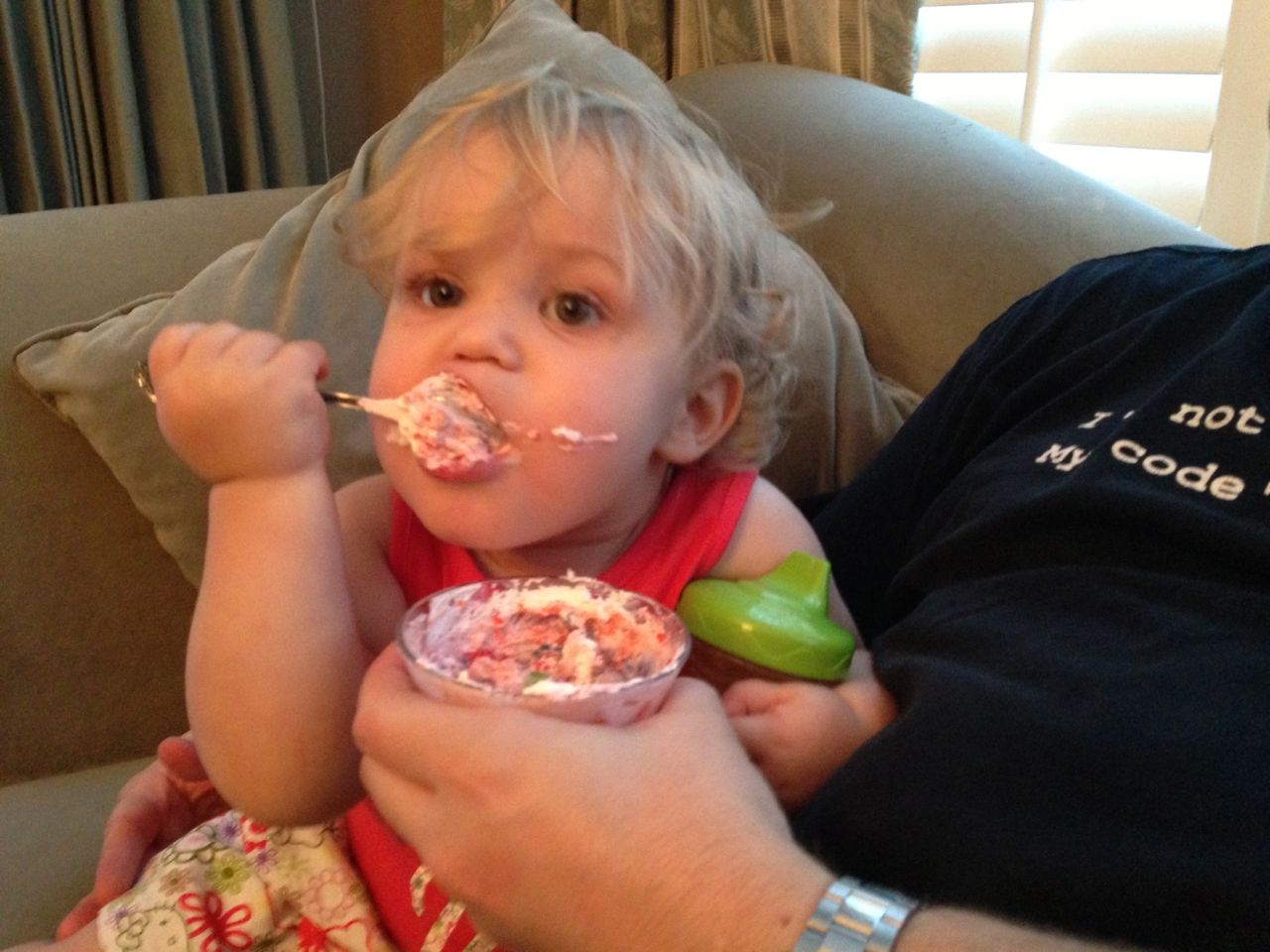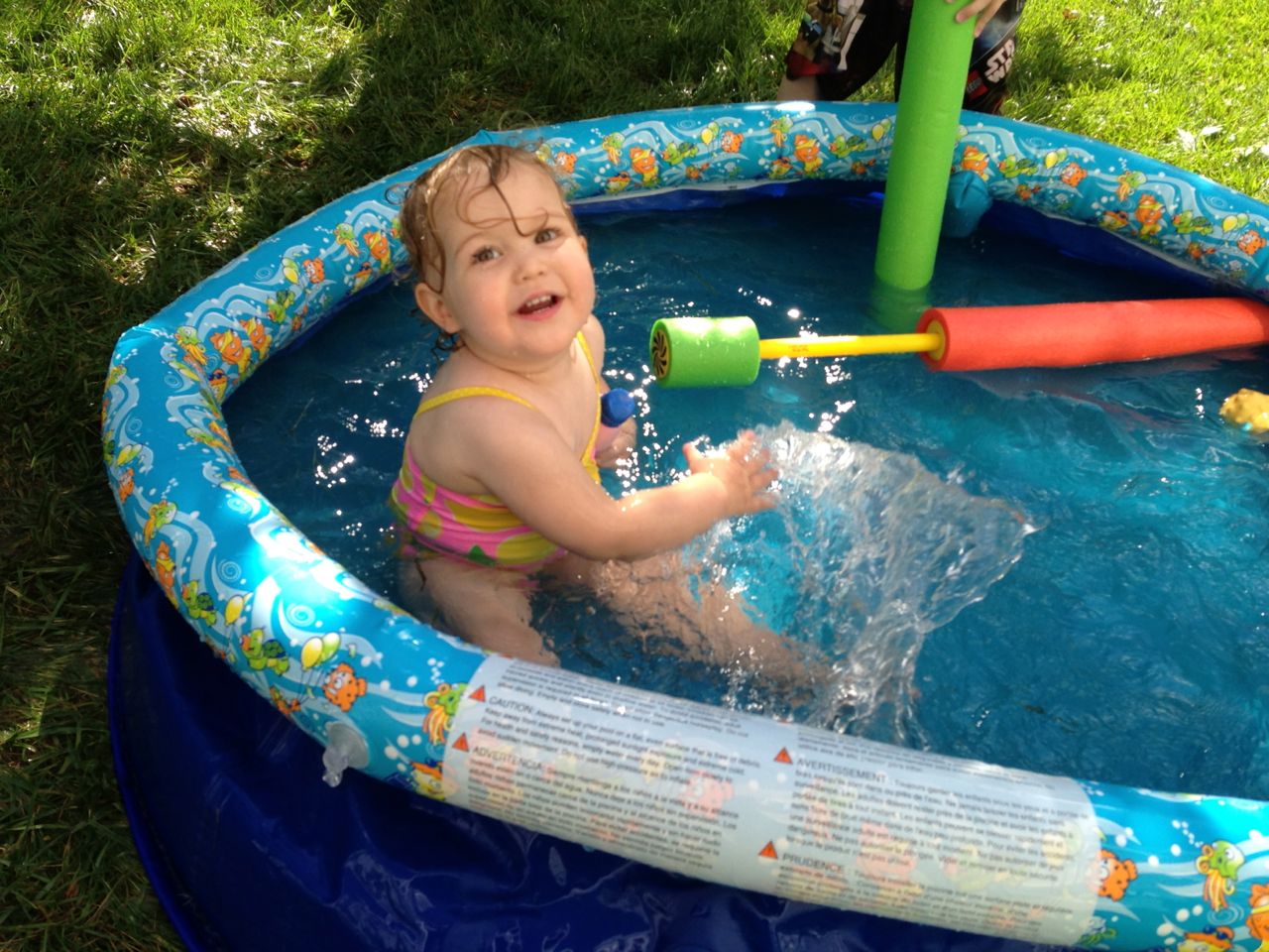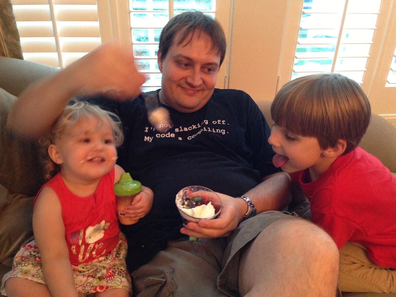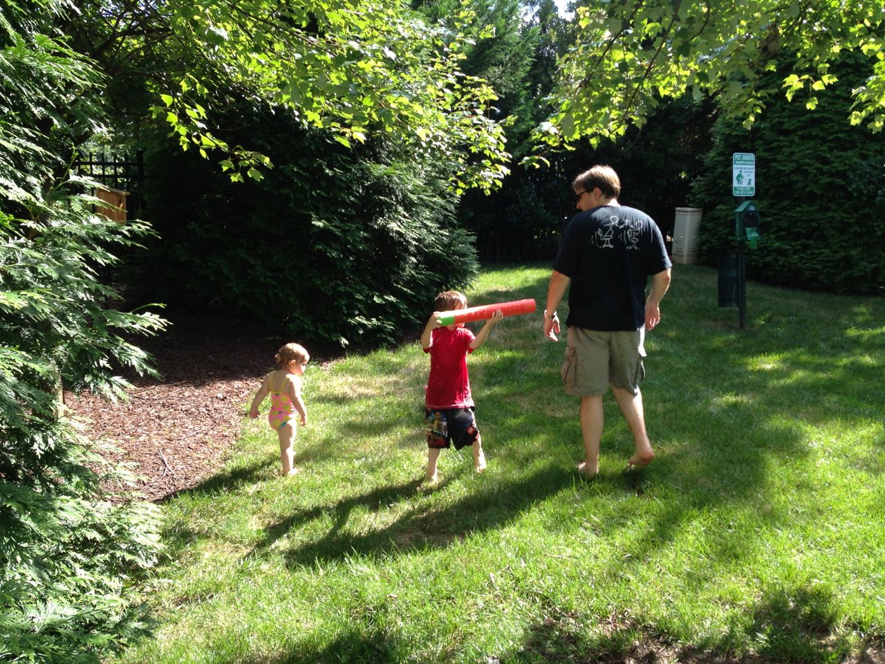 Today we invited the Orazis over for a backyard pool party and cookout! The weather was great, and between the splash pool and a pile squirt toys, the kids had a blast! Brandon set up all sorts of sprinklers to go along as well. He and Brian had a bit of fun at Lowes getting short lengths of hose, splitters, and sprinklers of all kinds. 😉 The boys were just as rough-and-tumble as you’d expect, but they seemed to look out for Kendall a bit. She didn’t need much looking out for, though, since she tried her hardest to hang right with them and do everything they did! The kids dried off and played inside while the dads manned the grill, and after dinner, we had red-white-and-blue Jell-O dessert! This was a bit of a flop, actually.. We had tried using our new Star Wars mega-molds, but the gelatin didn’t hold its shape at all, and half of it stuck inside the mold. We were looking forward to a Berry Blue R2-D2 and a red Han Solo frozen in Cherry with Fruit Cocktail, but perhaps the added fruit watered down the gelatin too much. We’ll work on refining our technique. 😉 But, even if the shapes didn’t work out, the kids enjoyed making parfaits out of it, with whipped topping!
