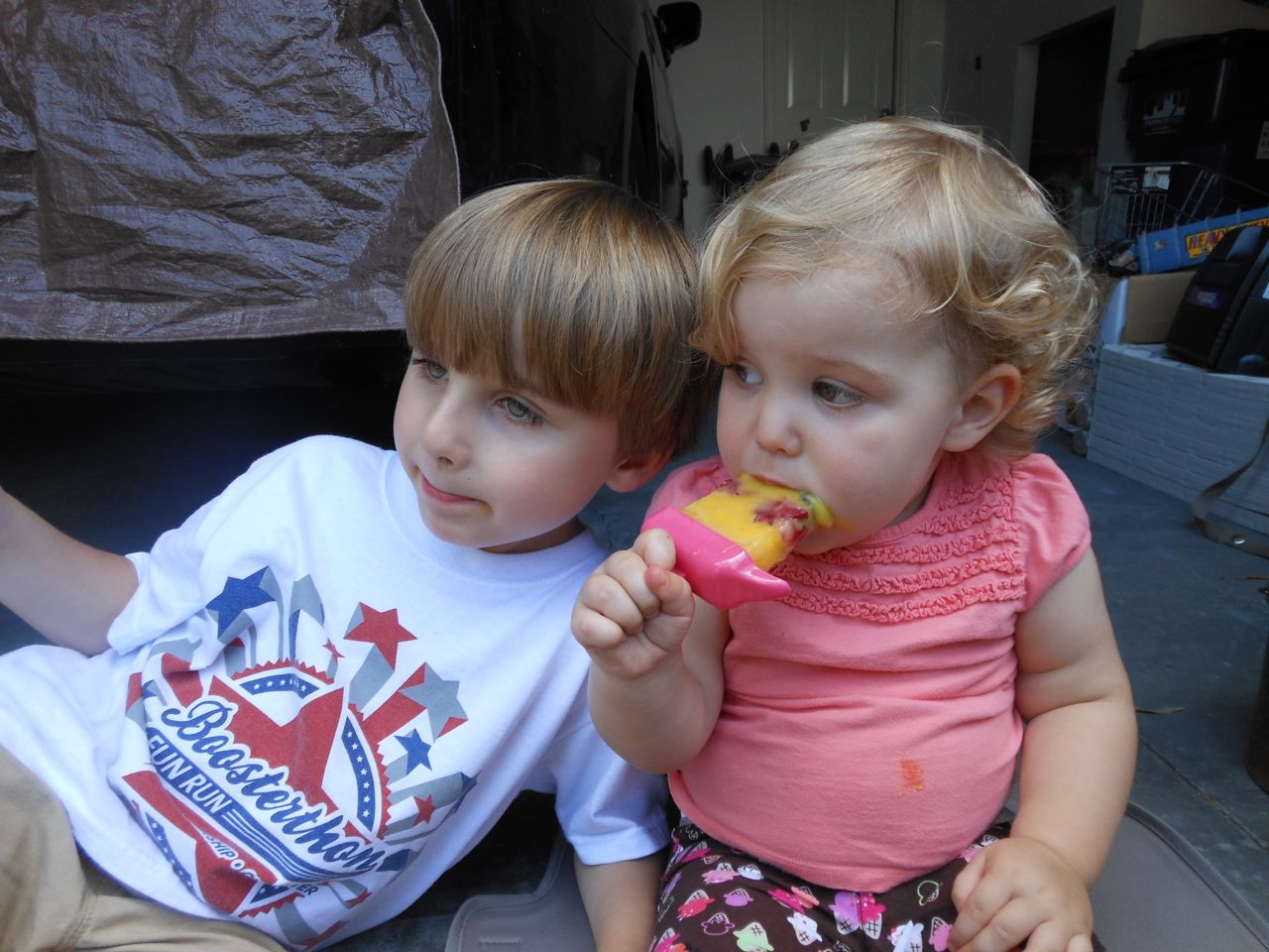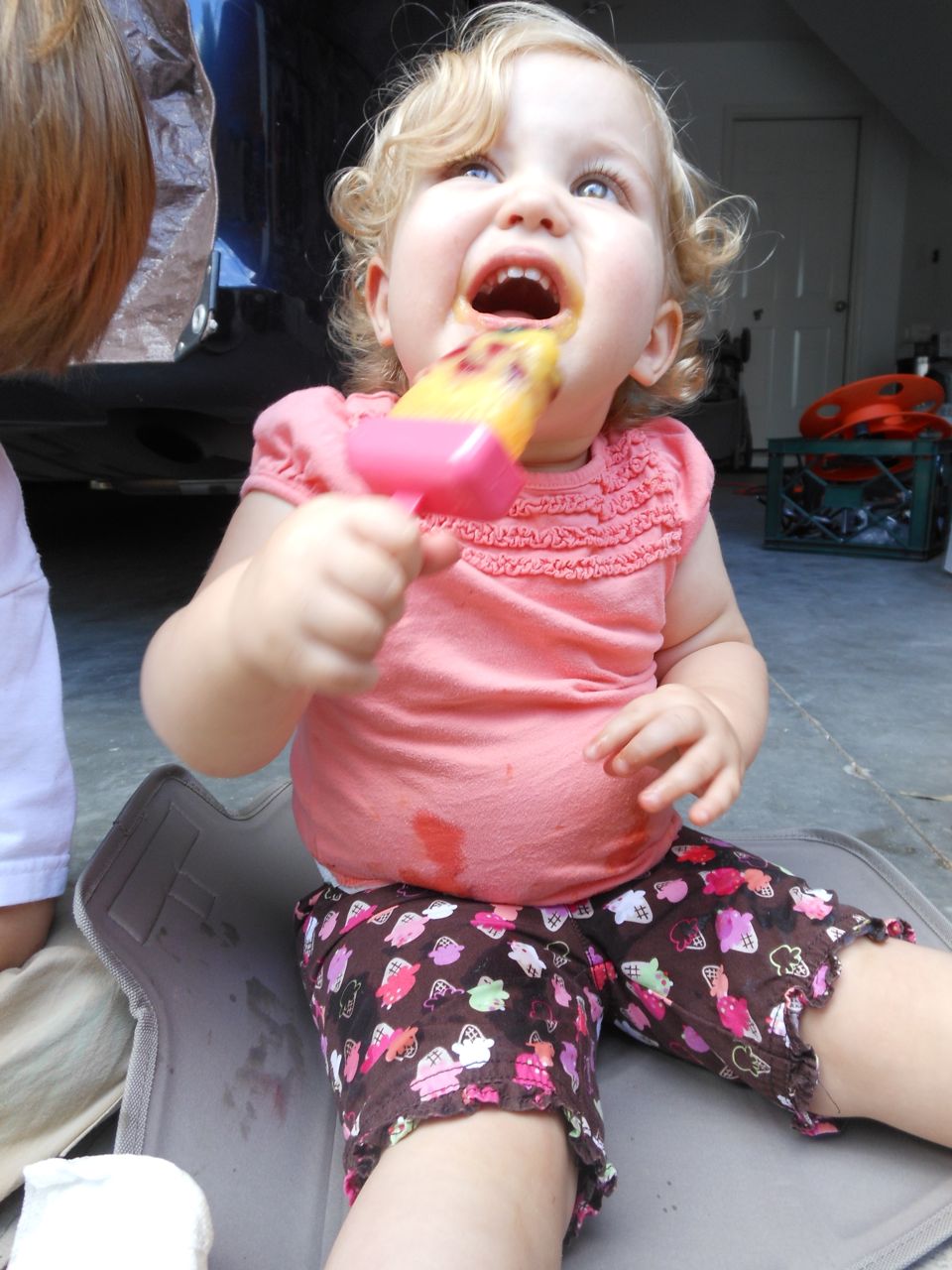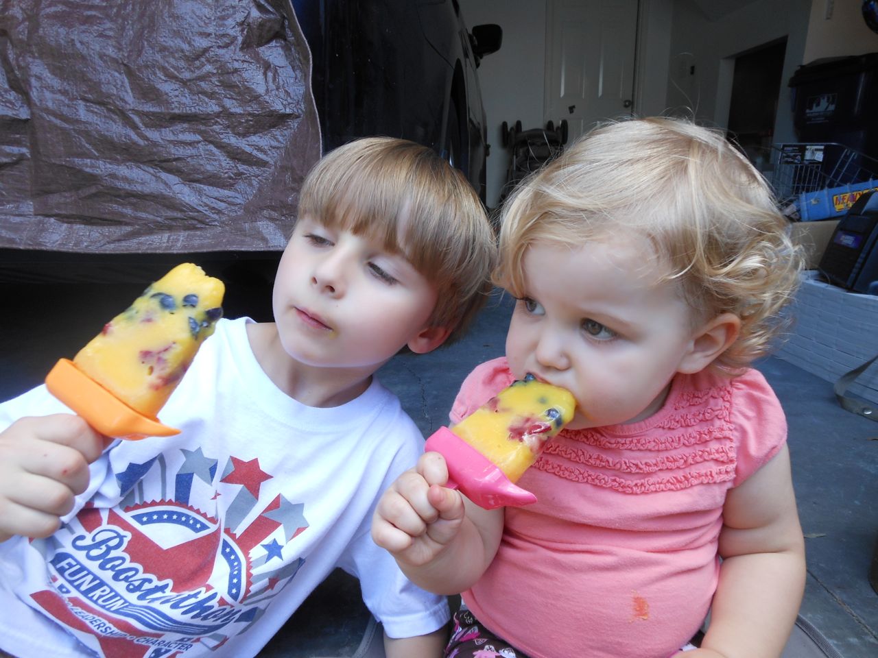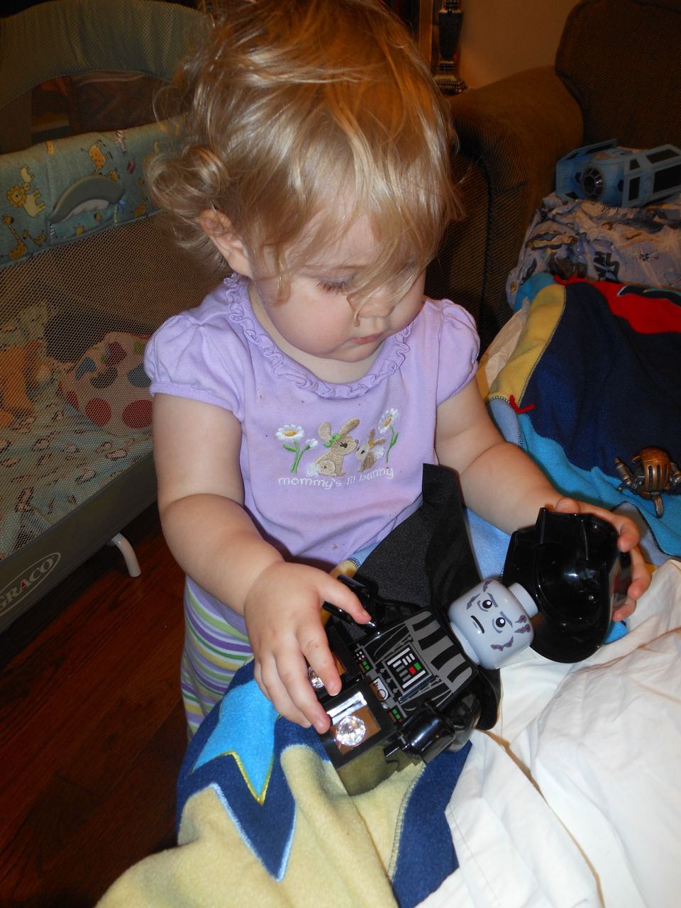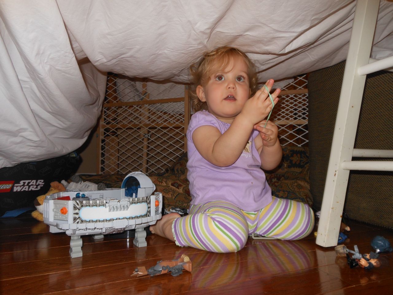 With the top floor’s air conditioning unit being broken for the past few days (why does this sort of thing always happen around a holiday?!) it finally became unbearable upstairs.. So, we had a family sleepover, together on the middle level. Brandon and I had the pull-out couch, Brian had the other couch, and Kendall (to her great displeasure) was in the pack’n’play. Not the most comfortable, but we made the most of it! The kids made all sorts of pillow forts and blanket tents, and that made it pretty fun. We brought down nightlights, one of which projects star shapes, and Brian’s Darth Vader flashlight. Kendall just loves taking off his helmet! We had fun playing a lot today, will the grill set, sidewalk chalk and bubbles, Lego Star Wars, stomp rocket, Star Wars figures, music toys… All over the map! We even brought out the Speak’n’Spell–a toy from TI that Brandon and I both had as kids, and really enjoyed. Brandon’s been working hard on the garage project, and check out that awesome wall system he’s got going now! Getting those items off the floor will help a lot. After Kendall’s nap, we decided to have our homemade popsicles (made from fruit, vanilla pudding, and orange juice) outside–they are tasty, but very messy! The kids got super sticky, and then super silly as the sugar took hold. Brian played with the stomp rocket as Kendall looked on–she got so excited every time Brian launched it! You can tell from her reaction, this was the height of entertainment! While working in the garage, Brandon found some unused “highly-available beverage helmets” that celebrated a Red Hat Cluster Suite release a few years ago. We tried to get Kendall to pose with one on, but she wasn’t exactly into the helmet look today. 😉 All in all, a super fun summer Sunday.