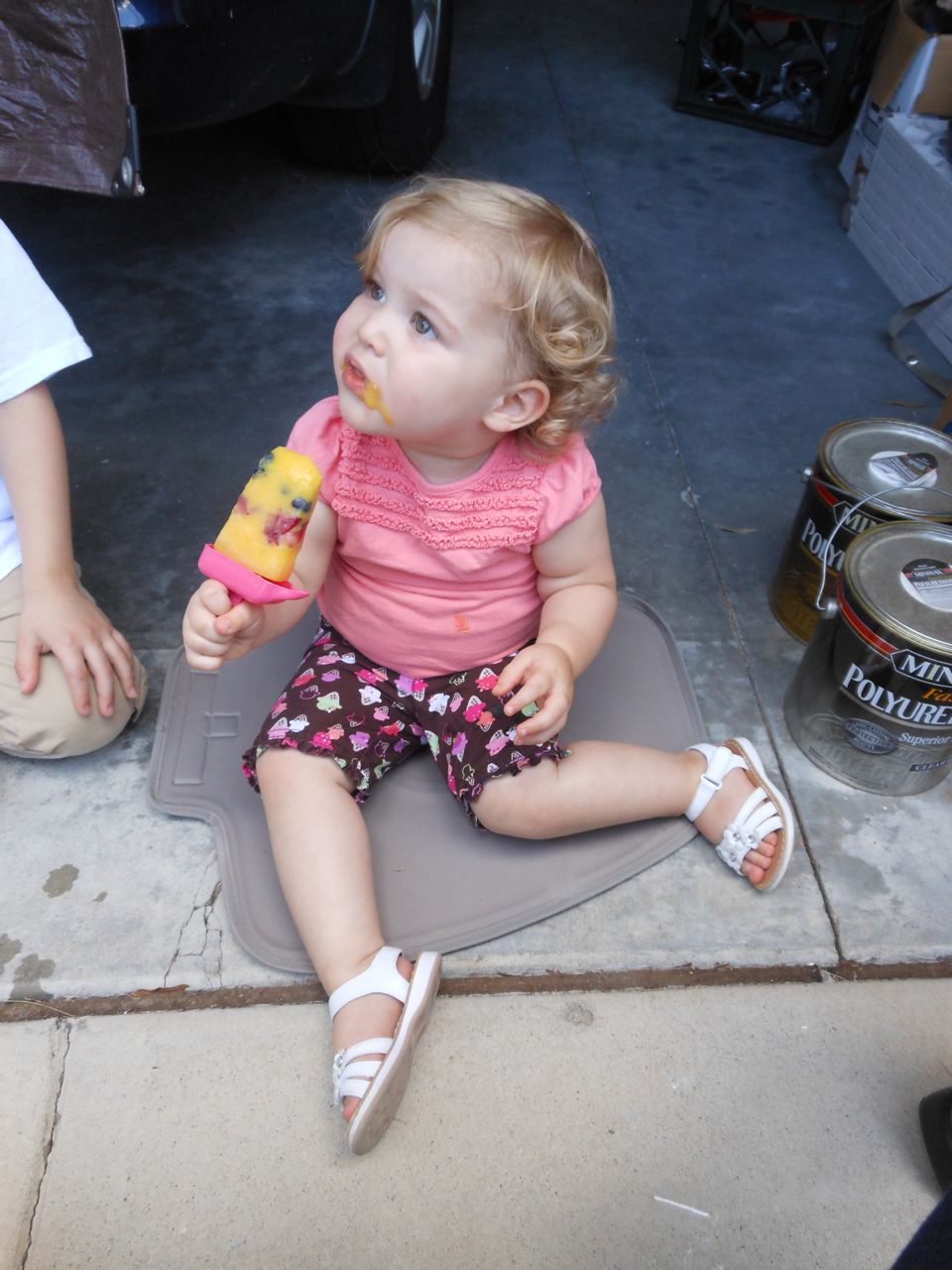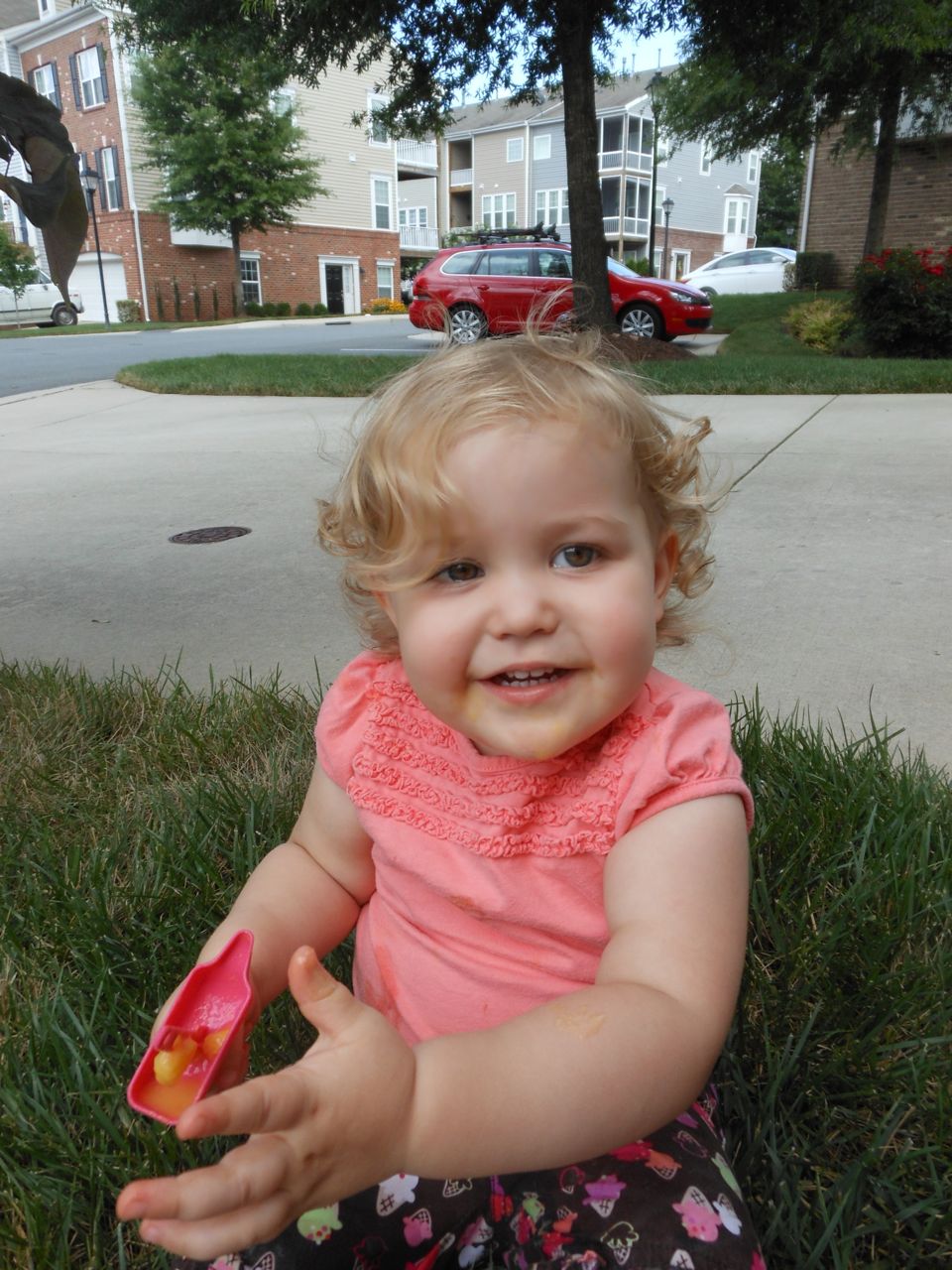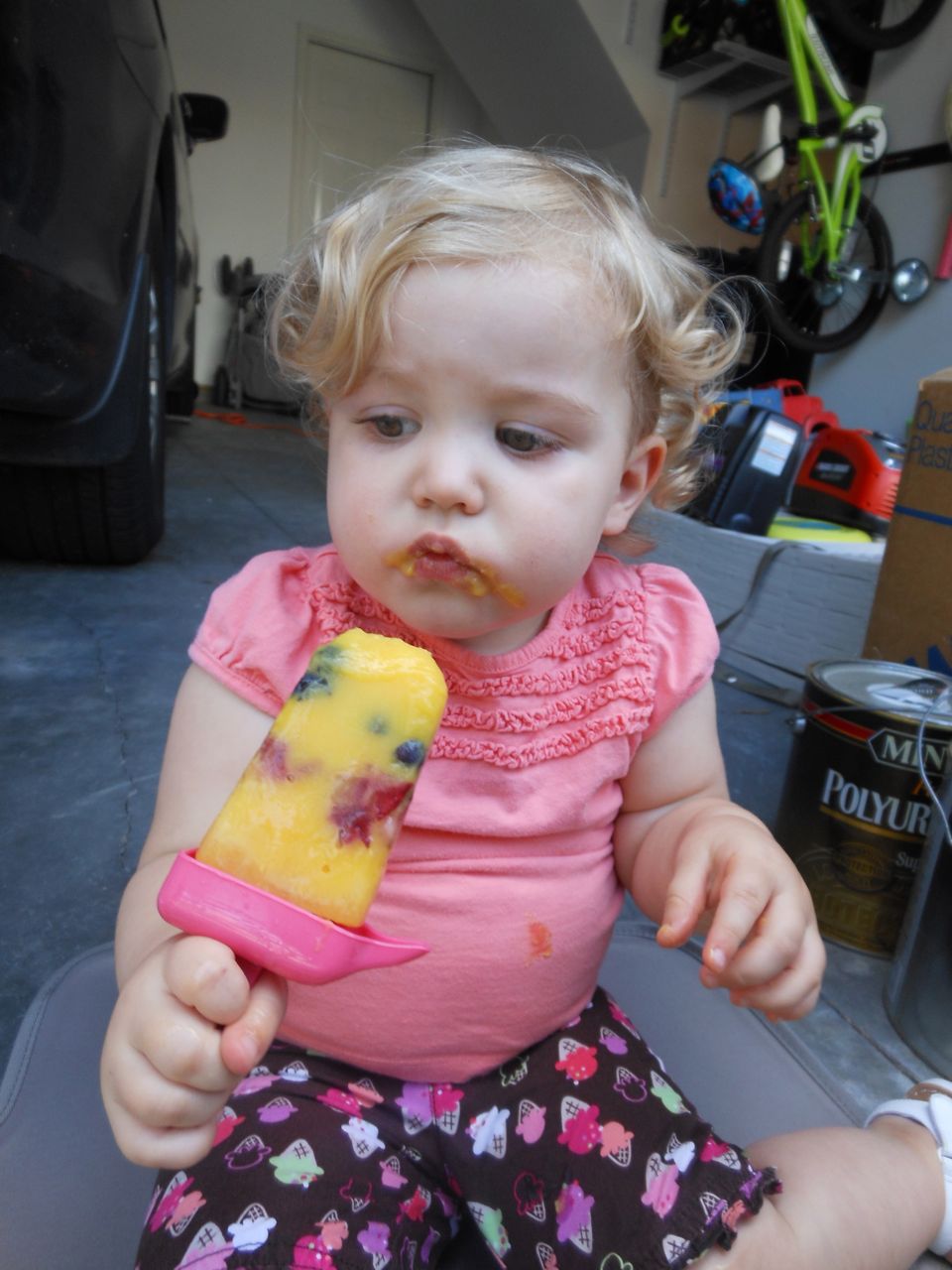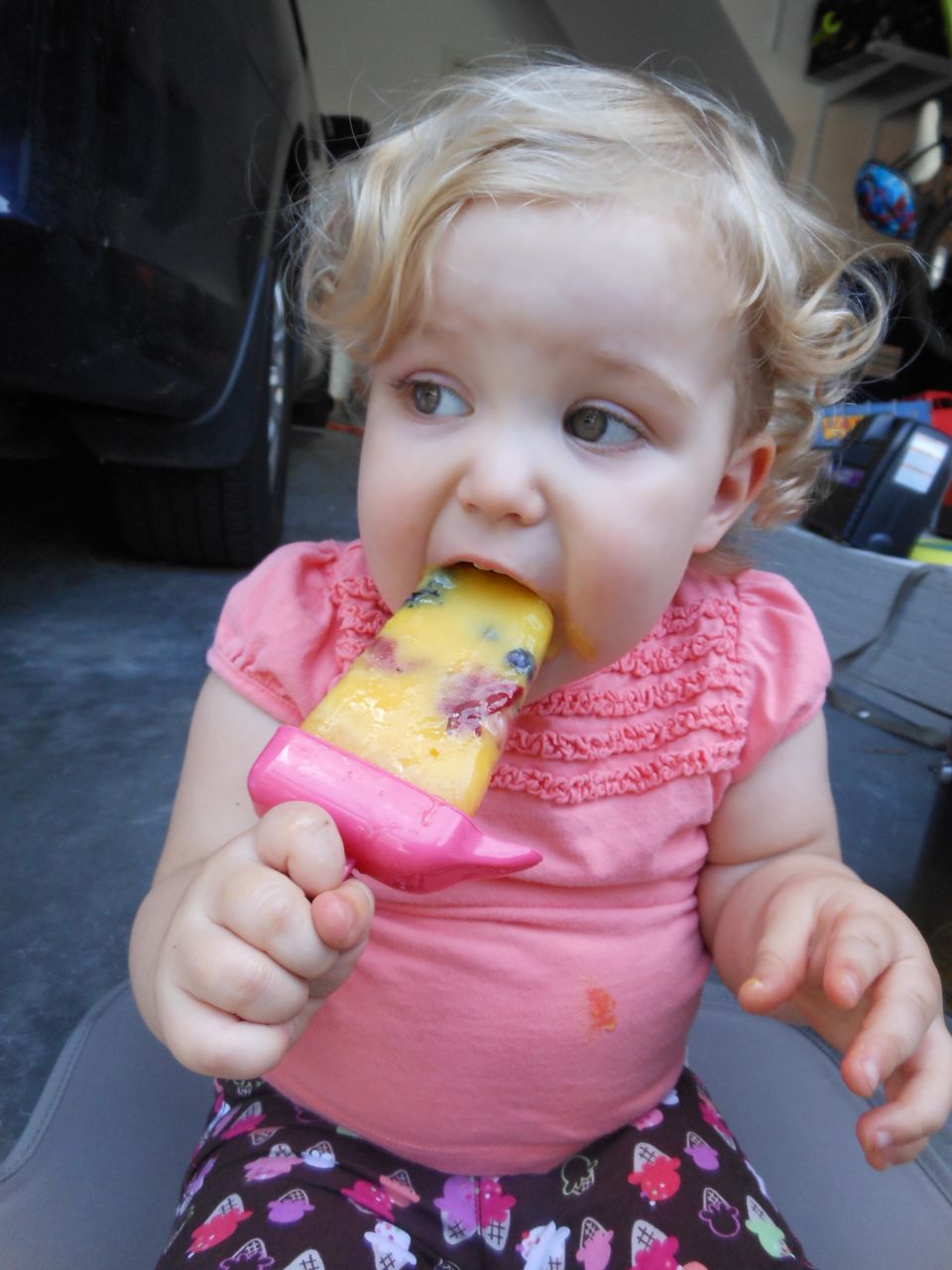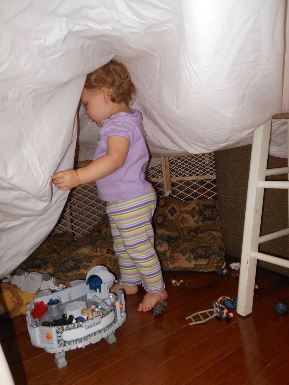With the top floor’s air conditioning unit being broken for the past few days (why does this sort of thing always happen around a holiday?!) it finally became unbearable upstairs.. So, we had a family sleepover, together on the middle level. Brandon and I had the pull-out couch, Brian had the other couch, and Kendall (to her great displeasure) was in the pack’n’play. Not the most comfortable, but we made the most of it! The kids made all sorts of pillow forts and blanket tents, and that made it pretty fun. We brought down nightlights, one of which projects star shapes, and Brian’s Darth Vader flashlight. Kendall just loves taking off his helmet! We had fun playing a lot today, will the grill set, sidewalk chalk and bubbles, Lego Star Wars, stomp rocket, Star Wars figures, music toys… All over the map! We even brought out the Speak’n’Spell–a toy from TI that Brandon and I both had as kids, and really enjoyed. Brandon’s been working hard on the garage project, and check out that awesome wall system he’s got going now! Getting those items off the floor will help a lot. After Kendall’s nap, we decided to have our homemade popsicles (made from fruit, vanilla pudding, and orange juice) outside–they are tasty, but very messy! The kids got super sticky, and then super silly as the sugar took hold. Brian played with the stomp rocket as Kendall looked on–she got so excited every time Brian launched it! You can tell from her reaction, this was the height of entertainment! While working in the garage, Brandon found some unused “highly-available beverage helmets” that celebrated a Red Hat Cluster Suite release a few years ago. We tried to get Kendall to pose with one on, but she wasn’t exactly into the helmet look today. 😉 All in all, a super fun summer Sunday.