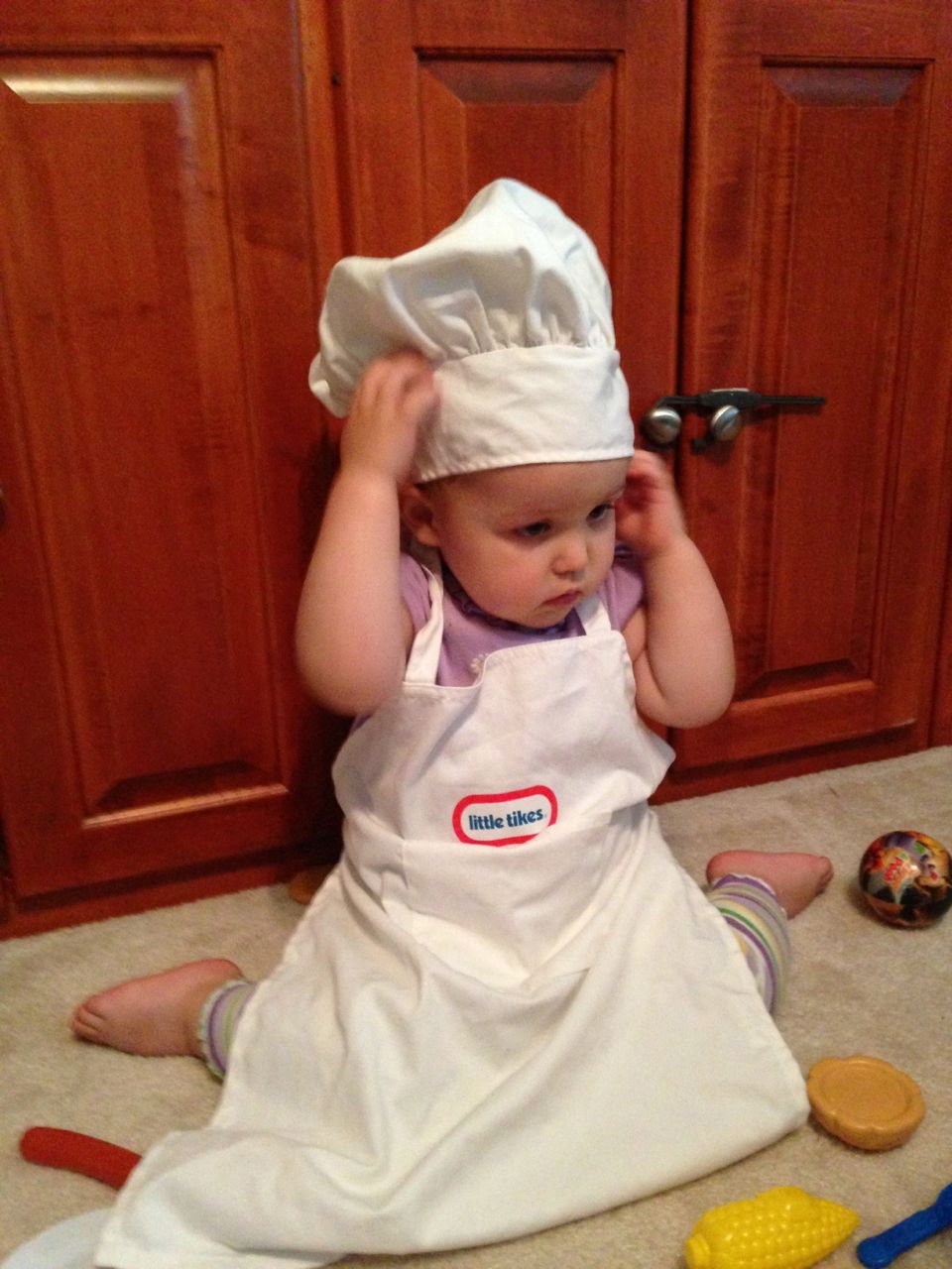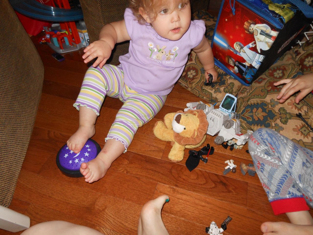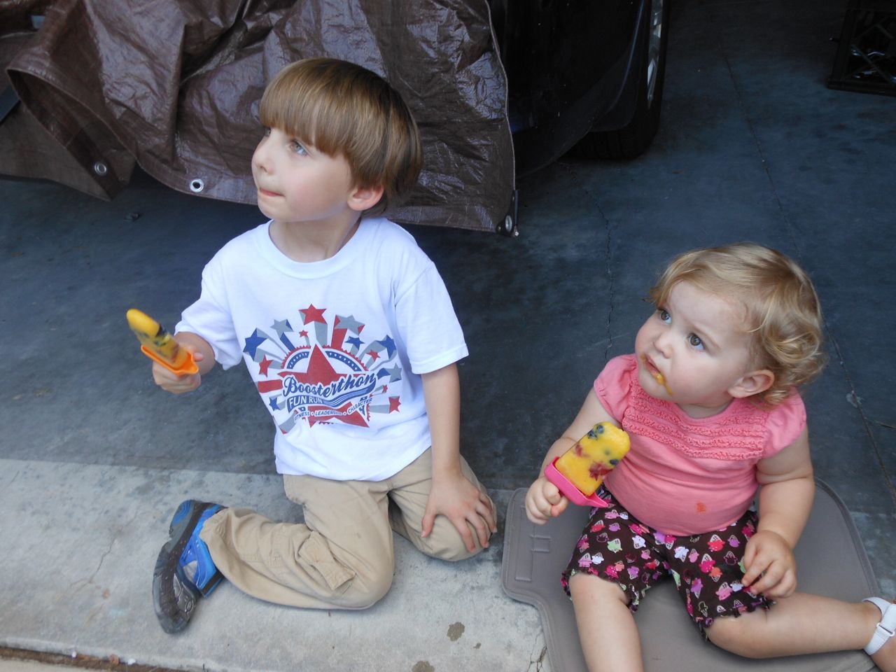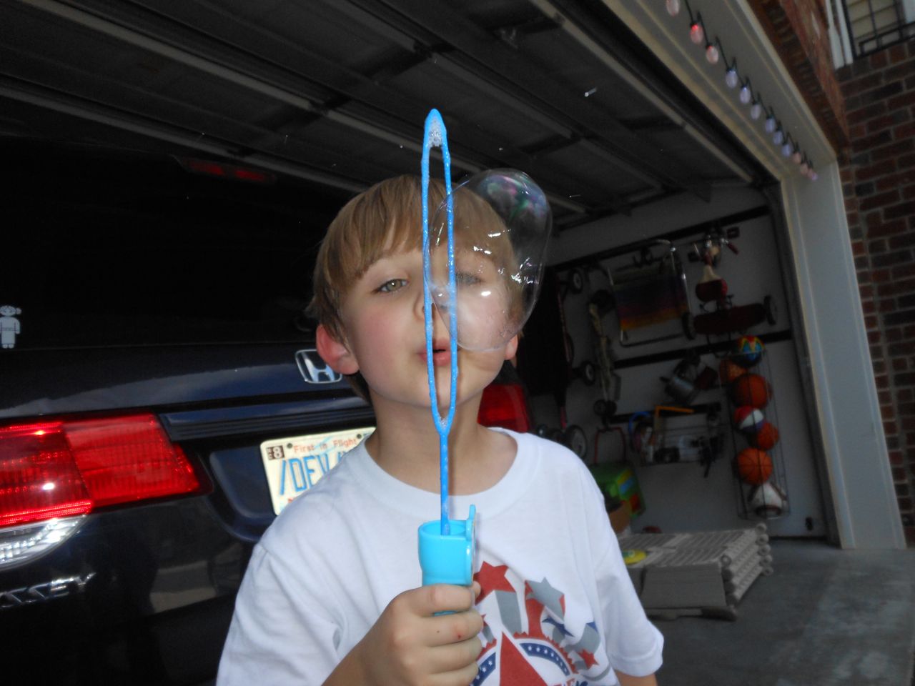 With the top floor’s air conditioning unit being broken for the past few days (why does this sort of thing always happen around a holiday?!) it finally became unbearable upstairs.. So, we had a family sleepover, together on the middle level. Brandon and I had the pull-out couch, Brian had the other couch, and Kendall (to her great displeasure) was in the pack’n’play. Not the most comfortable, but we made the most of it! The kids made all sorts of pillow forts and blanket tents, and that made it pretty fun. We brought down nightlights, one of which projects star shapes, and Brian’s Darth Vader flashlight. Kendall just loves taking off his helmet! We had fun playing a lot today, will the grill set, sidewalk chalk and bubbles, Lego Star Wars, stomp rocket, Star Wars figures, music toys… All over the map! We even brought out the Speak’n’Spell–a toy from TI that Brandon and I both had as kids, and really enjoyed. Brandon’s been working hard on the garage project, and check out that awesome wall system he’s got going now! Getting those items off the floor will help a lot. After Kendall’s nap, we decided to have our homemade popsicles (made from fruit, vanilla pudding, and orange juice) outside–they are tasty, but very messy! The kids got super sticky, and then super silly as the sugar took hold. Brian played with the stomp rocket as Kendall looked on–she got so excited every time Brian launched it! You can tell from her reaction, this was the height of entertainment! While working in the garage, Brandon found some unused “highly-available beverage helmets” that celebrated a Red Hat Cluster Suite release a few years ago. We tried to get Kendall to pose with one on, but she wasn’t exactly into the helmet look today. 😉 All in all, a super fun summer Sunday.